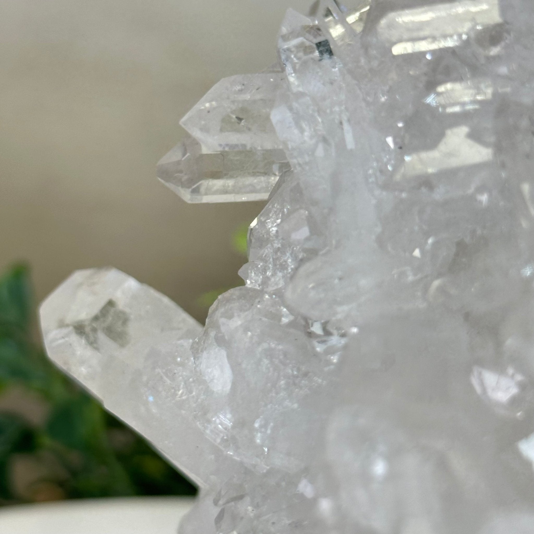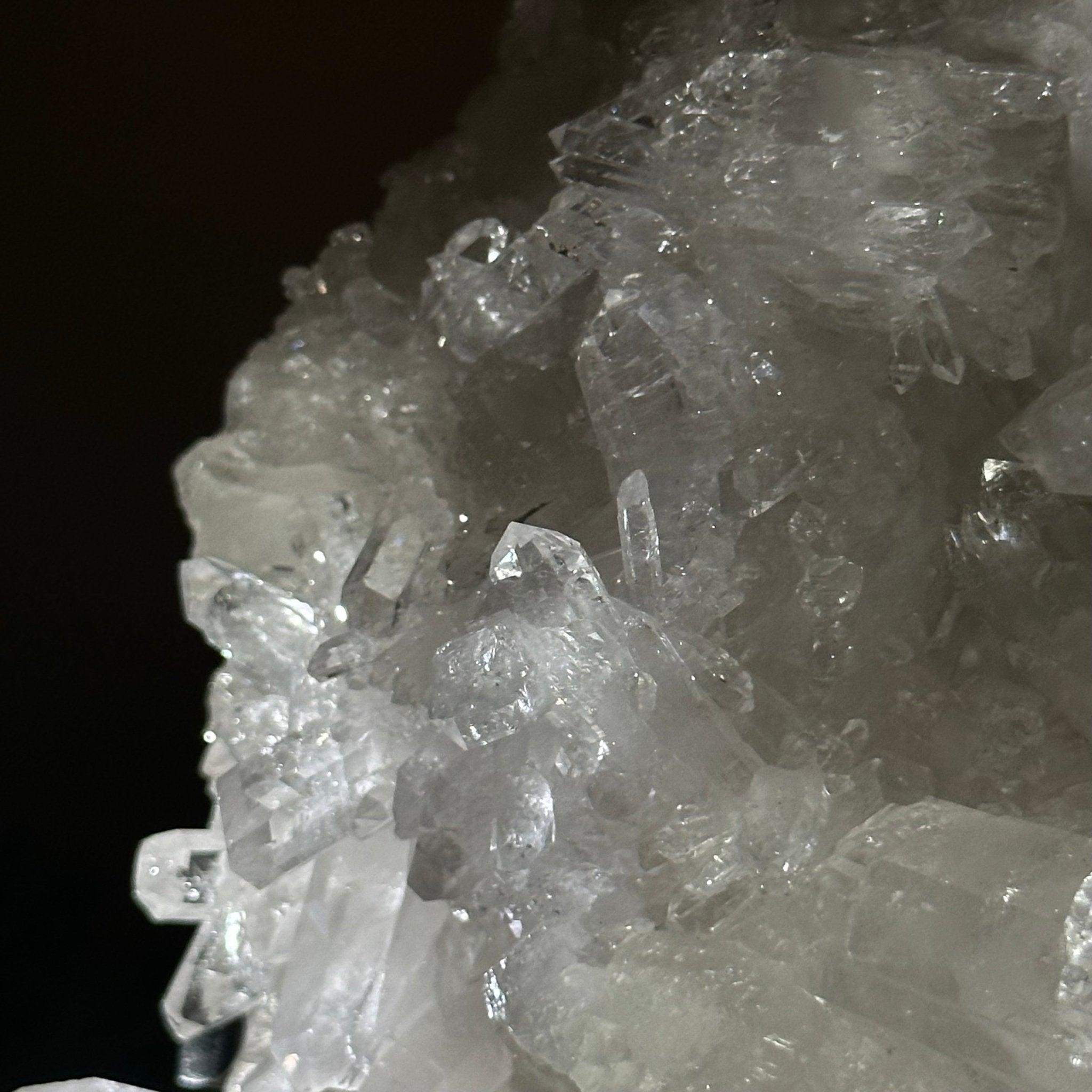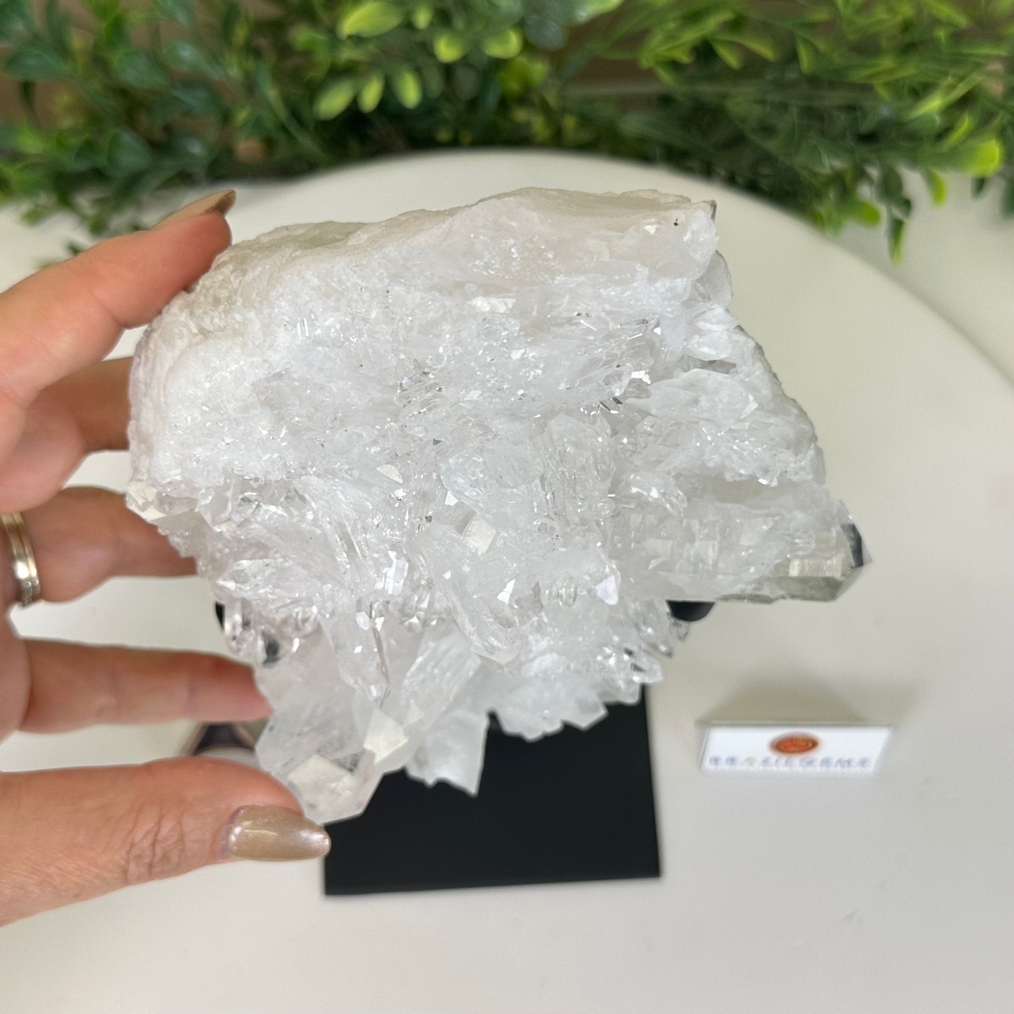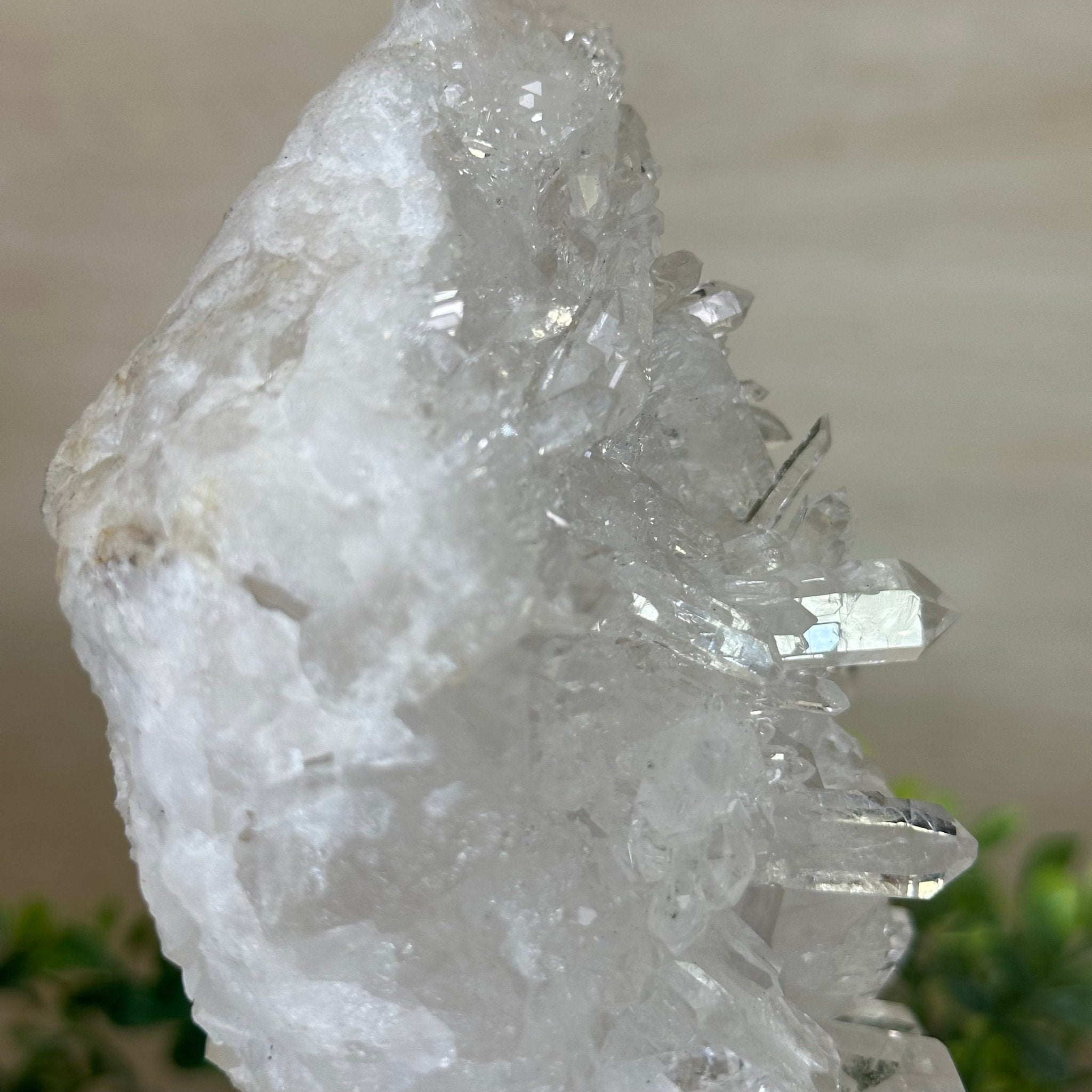 A testament to nature's sublime artistry, this extraordinary Brazilian Super Quality Clear Quartz Cluster by Brazil Gems® will boost your crystal collection to new heights. Elevated upon an elegant metal foundation, its commanding presence and radiant crystalline formations instantly captivate the observer's gaze. Each transparent facet reveals an intricate tableau of geological phenomena—a silent narrative of Earth's patient craftsmanship over countless millennia.