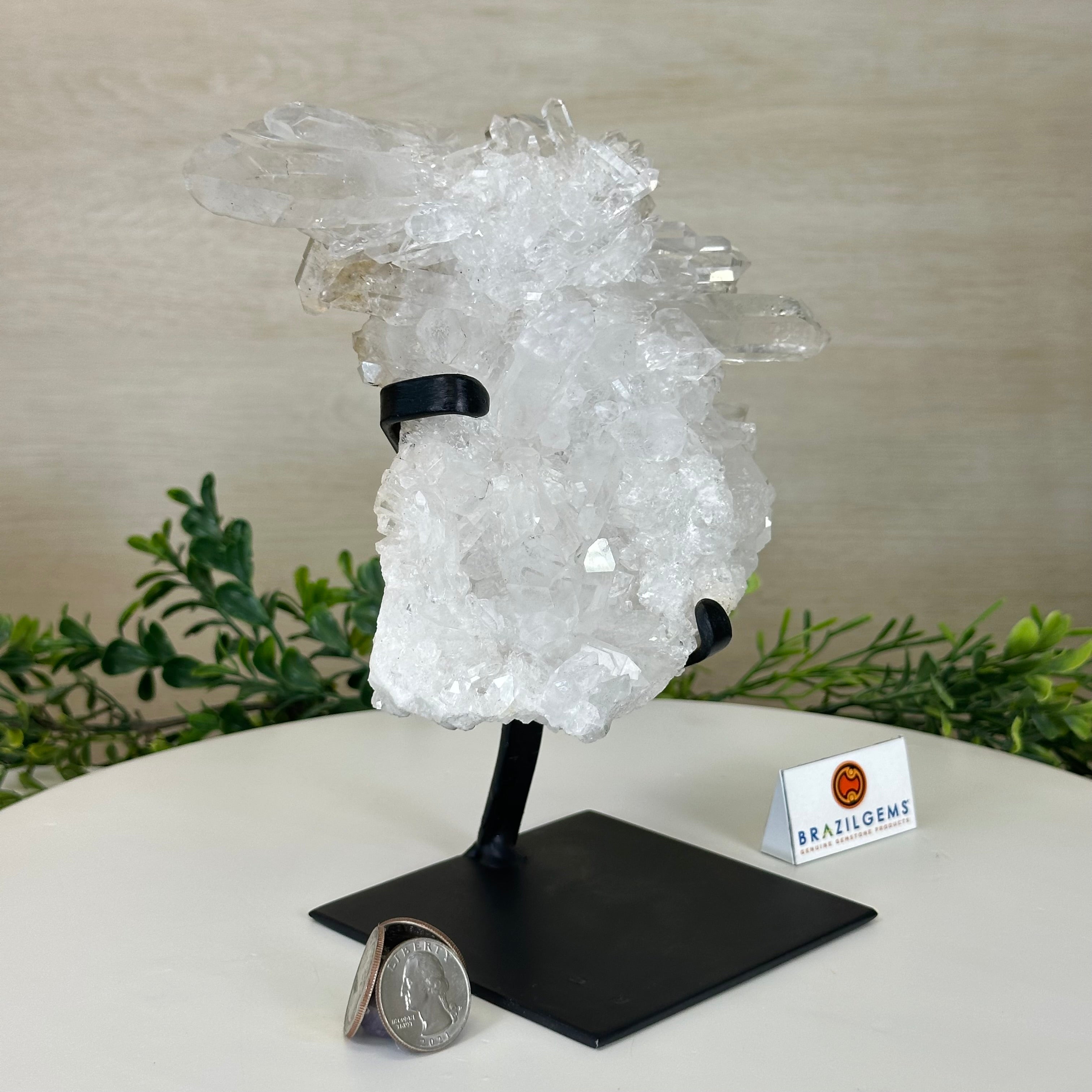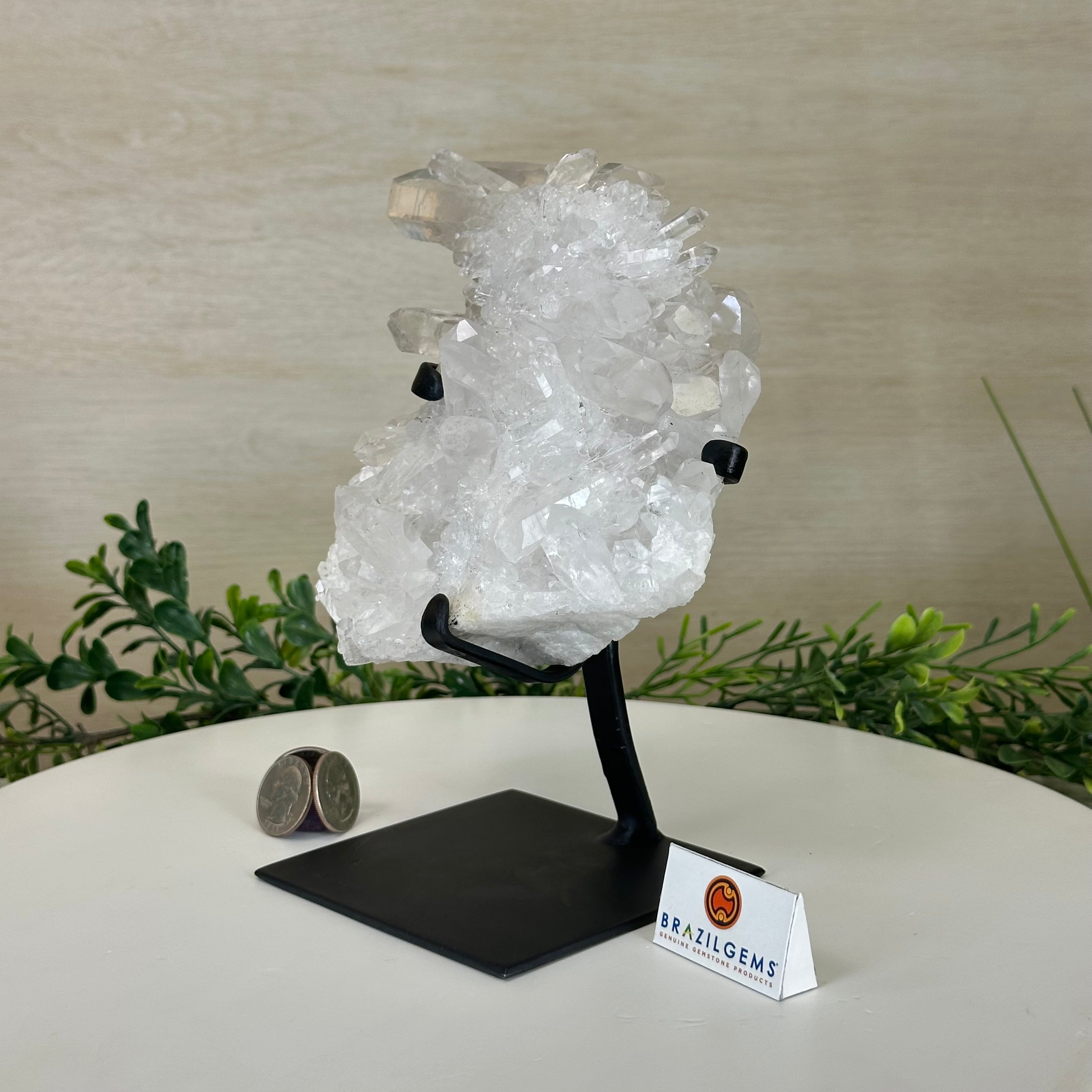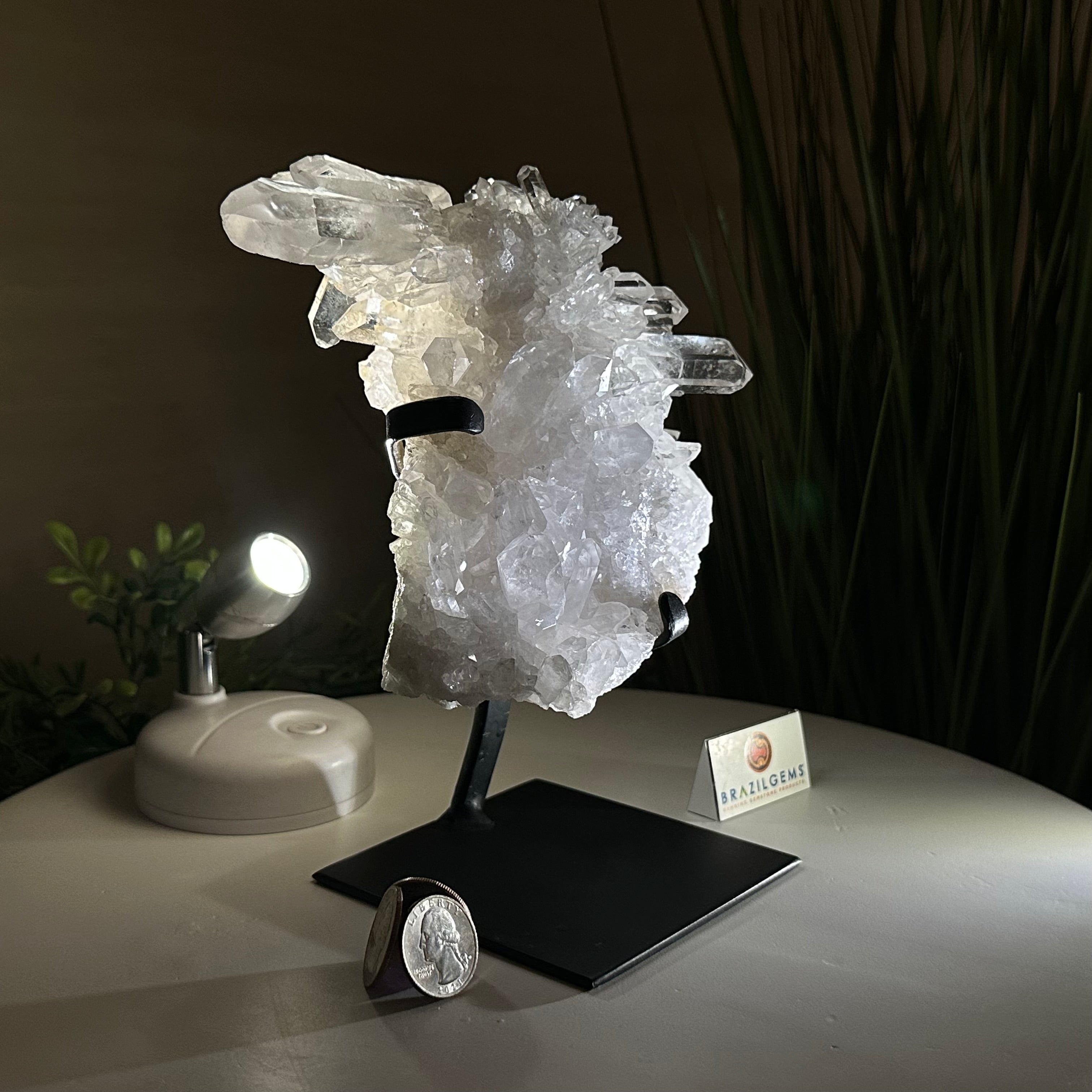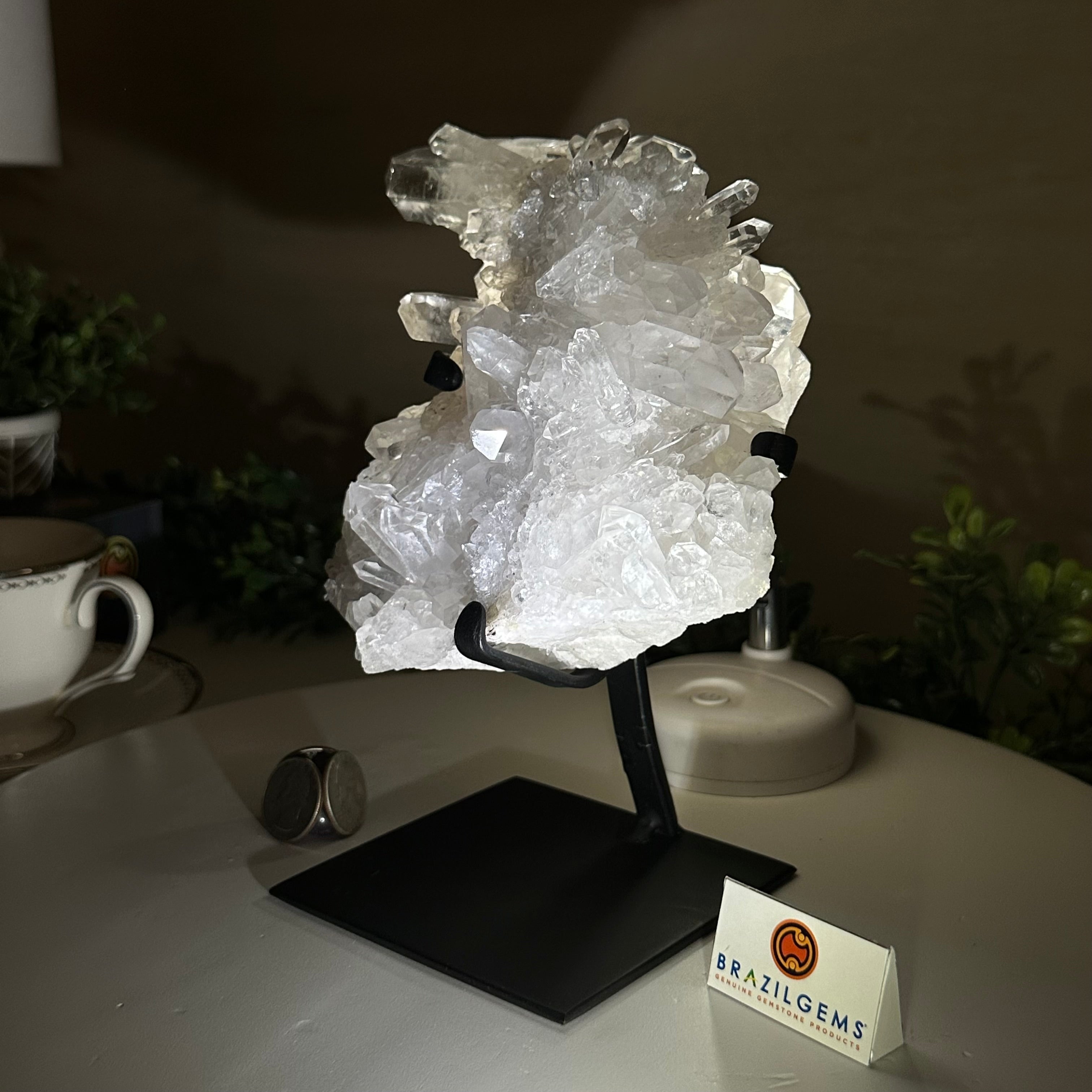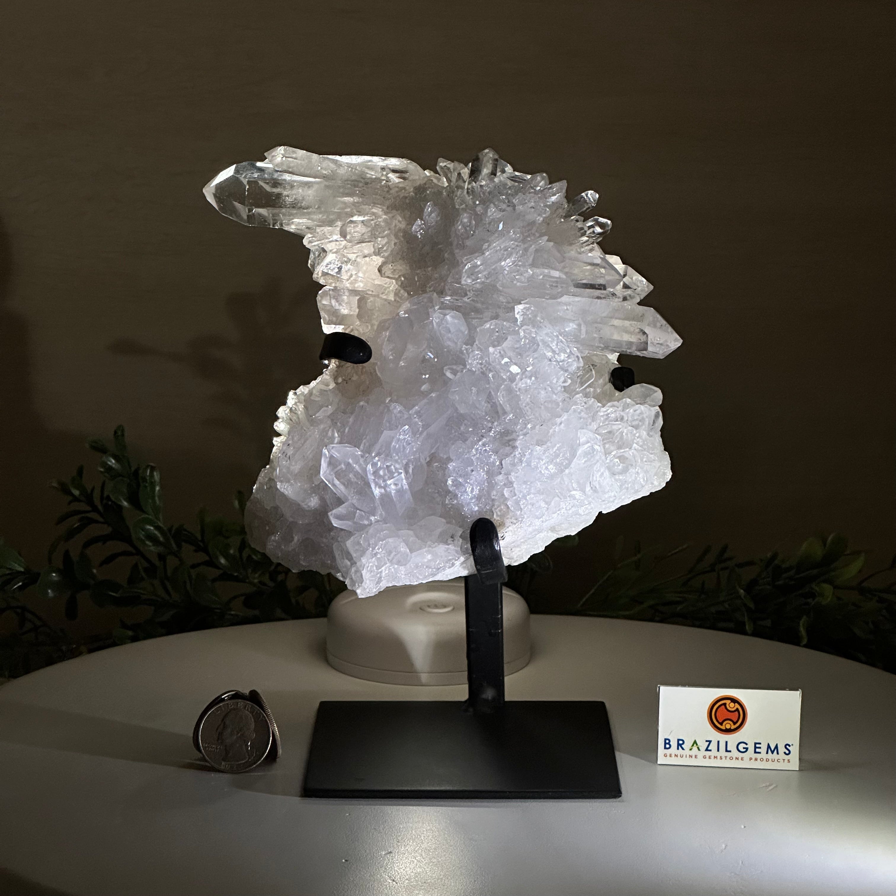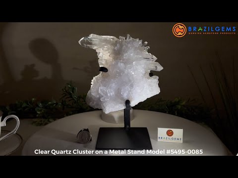 A testament to nature's sublime artistry, this extraordinary Brazilian Super Quality Clear Quartz Cluster by Brazil Gems® will boost your crystal collection to new heights. Elevated upon an elegant metal foundation, its commanding presence and radiant crystalline formations instantly captivate the observer's gaze. Each transparent facet reveals an intricate tableau of geological phenomena—a silent narrative of Earth's patient craftsmanship over countless millennia.