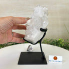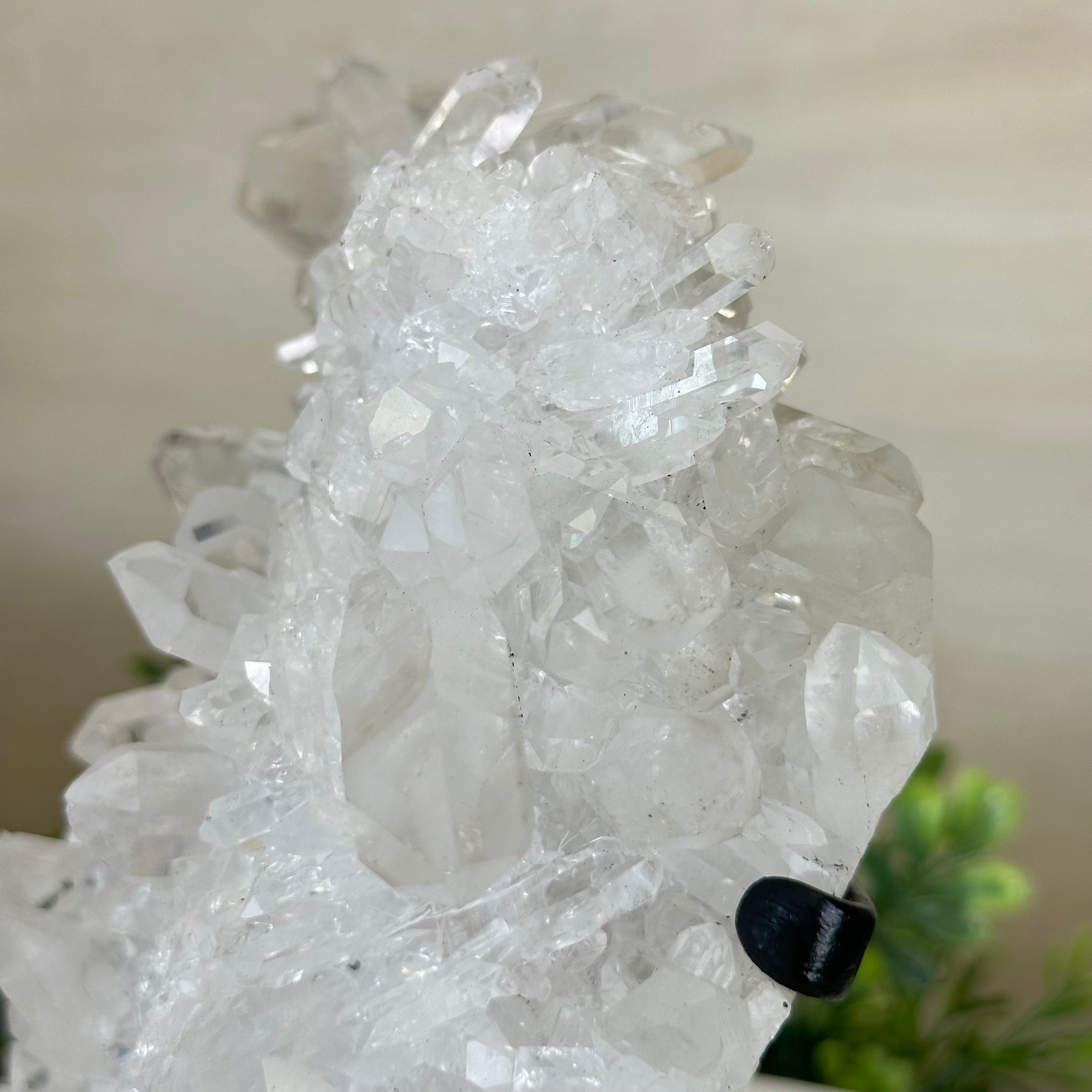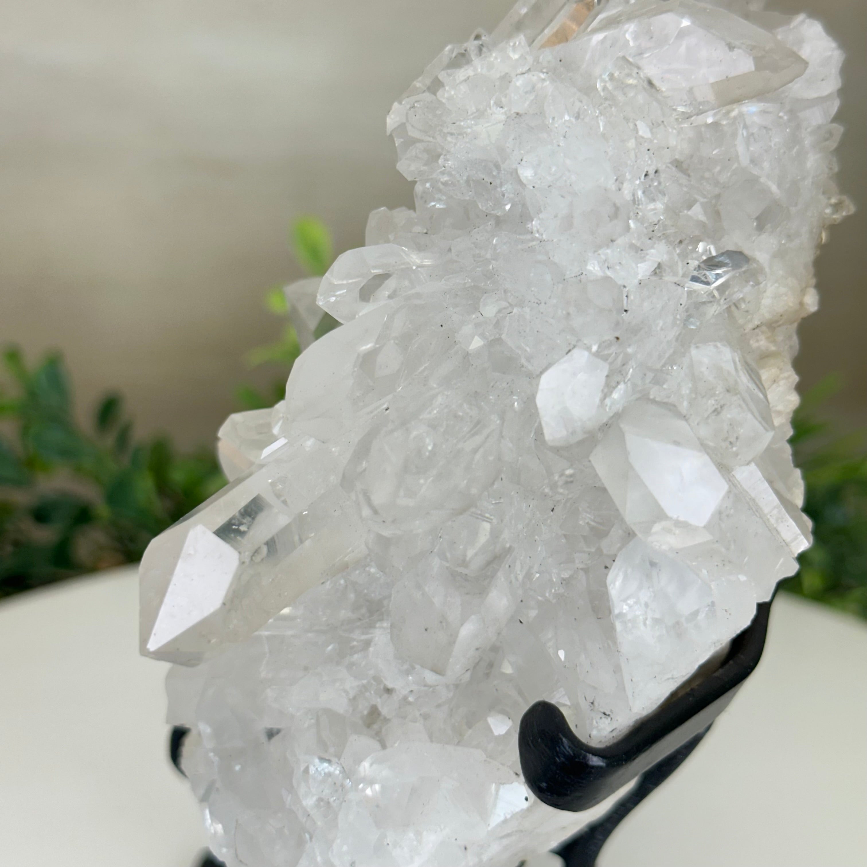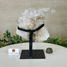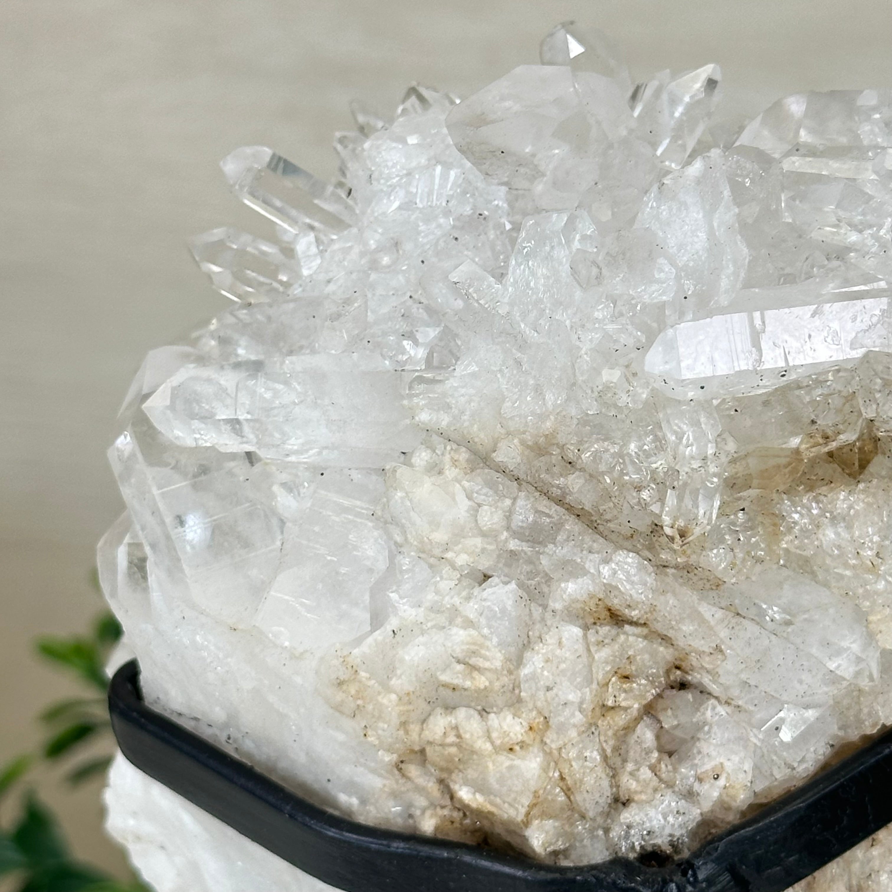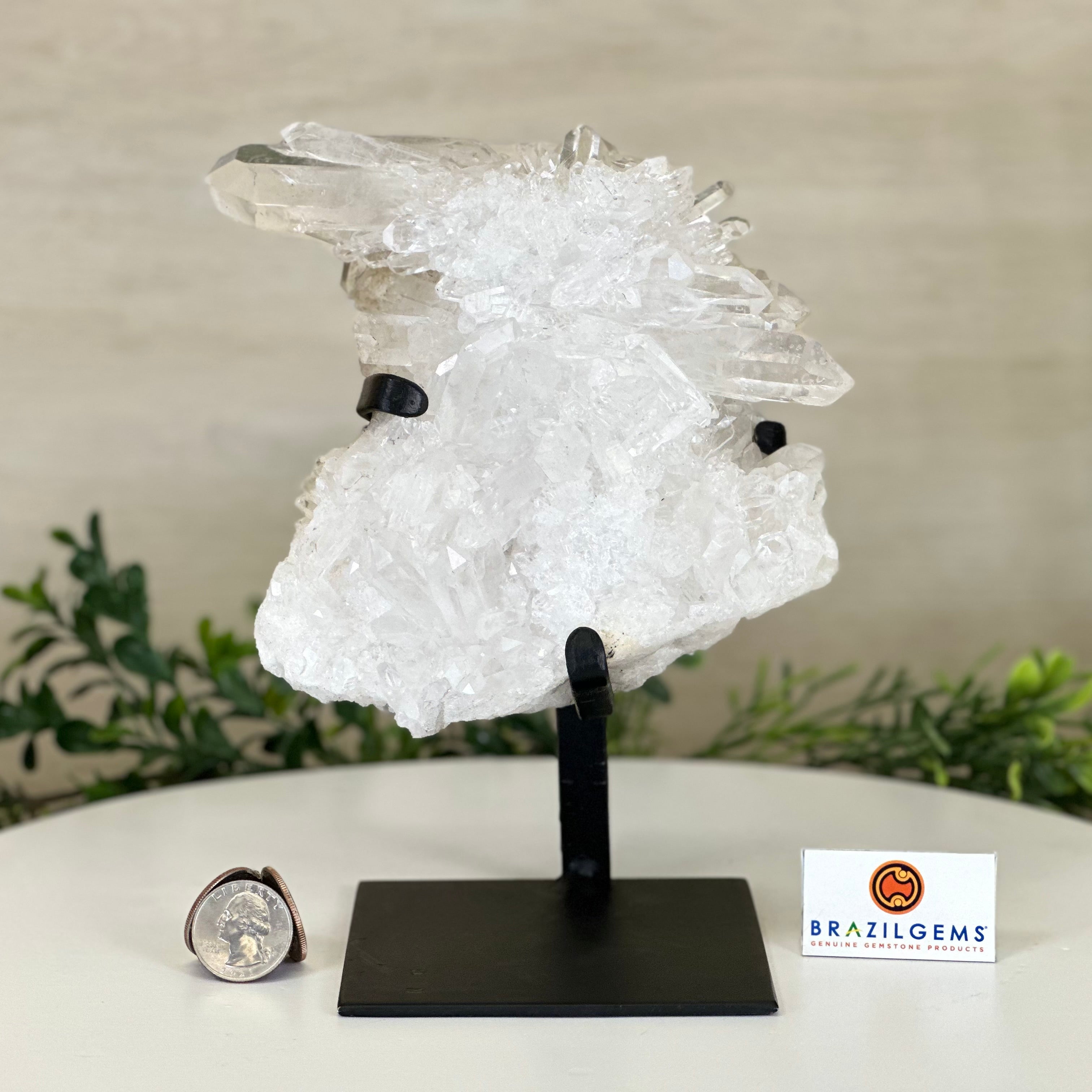 A testament to nature's sublime artistry, this extraordinary Brazilian Super Quality Clear Quartz Cluster by Brazil Gems® will boost your crystal collection to new heights. Elevated upon an elegant metal foundation, its commanding presence and radiant crystalline formations instantly captivate the observer's gaze. Each transparent facet reveals an intricate tableau of geological phenomena—a silent narrative of Earth's patient craftsmanship over countless millennia.