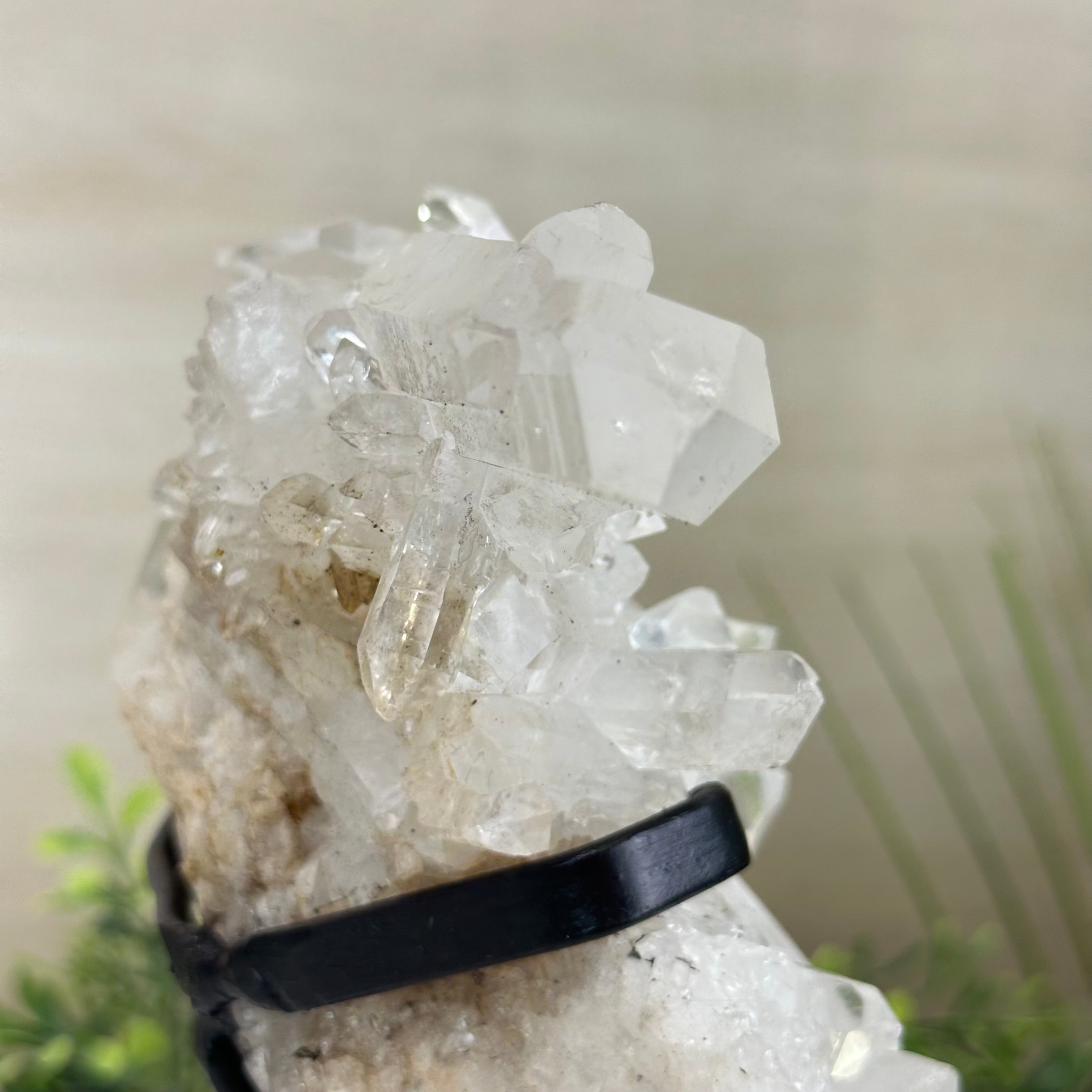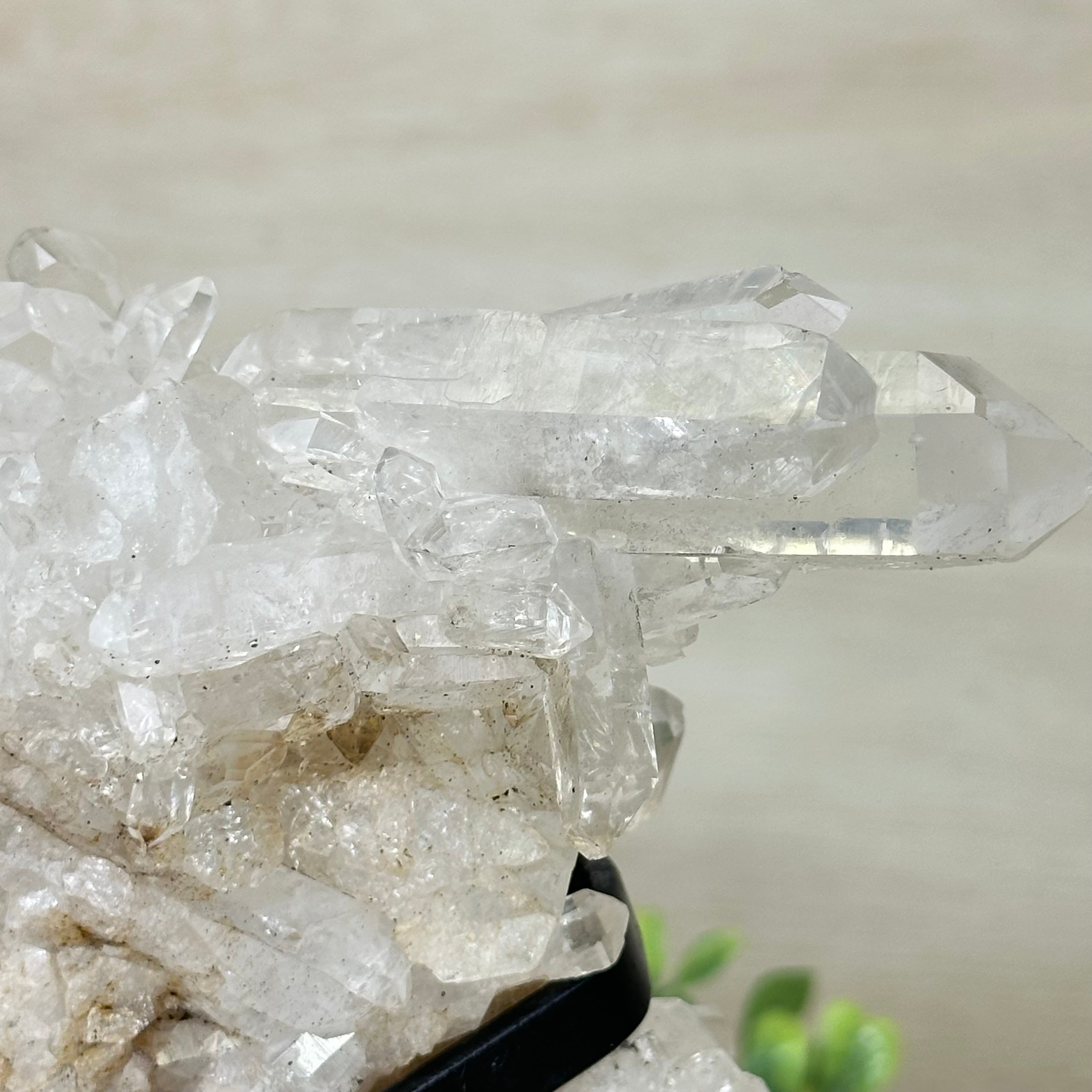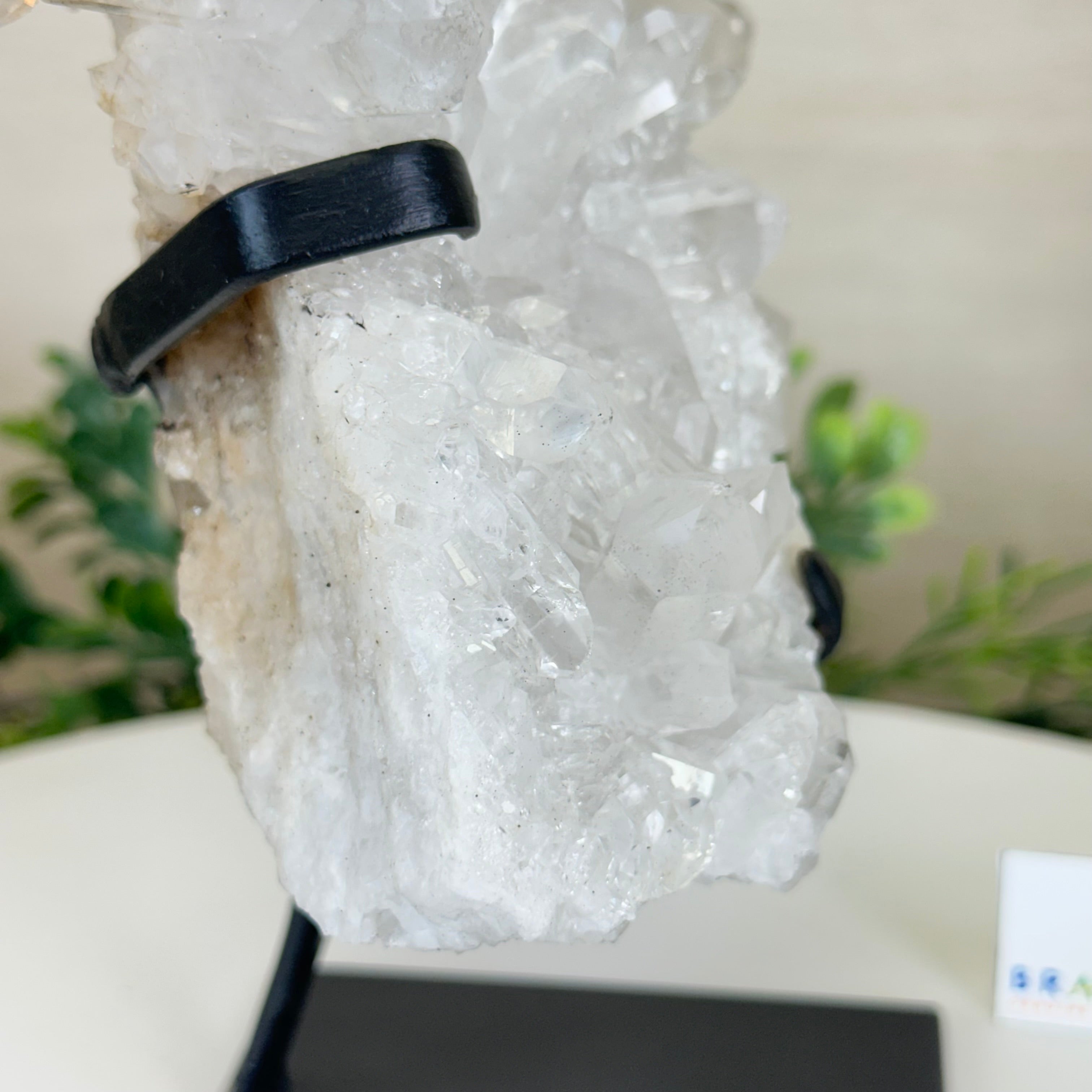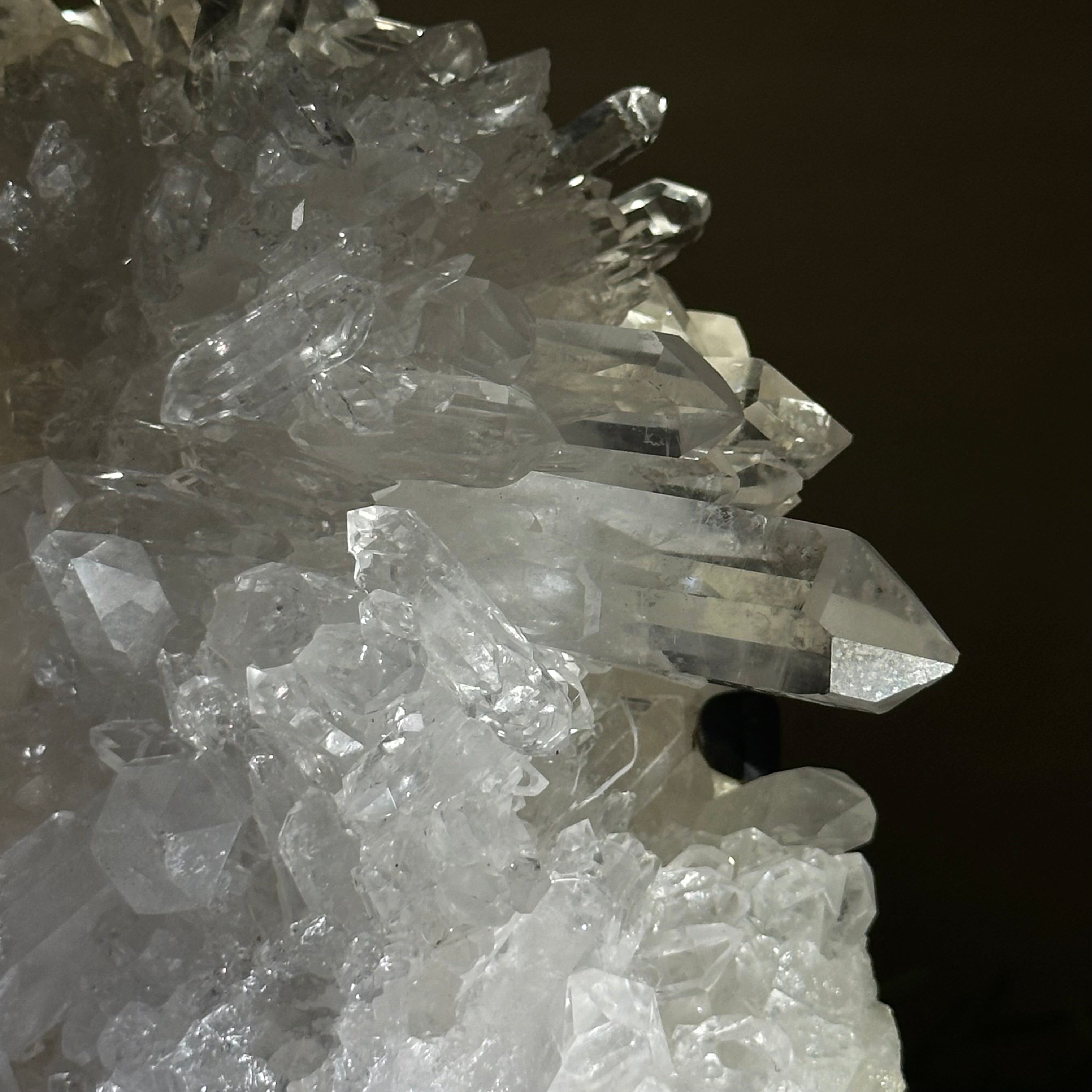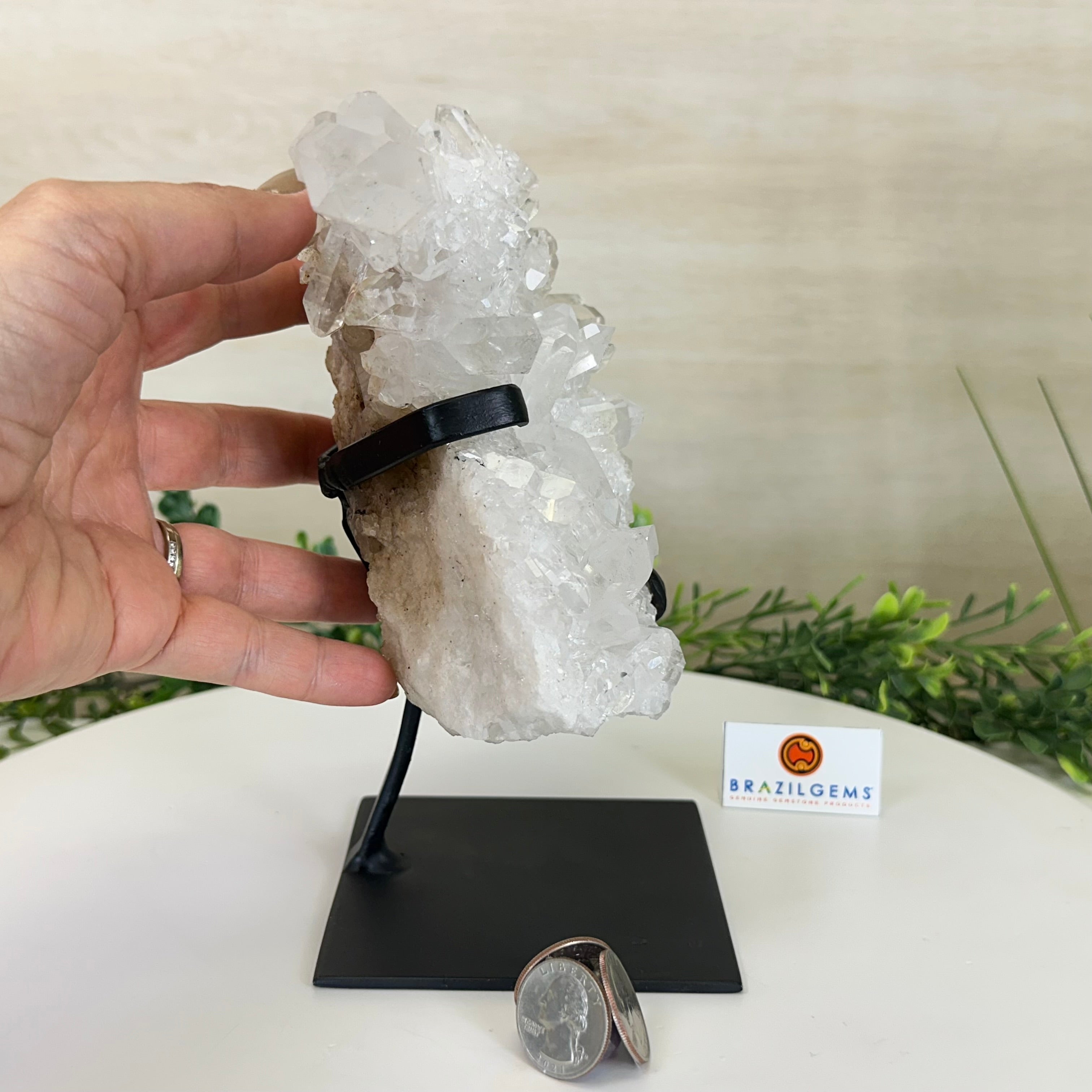 A testament to nature's sublime artistry, this extraordinary Brazilian Super Quality Clear Quartz Cluster by Brazil Gems® will boost your crystal collection to new heights. Elevated upon an elegant metal foundation, its commanding presence and radiant crystalline formations instantly captivate the observer's gaze. Each transparent facet reveals an intricate tableau of geological phenomena—a silent narrative of Earth's patient craftsmanship over countless millennia.