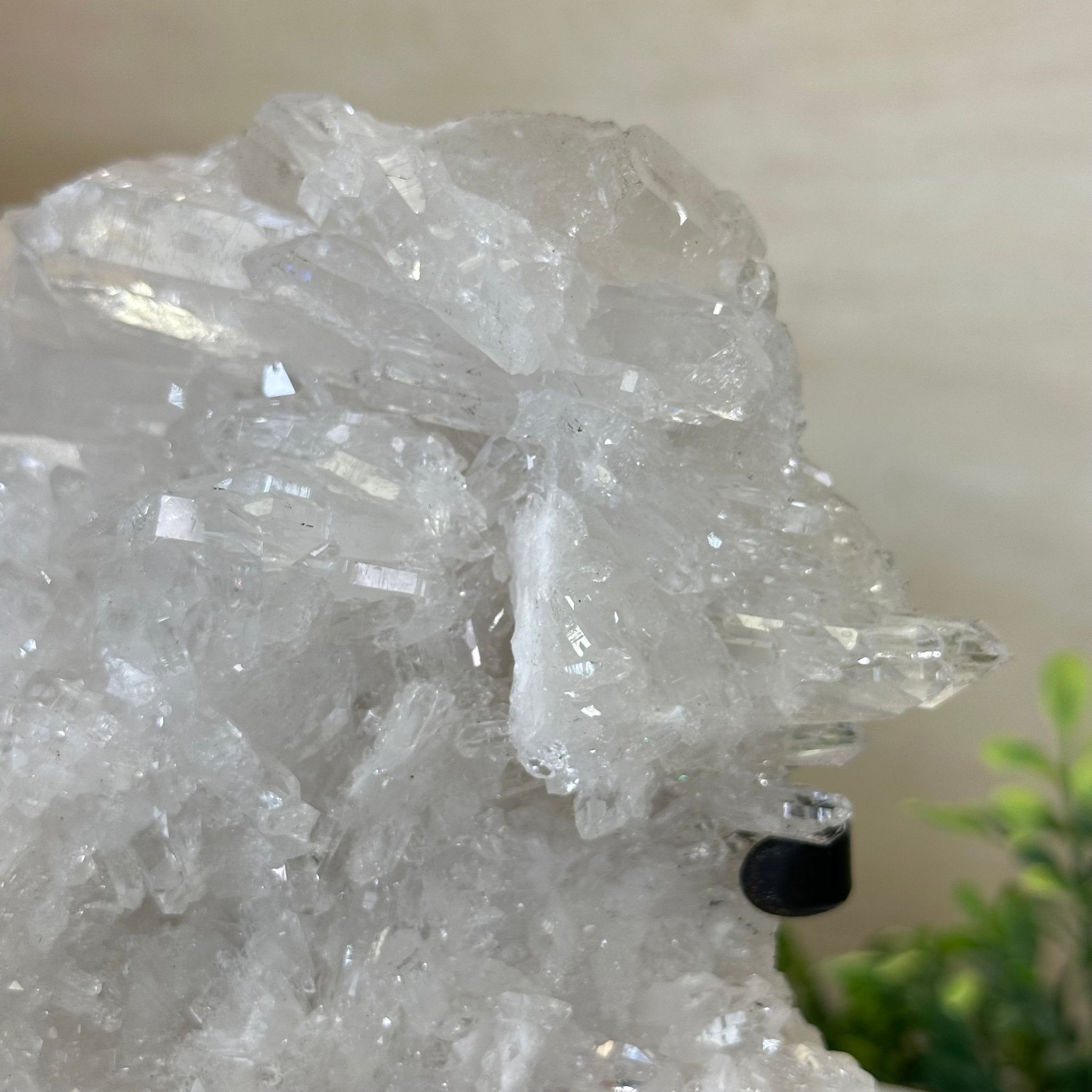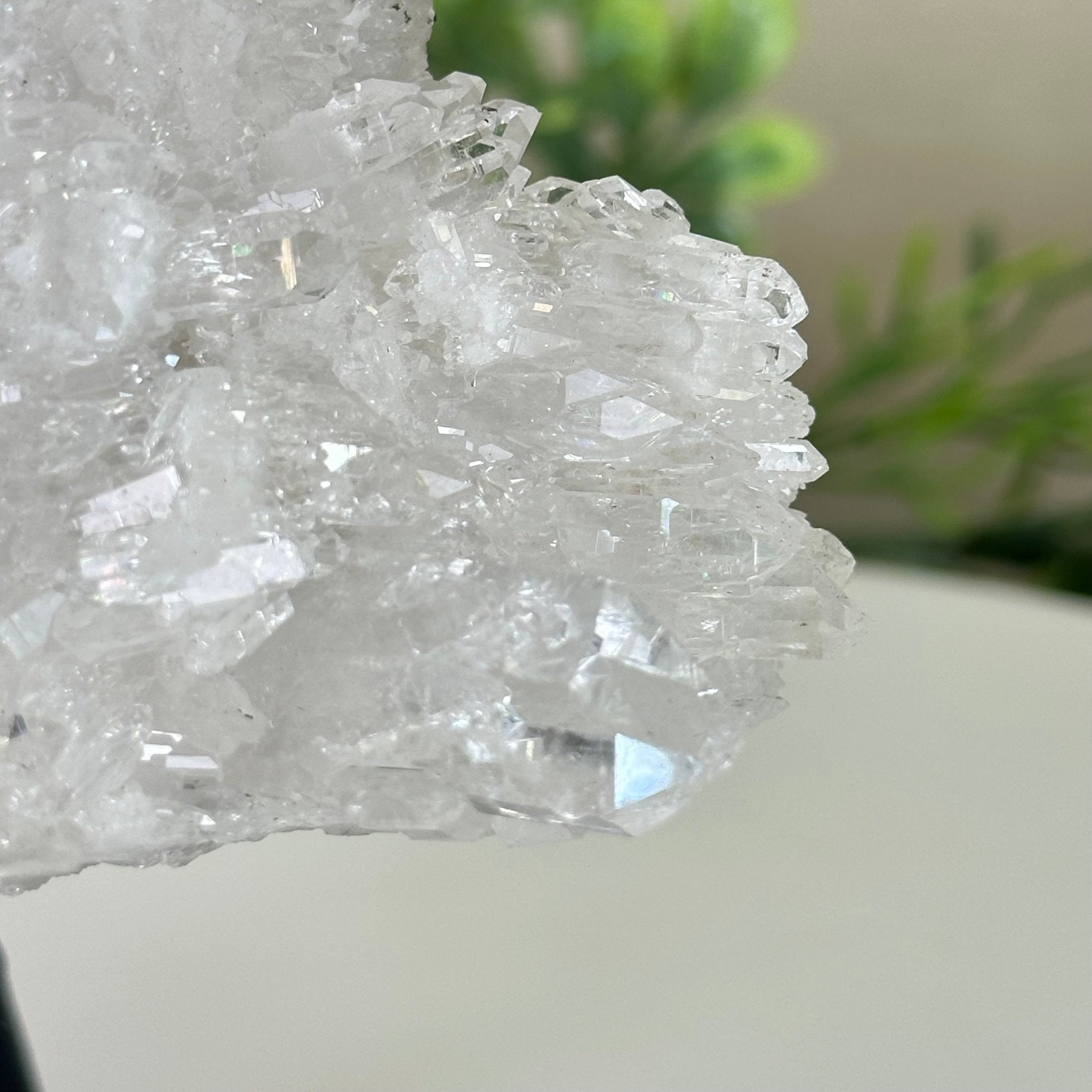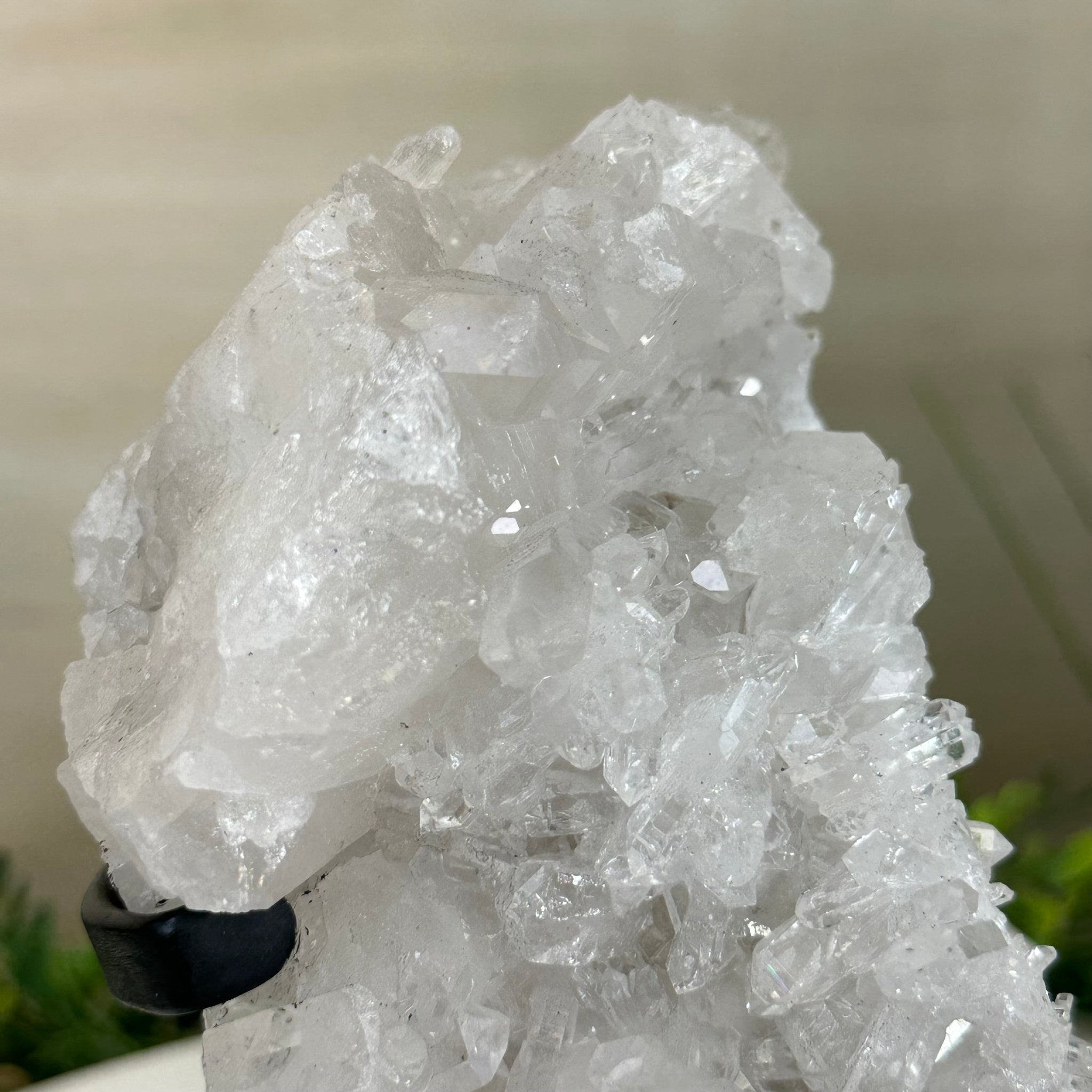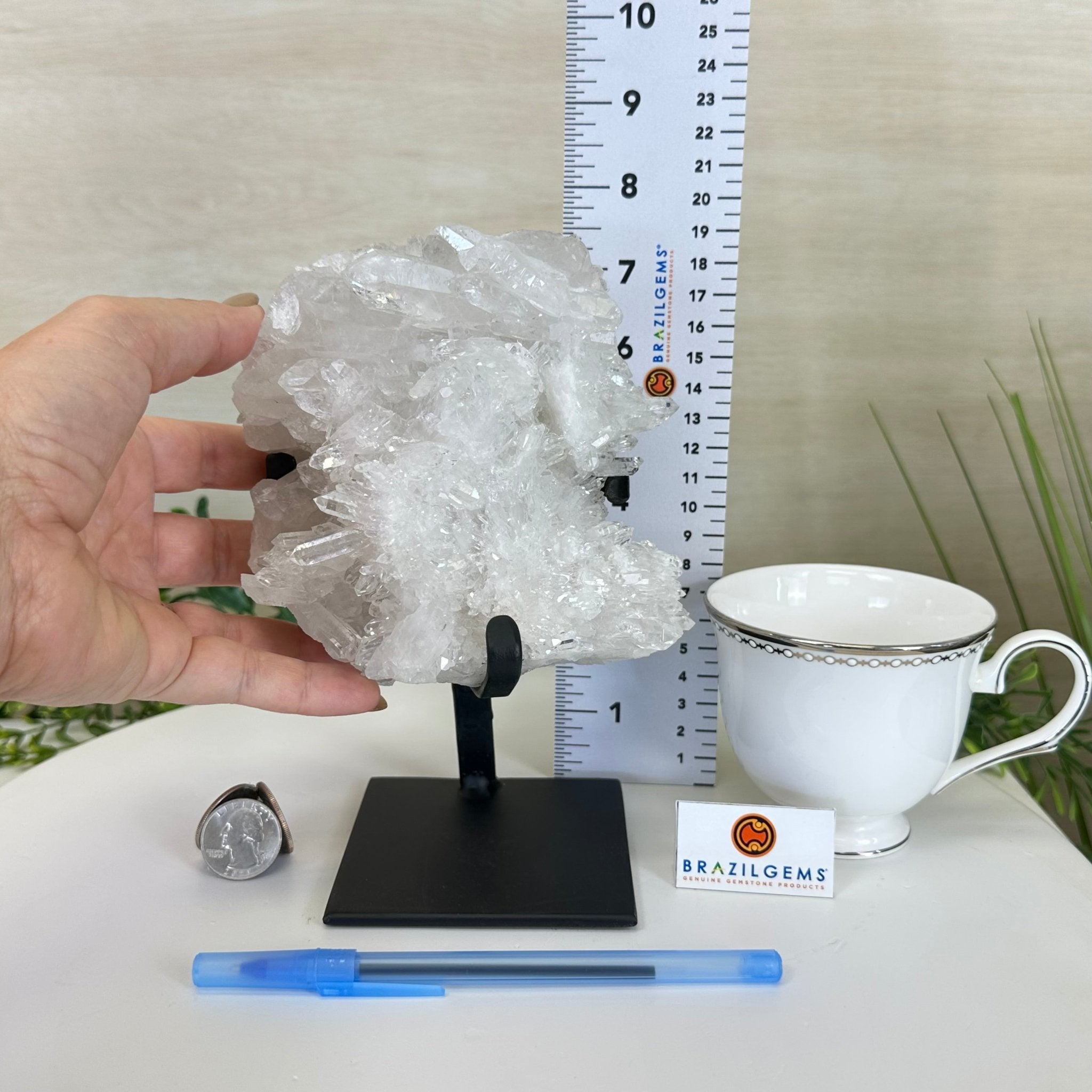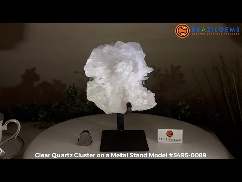 A testament to nature's sublime artistry, this extraordinary Brazilian Super Quality Clear Quartz Cluster by Brazil Gems® will boost your crystal collection to new heights. Elevated upon an elegant metal foundation, its commanding presence and radiant crystalline formations instantly captivate the observer's gaze. Each transparent facet reveals an intricate tableau of geological phenomena—a silent narrative of Earth's patient craftsmanship over countless millennia.