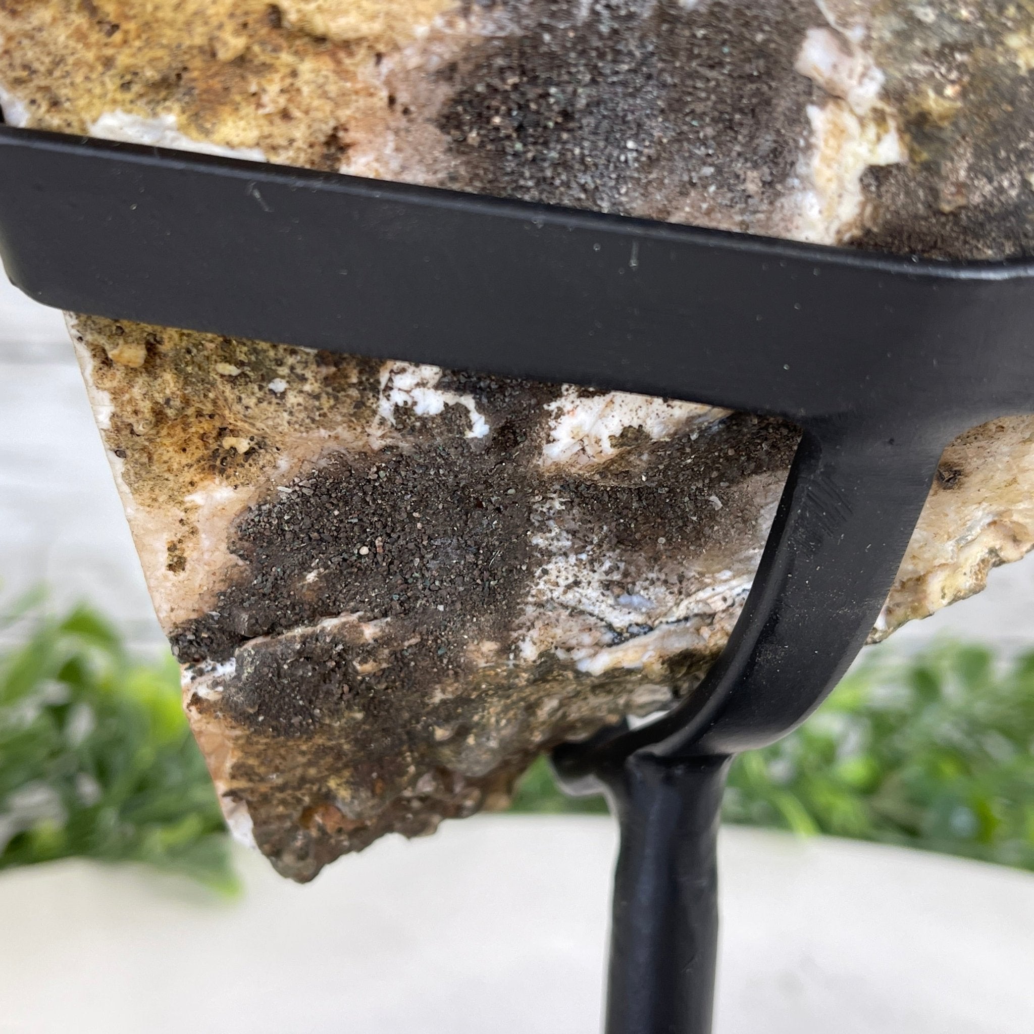 Disclaimer: This is a natural gemstone crystal sold by Brazil Gems® as is and as you see it in its images and video. It is the exact piece you will receive. It may contain natural imperfections as well as imperfections, repairs (including a clear glue to stabilize loose crystal points), scratches and/or broken edges from the extraction, polishing, mounting and prepping processes. The metal stand has been hand welded to fit this exact piece and then painted black. The crystal piece cannot be removed from its metal stand. At Brazil Gems®, we make every effort to get measurements as exact as possible but they are done by human hands and eyes and therefore may have minor discrepancies. As is the case for the majority of Citrine on the market from Brazil, this Citrine has been heated in a kiln to give it its beautiful amber color.