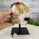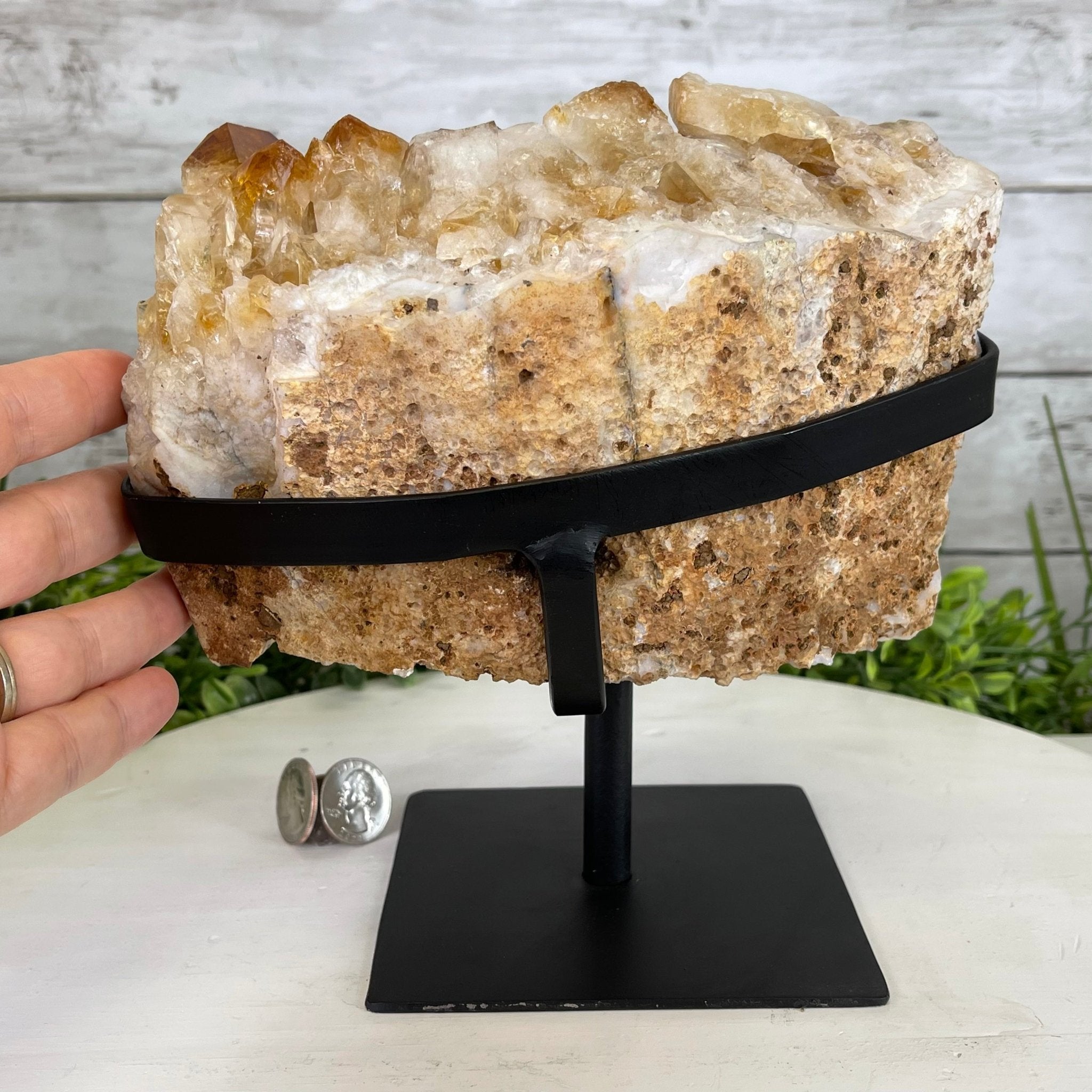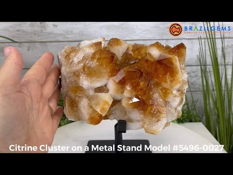 Disclaimer: This is a natural gemstone crystal sold by Brazil Gems® as is and as you see it in its images and video. It is the exact piece you will receive. It may contain natural imperfections as well as imperfections, repairs (including a clear glue to stabilize loose crystal points), scratches and/or broken edges from the extraction, polishing, mounting and prepping processes. The metal stand has been hand welded to fit this exact piece and then painted black. The crystal piece cannot be removed from its metal stand. At Brazil Gems®, we make every effort to get measurements as exact as possible but they are done by human hands and eyes and therefore may have minor discrepancies. As is the case for the majority of Citrine on the market from Brazil, this Citrine has been heated in a kiln to give it its beautiful amber color.