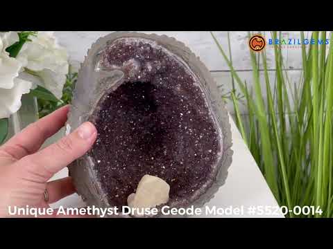 Exquisite Extra Plus Quality Uruguayan Amethyst Geode with a nice calcite formation and natural outer shell. This geode is part of a special group of Amethyst pieces that have their own character, shape and appeal.
