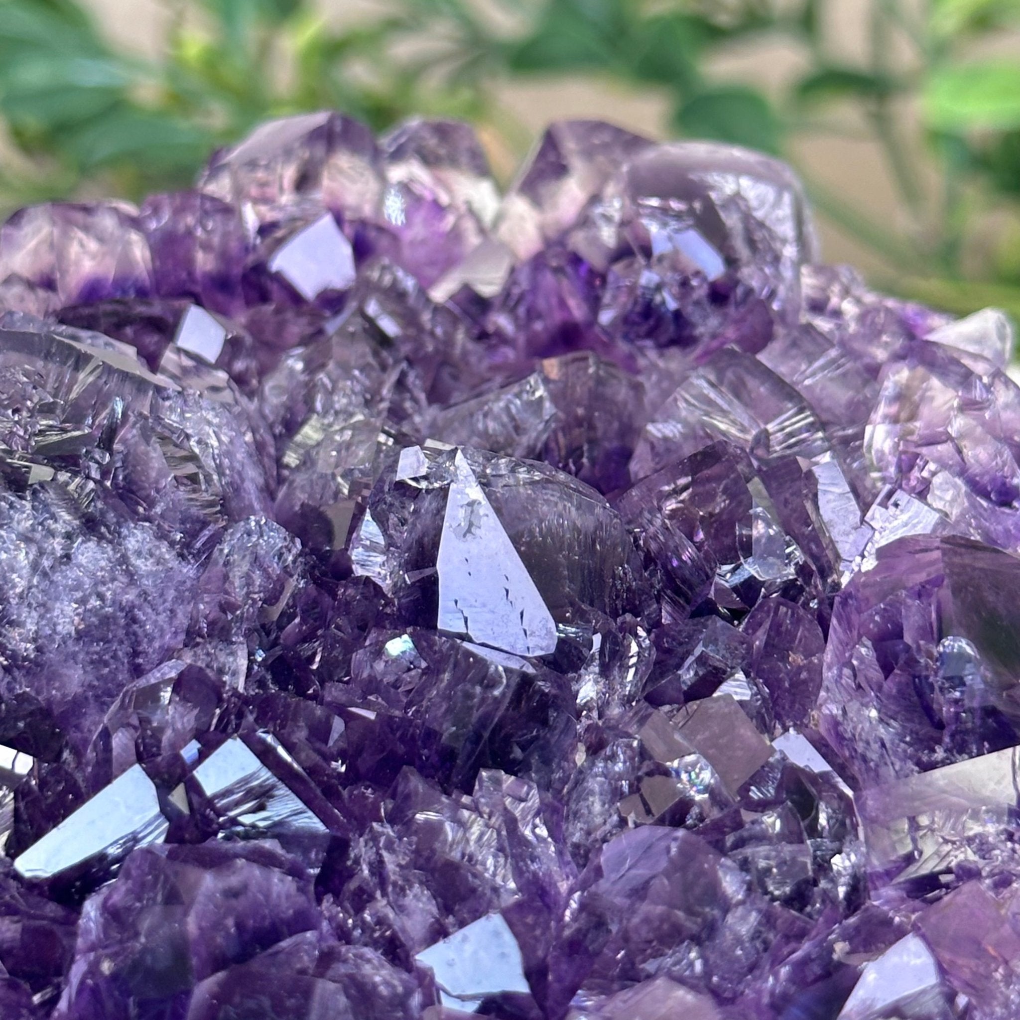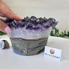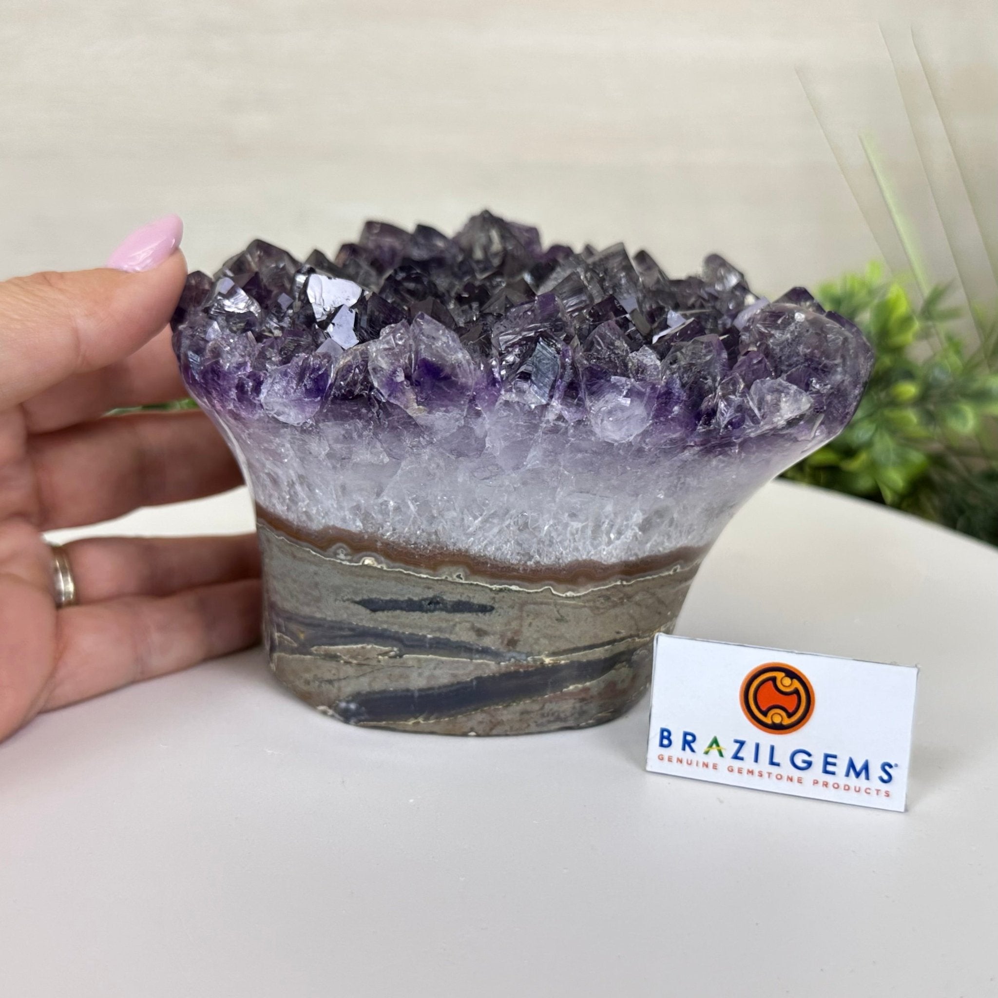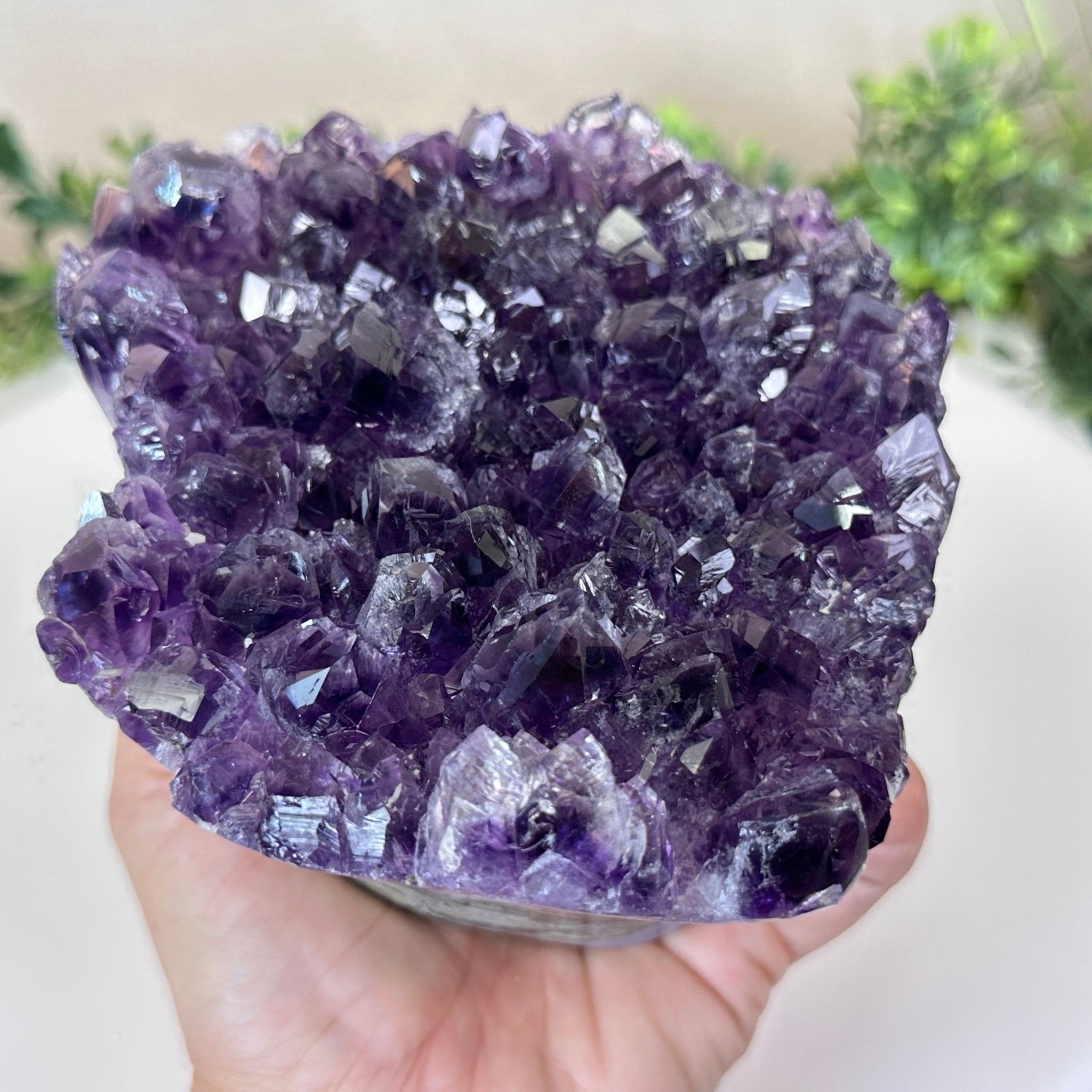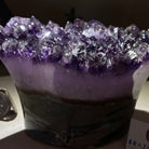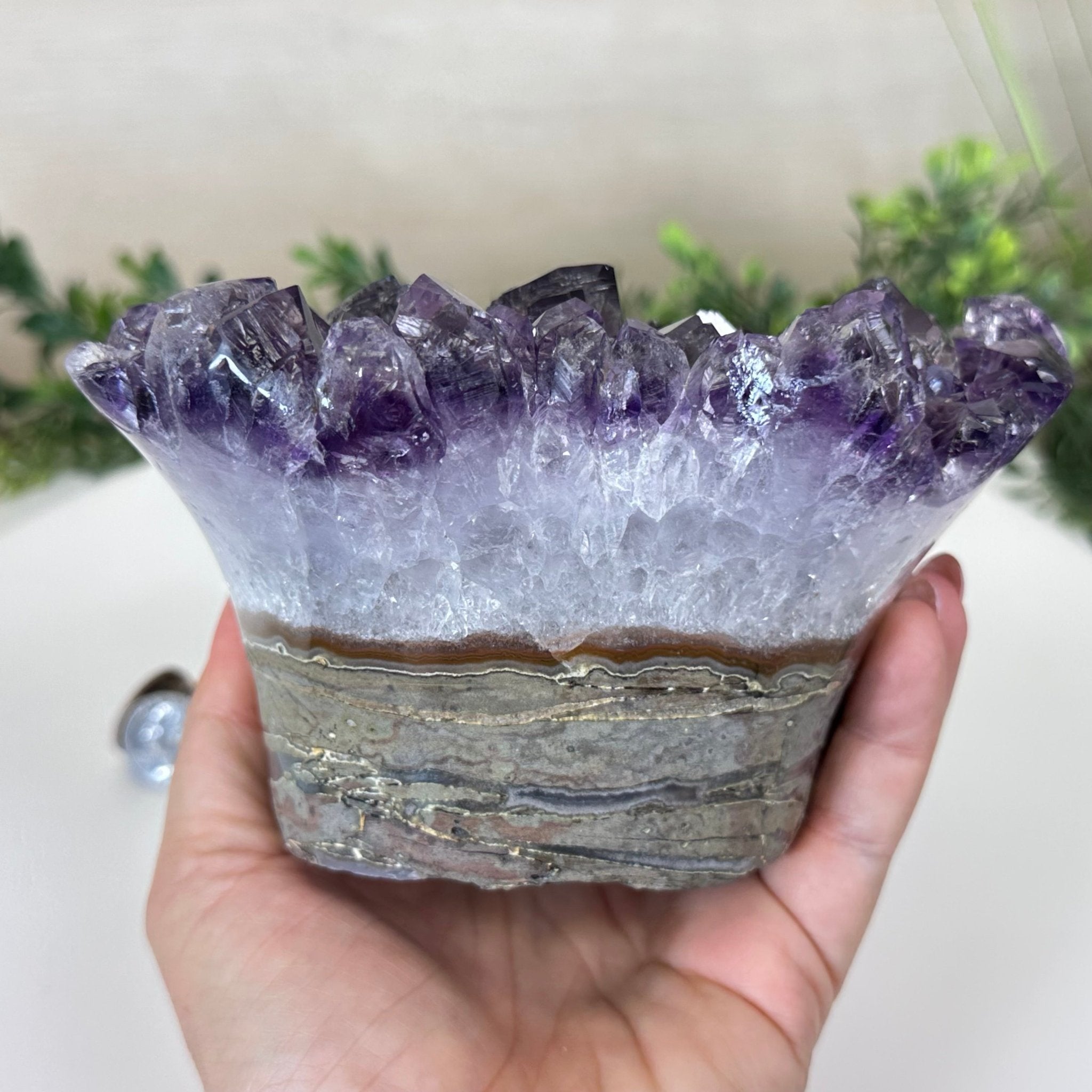 Shaped to resemble a blooming flower, this polished Amethyst Flower features a crown of sparkling crystal points framed by smooth, curved edges. Each piece is carved from natural Brazilian drusy amethyst, showcasing its unique banding and natural color variations.