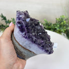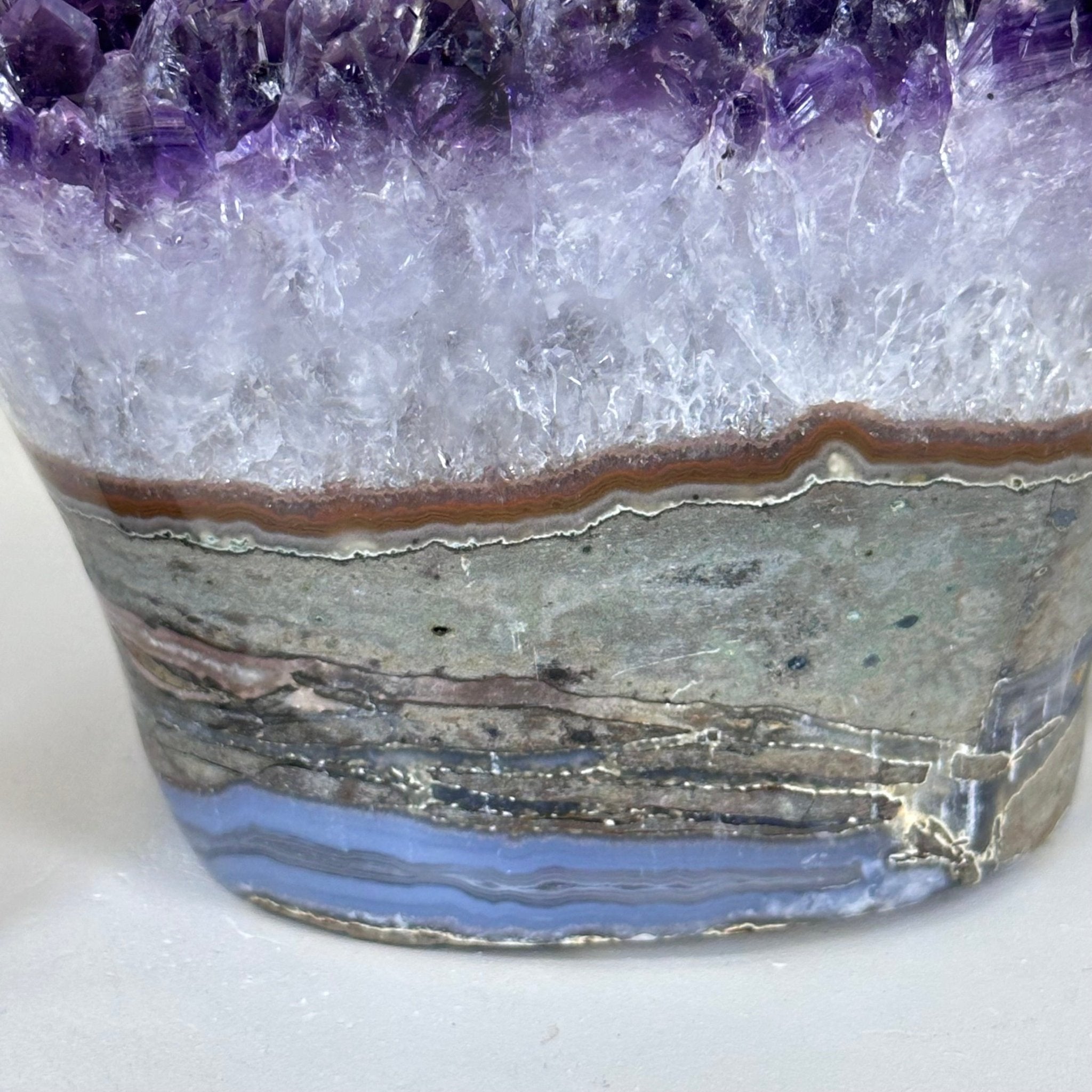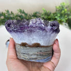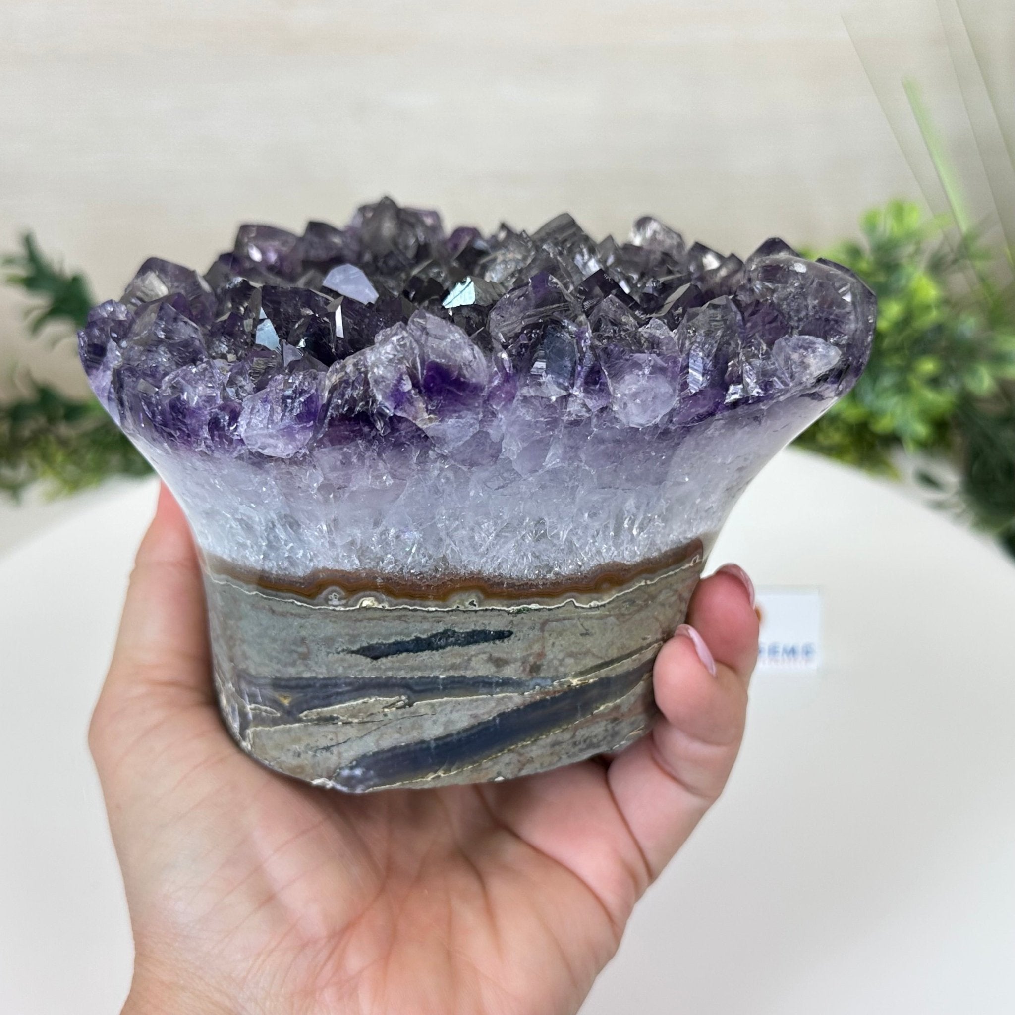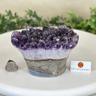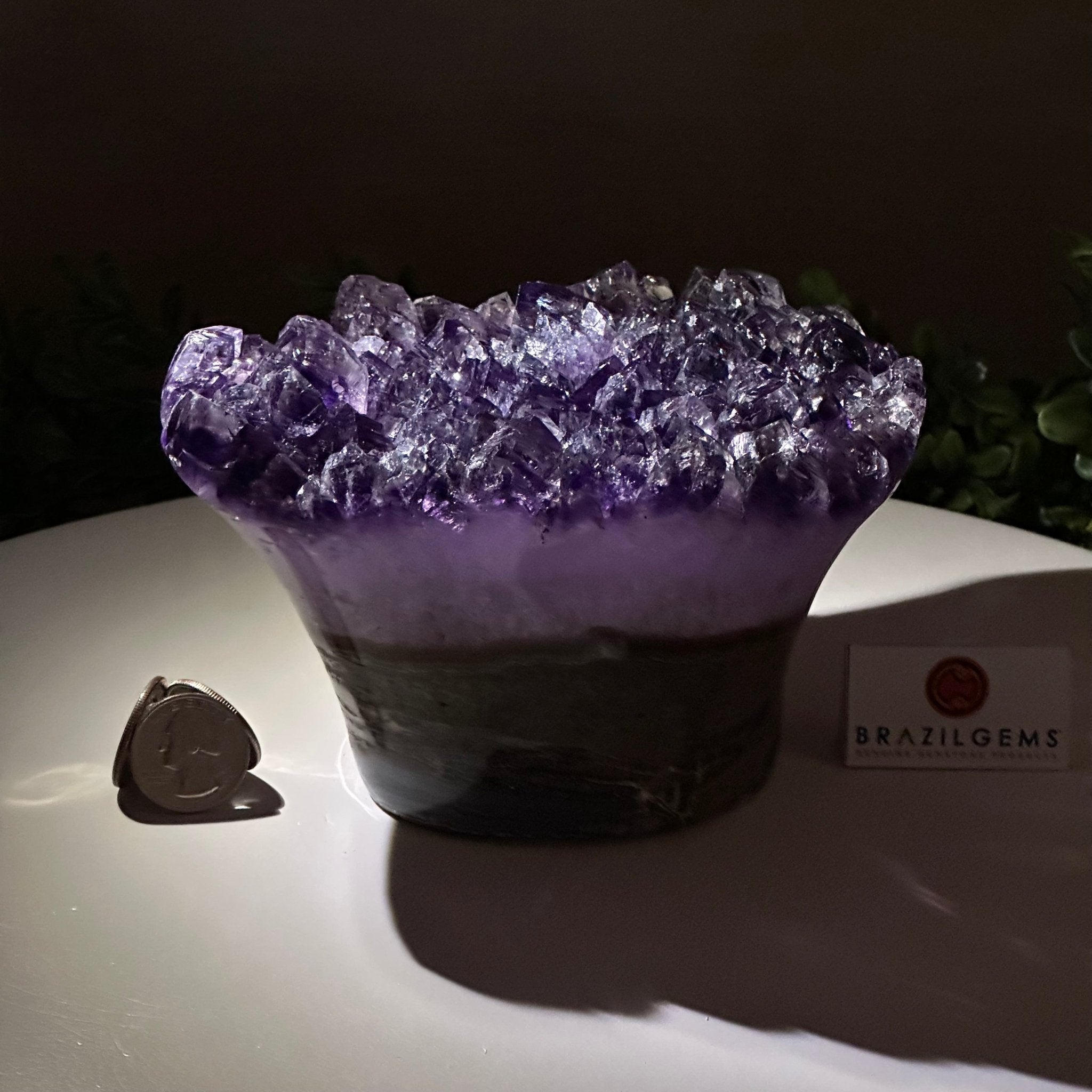 Shaped to resemble a blooming flower, this polished Amethyst Flower features a crown of sparkling crystal points framed by smooth, curved edges. Each piece is carved from natural Brazilian drusy amethyst, showcasing its unique banding and natural color variations.