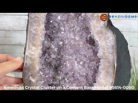 This Standard Quality Amethyst Cluster is 37.9 lbs heavy and 16" tall, and has a concrete base. The cluster has violet color crystals and is the perfect size for a desk or shelf.