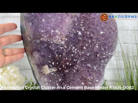 This Standard Quality Amethyst Cluster is 46.7 lbs heavy and 14.8" tall, and has a concrete base. The cluster has violet color crystals and is the perfect size for a desk or shelf.