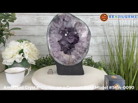 This Standard Quality Amethyst Cluster is 22.8 lbs heavy and 12.3" tall, and has a concrete base. The cluster has violet color crystals and is the perfect size for a desk or shelf.