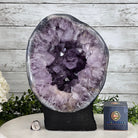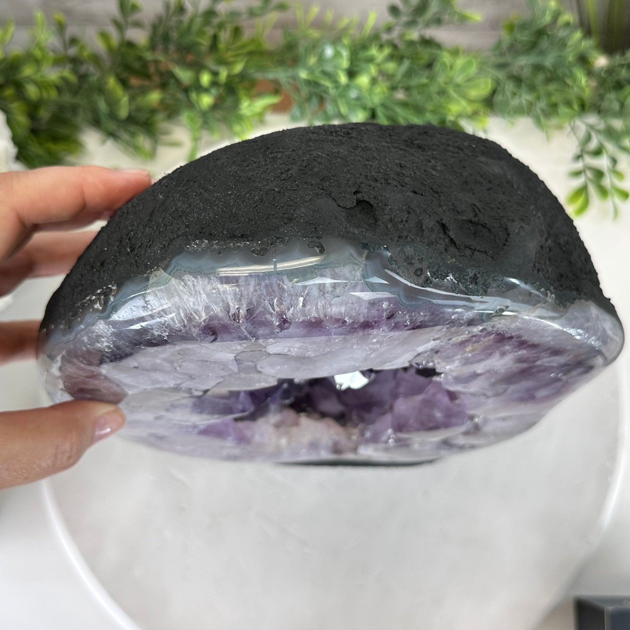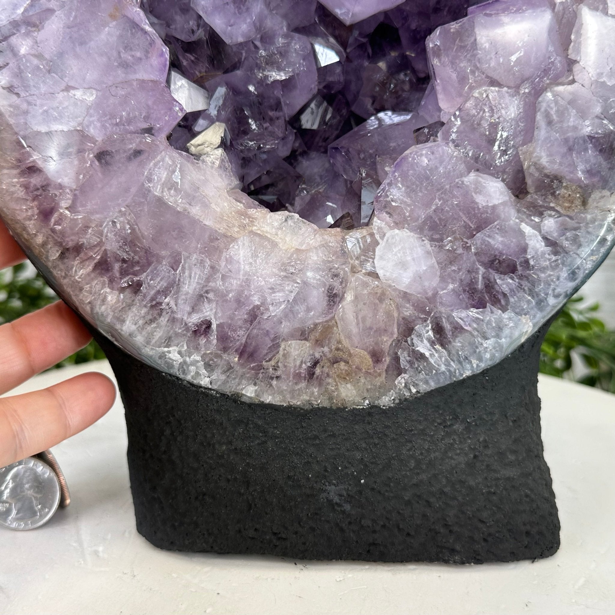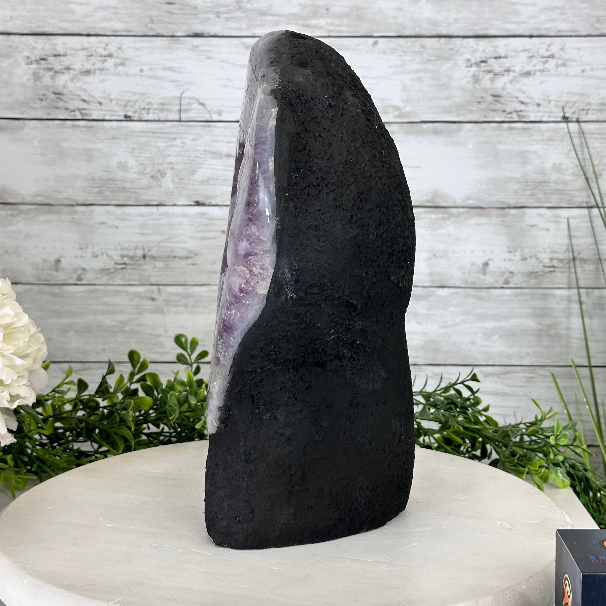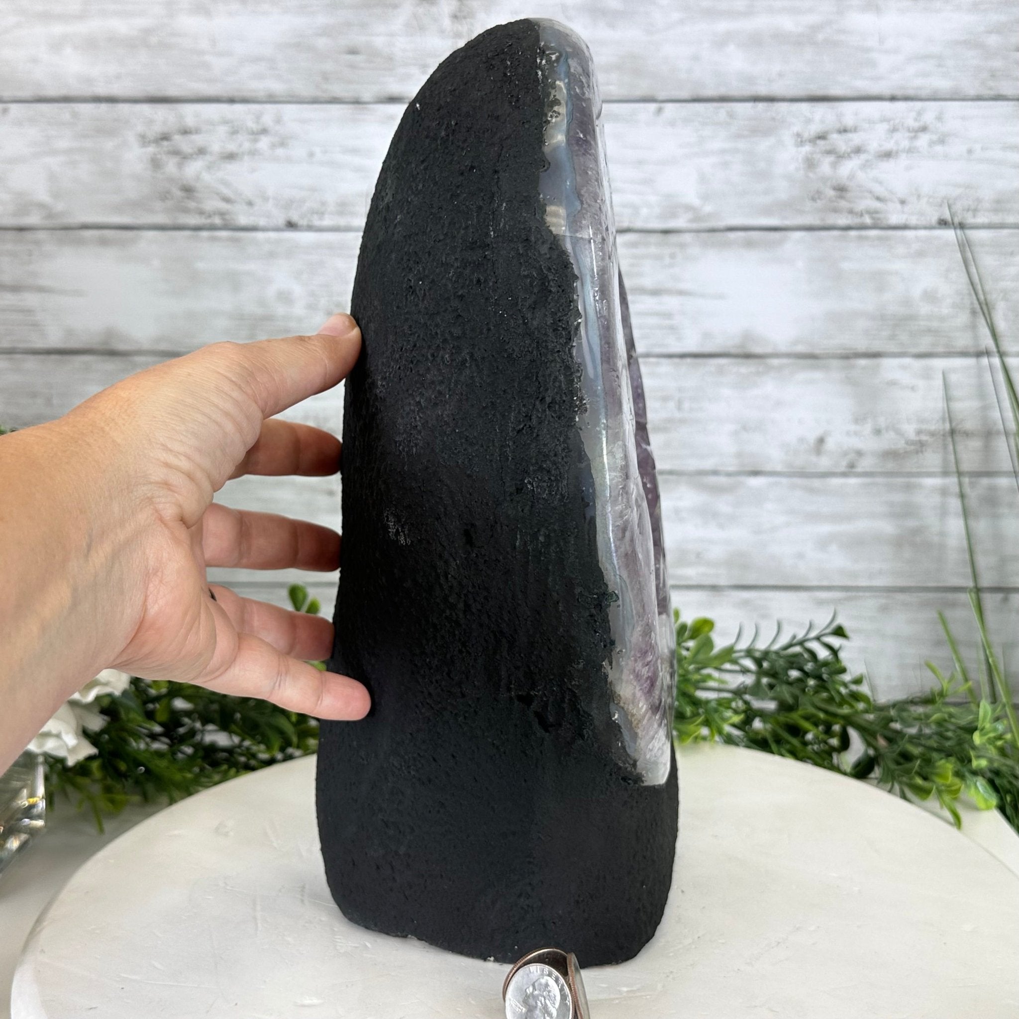 Disclaimer: This is a natural gemstone crystal sold as is and as you see it in its images and video. It is the exact one you will receive. It may contain natural imperfections and/or imperfections, broken edges and repairs from the extraction, polishing and prepping processes. In order for it to stand on its own, the back and bottom have been reinforced with cement then painted black. We take every effort to get measurements as exact as possible but they are done by human hands & eyes and therefore may have minor discrepancies.