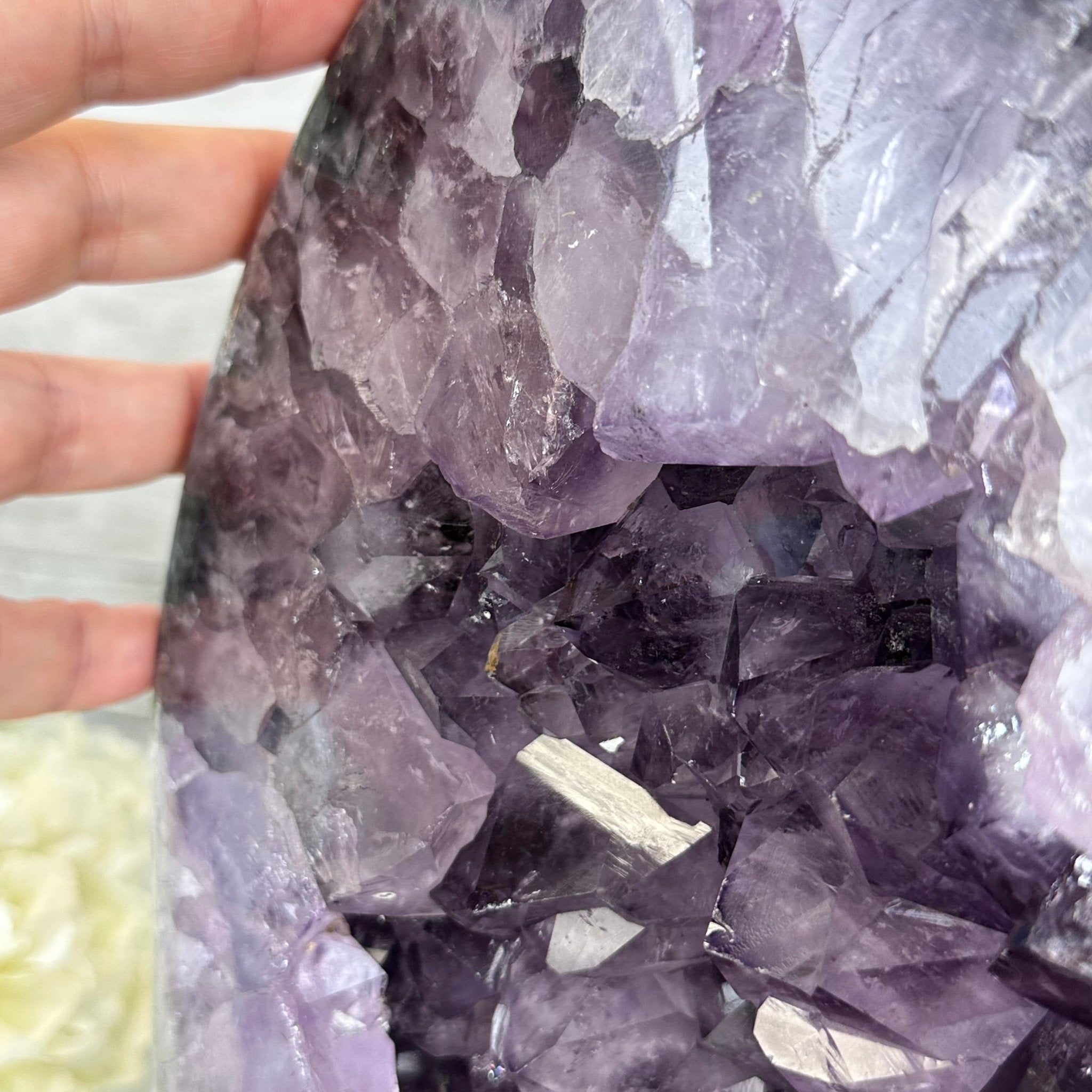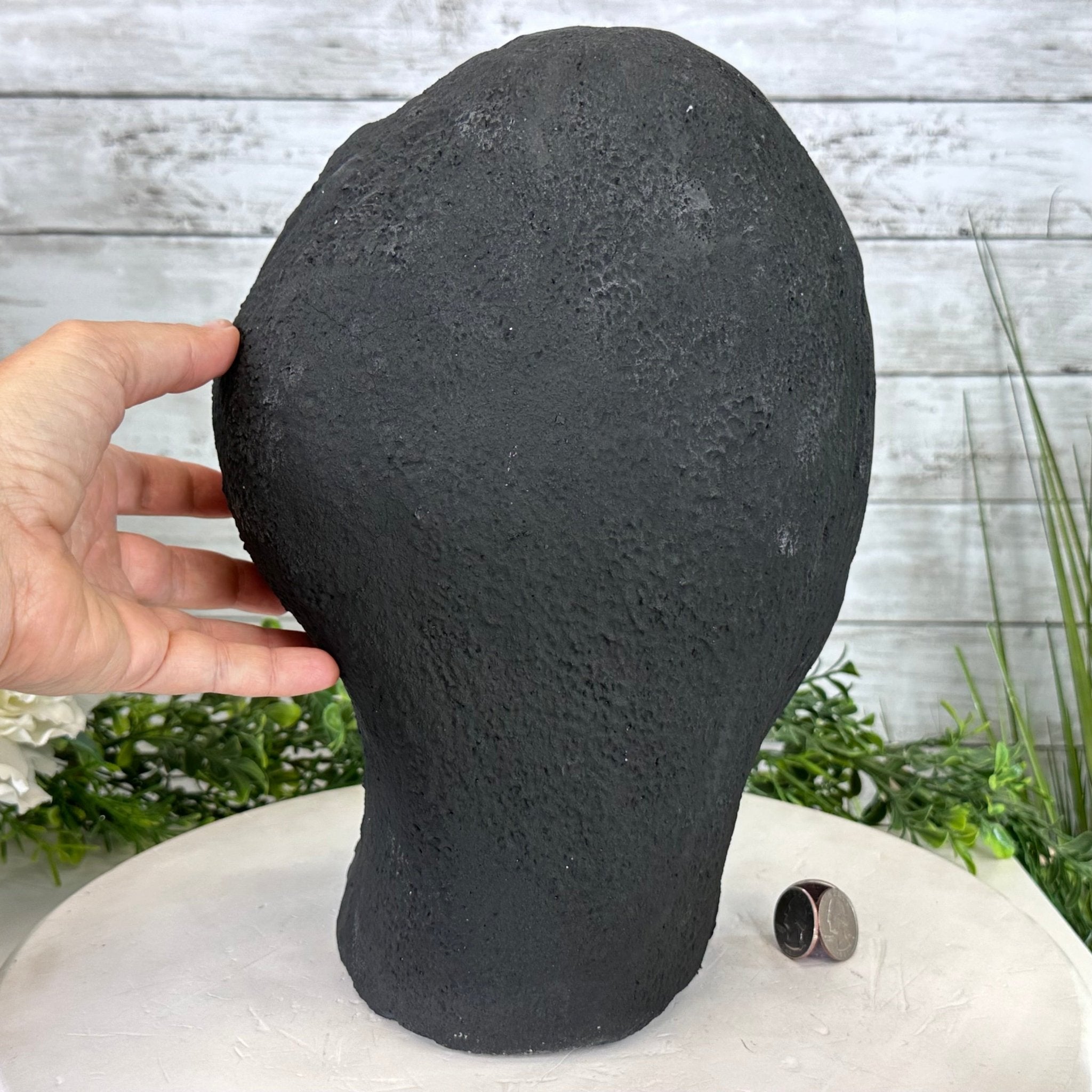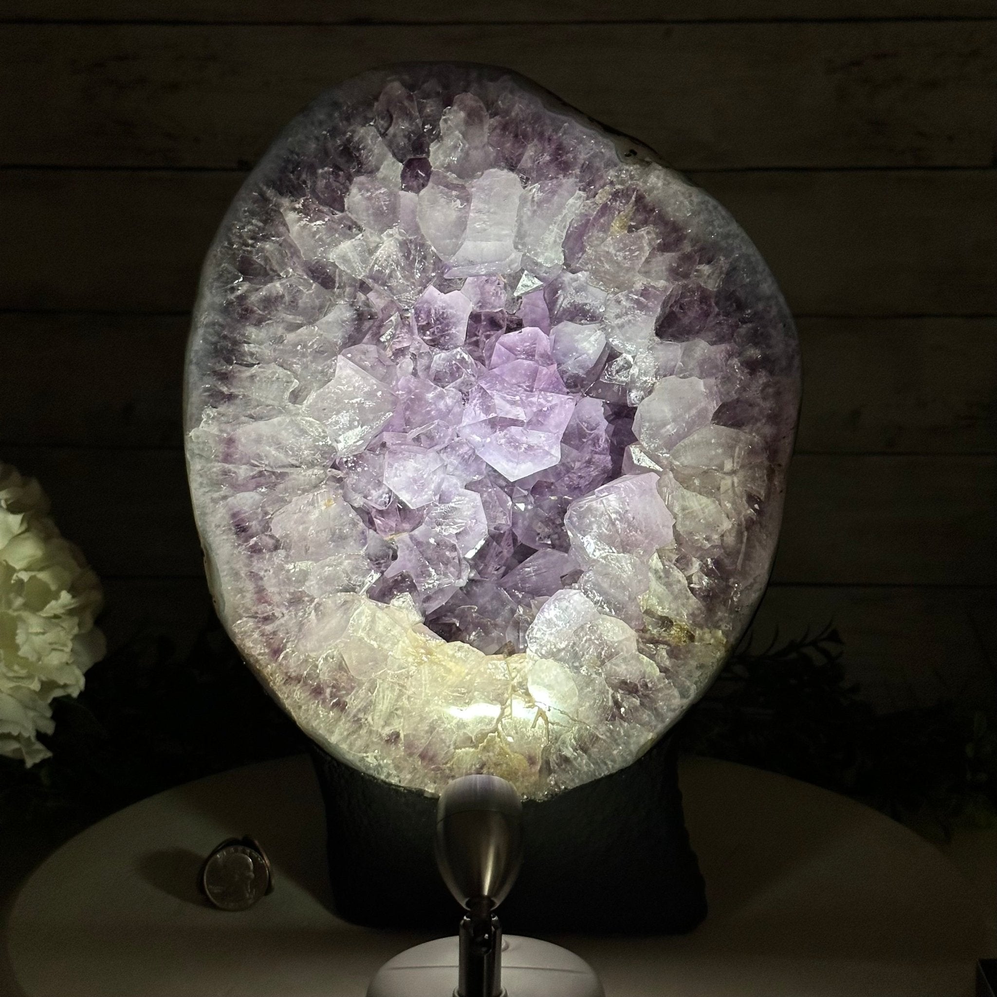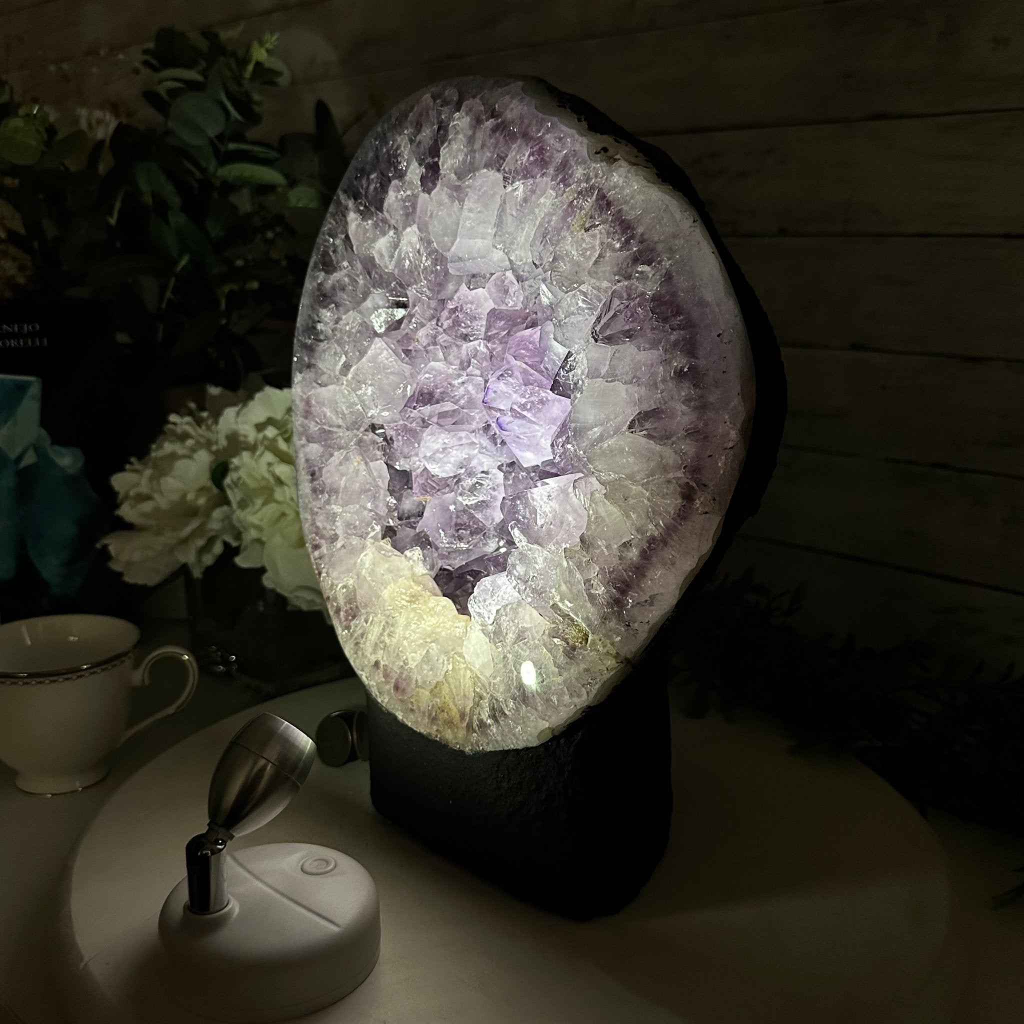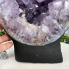 Disclaimer: This is a natural gemstone crystal sold as is and as you see it in its images and video. It is the exact one you will receive. It may contain natural imperfections and/or imperfections, broken edges and repairs from the extraction, polishing and prepping processes. In order for it to stand on its own, the back and bottom have been reinforced with cement then painted black. We take every effort to get measurements as exact as possible but they are done by human hands & eyes and therefore may have minor discrepancies.