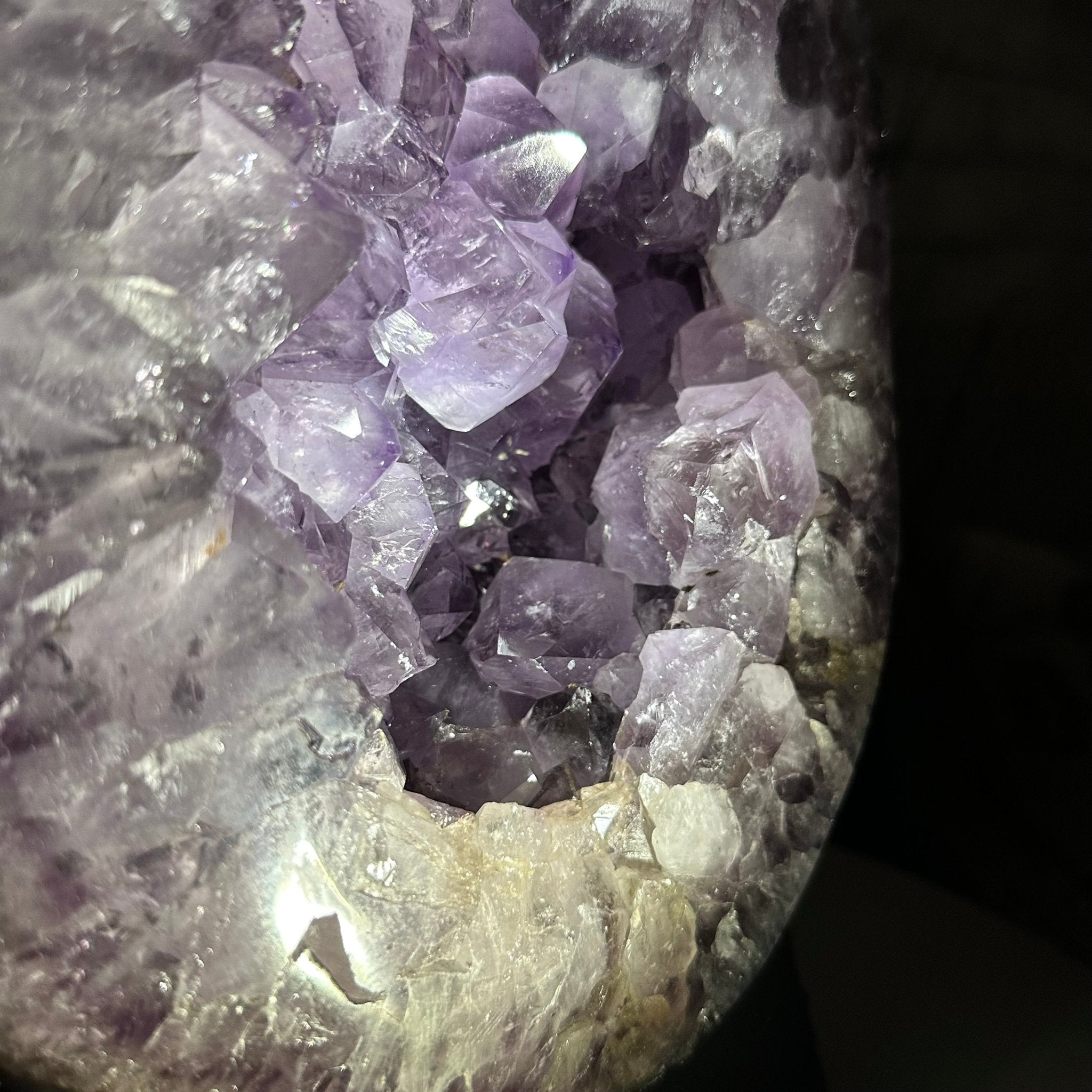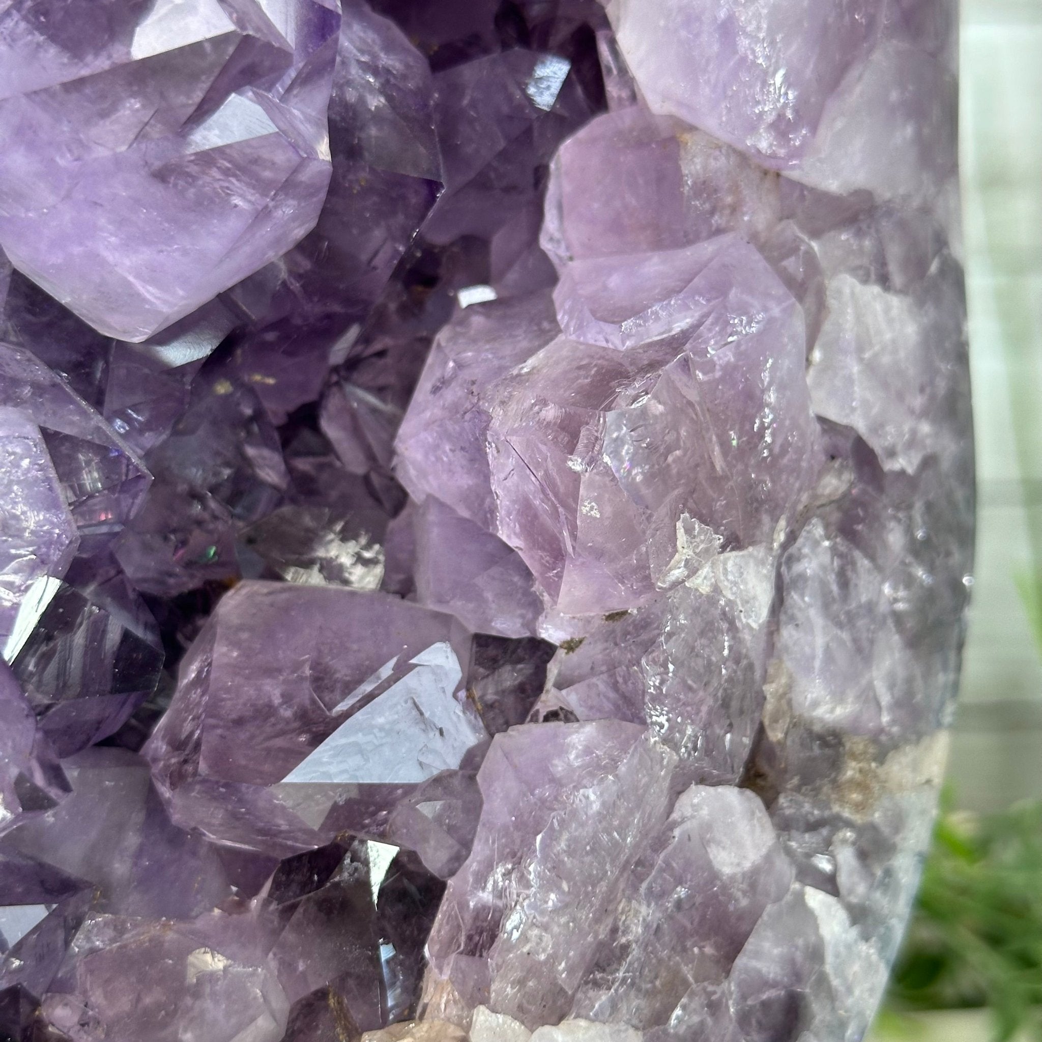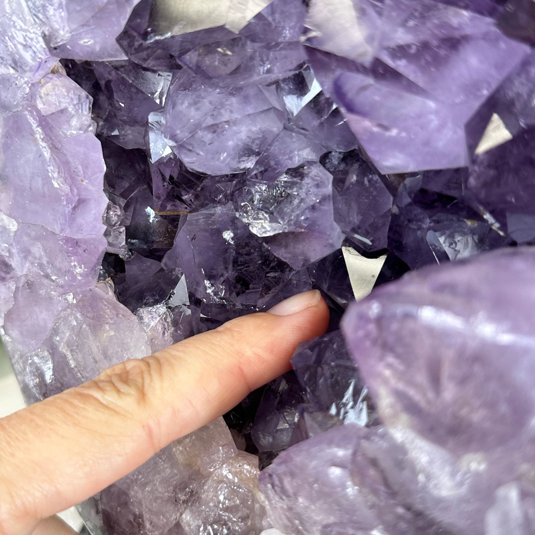 The formation of amethyst is a story of icy beauty crystallizing from a legacy of fire. Basaltic lava can cool with porous cavities that range in size up to 15 feet long. Silica-rich waters run through these cavities. Traces of silica leave the seeds of crystalline growth. The purple color of amethyst is traced to iron in the water. Placement of amethyst in your environment is an invitation to let healing energy and the timelessness of the Earth take your journey to a higher plane. Protect your stones from direct sunlight to preserve their vibrancy.