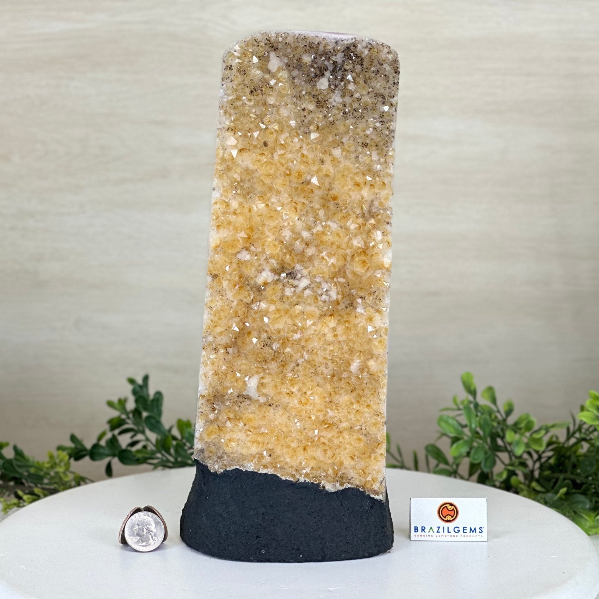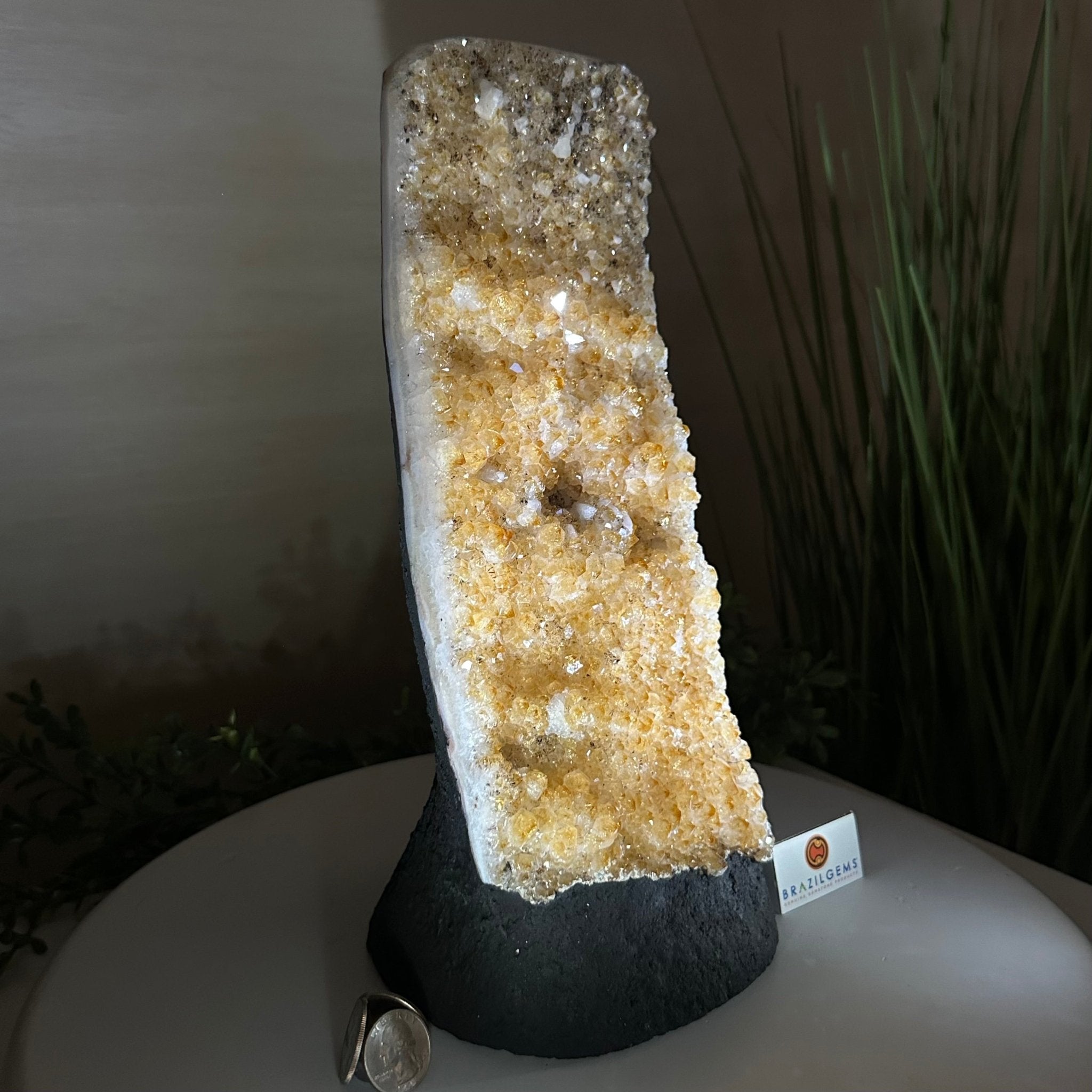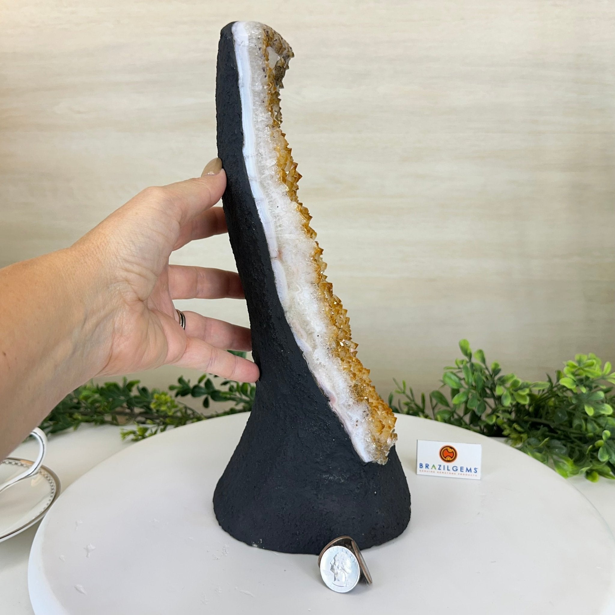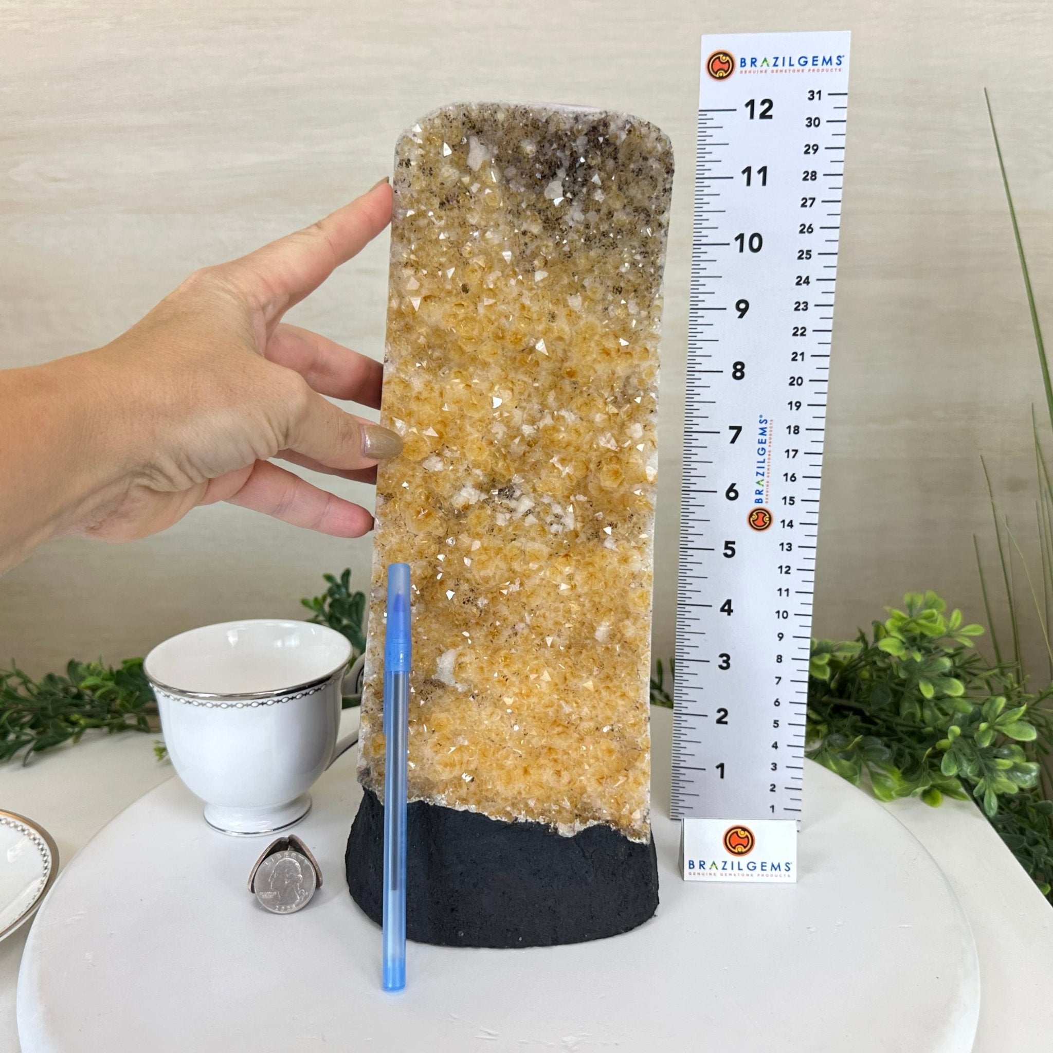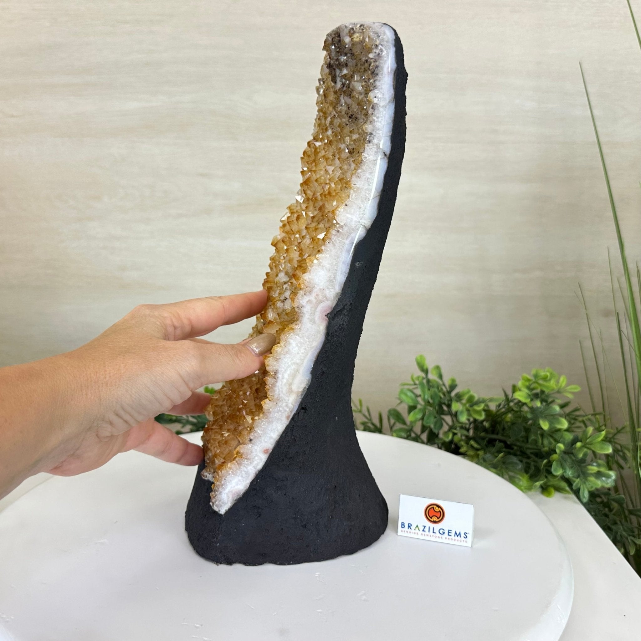 Disclaimer: This is a natural gemstone crystal sold by Brazil Gems® as is and as you see it in its images and video. It is the exact one you will receive. It may contain natural imperfections and/or imperfections, broken edges and repairs from the extraction, polishing and prepping processes. The bottom and sides have been reinforced with cement then painted black. As is the case for the majority of Citrine on the market from Brazil, this Citrine has been heated to give it its beautiful amber color. At Brazil Gems® we make every effort to get measurements as exact as possible but they are done by human hands and eyes and therefore may have minor discrepancies.