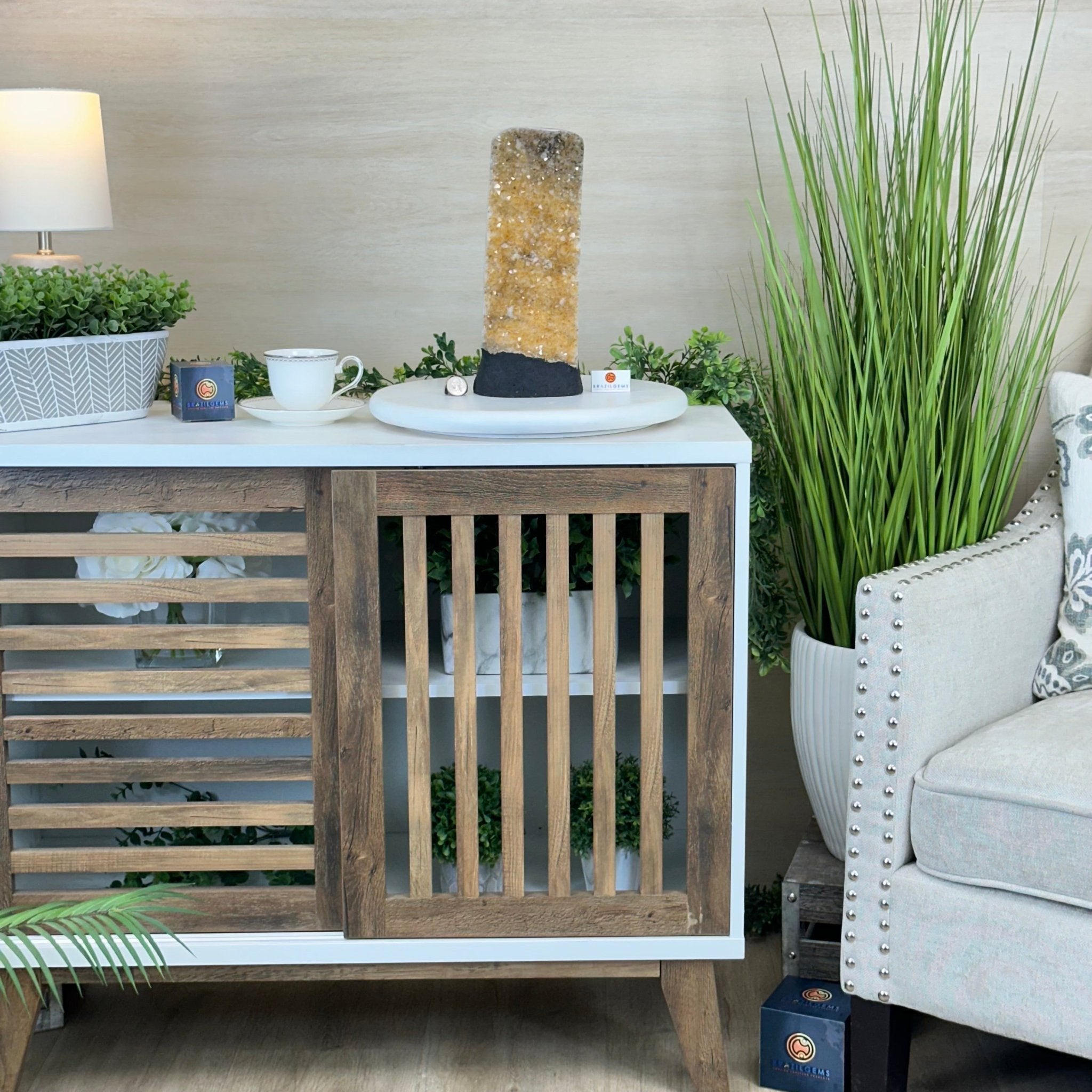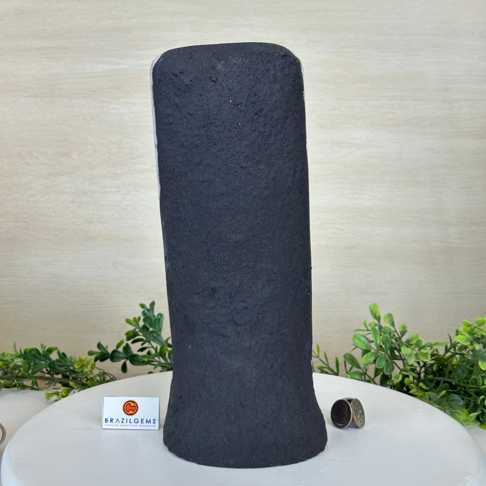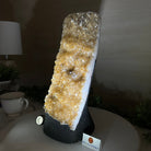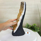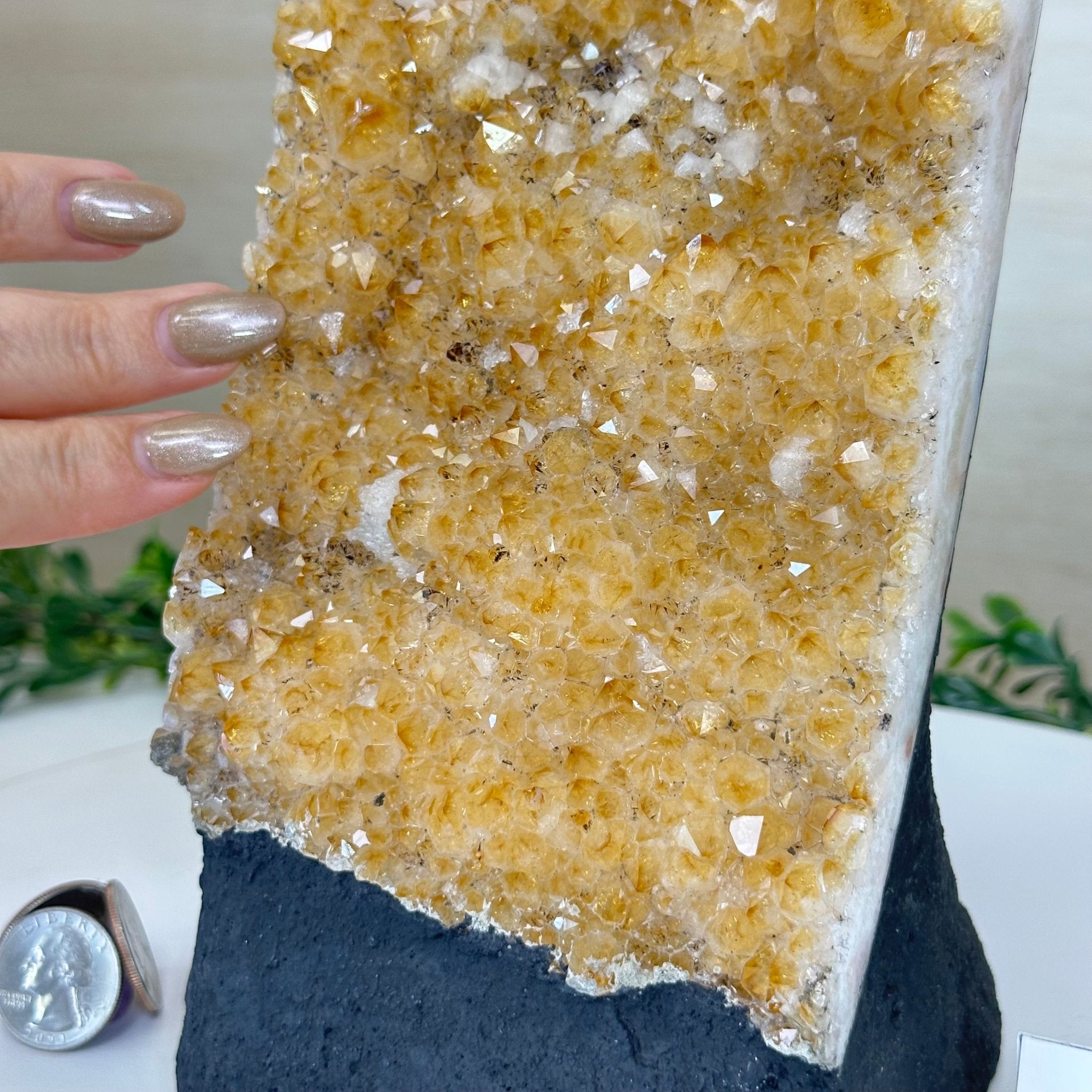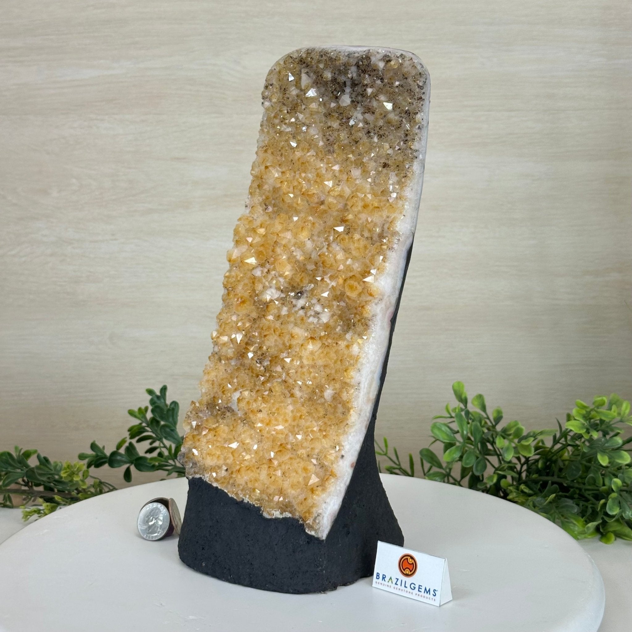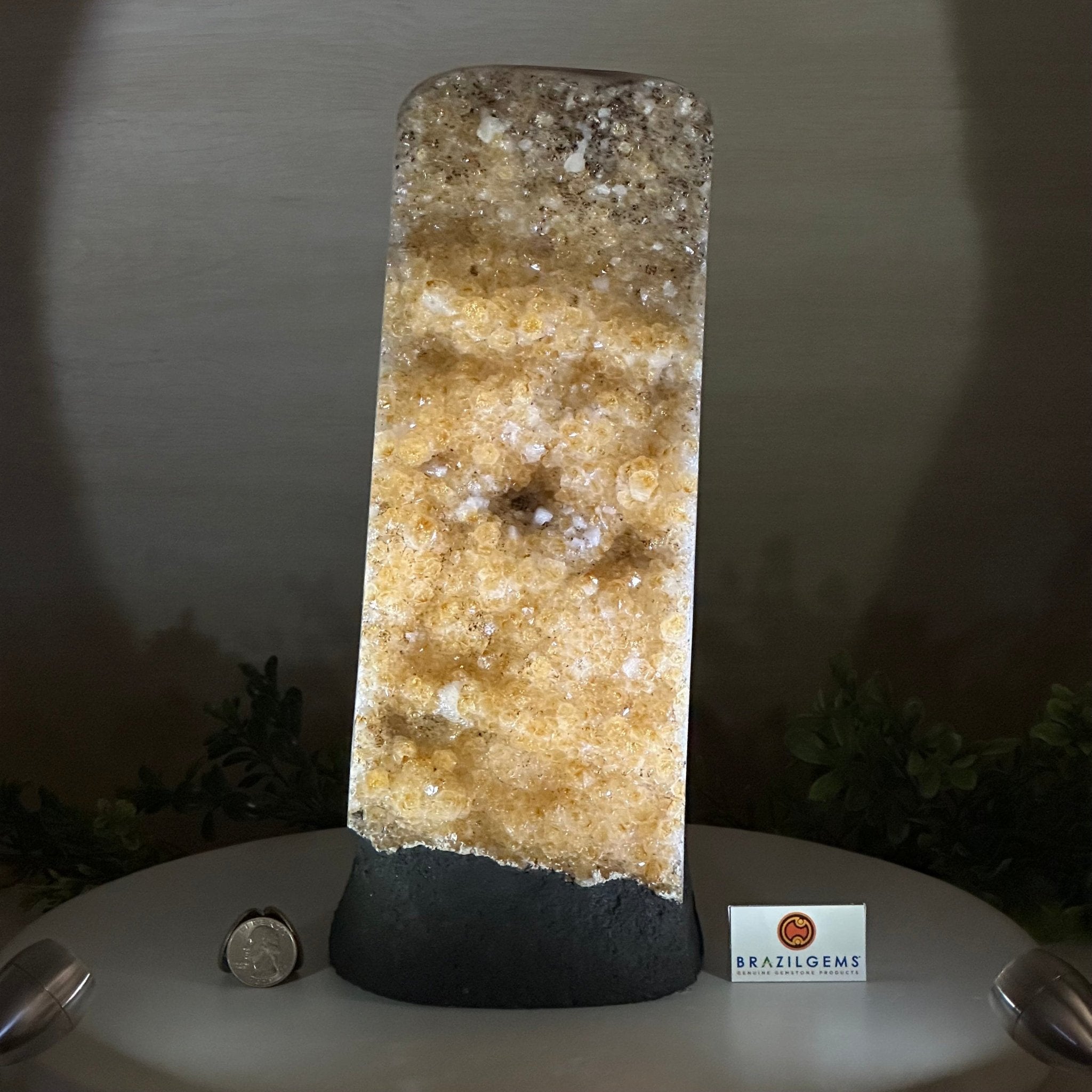 Disclaimer: This is a natural gemstone crystal sold by Brazil Gems® as is and as you see it in its images and video. It is the exact one you will receive. It may contain natural imperfections and/or imperfections, broken edges and repairs from the extraction, polishing and prepping processes. The bottom and sides have been reinforced with cement then painted black. As is the case for the majority of Citrine on the market from Brazil, this Citrine has been heated to give it its beautiful amber color. At Brazil Gems® we make every effort to get measurements as exact as possible but they are done by human hands and eyes and therefore may have minor discrepancies.