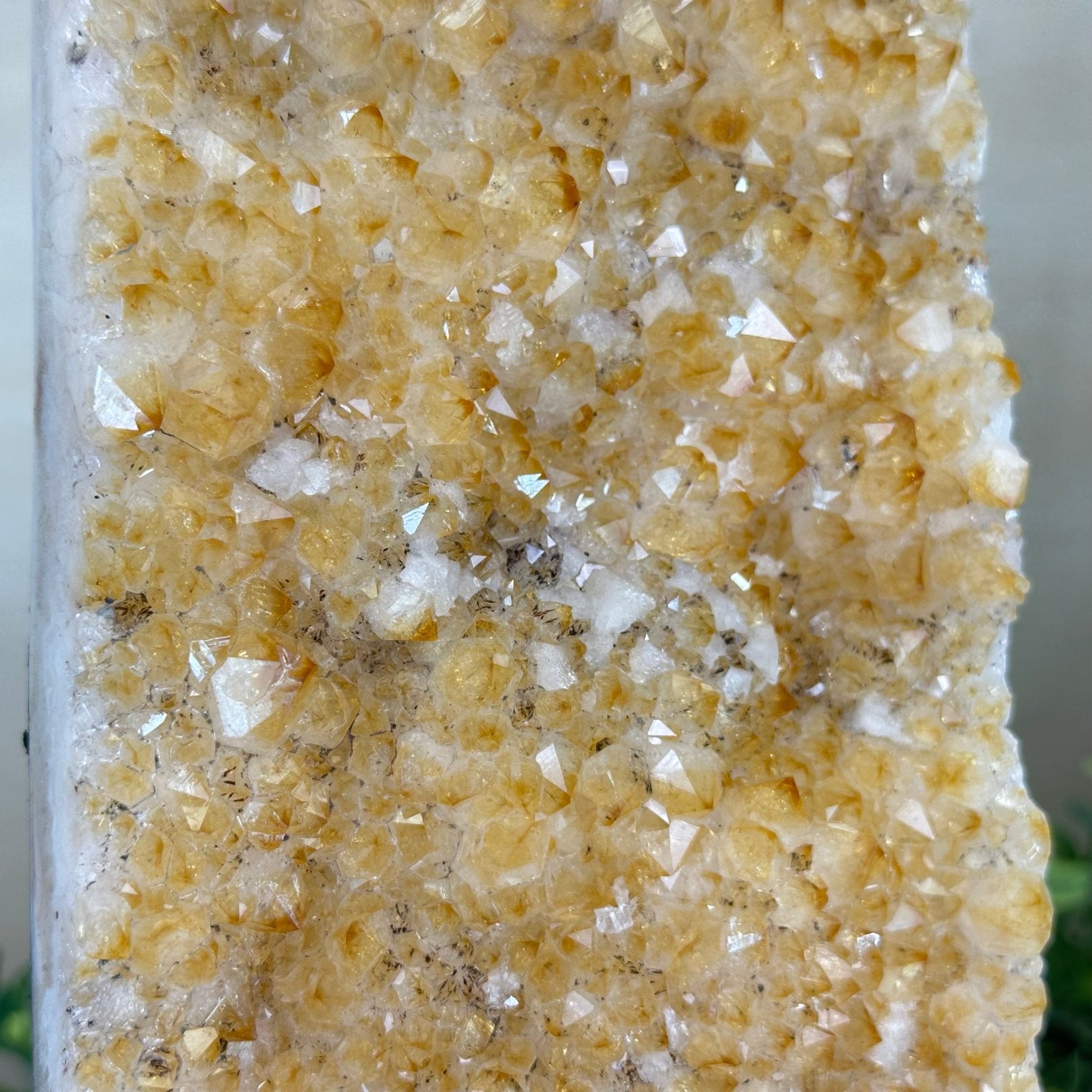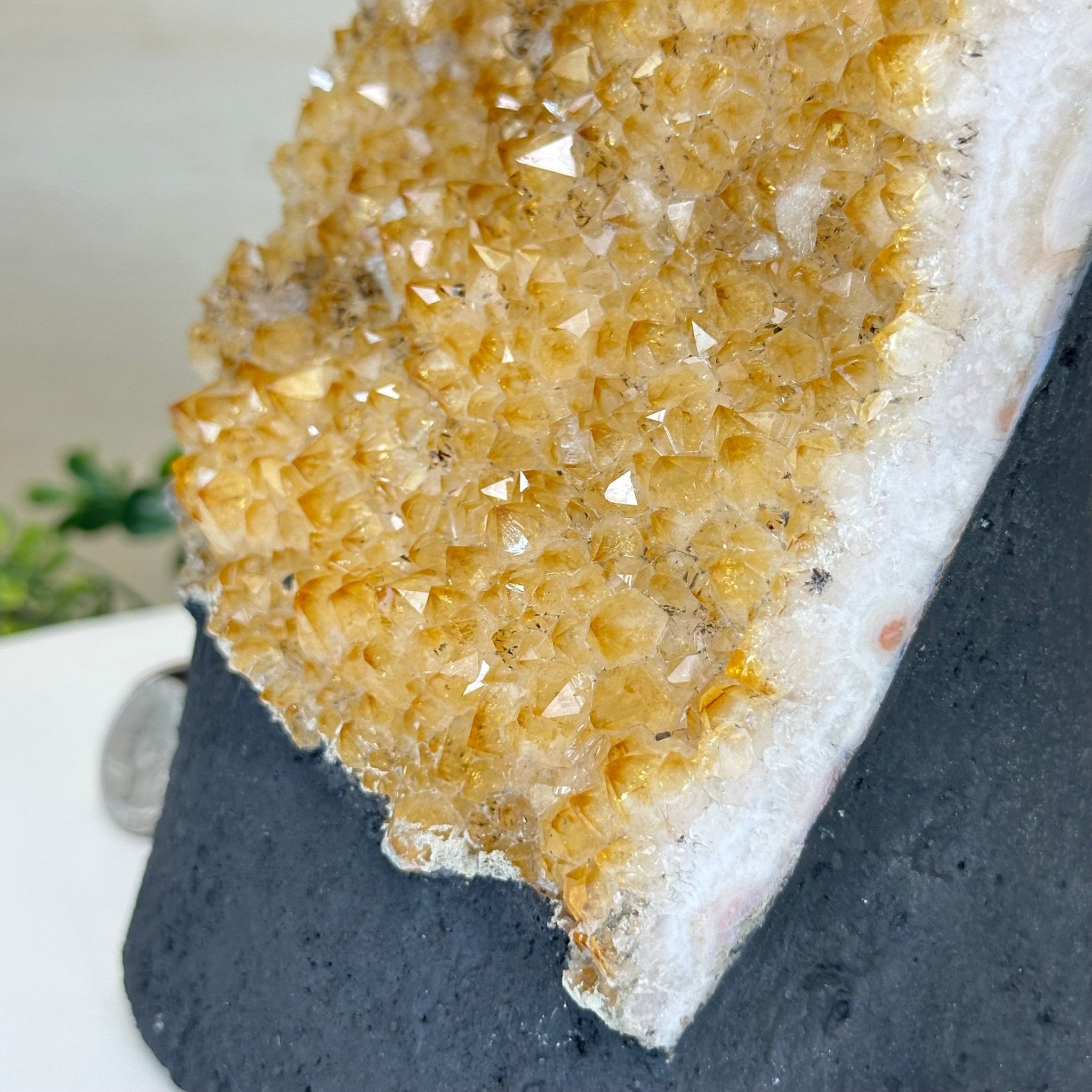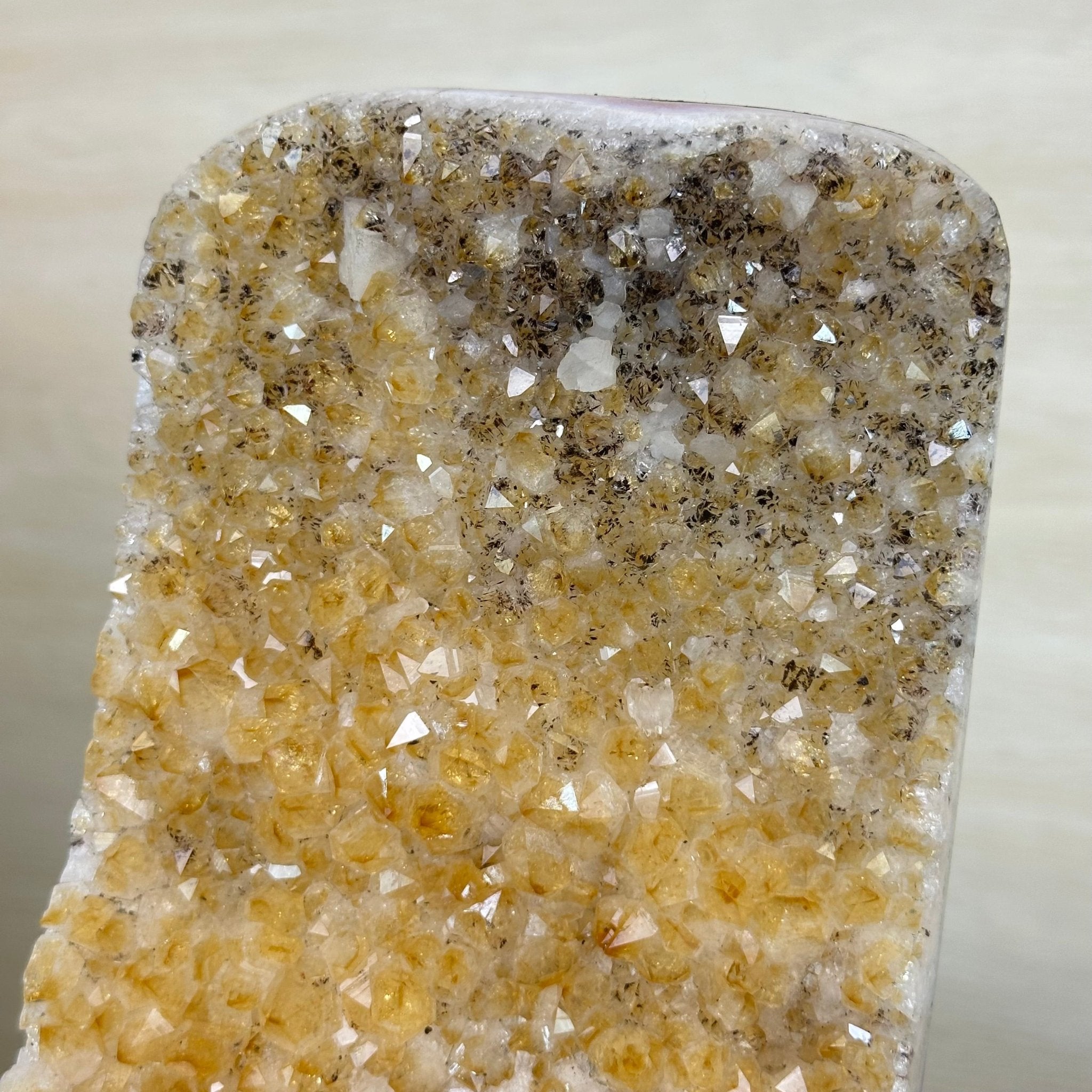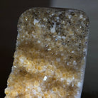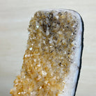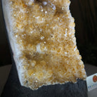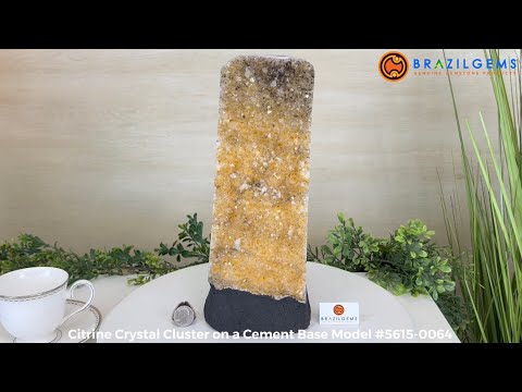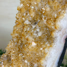 This premium Brazilian Citrine Druze Cluster by Brazil Gems® has a sturdy cement base, showcasing rich amber tones and nicely formed crystal points. A perfect piece to display in a shelf or desk.