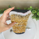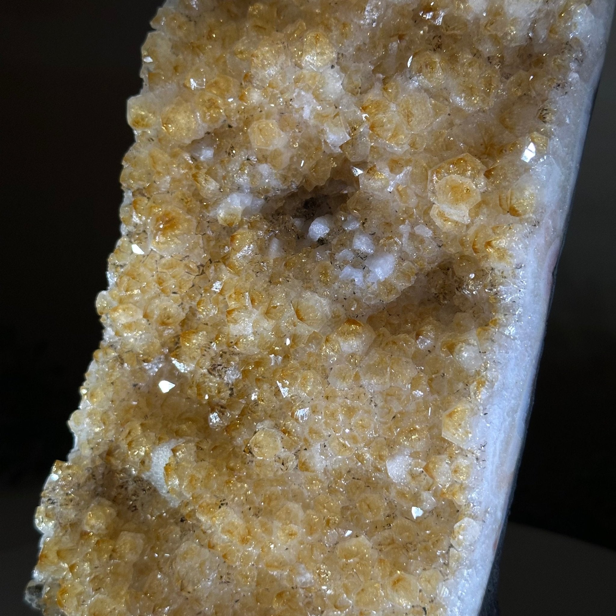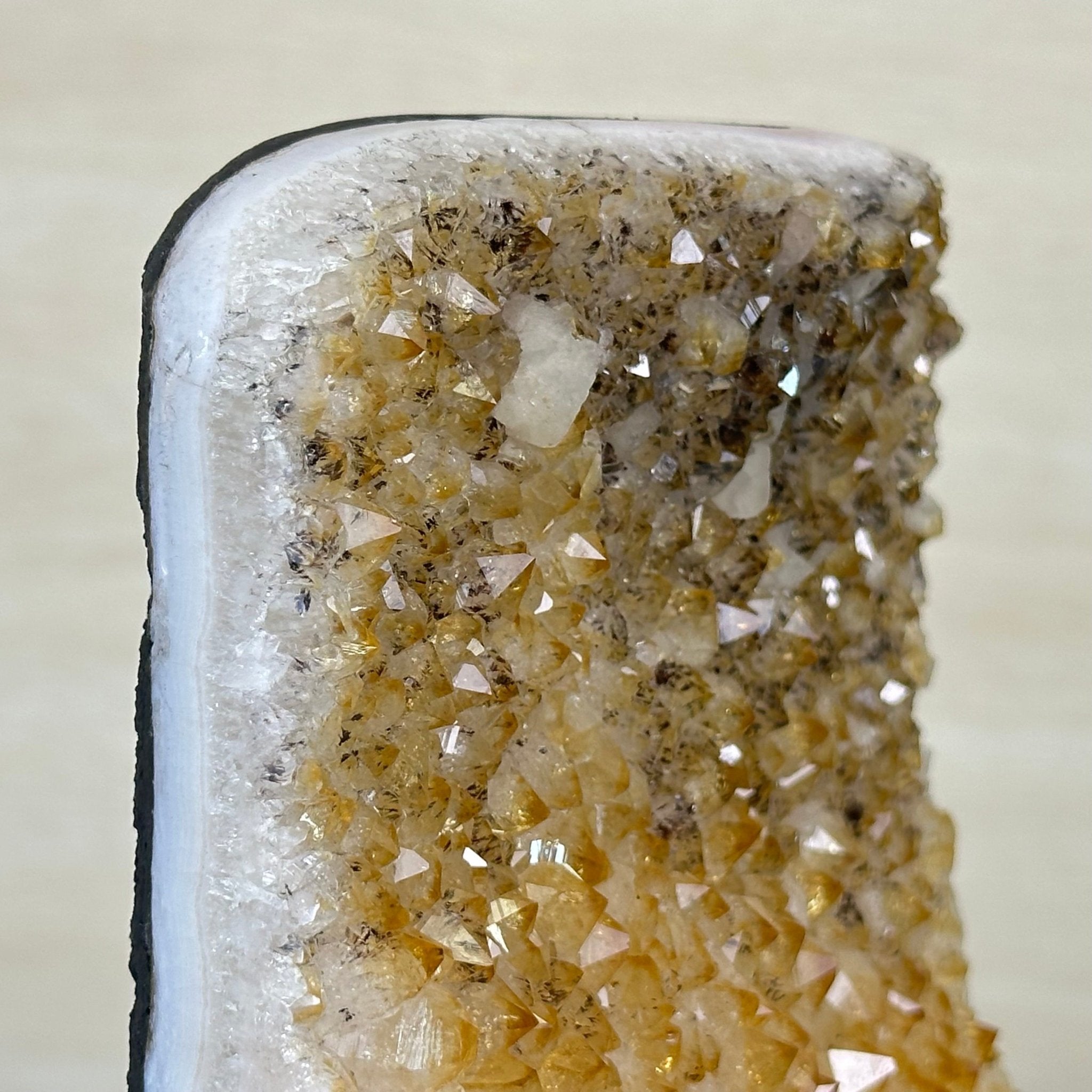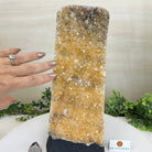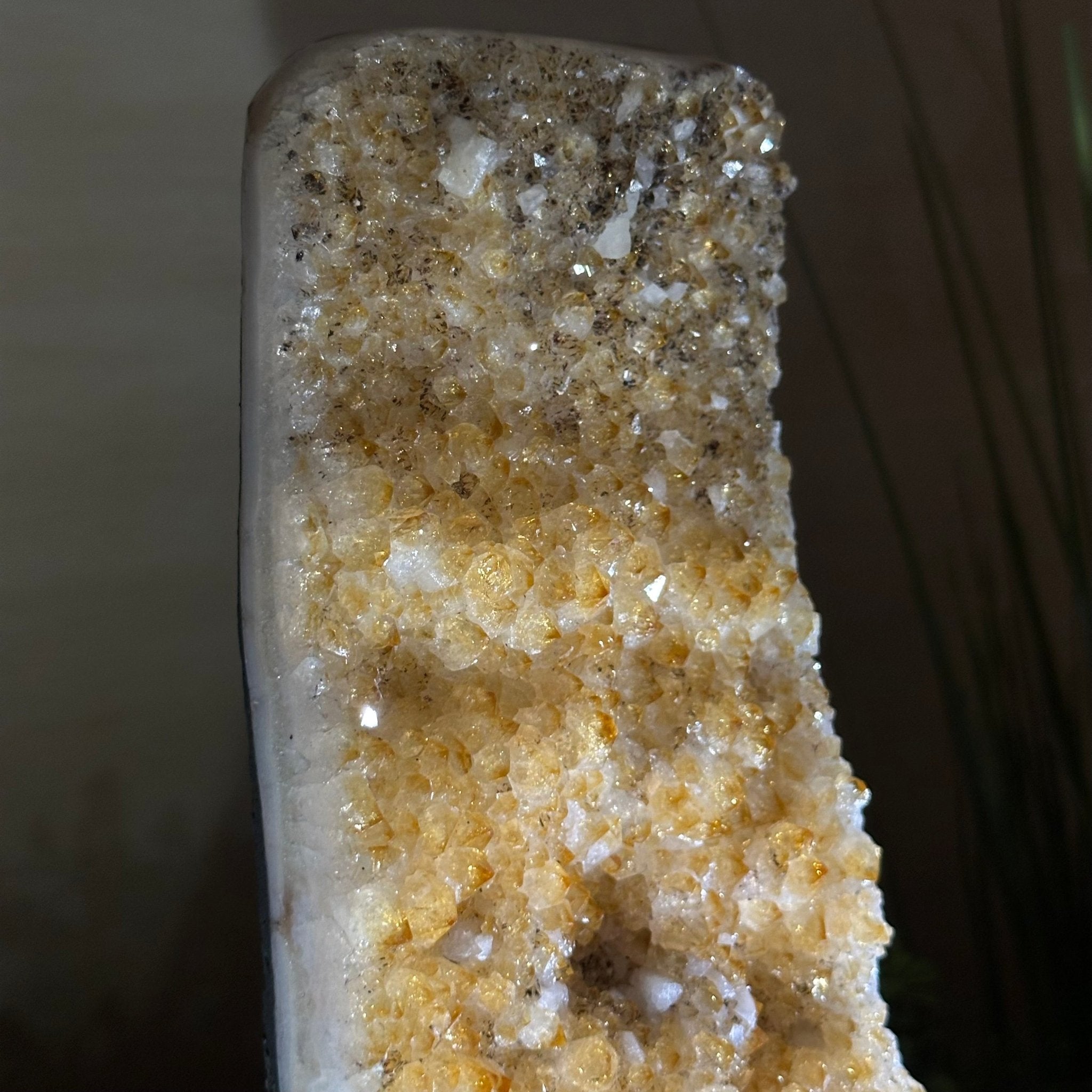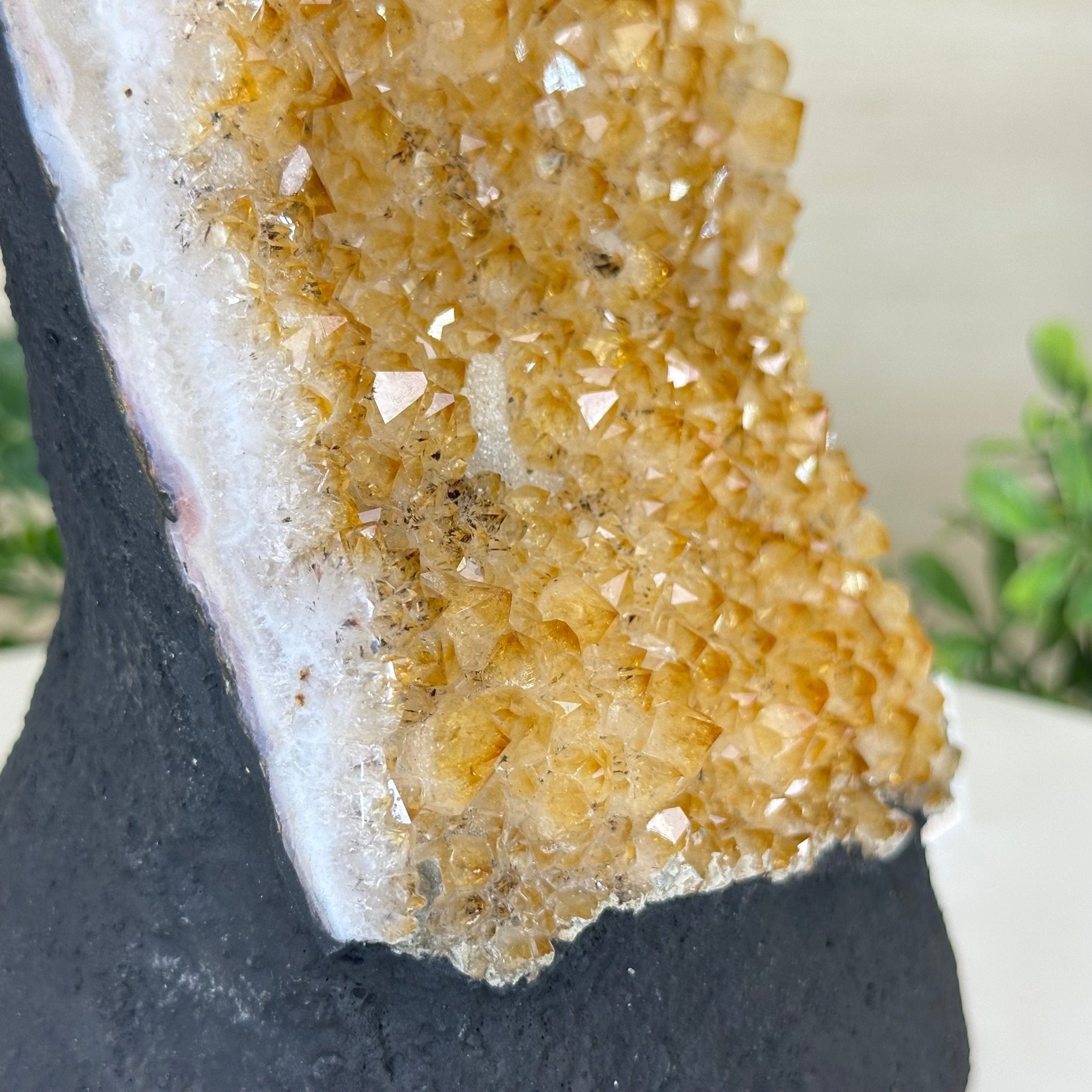 This premium Brazilian Citrine Druze Cluster by Brazil Gems® has a sturdy cement base, showcasing rich amber tones and nicely formed crystal points. A perfect piece to display in a shelf or desk.