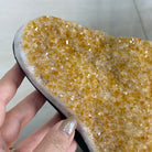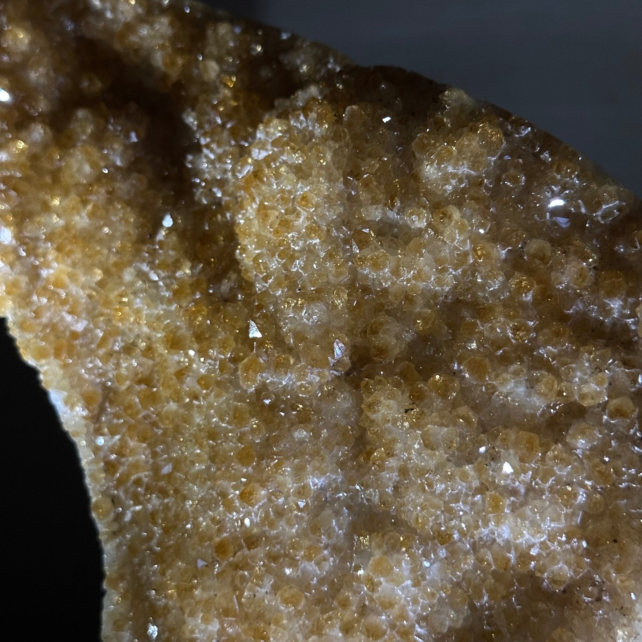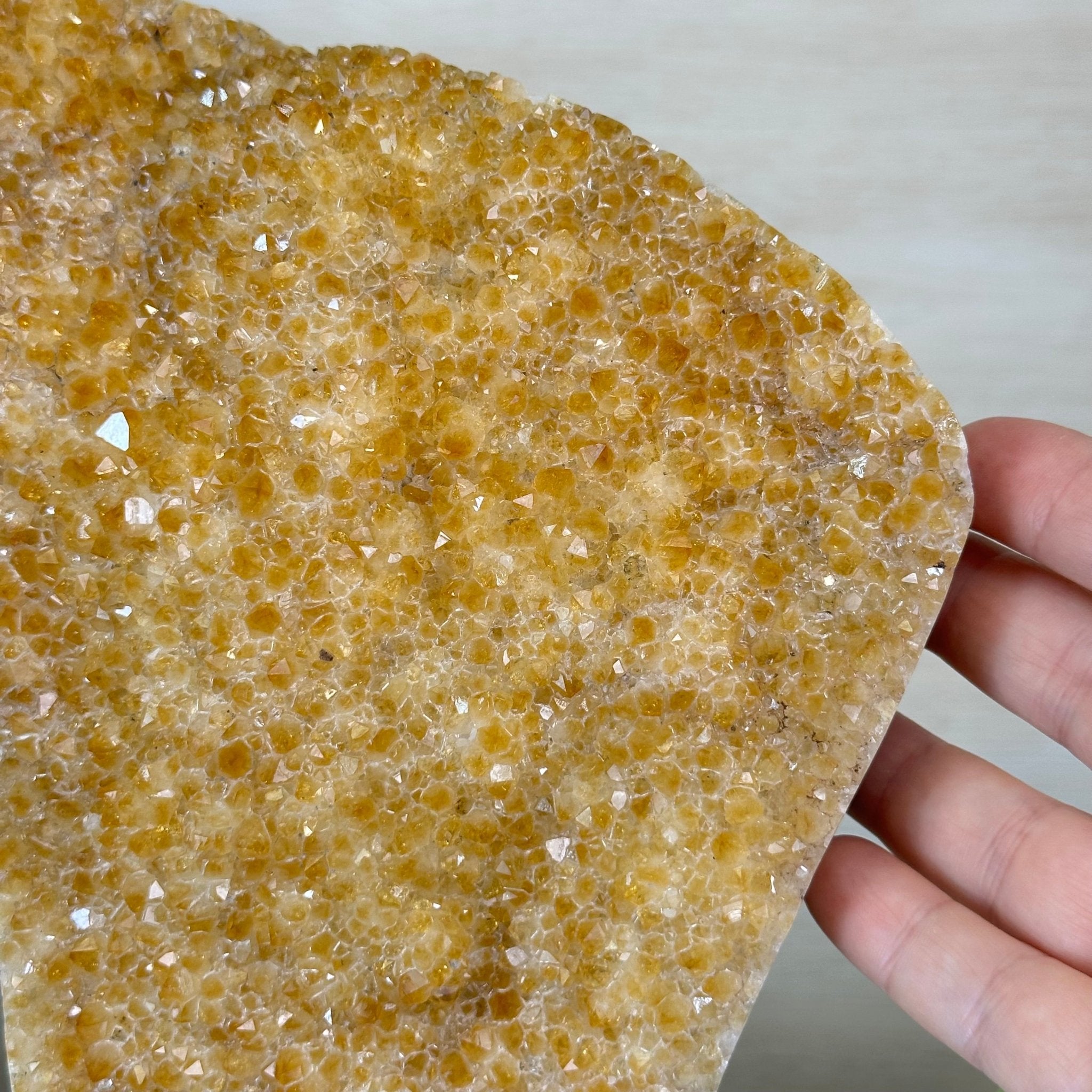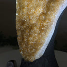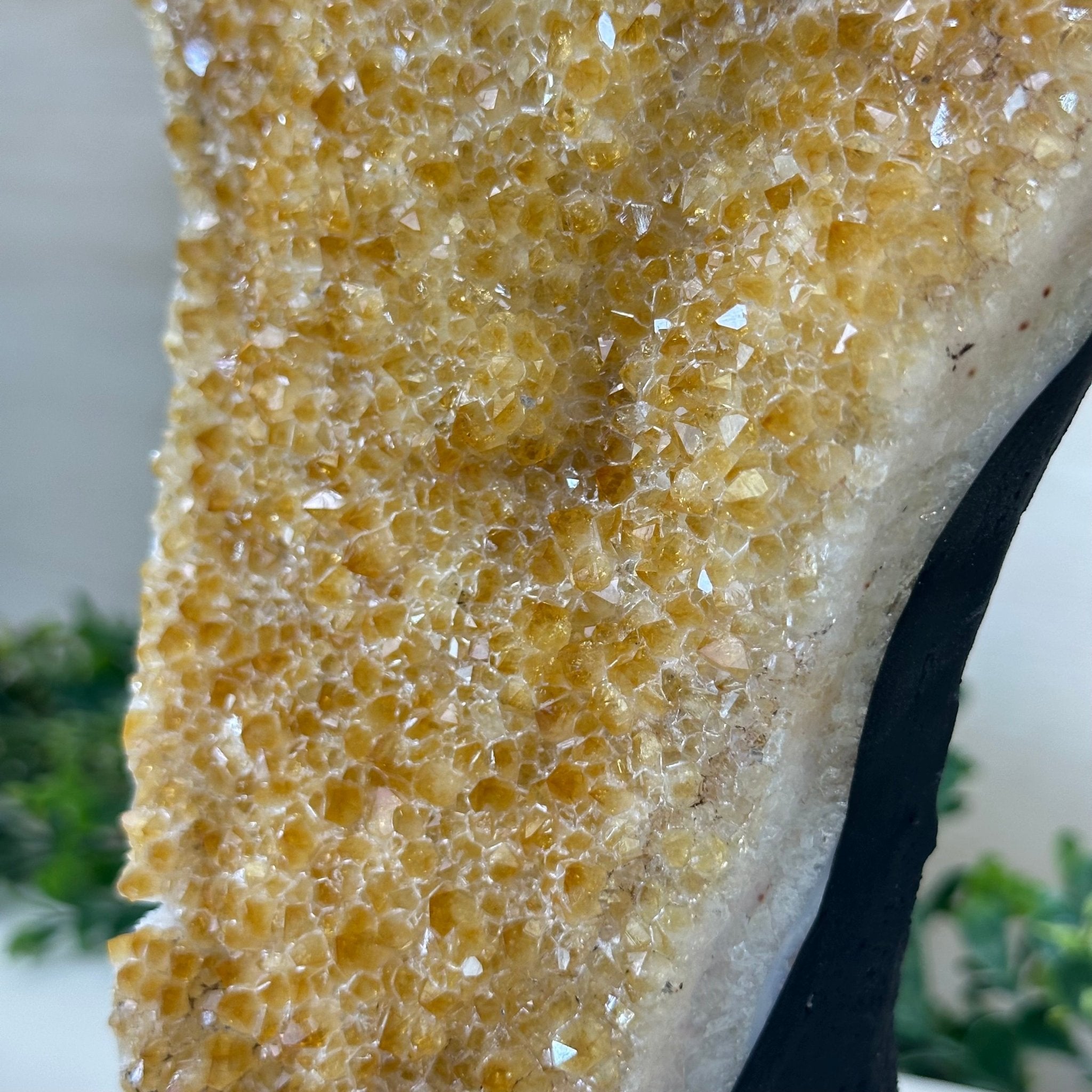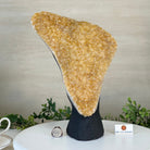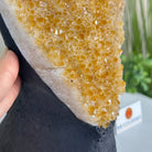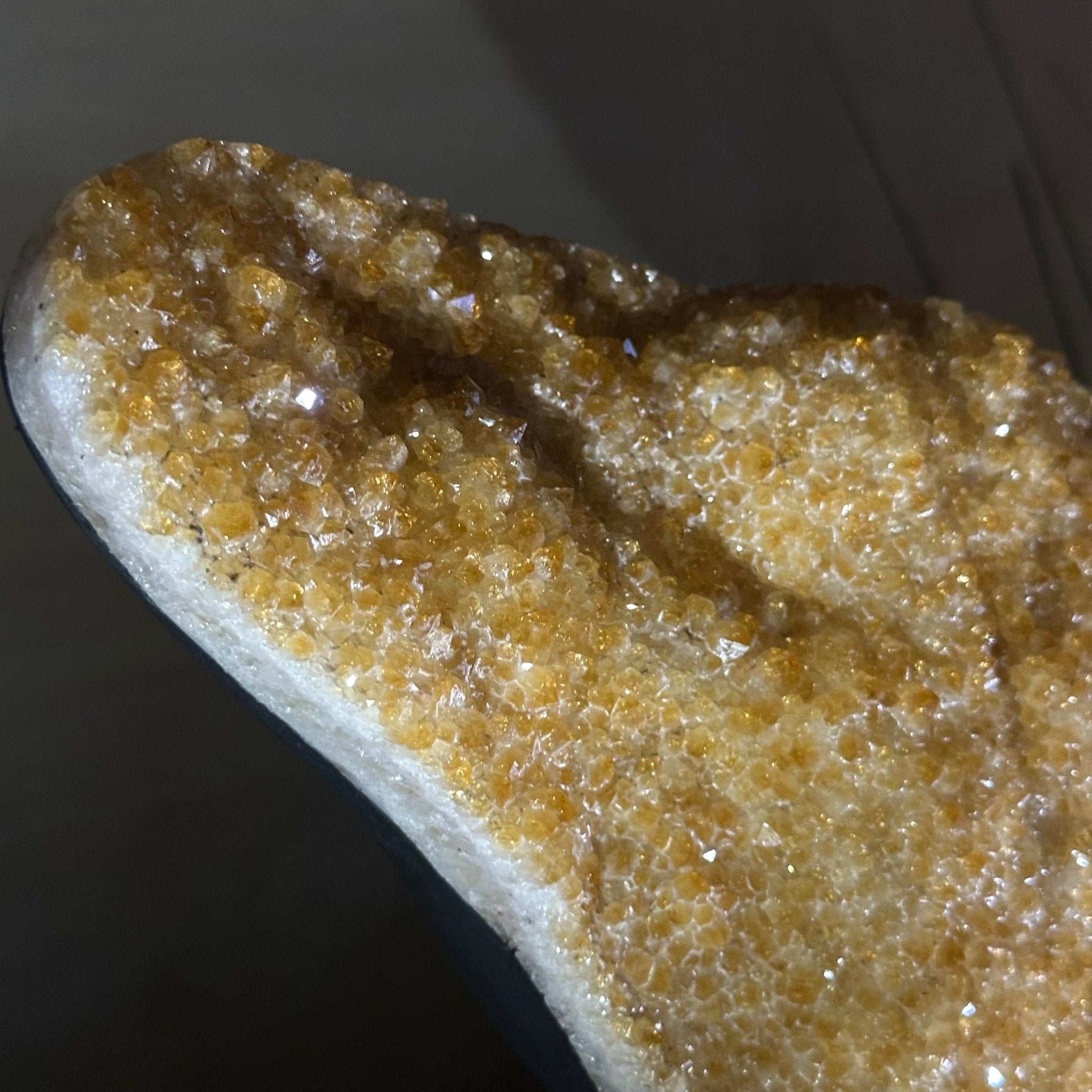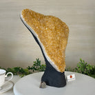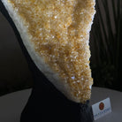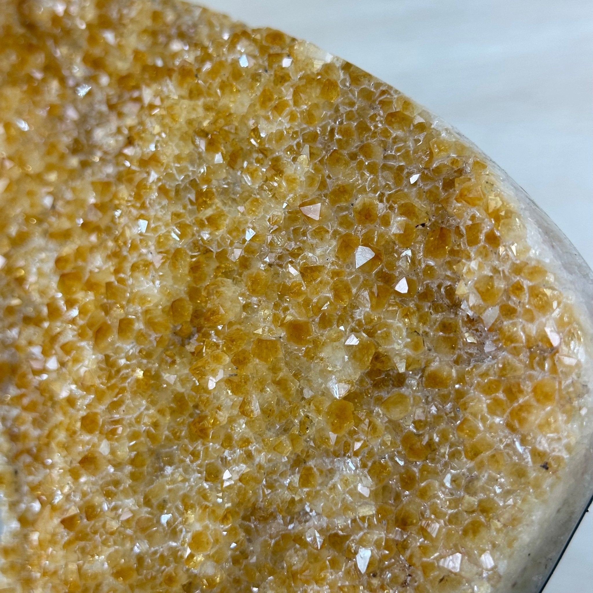 This premium Brazilian Citrine Druze Cluster by Brazil Gems® has a sturdy cement base, showcasing rich amber tones and nicely formed crystal points. A perfect piece to display in a shelf or desk.