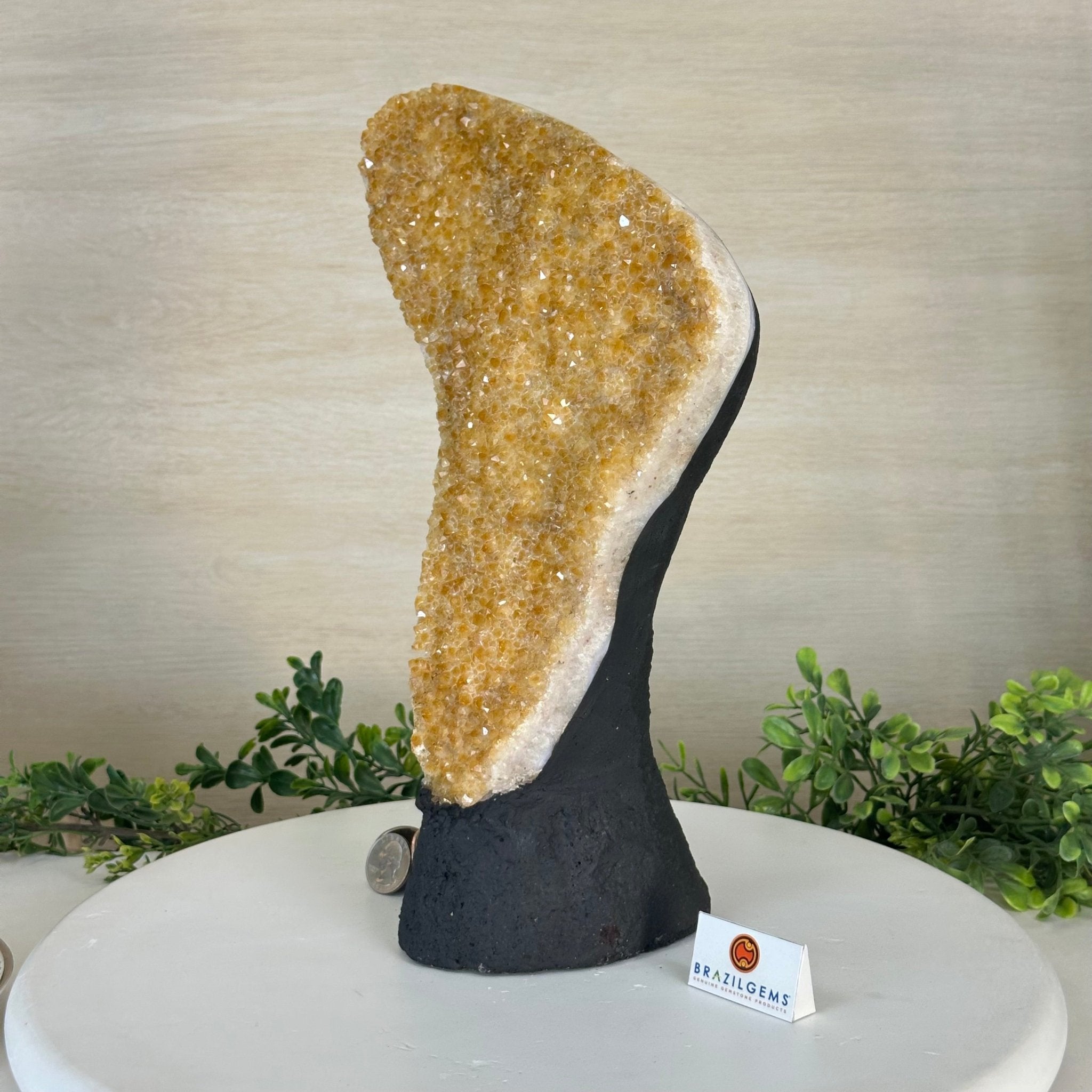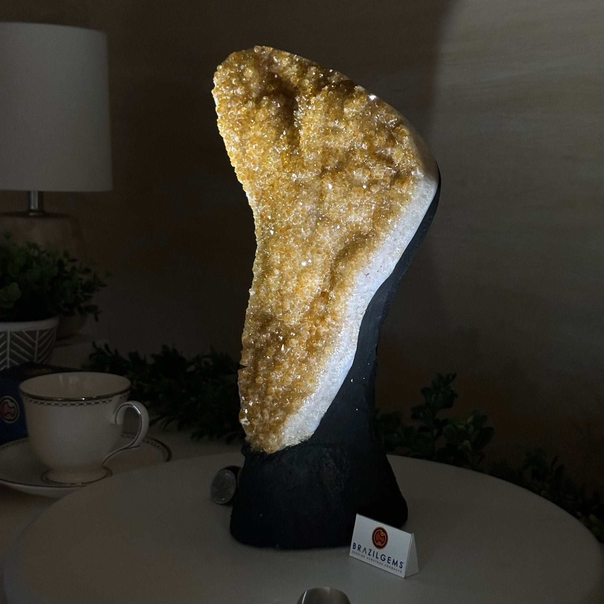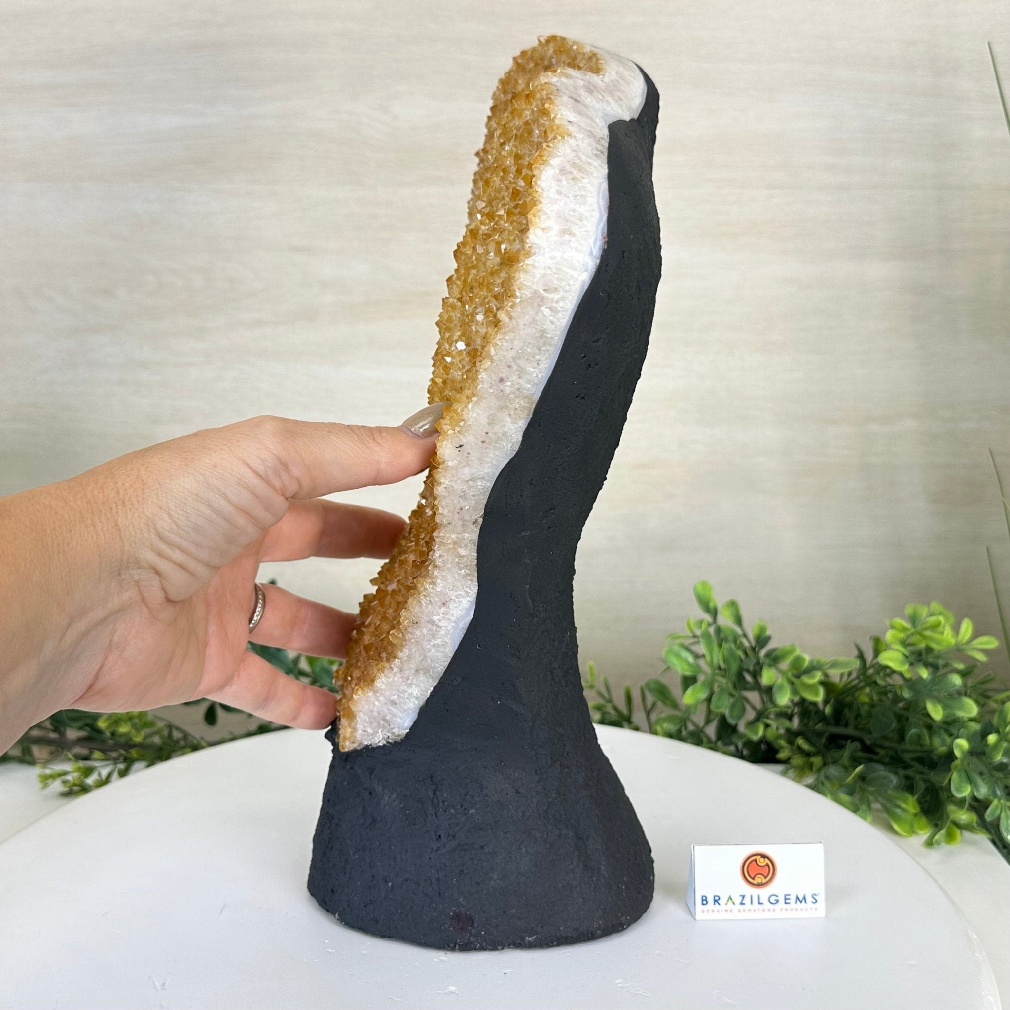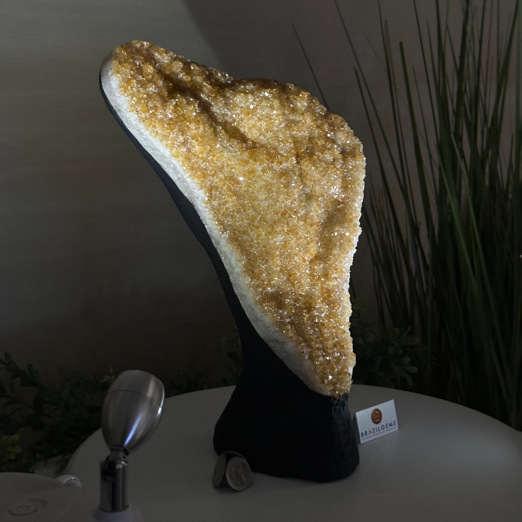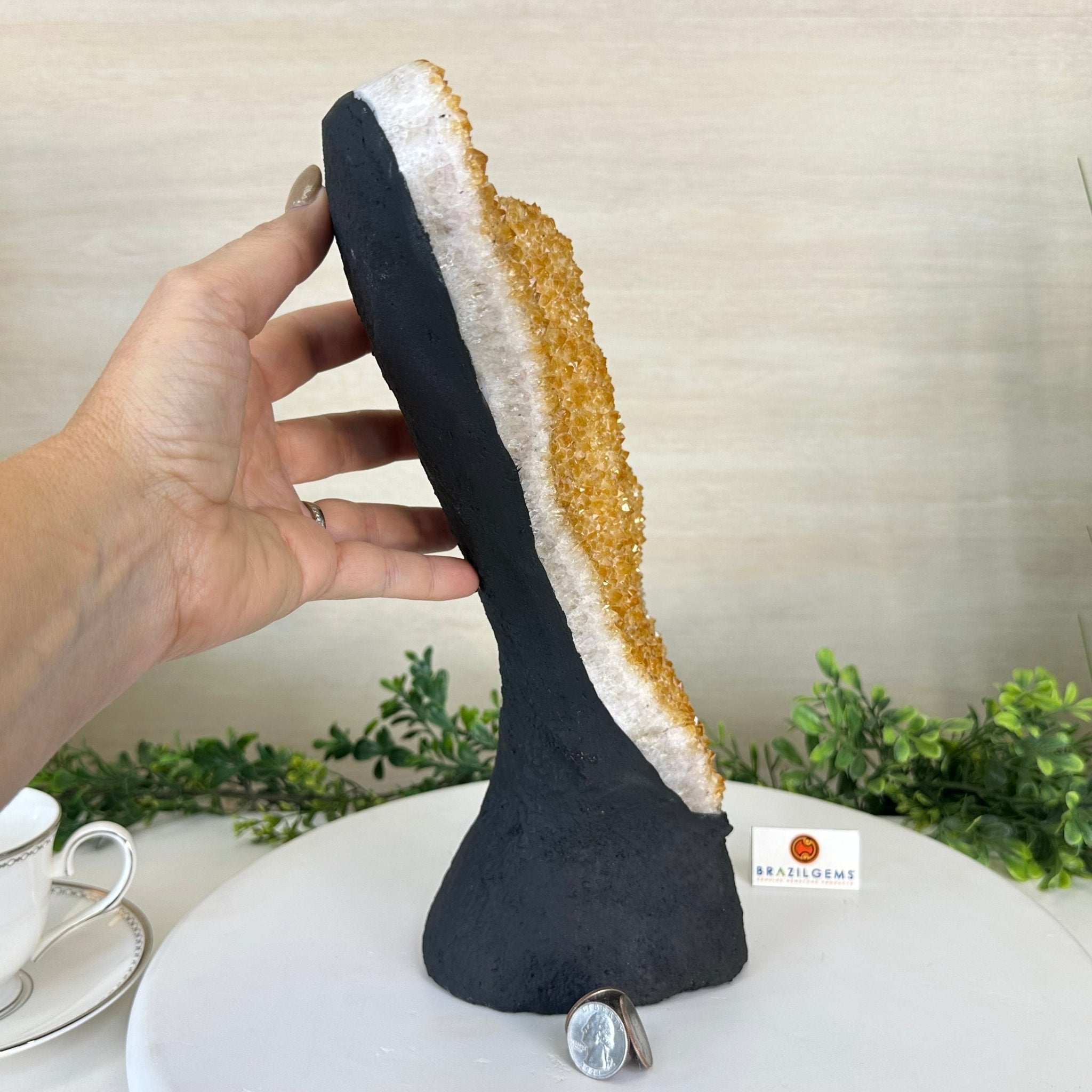 Disclaimer: This is a natural gemstone crystal sold by Brazil Gems® as is and as you see it in its images and video. It is the exact one you will receive. It may contain natural imperfections and/or imperfections, broken edges and repairs from the extraction, polishing and prepping processes. The bottom and sides have been reinforced with cement then painted black. As is the case for the majority of Citrine on the market from Brazil, this Citrine has been heated to give it its beautiful amber color. At Brazil Gems® we make every effort to get measurements as exact as possible but they are done by human hands and eyes and therefore may have minor discrepancies.