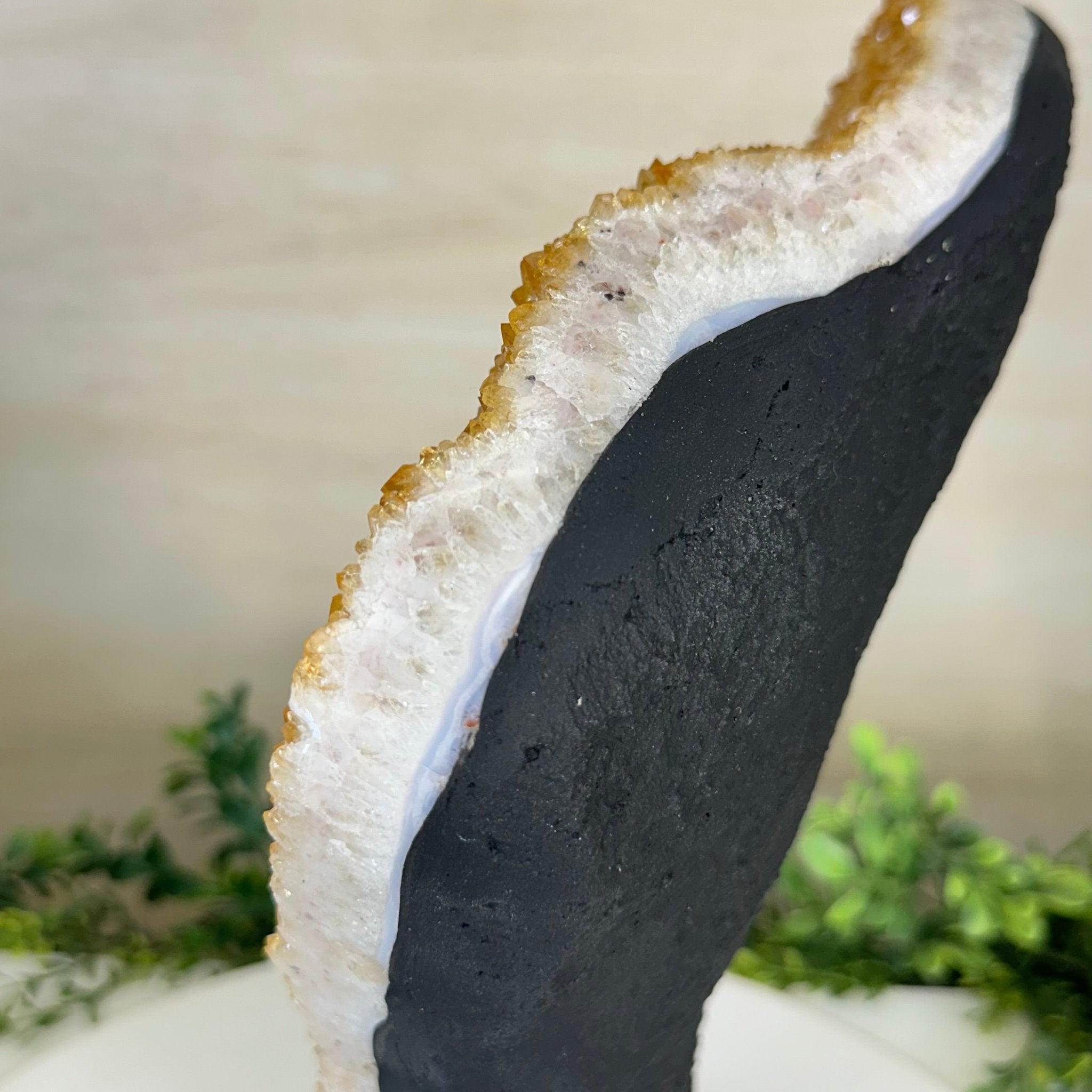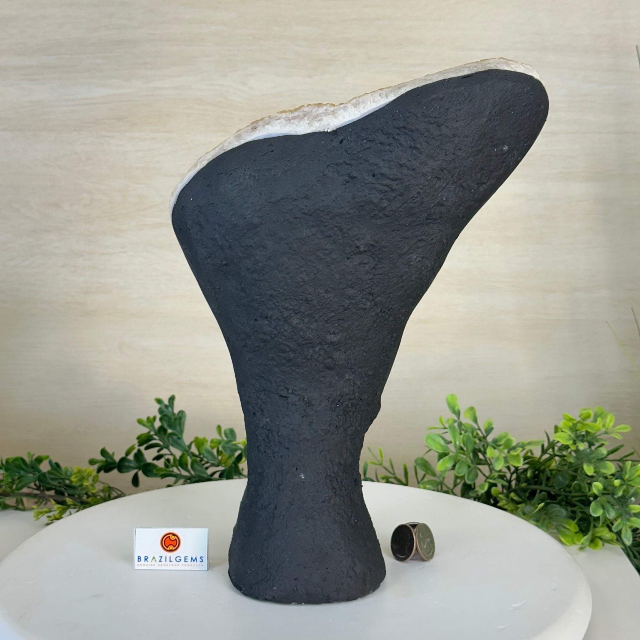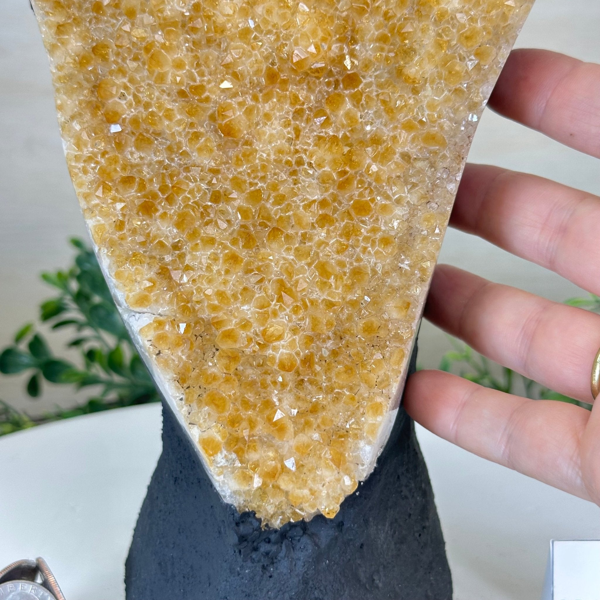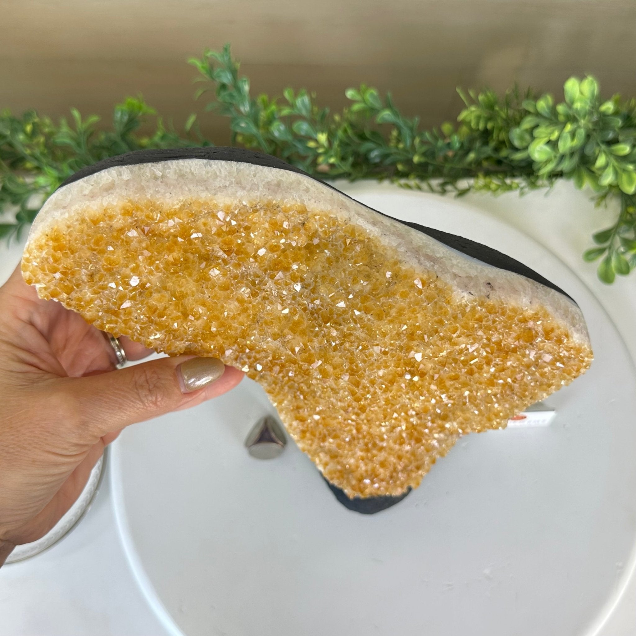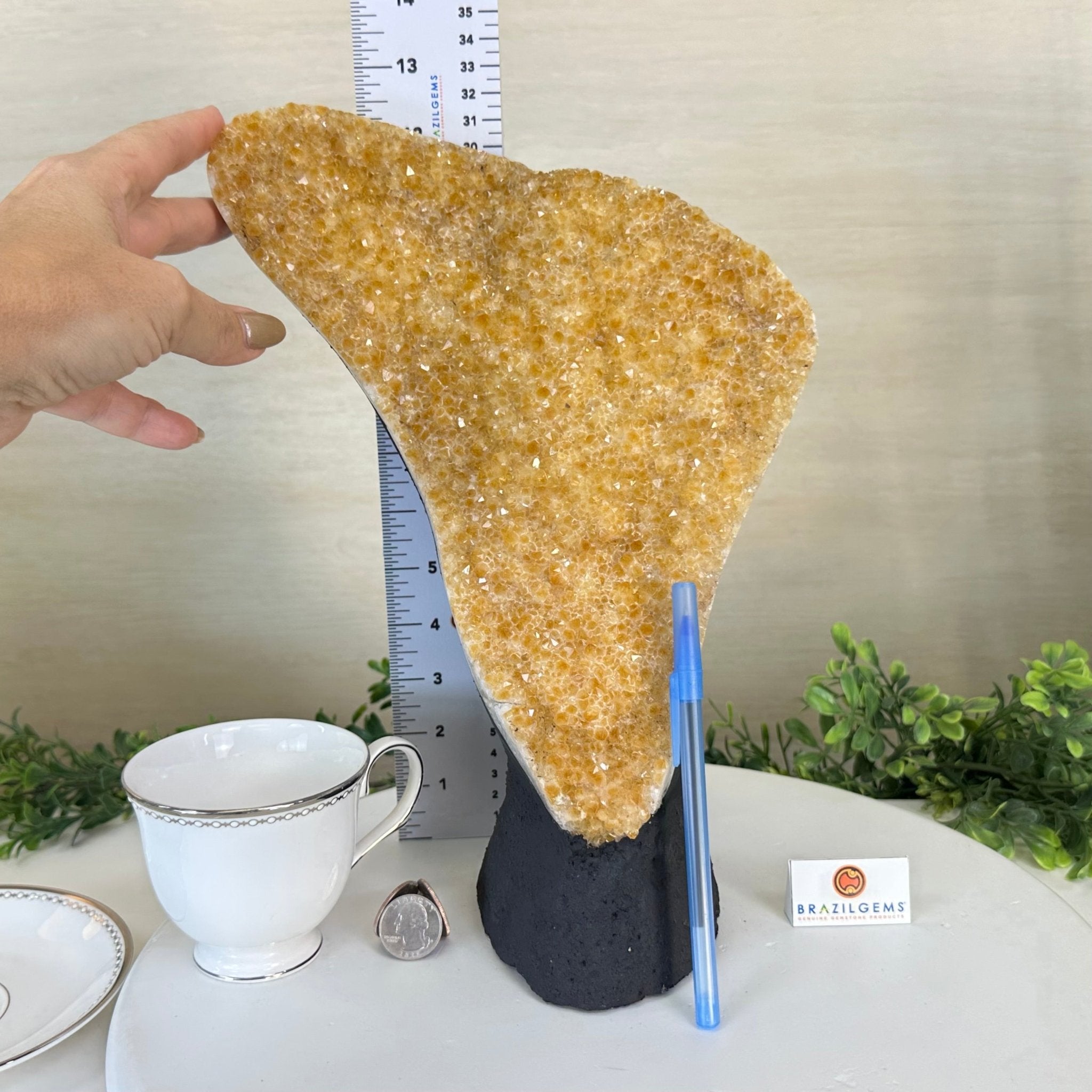 Disclaimer: This is a natural gemstone crystal sold by Brazil Gems® as is and as you see it in its images and video. It is the exact one you will receive. It may contain natural imperfections and/or imperfections, broken edges and repairs from the extraction, polishing and prepping processes. The bottom and sides have been reinforced with cement then painted black. As is the case for the majority of Citrine on the market from Brazil, this Citrine has been heated to give it its beautiful amber color. At Brazil Gems® we make every effort to get measurements as exact as possible but they are done by human hands and eyes and therefore may have minor discrepancies.