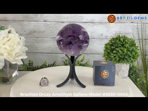 Brazil Gems® brings you this Extra Plus Brazilian Druzy Amethyst Sphere on a black metal stand. Beautifully crafted from a larger geode, this polished piece will become a conversation starter every single time.