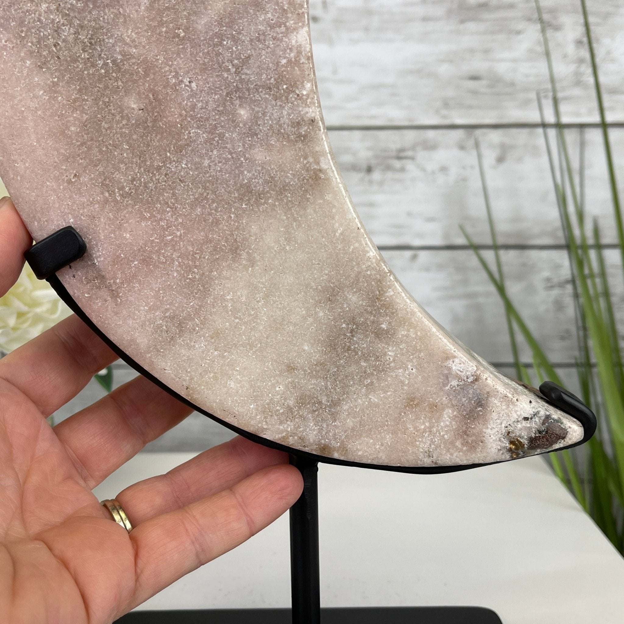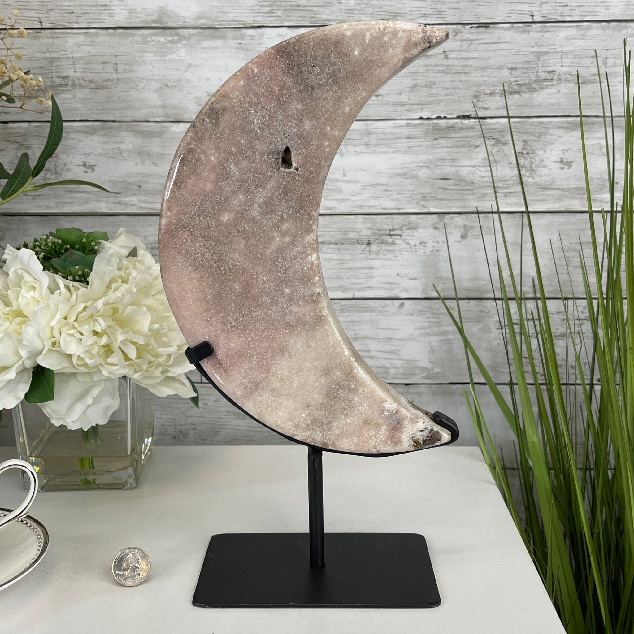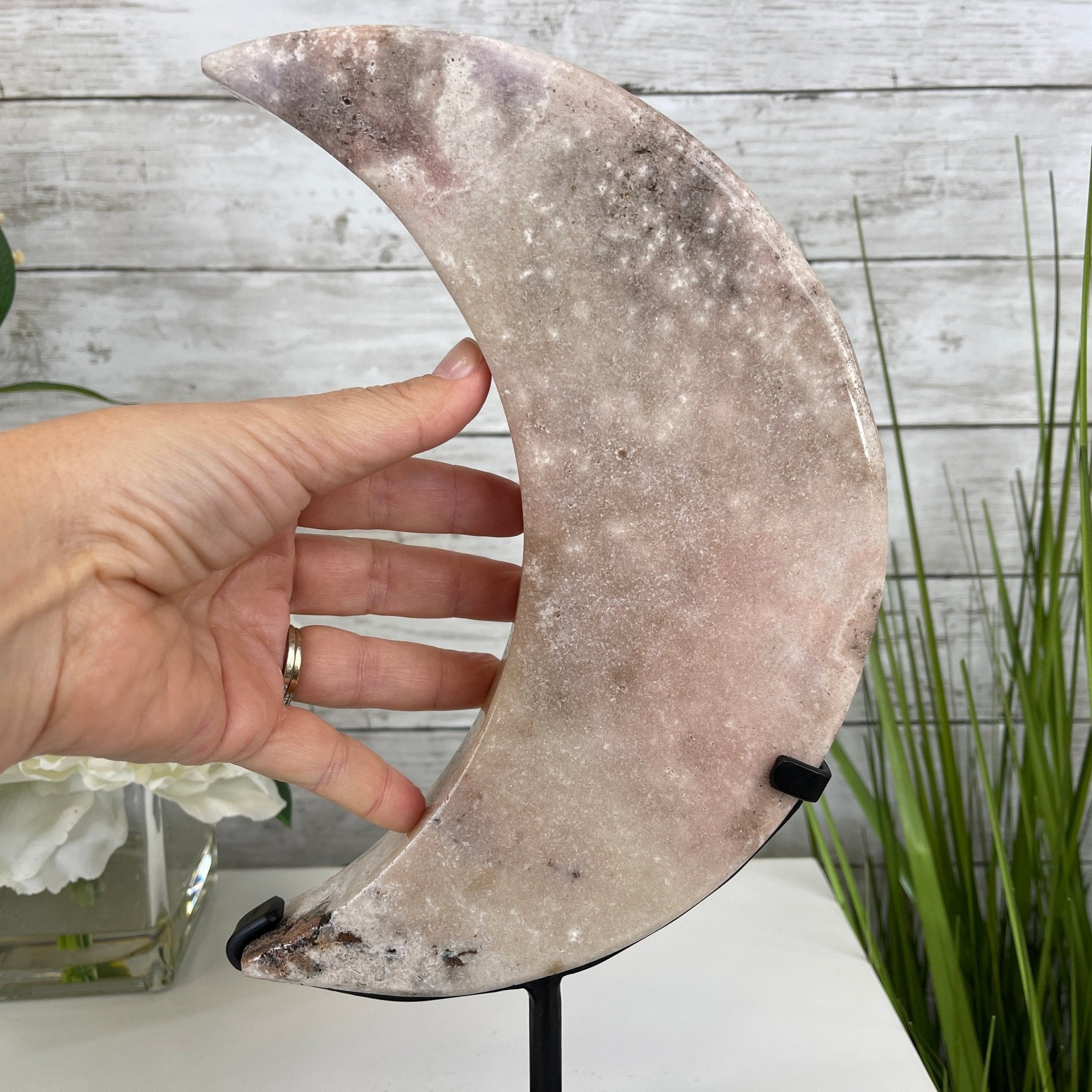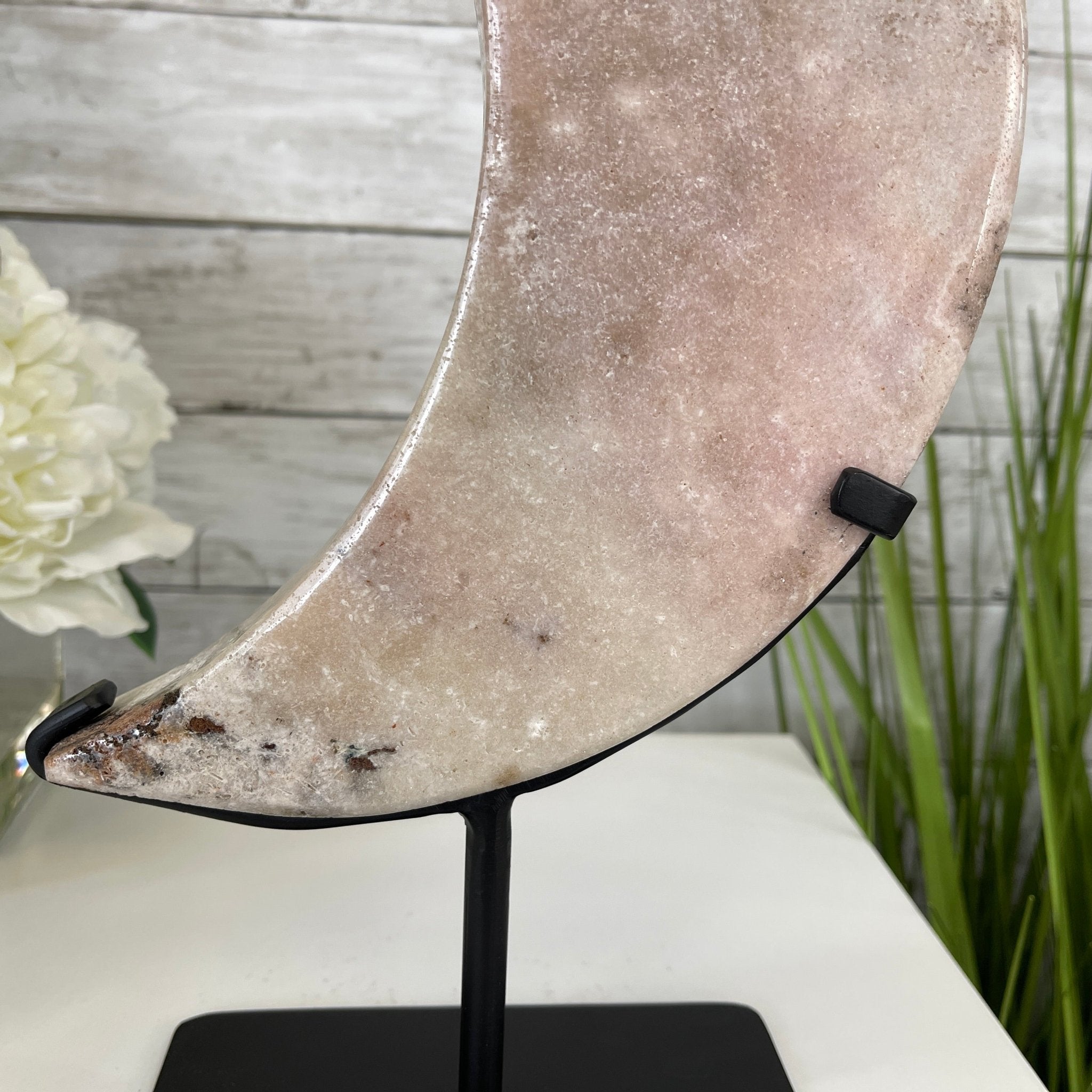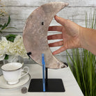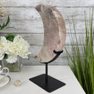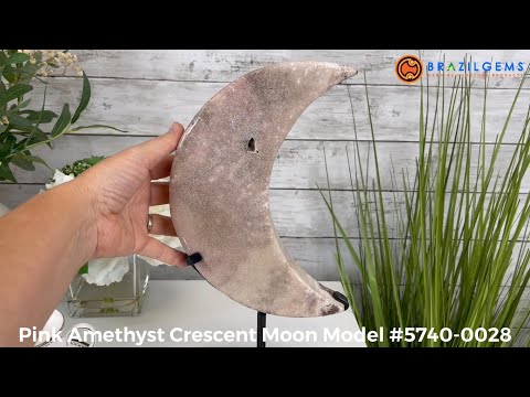 This is a Natural Polished Brazilian Pink Amethyst Crescent Moon on a metal stand. With its polished edges and natural crystals shining through you'll enjoy this piece for years to come.