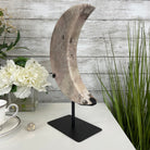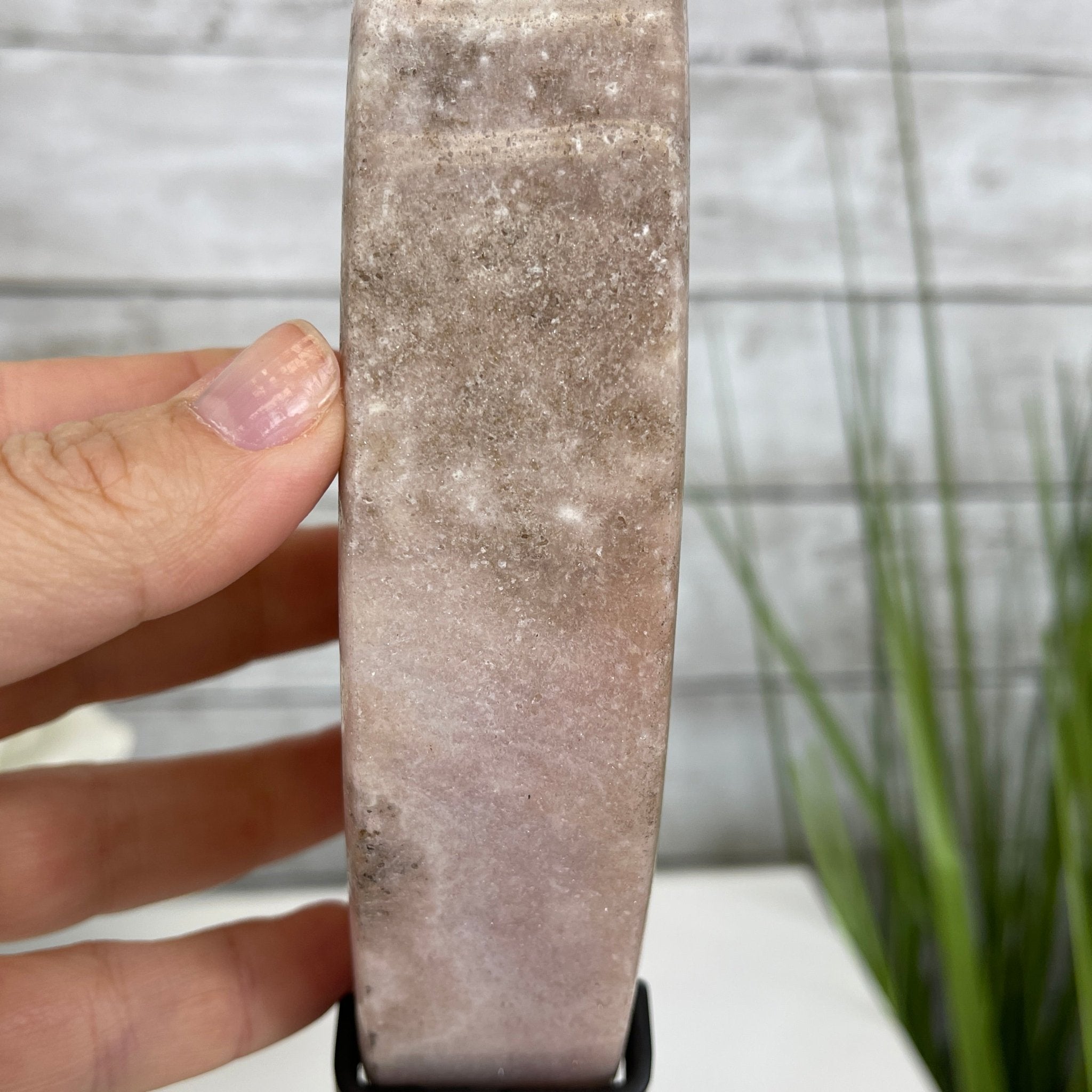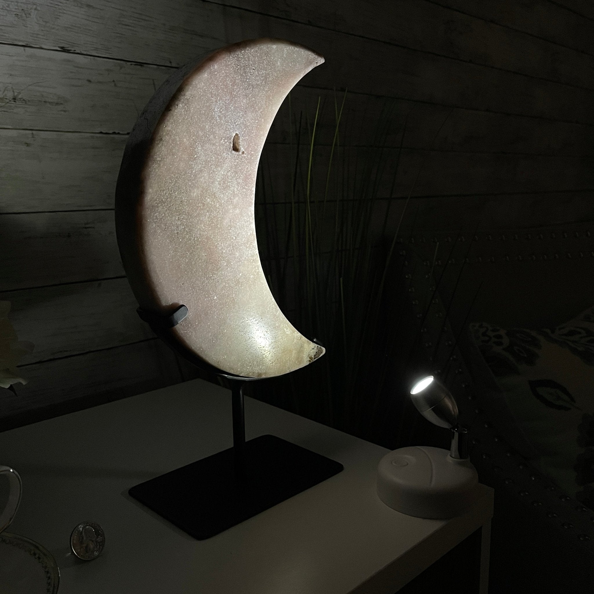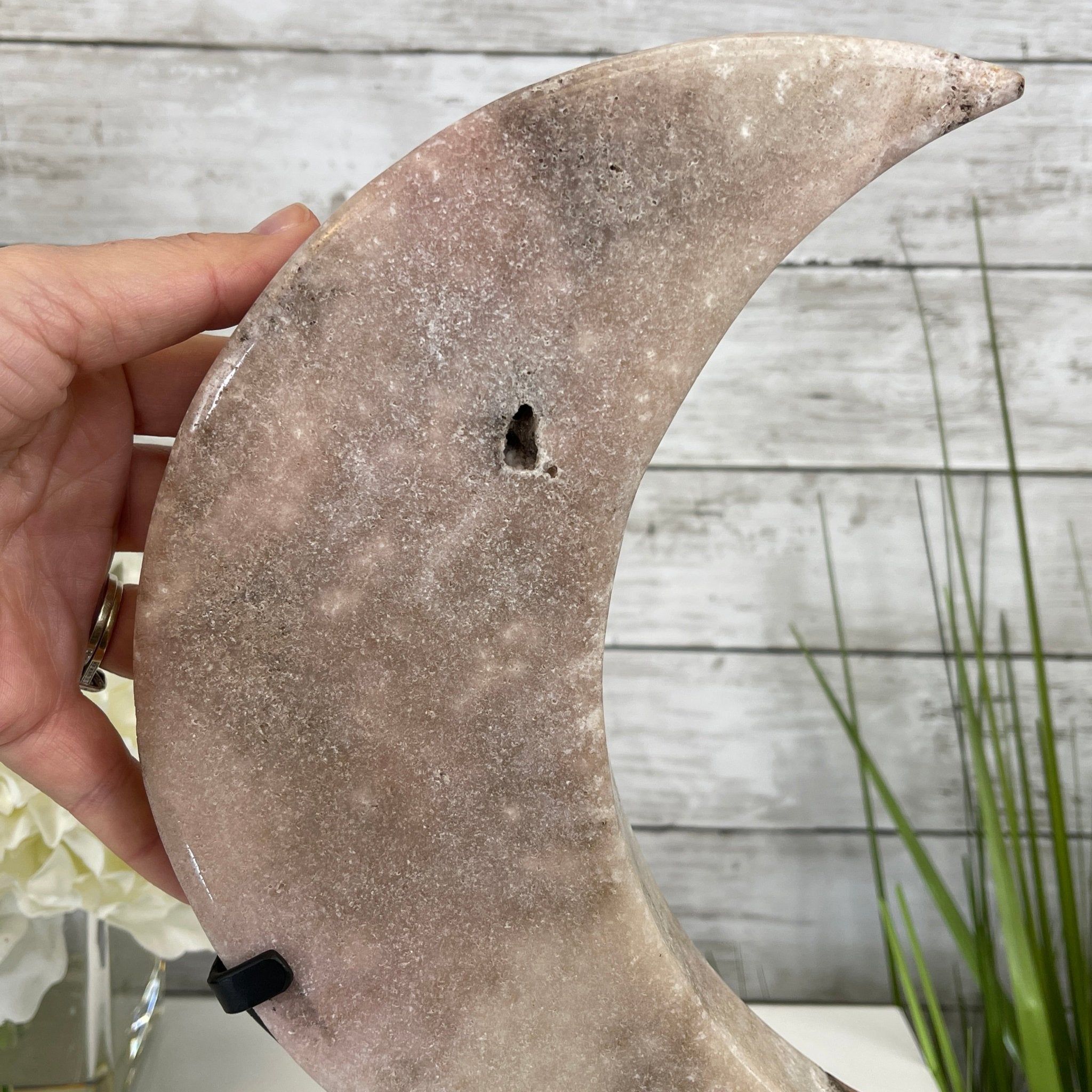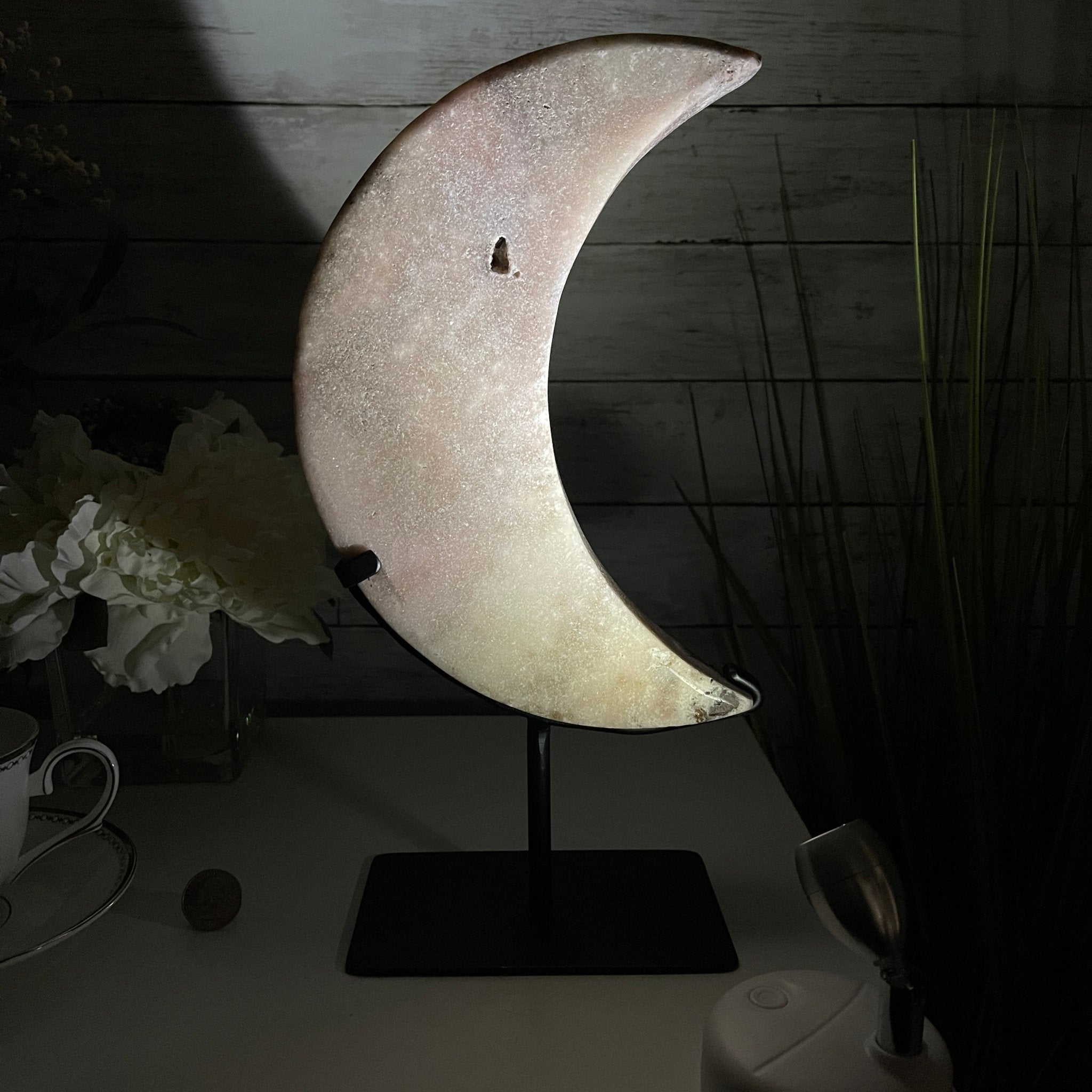 This is a Natural Polished Brazilian Pink Amethyst Crescent Moon on a metal stand. With its polished edges and natural crystals shining through you'll enjoy this piece for years to come.