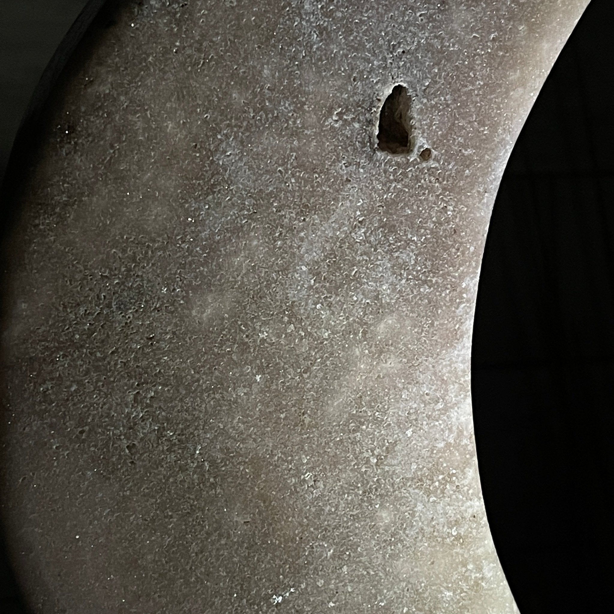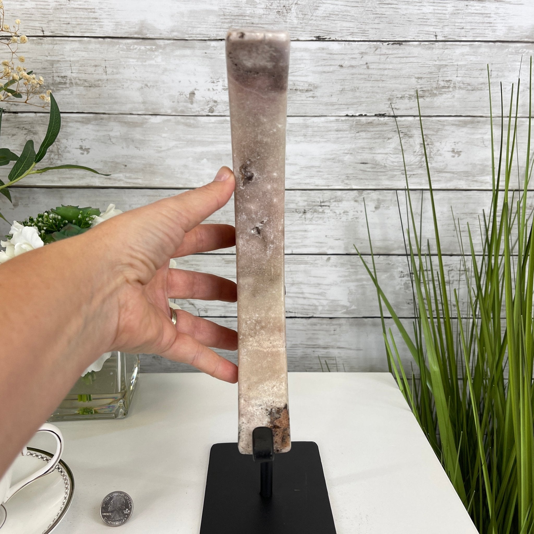 Disclaimer: This is a natural gemstone crystal sold as is and as you see it in its images and video. It is the exact one you will receive. It may contain natural imperfections and/or imperfections, scratches, broken edges and repairs from the extraction, polishing, prepping and mounting processes. The metal base has been hand welded to fit this specific piece, then painted black. Light not included.