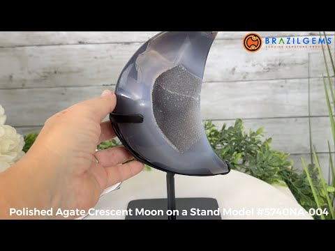 This is a Natural Polished Brazilian Agate Crescent Moon Druzy on a metal stand. With its polished edges and natural crystals shining through you'll enjoy this piece for years to come.