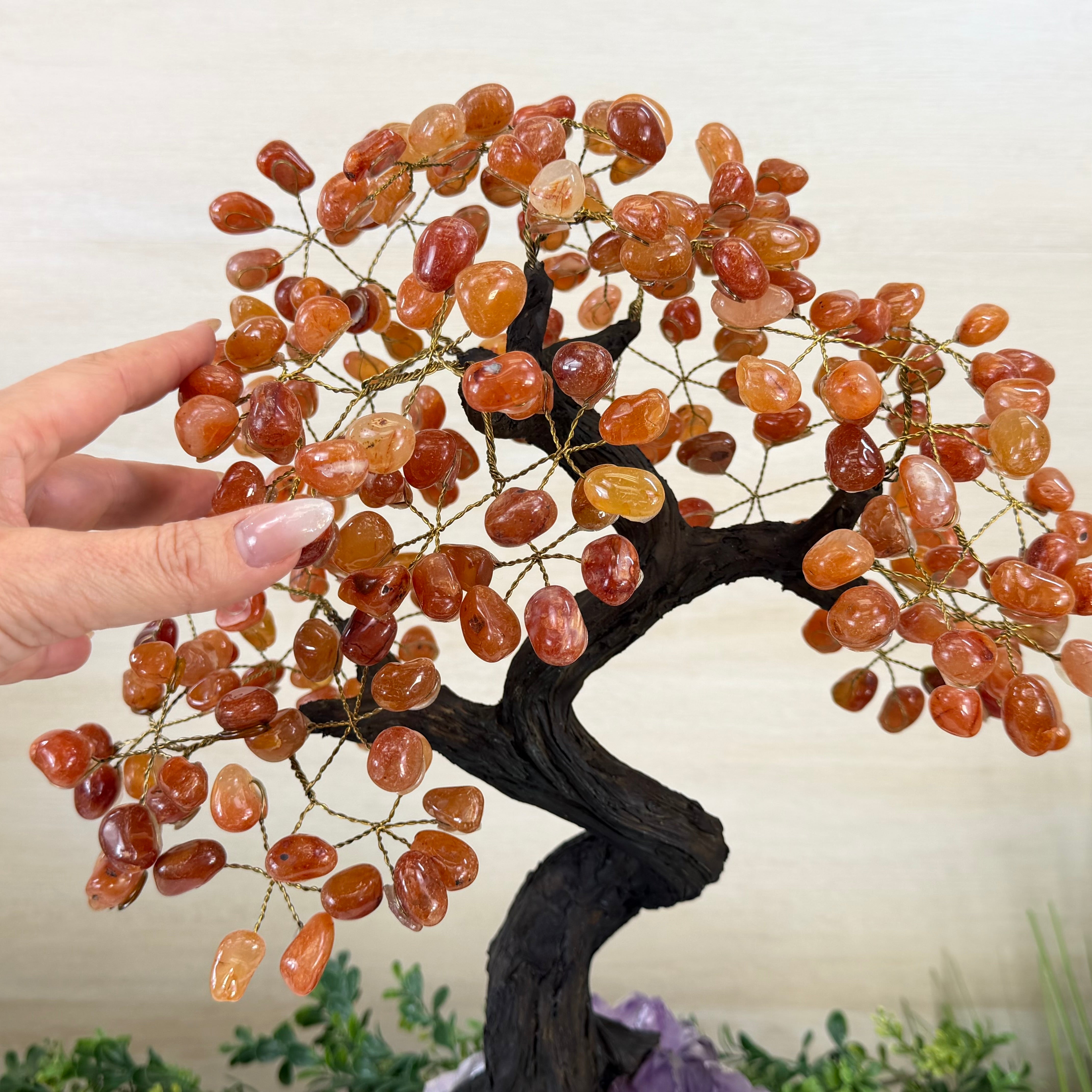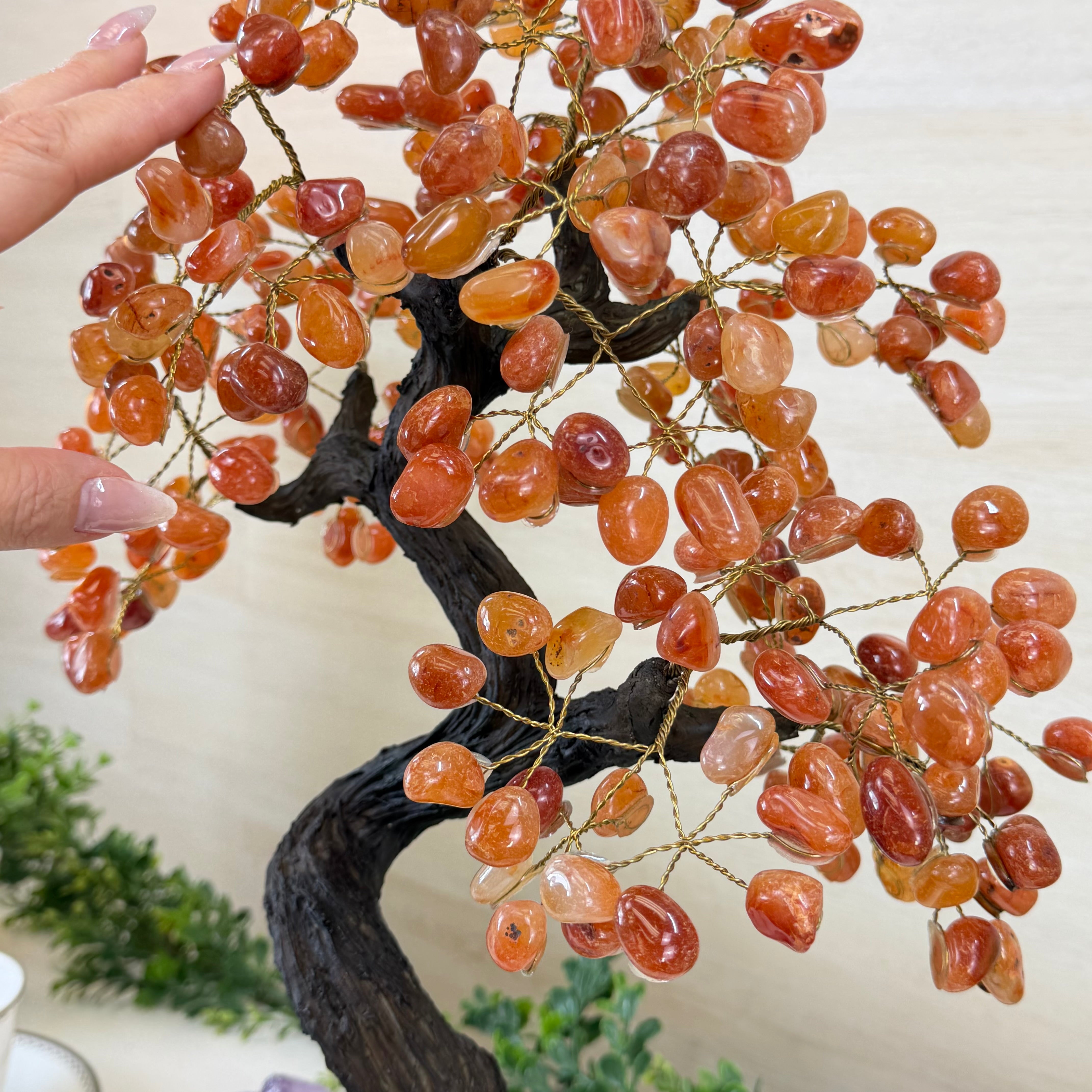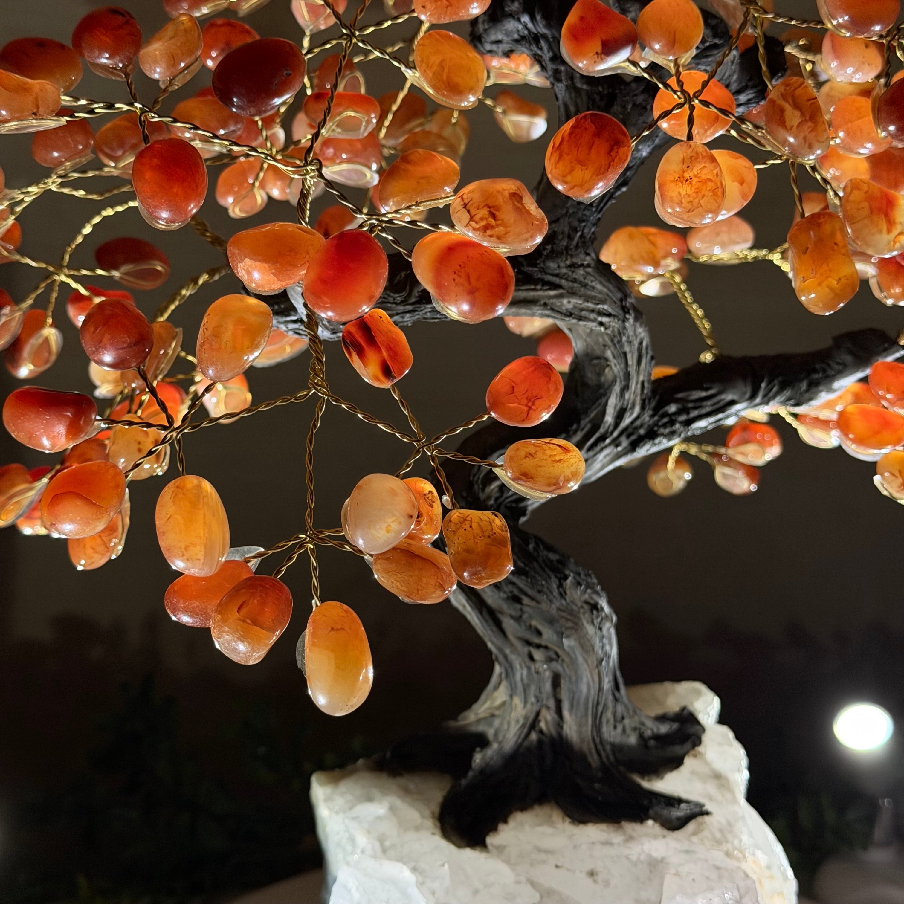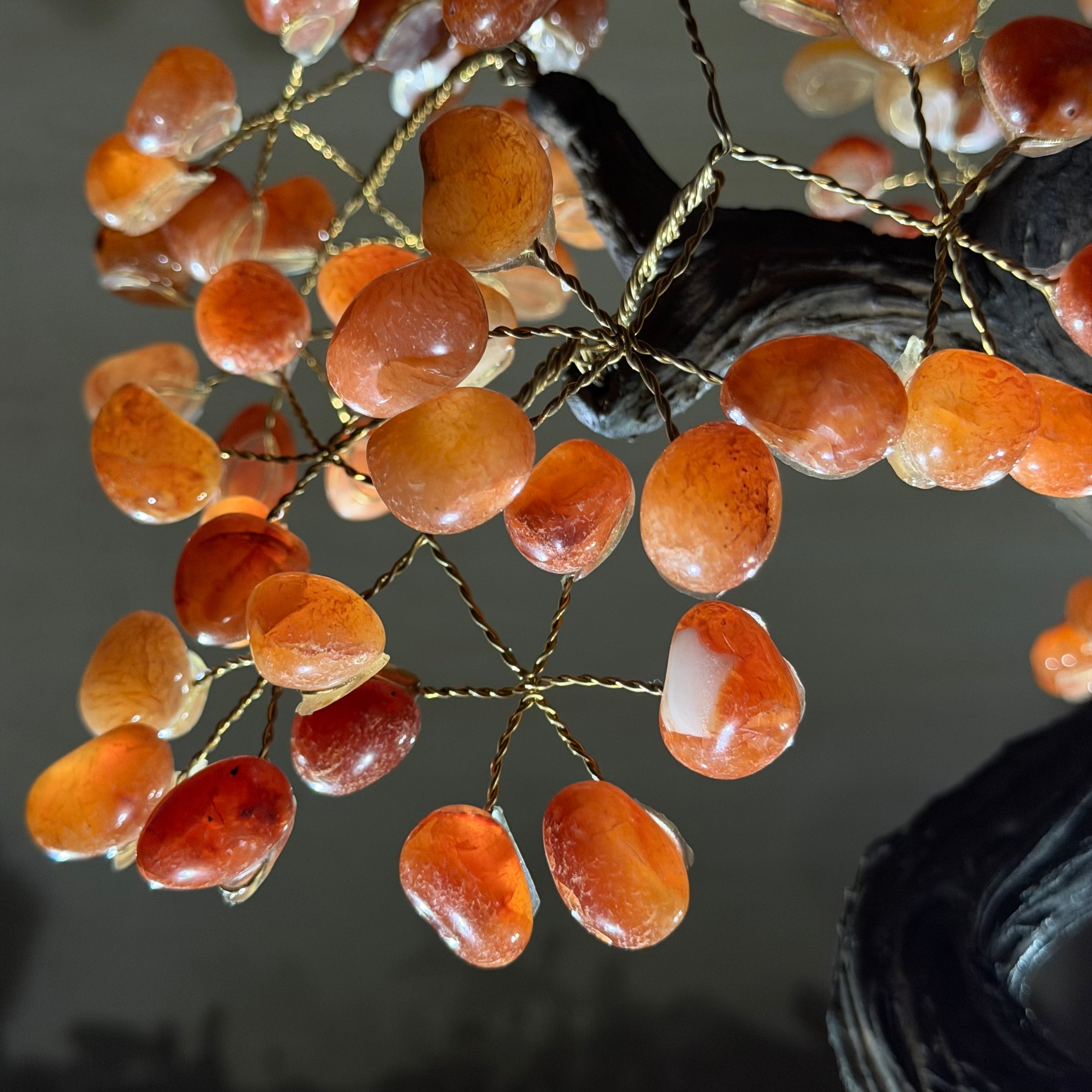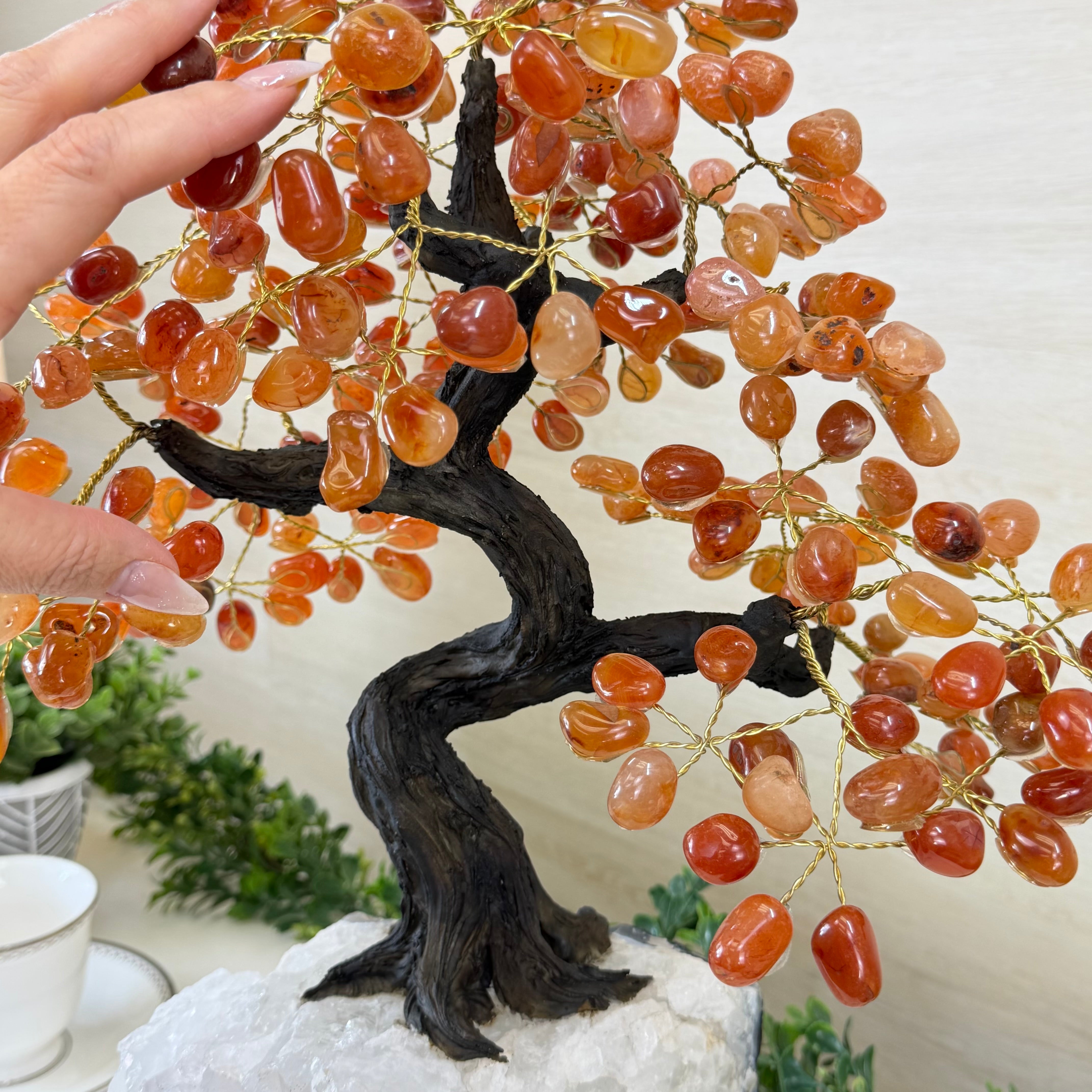 Their bases have a hand-selected crystal cluster, chosen for its size and beauty, commanding attention and admiration. Crafted with meticulous care by skilled artisans, the resin trunk and delicately wired branches gracefully emerge, each branch meticulously adorned with lustrous tumbled Carnelian gemstones.