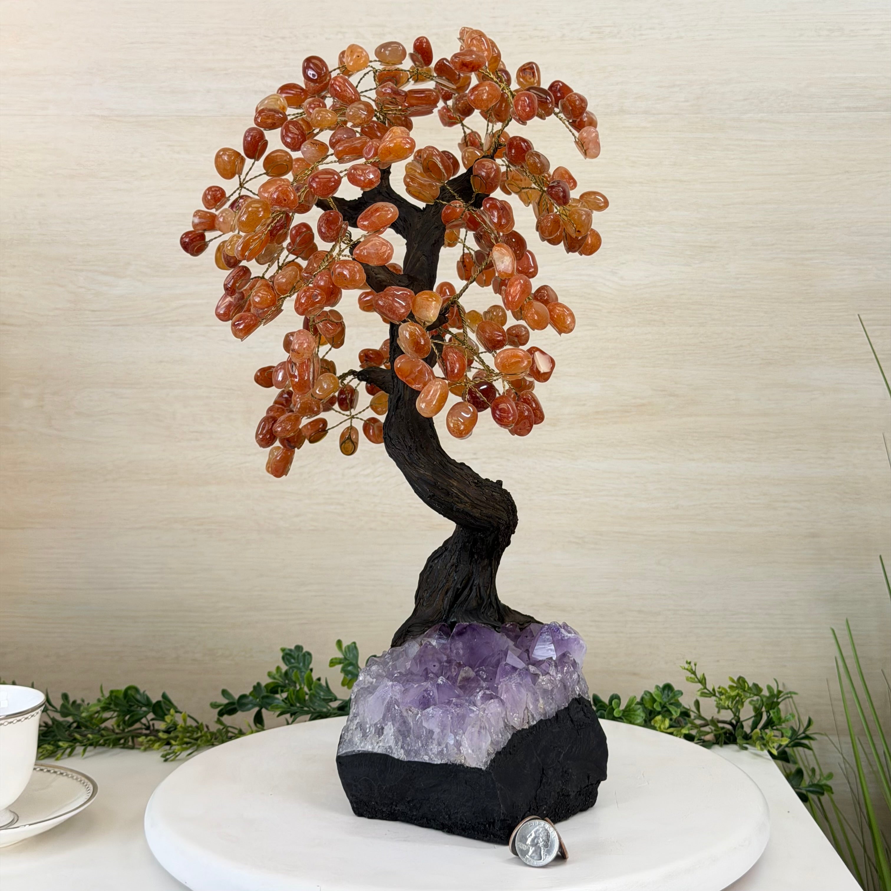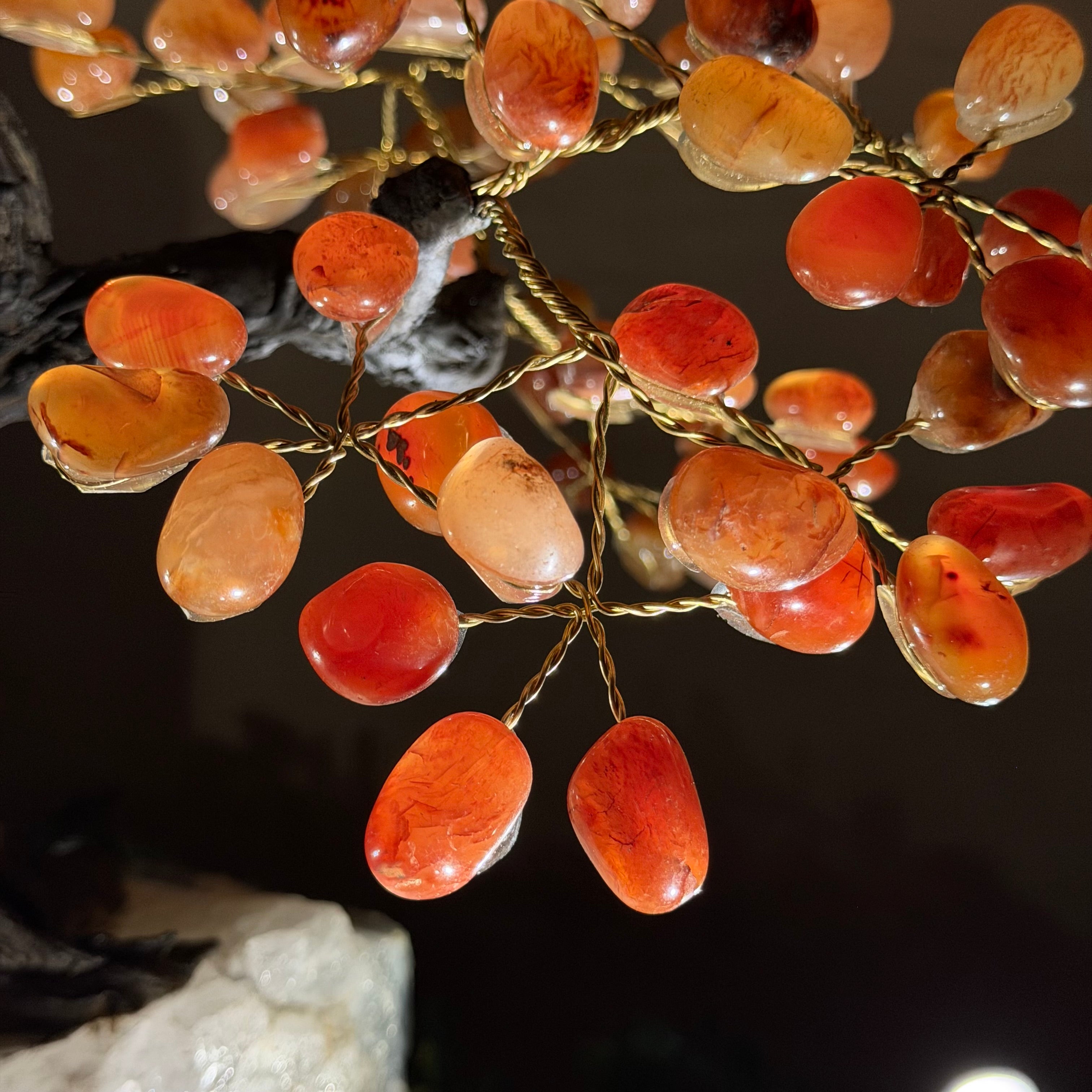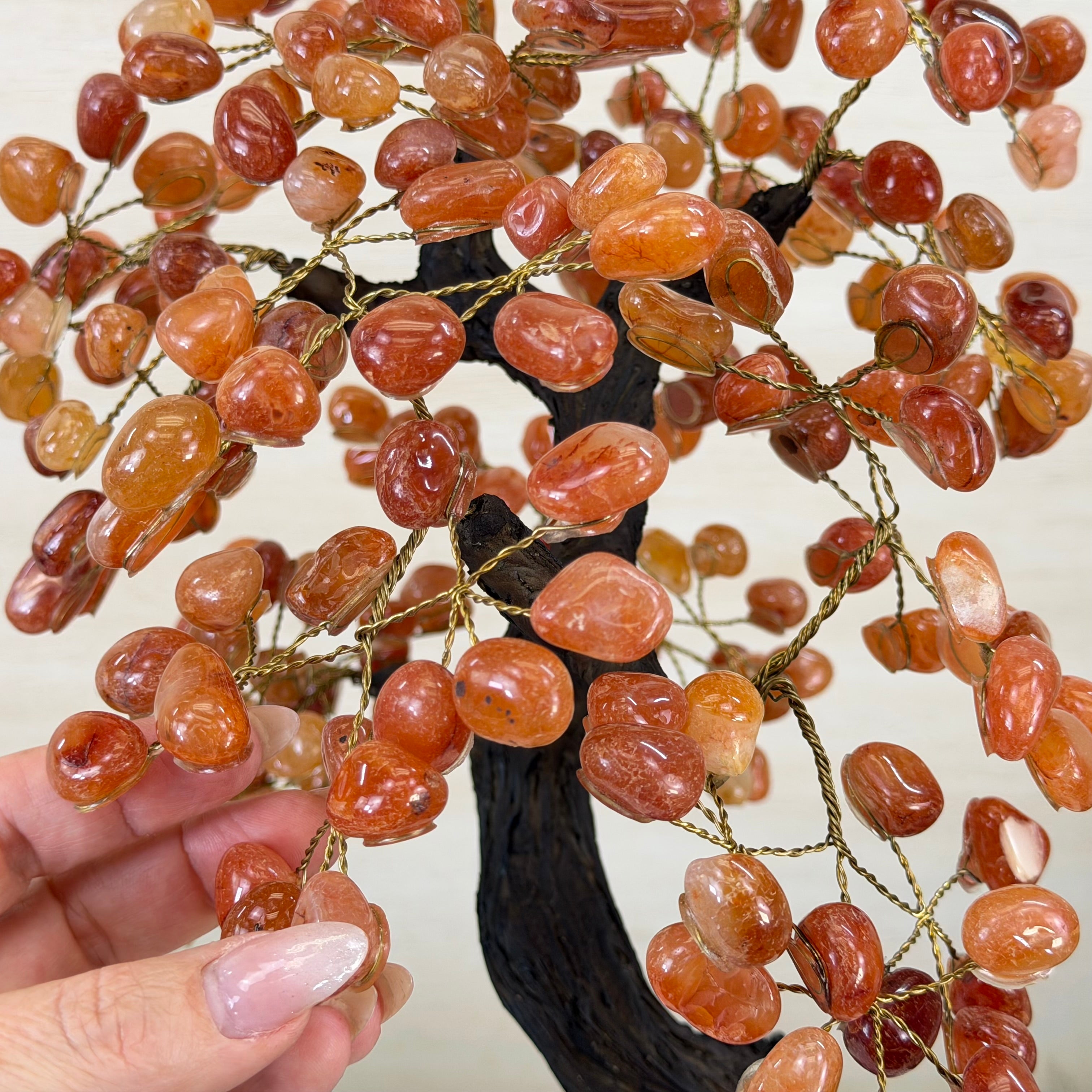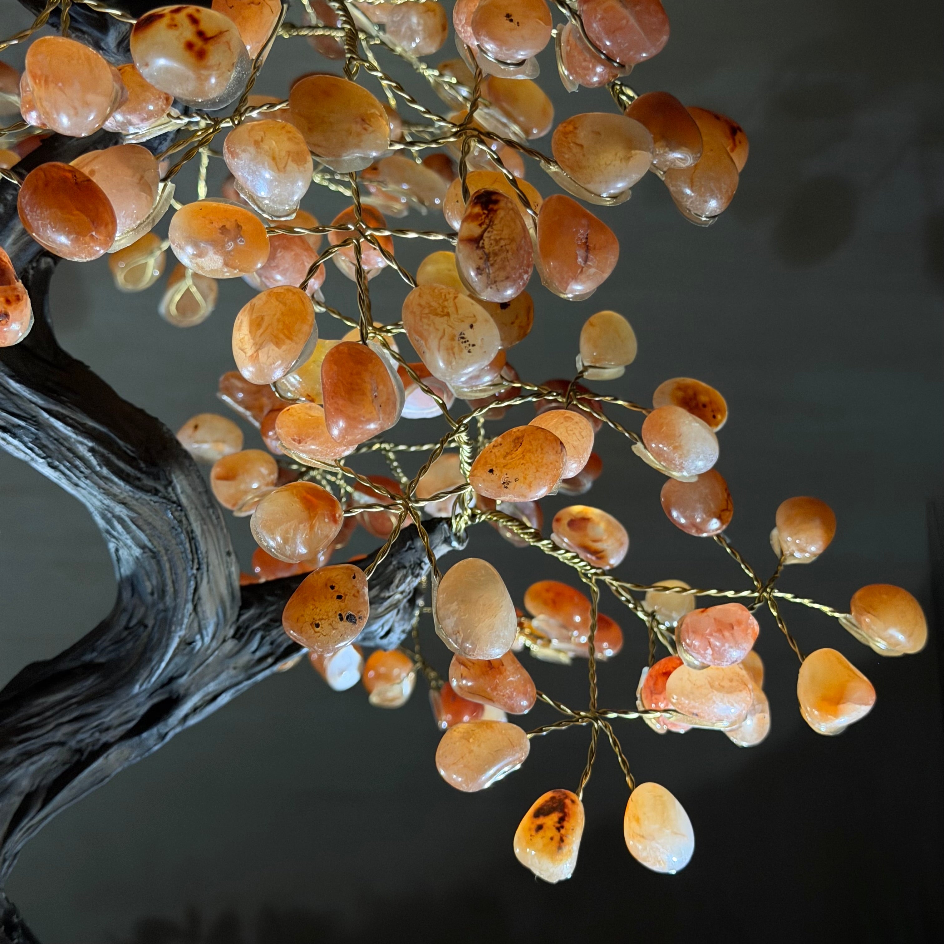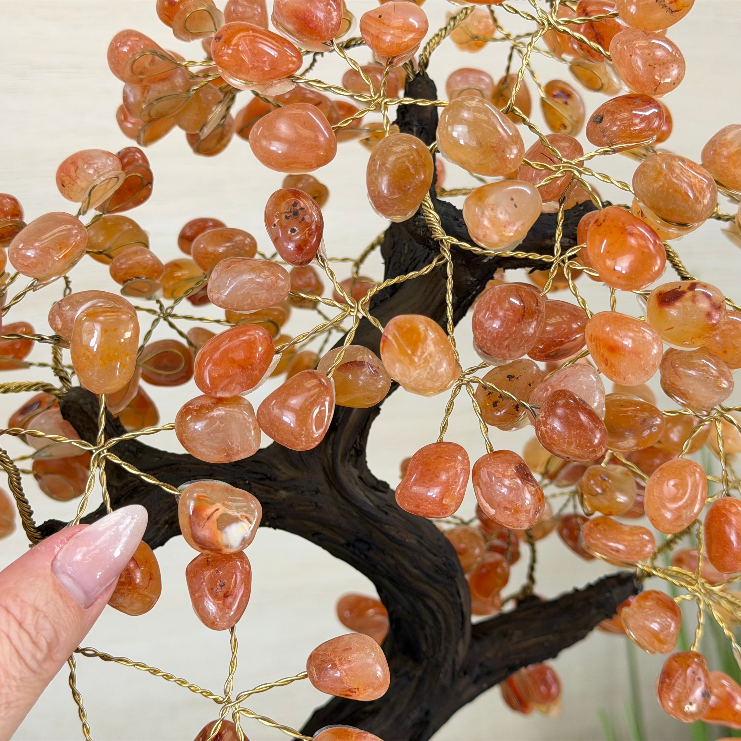 Their bases have a hand-selected crystal cluster, chosen for its size and beauty, commanding attention and admiration. Crafted with meticulous care by skilled artisans, the resin trunk and delicately wired branches gracefully emerge, each branch meticulously adorned with lustrous tumbled Carnelian gemstones.