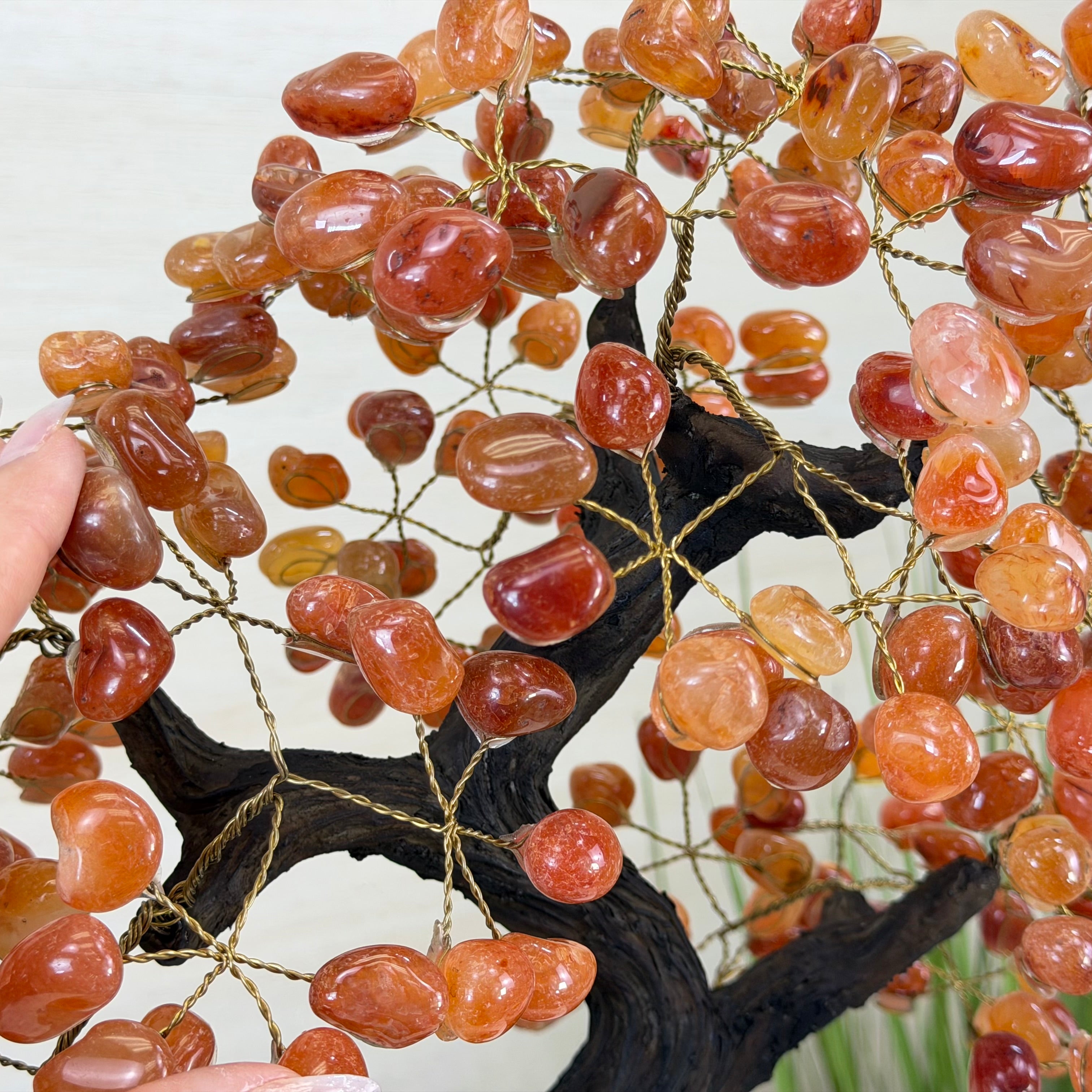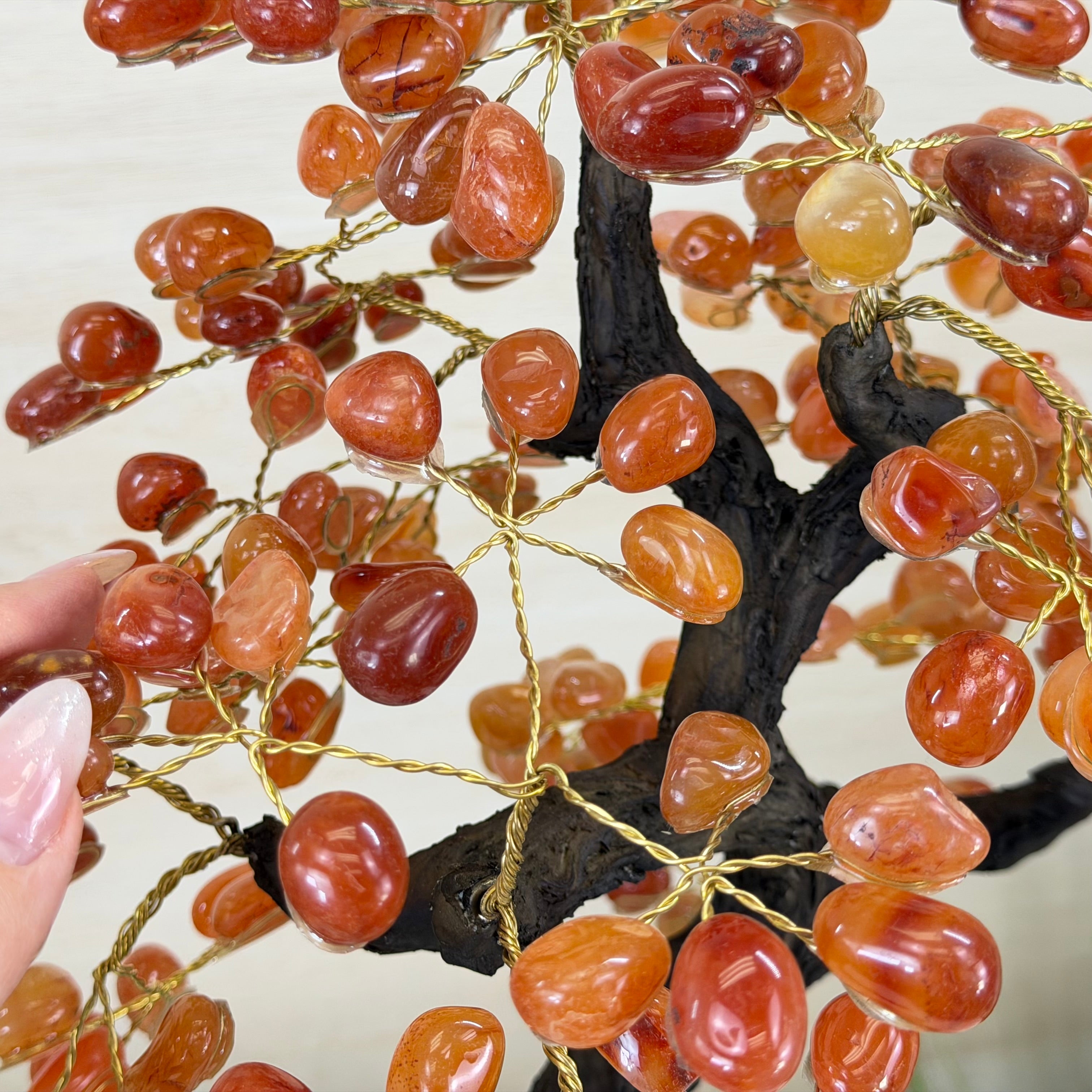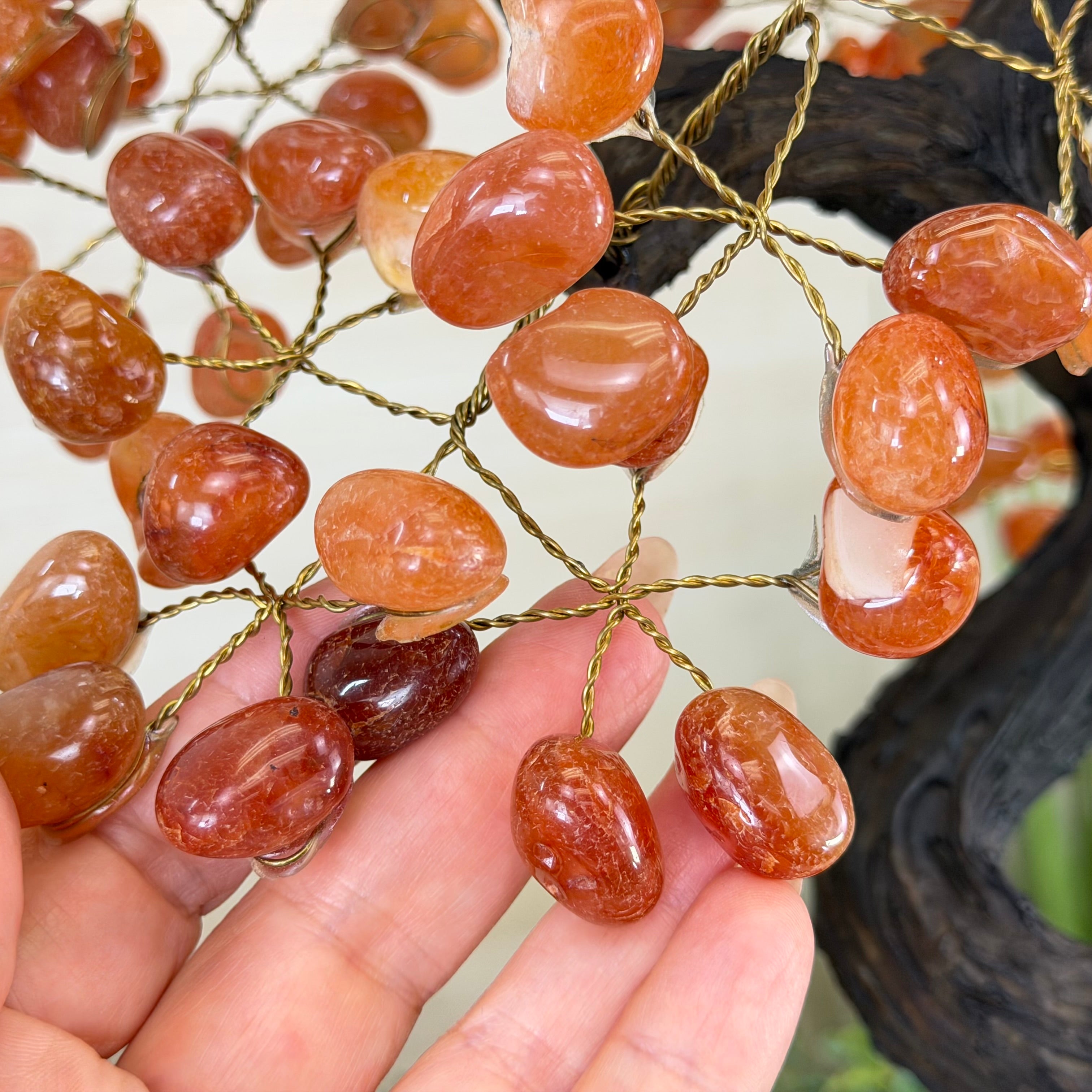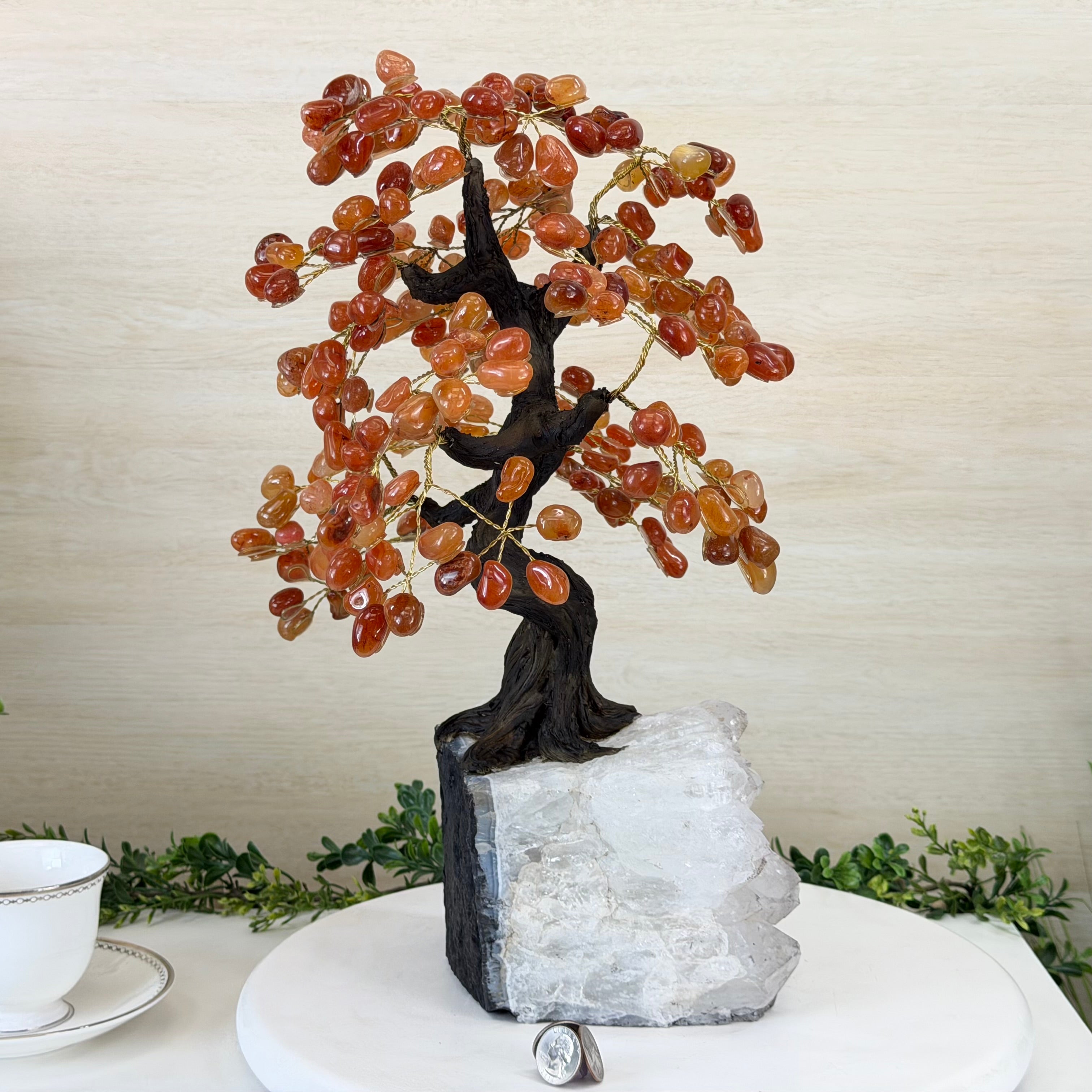 Their bases have a hand-selected crystal cluster, chosen for its size and beauty, commanding attention and admiration. Crafted with meticulous care by skilled artisans, the resin trunk and delicately wired branches gracefully emerge, each branch meticulously adorned with lustrous tumbled Carnelian gemstones.