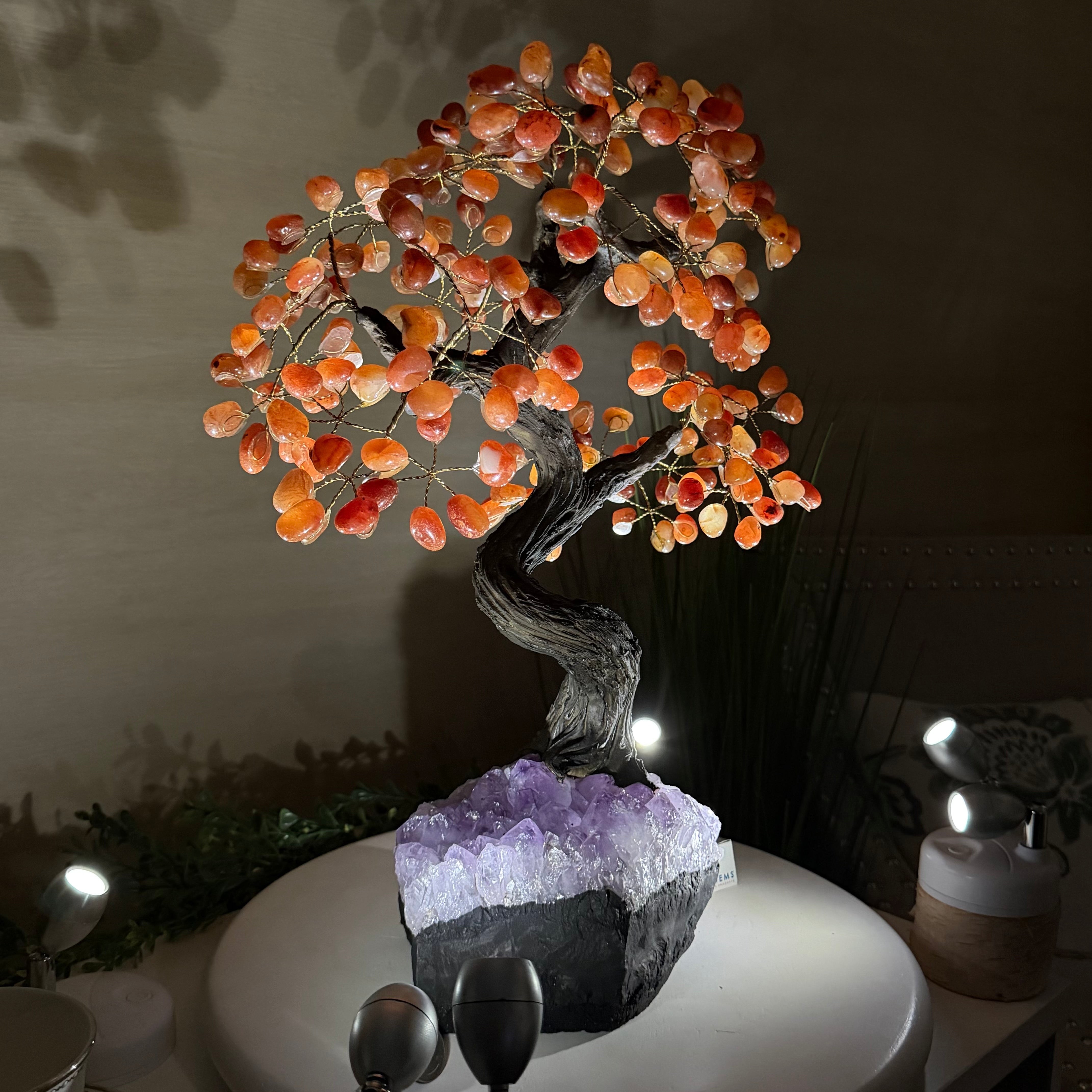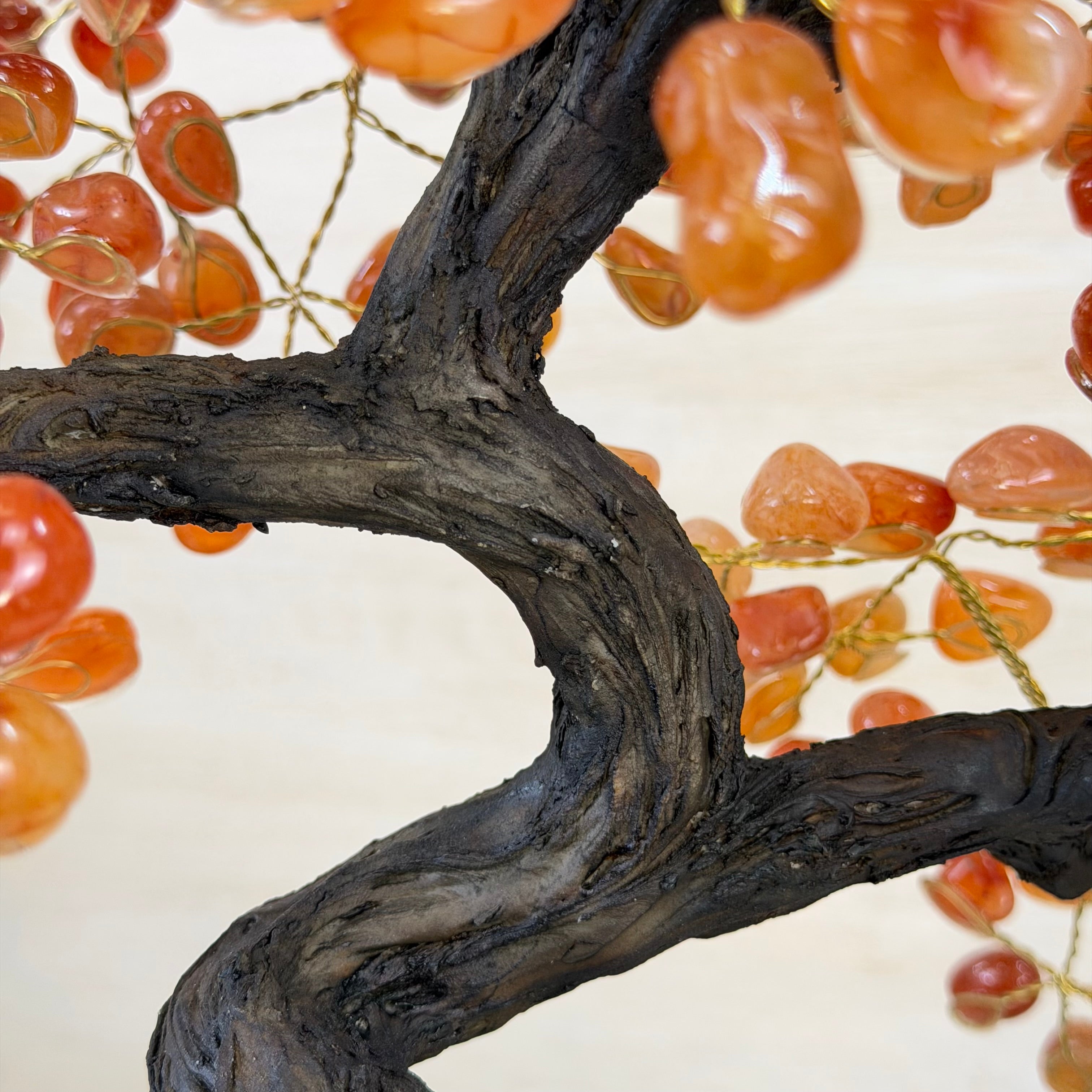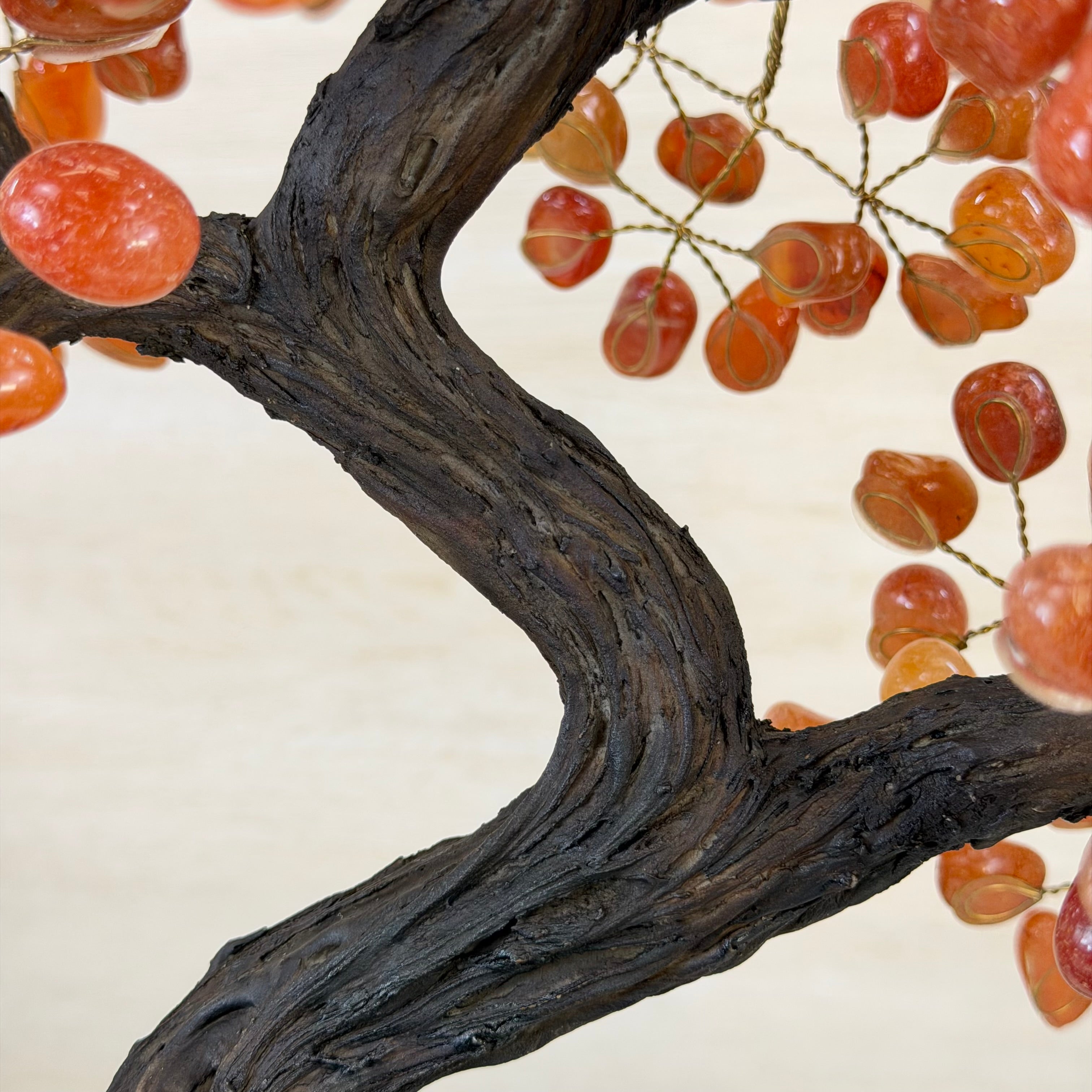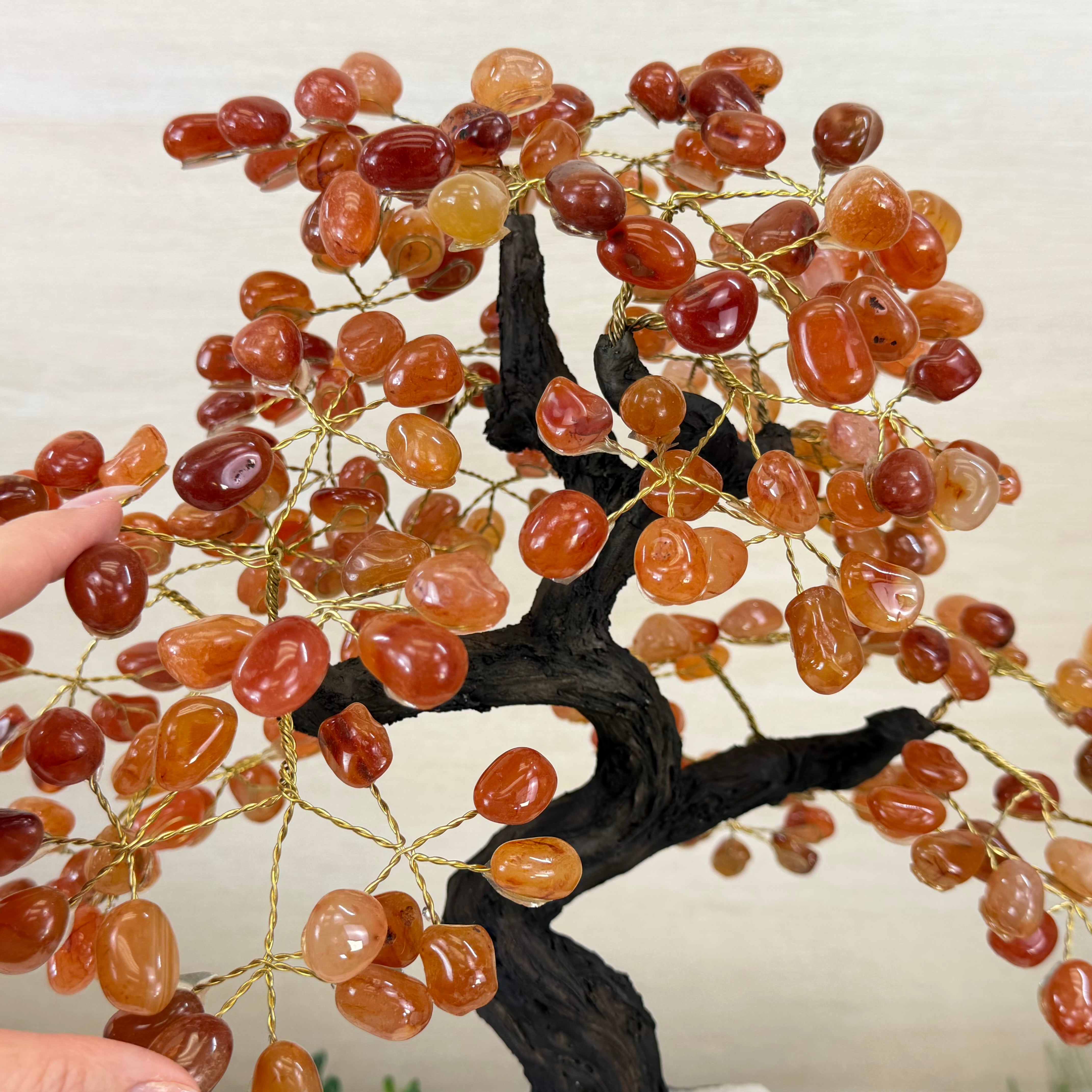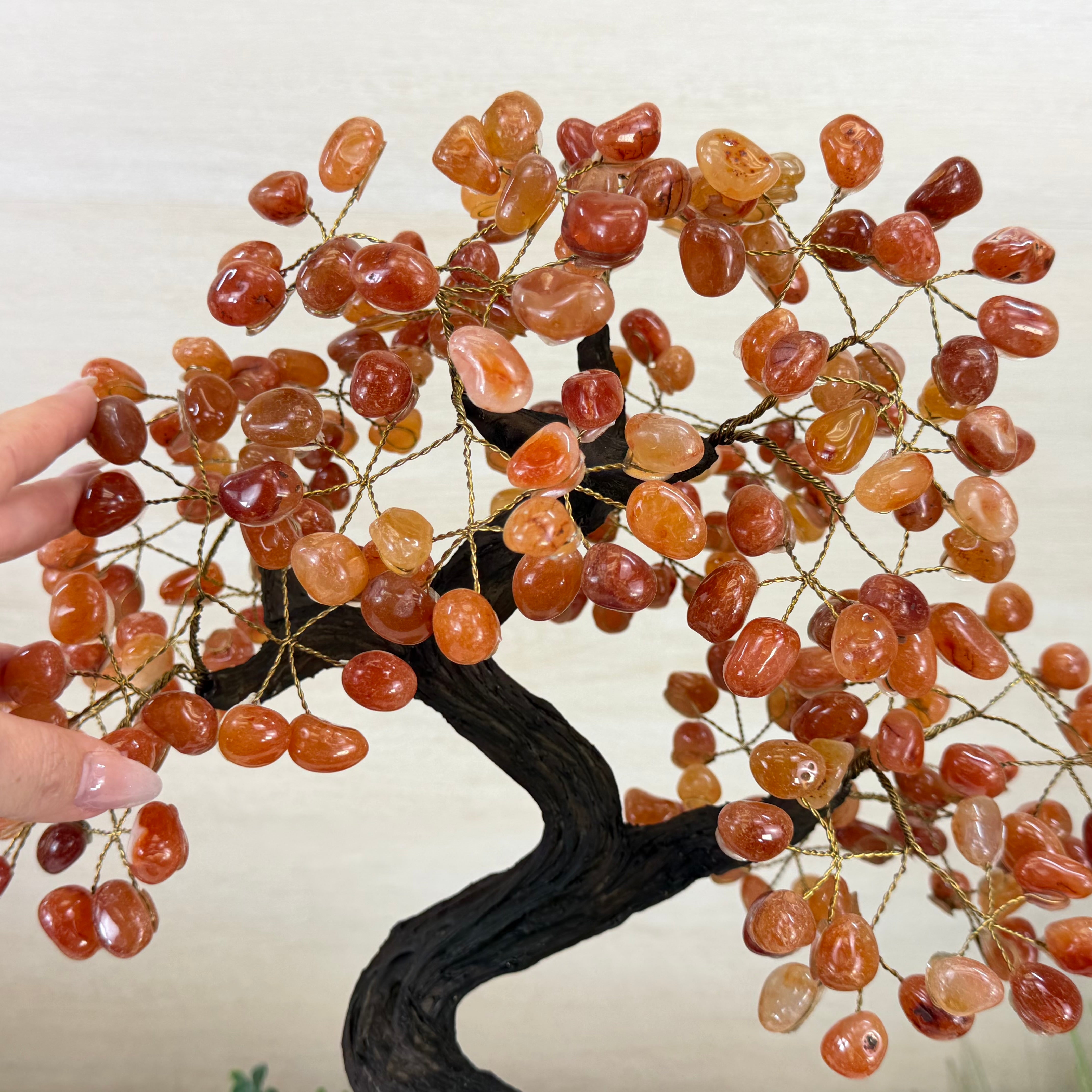 Their bases have a hand-selected crystal cluster, chosen for its size and beauty, commanding attention and admiration. Crafted with meticulous care by skilled artisans, the resin trunk and delicately wired branches gracefully emerge, each branch meticulously adorned with lustrous tumbled Carnelian gemstones.