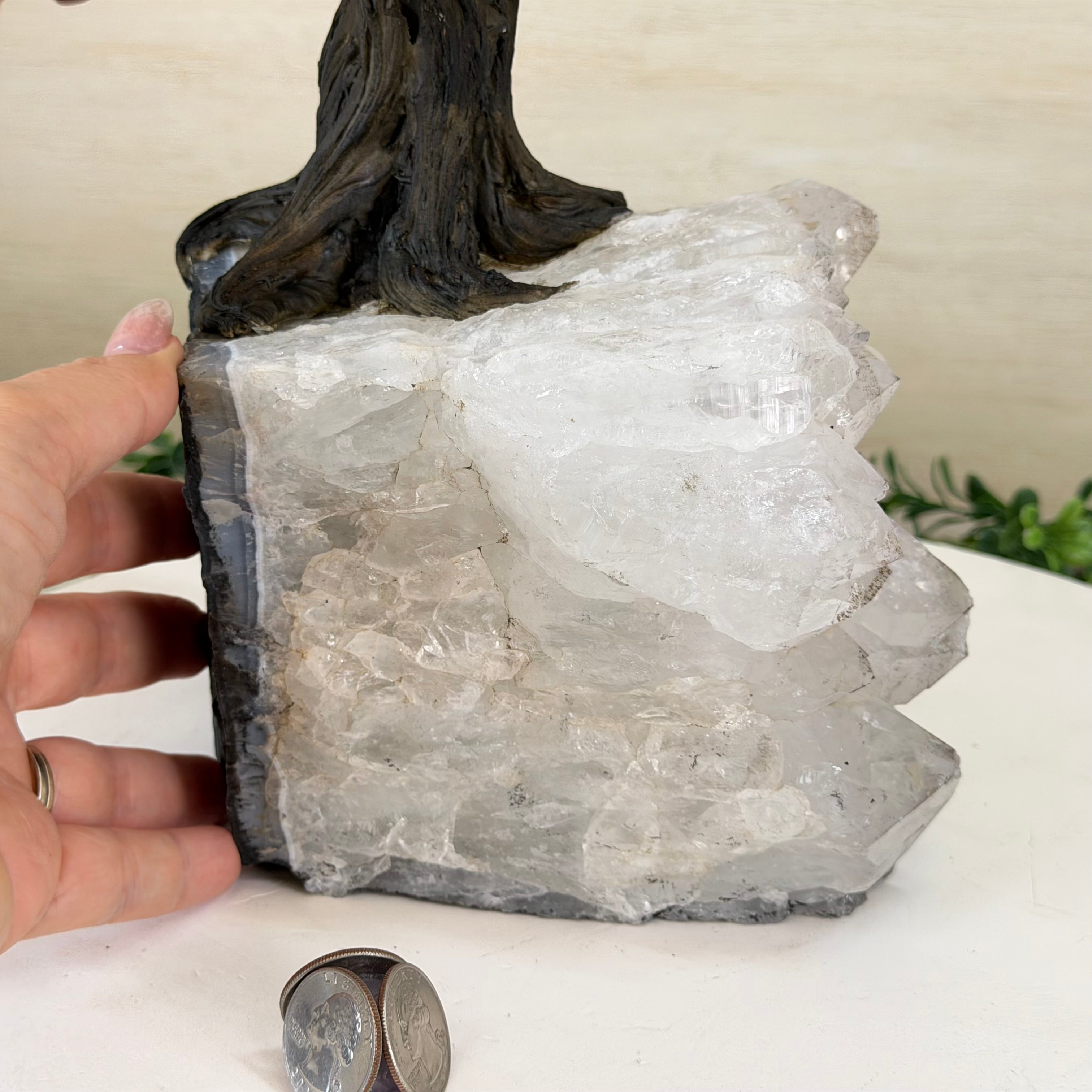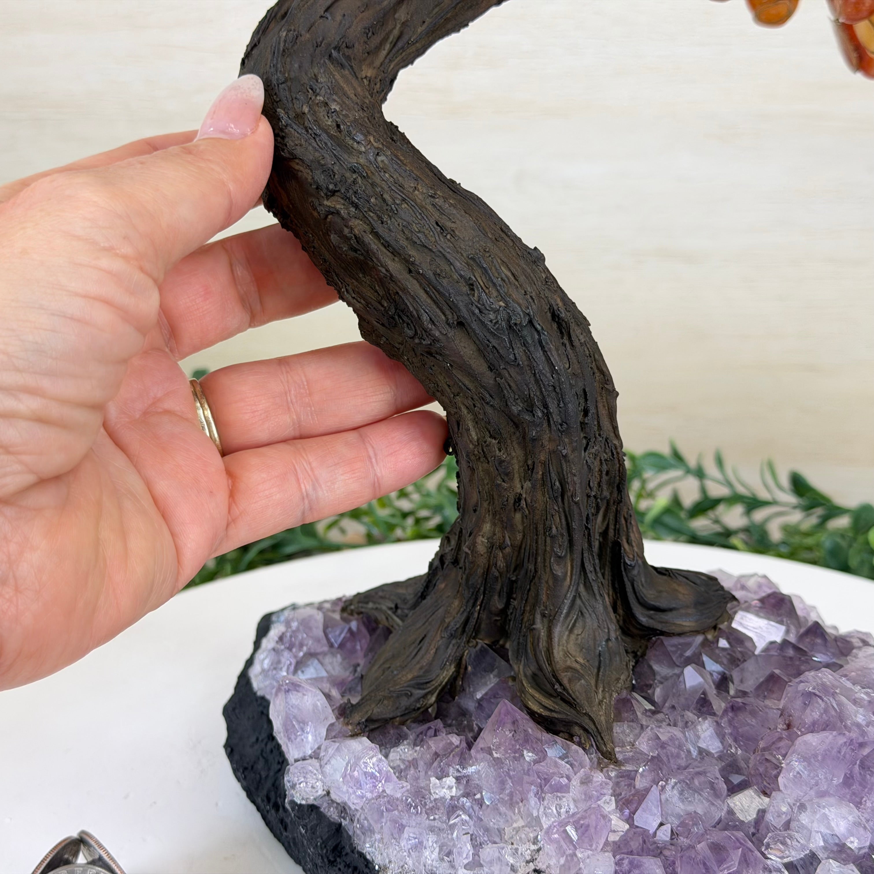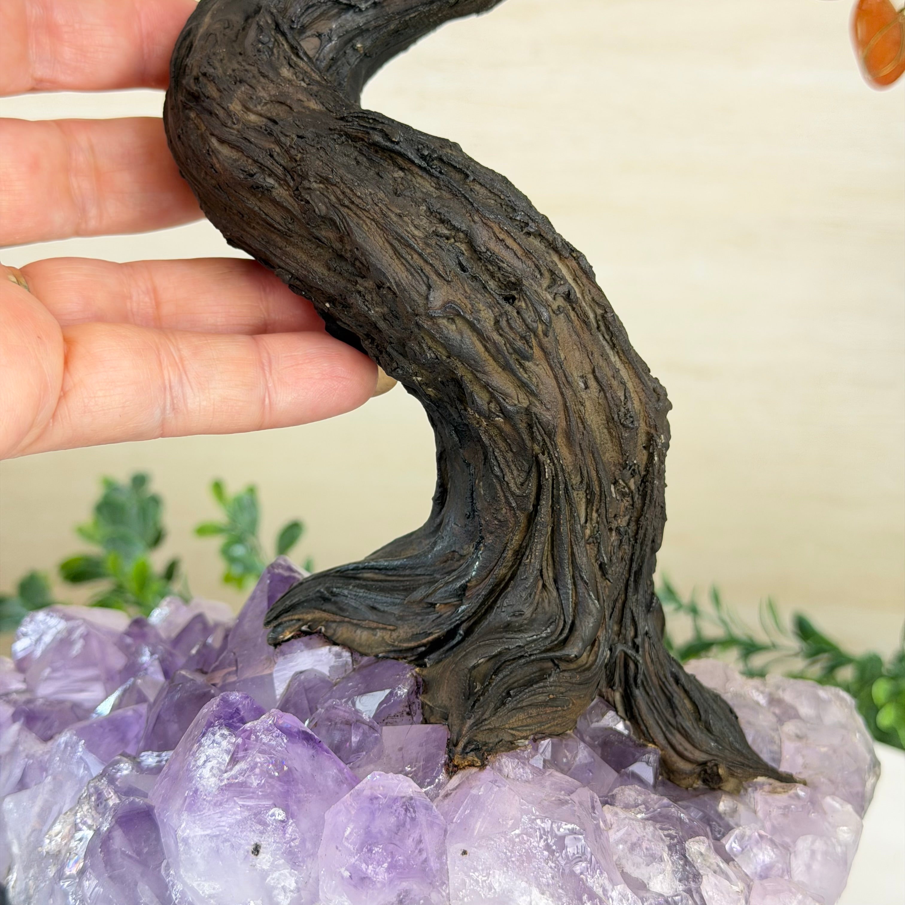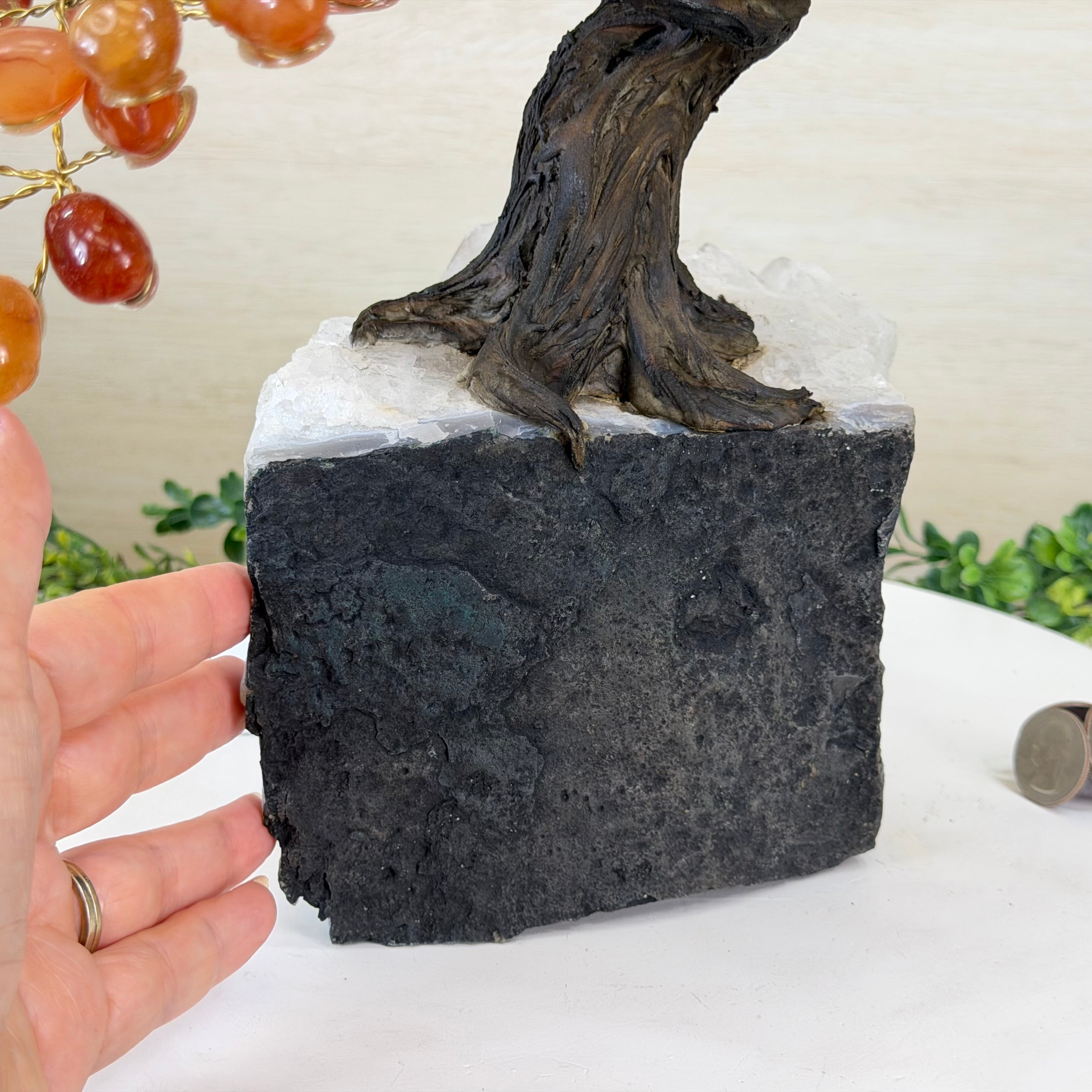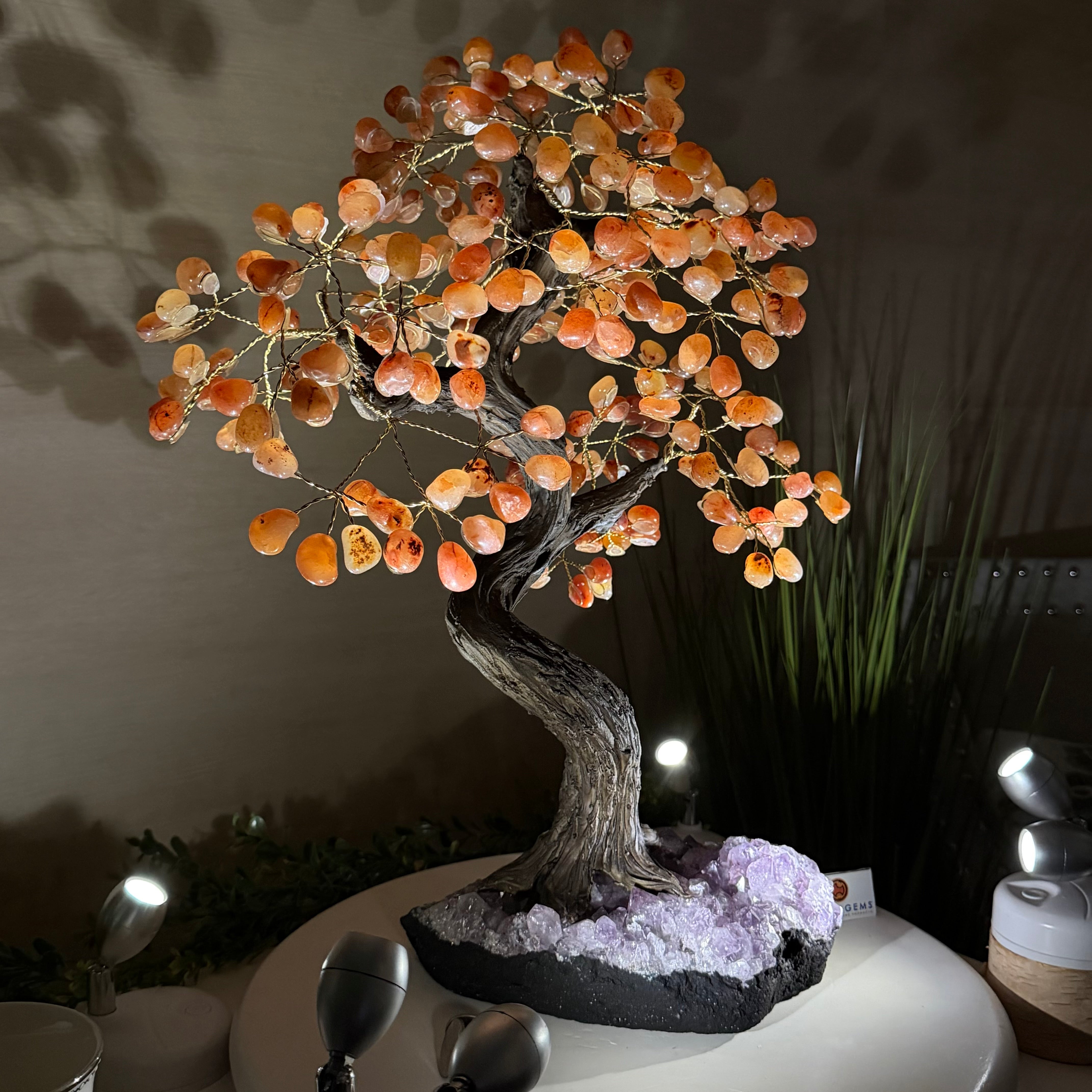 Their bases have a hand-selected crystal cluster, chosen for its size and beauty, commanding attention and admiration. Crafted with meticulous care by skilled artisans, the resin trunk and delicately wired branches gracefully emerge, each branch meticulously adorned with lustrous tumbled Carnelian gemstones.