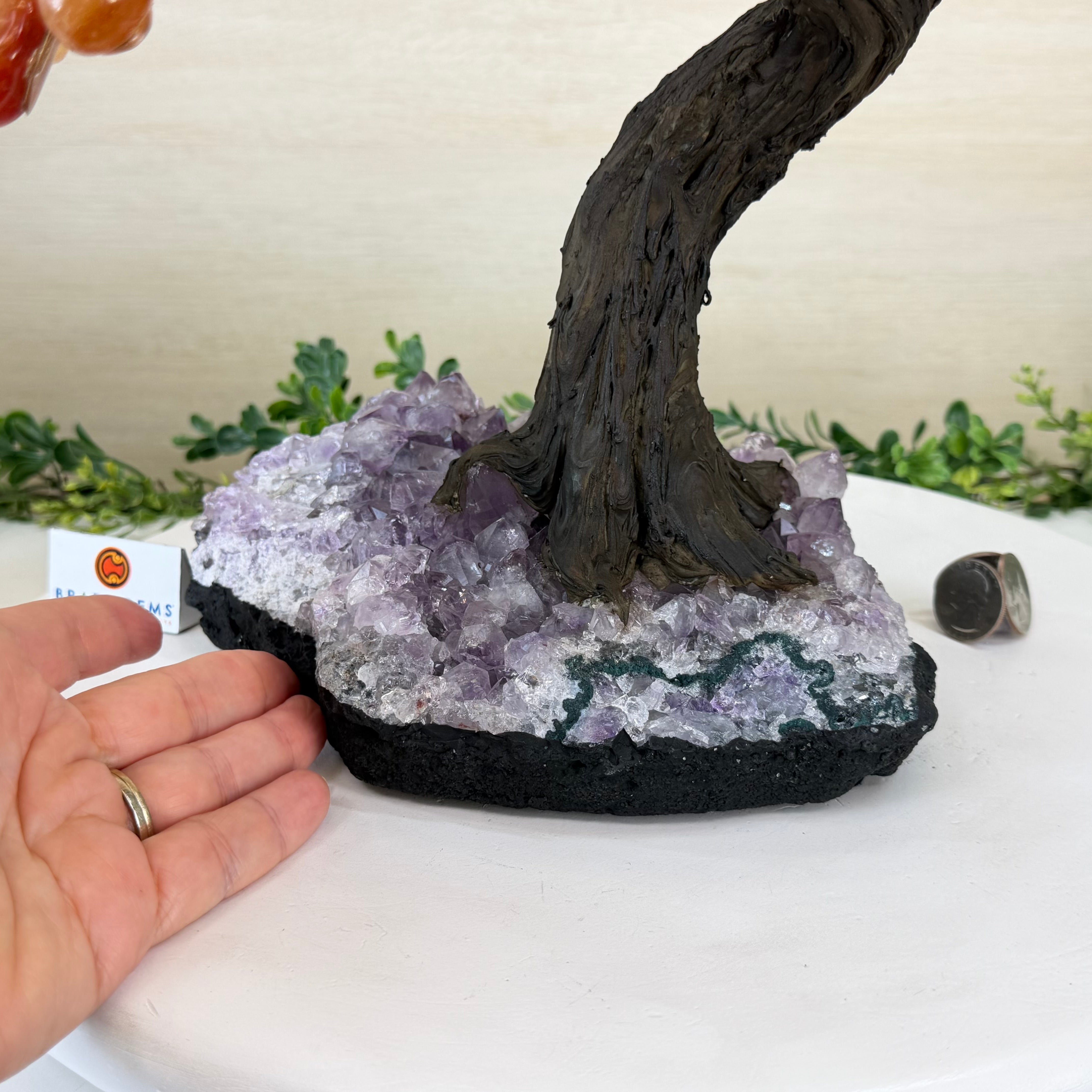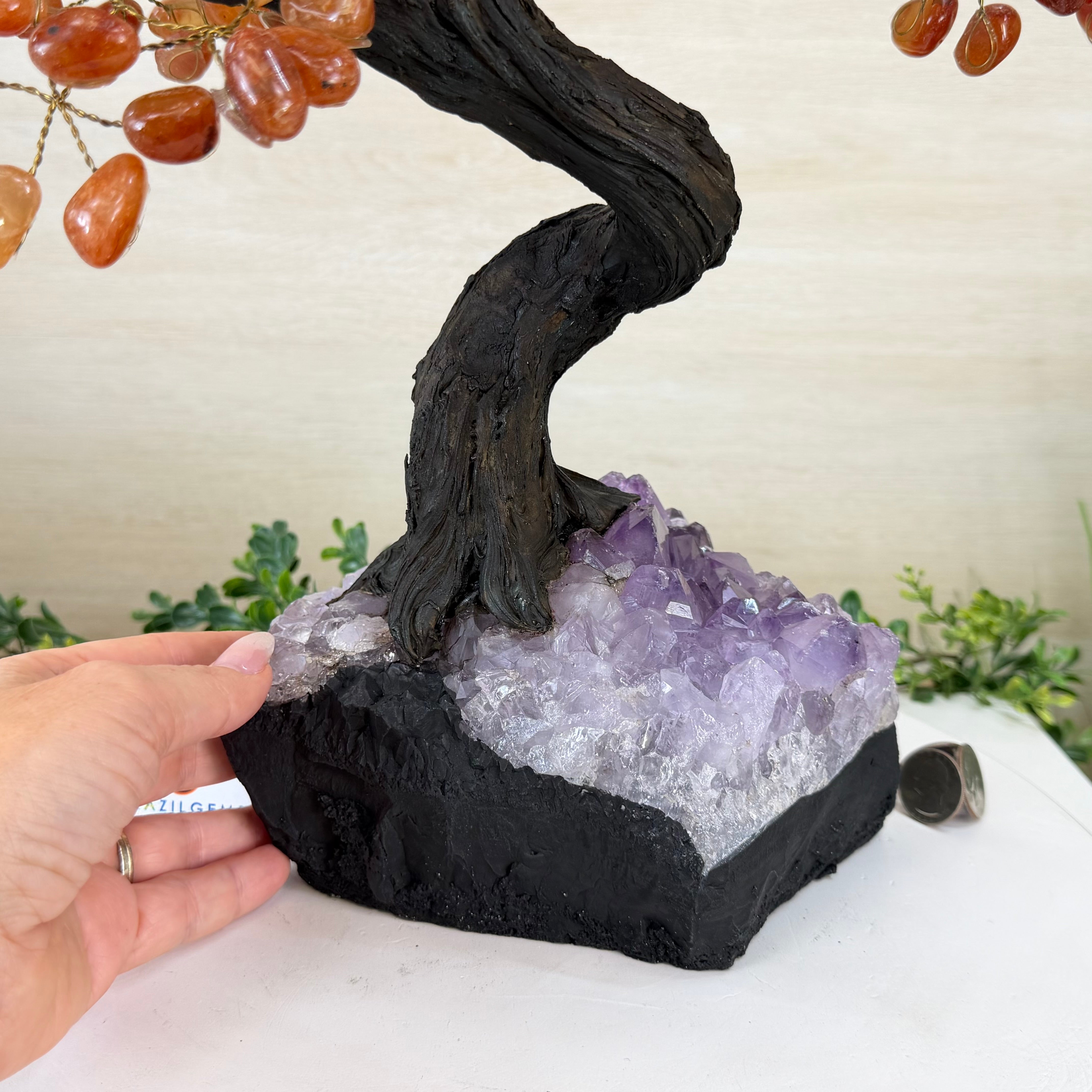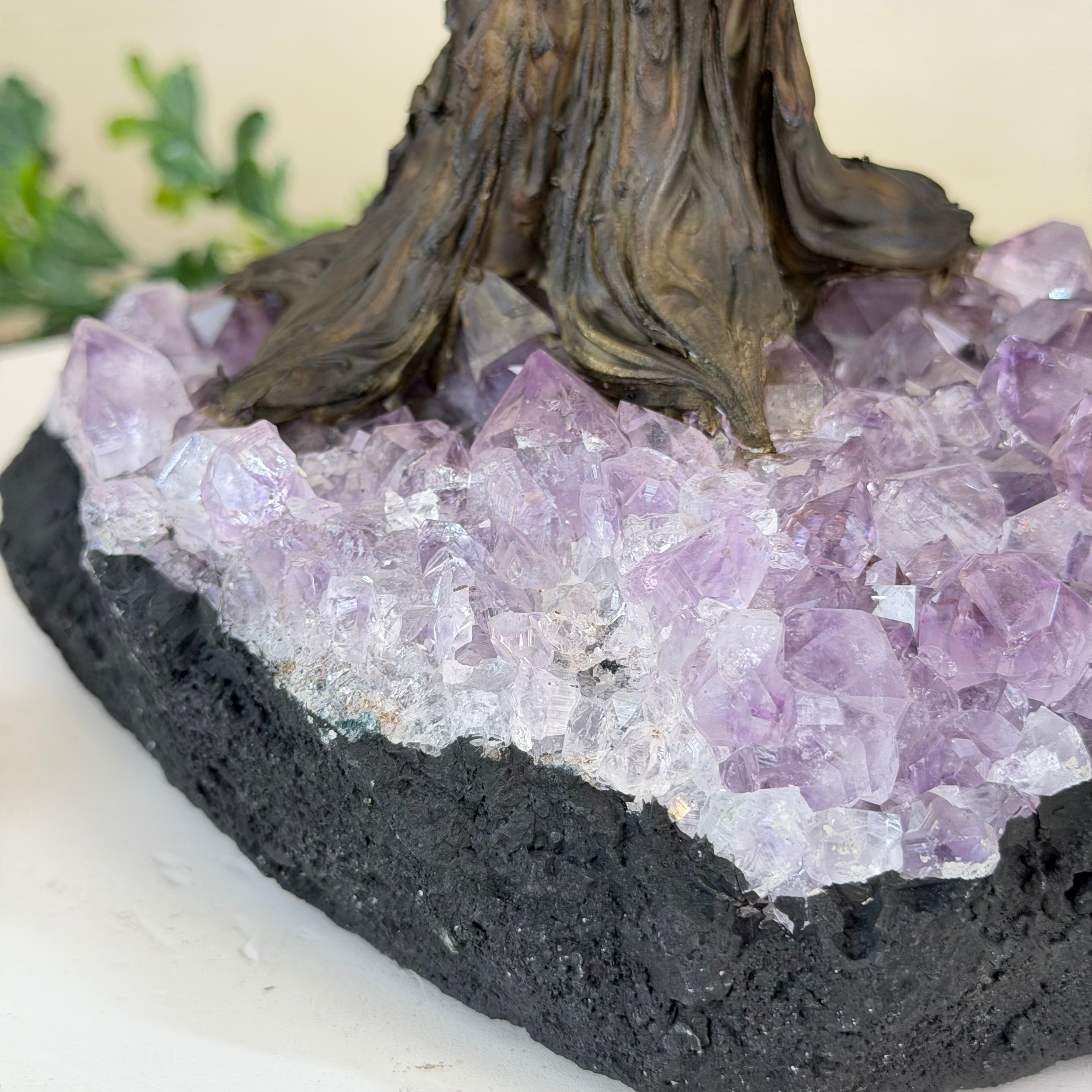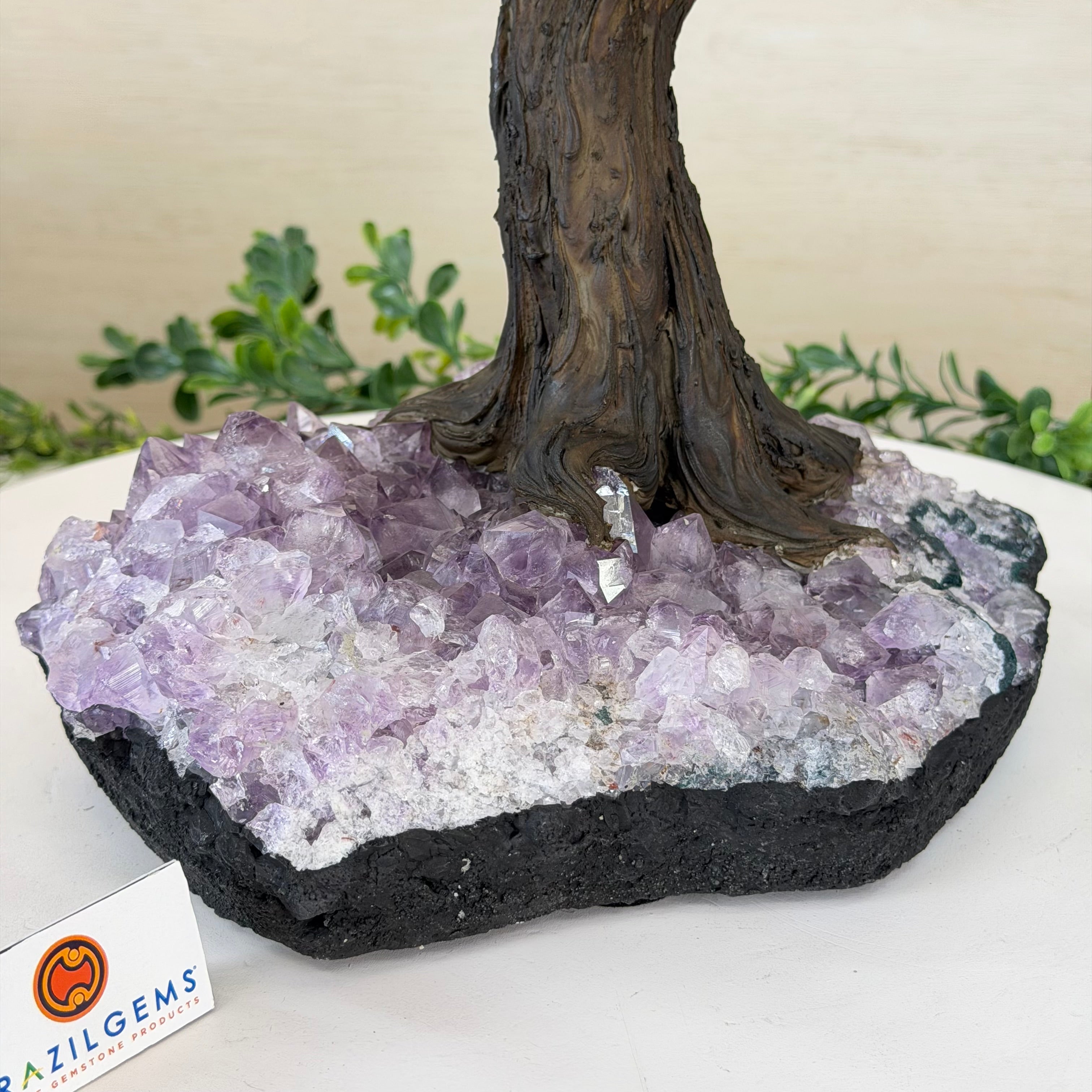 The process to make a gemstone tree like this is very extensive and meticulous. A special amethyst cluster is selected for the base, the resin trunk and branches are crafted by Brazilian artisans and then each gemstone is glued to the tree by hand. MADE IN BRAZIL!