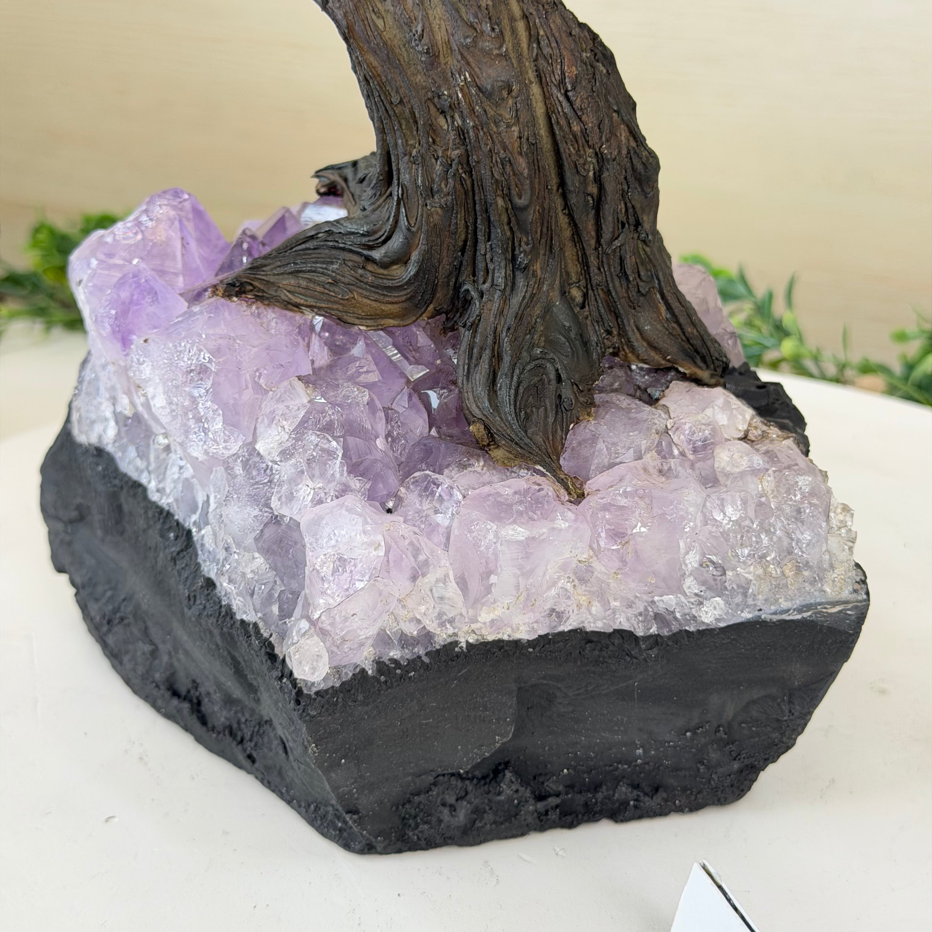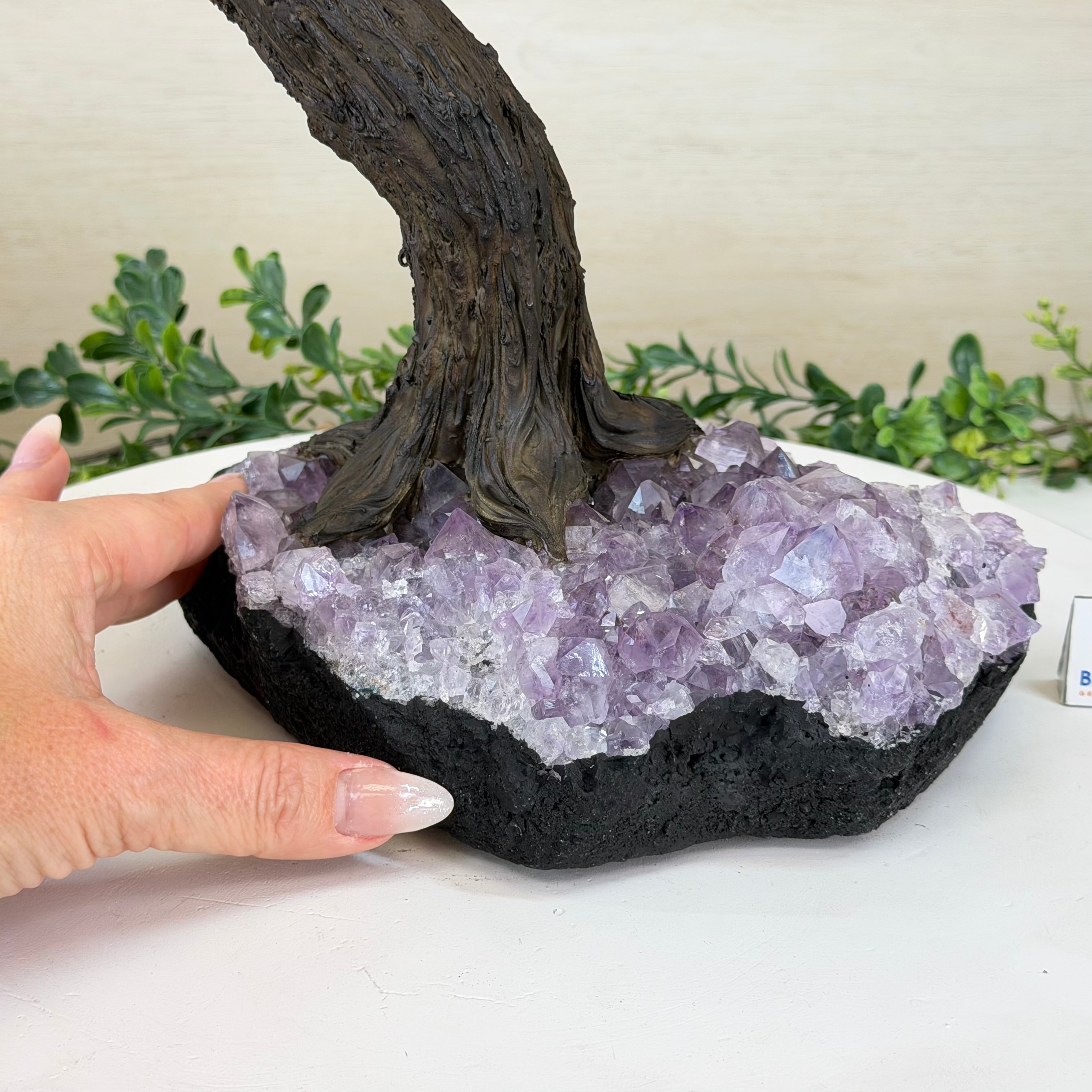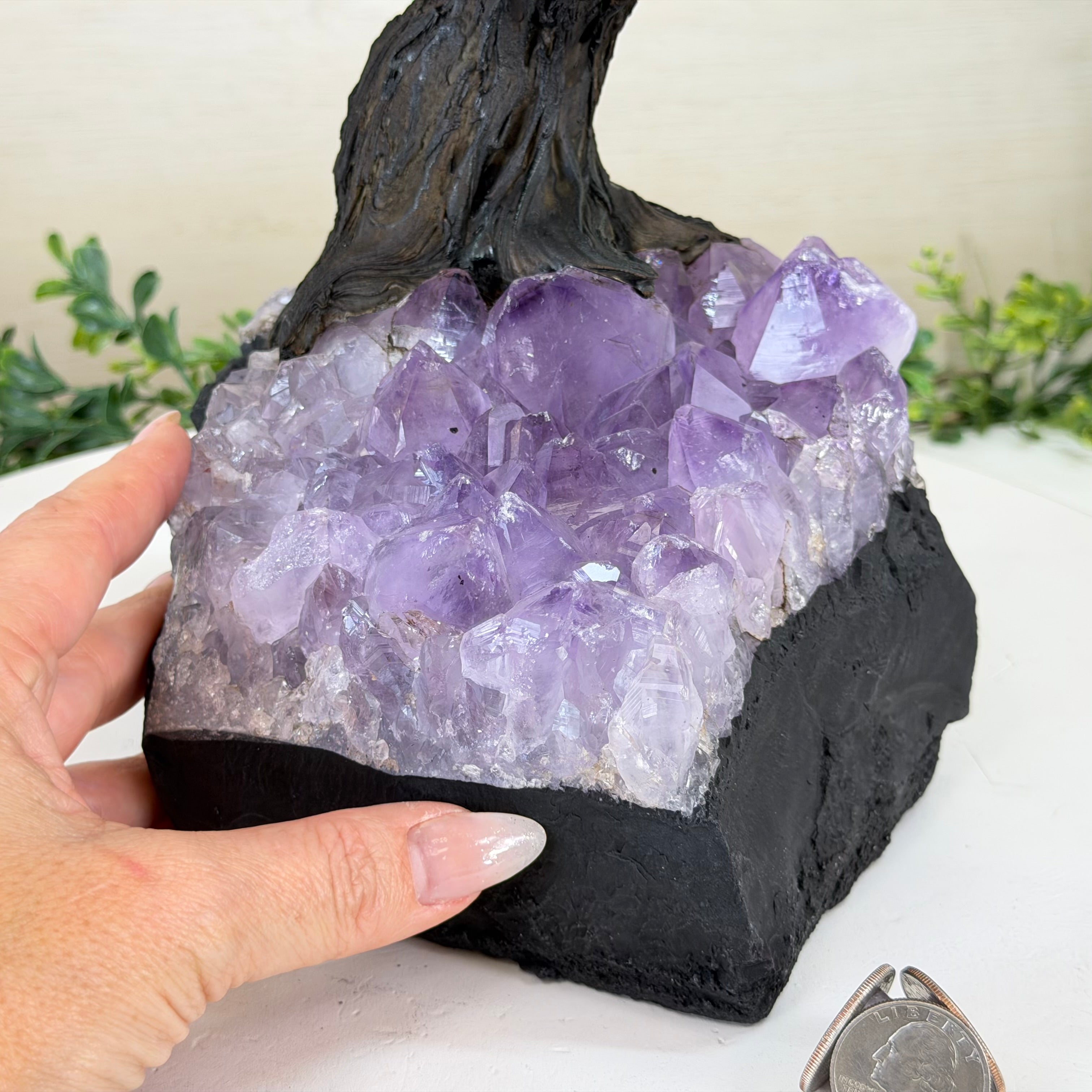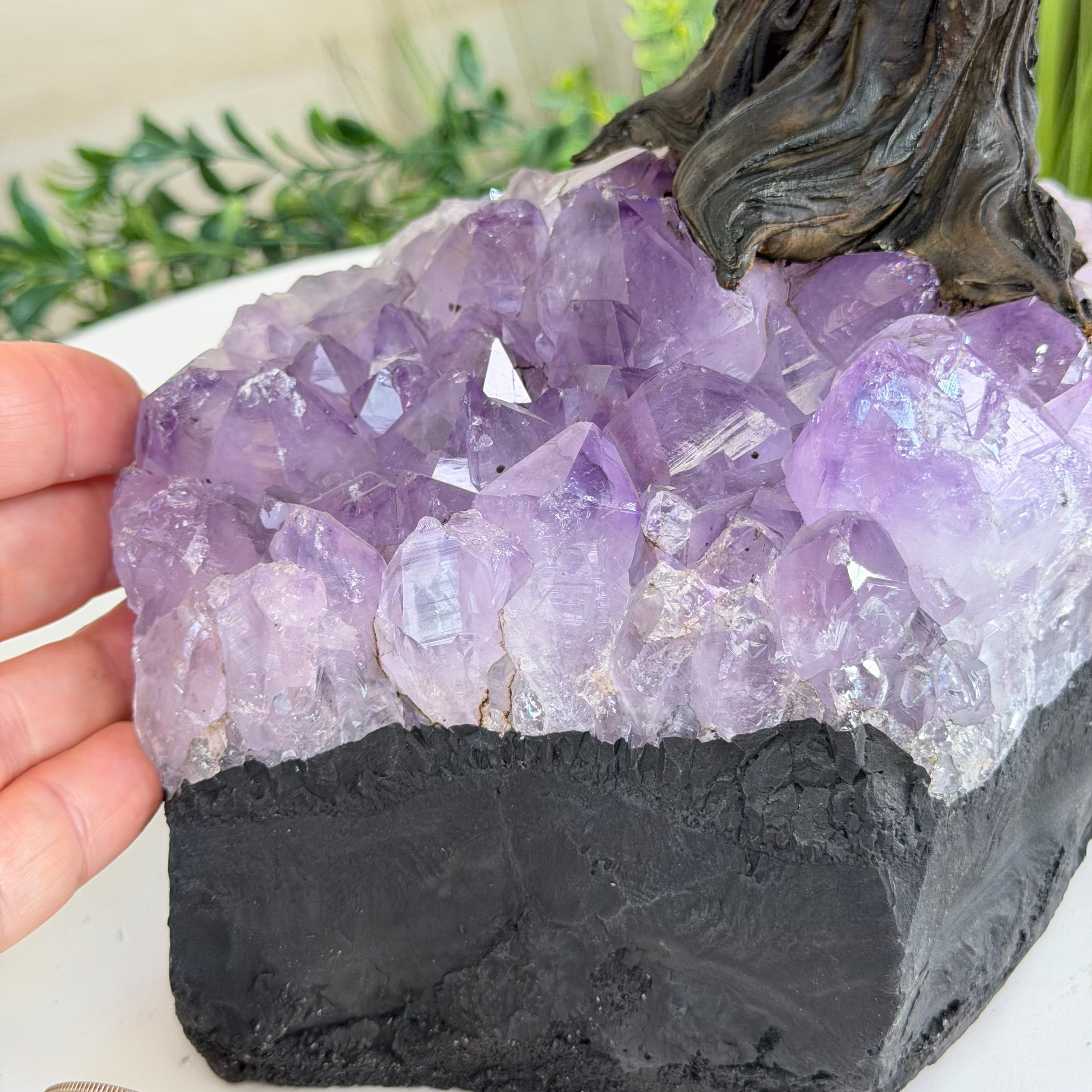 The process to make a gemstone tree like this is very extensive and meticulous. A special amethyst cluster is selected for the base, the resin trunk and branches are crafted by Brazilian artisans and then each gemstone is glued to the tree by hand. MADE IN BRAZIL!