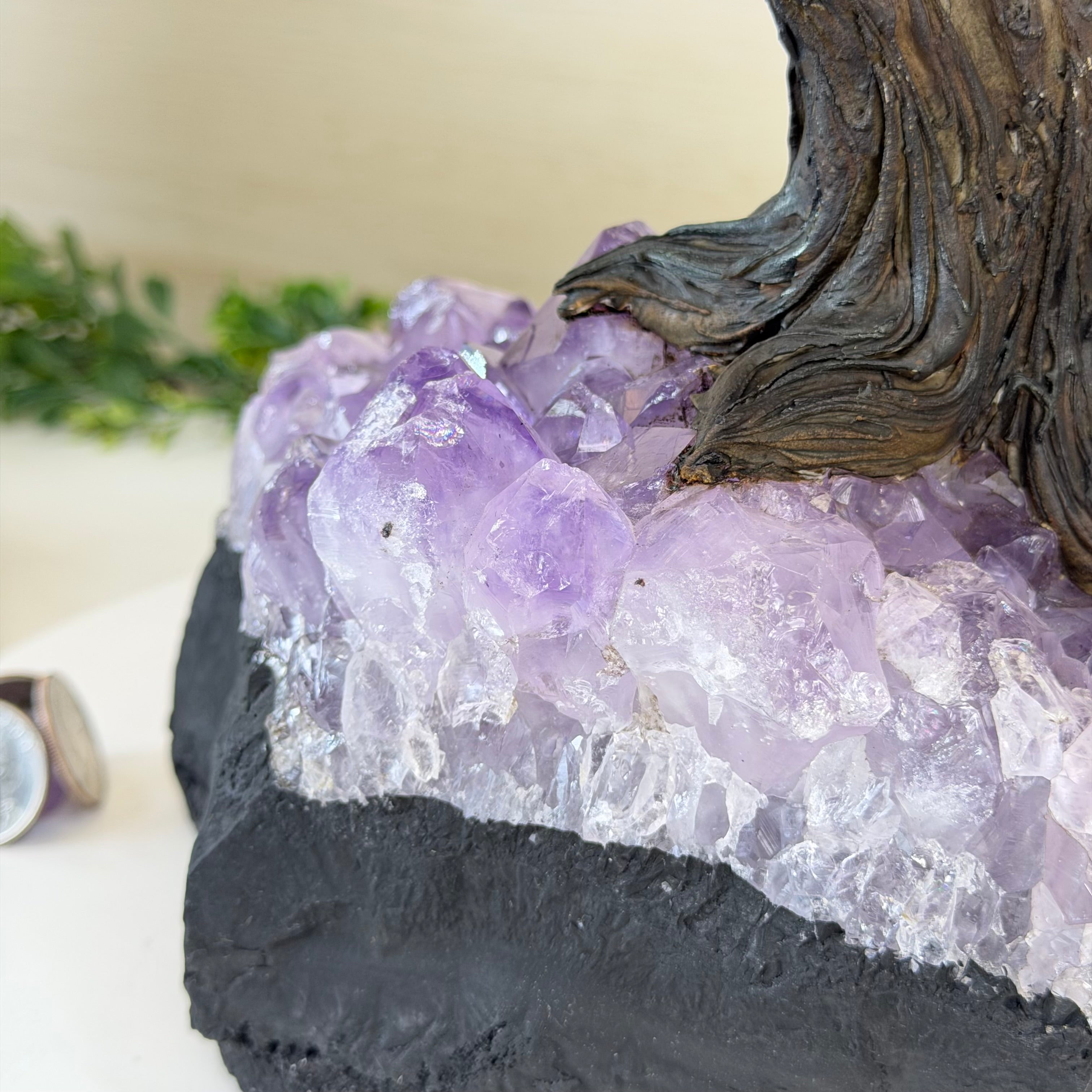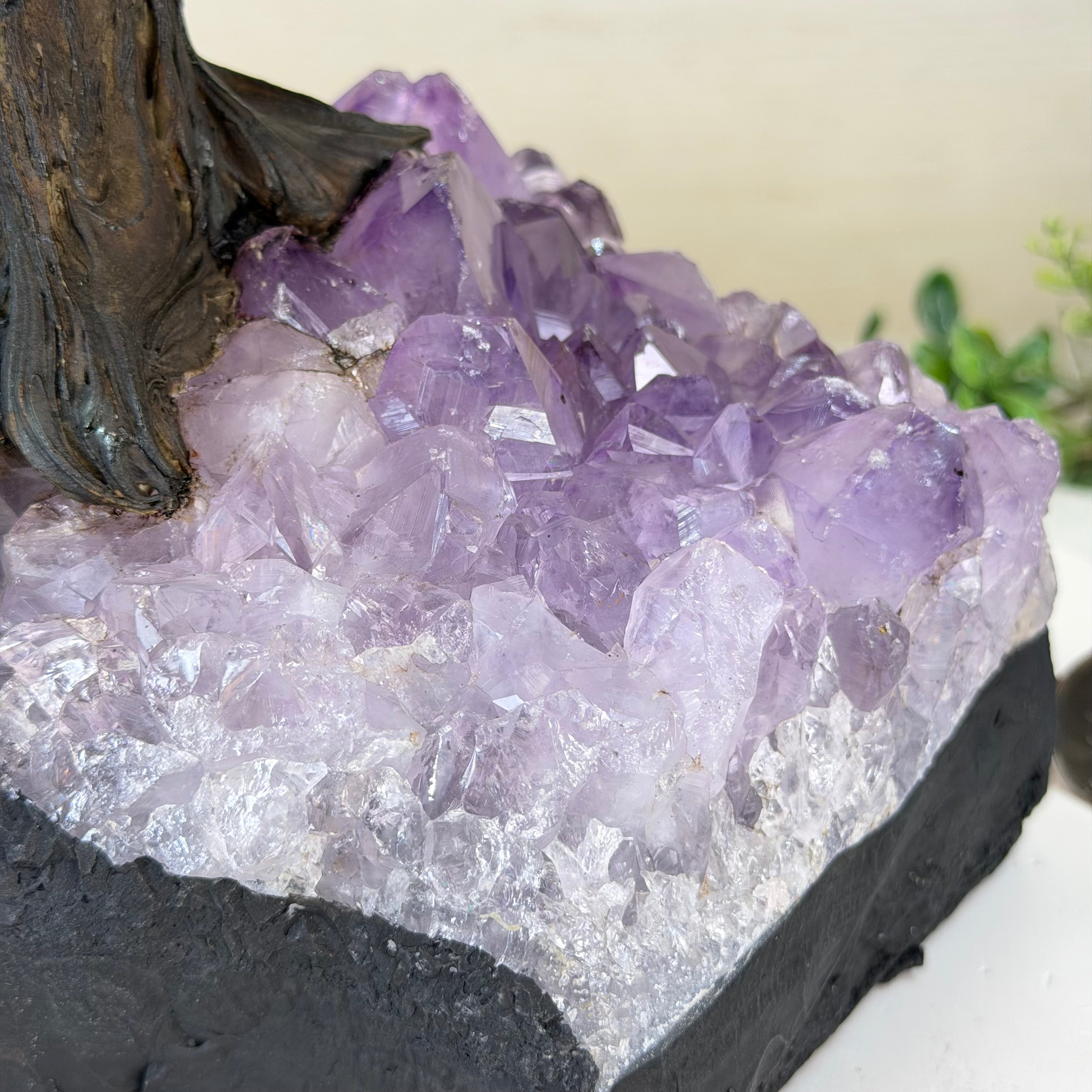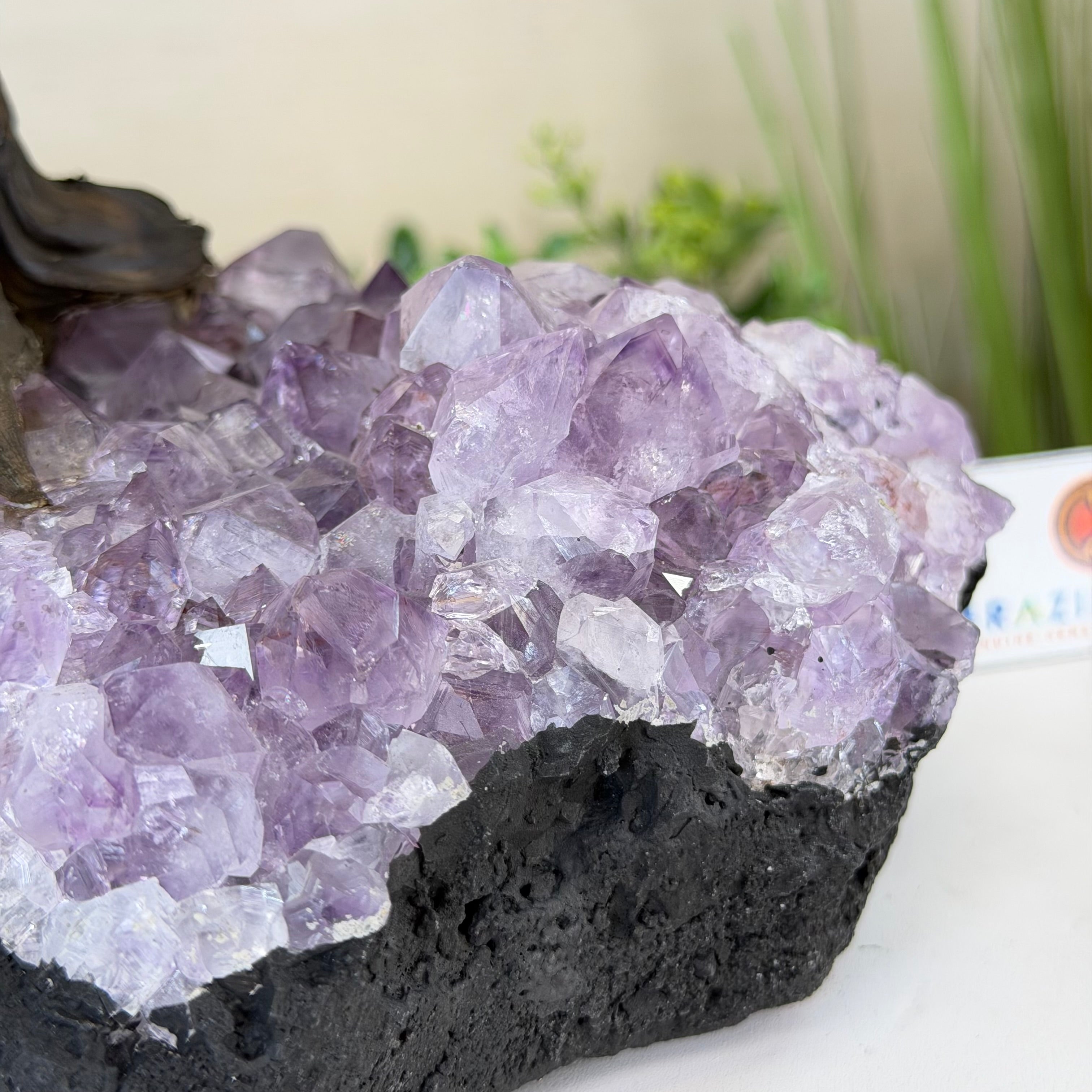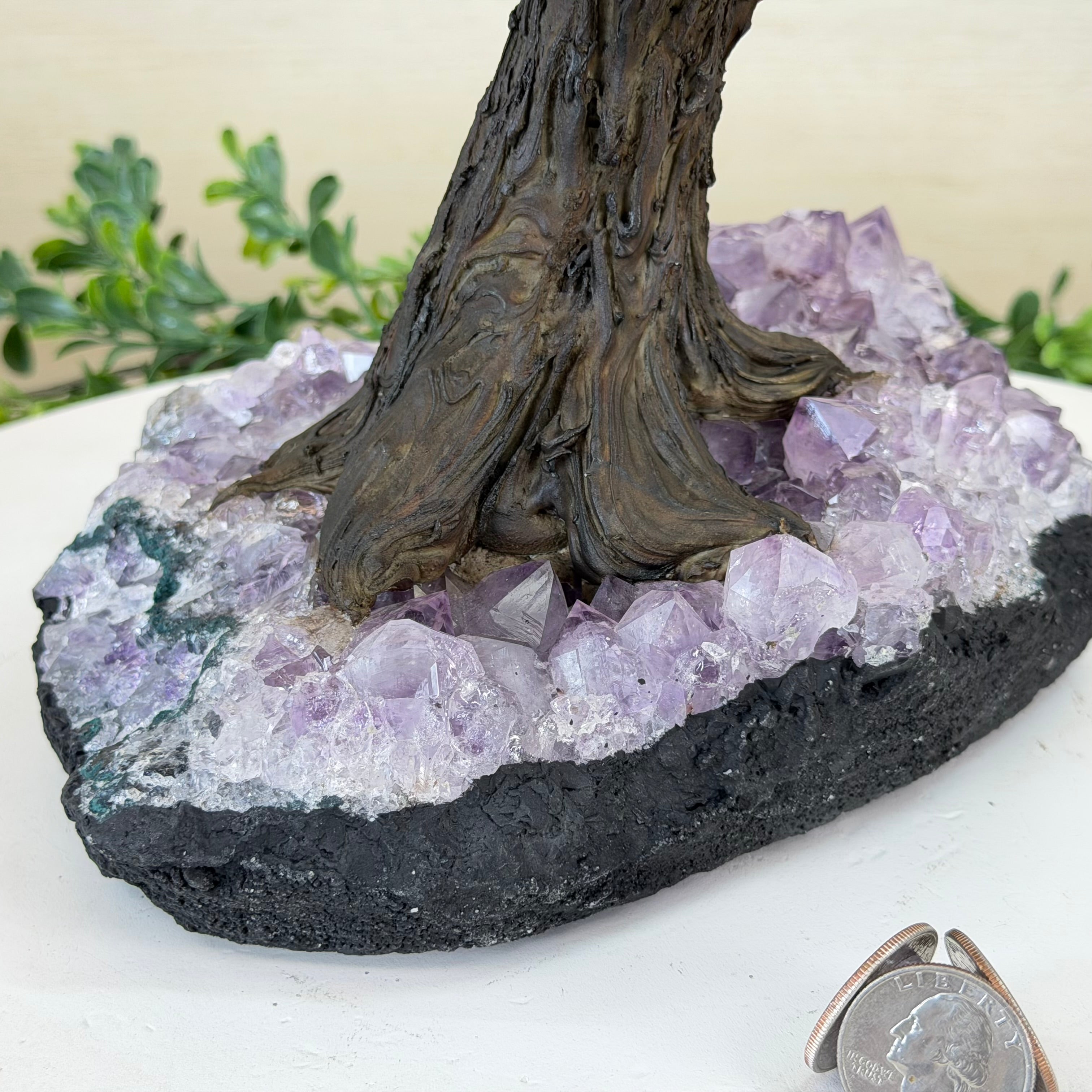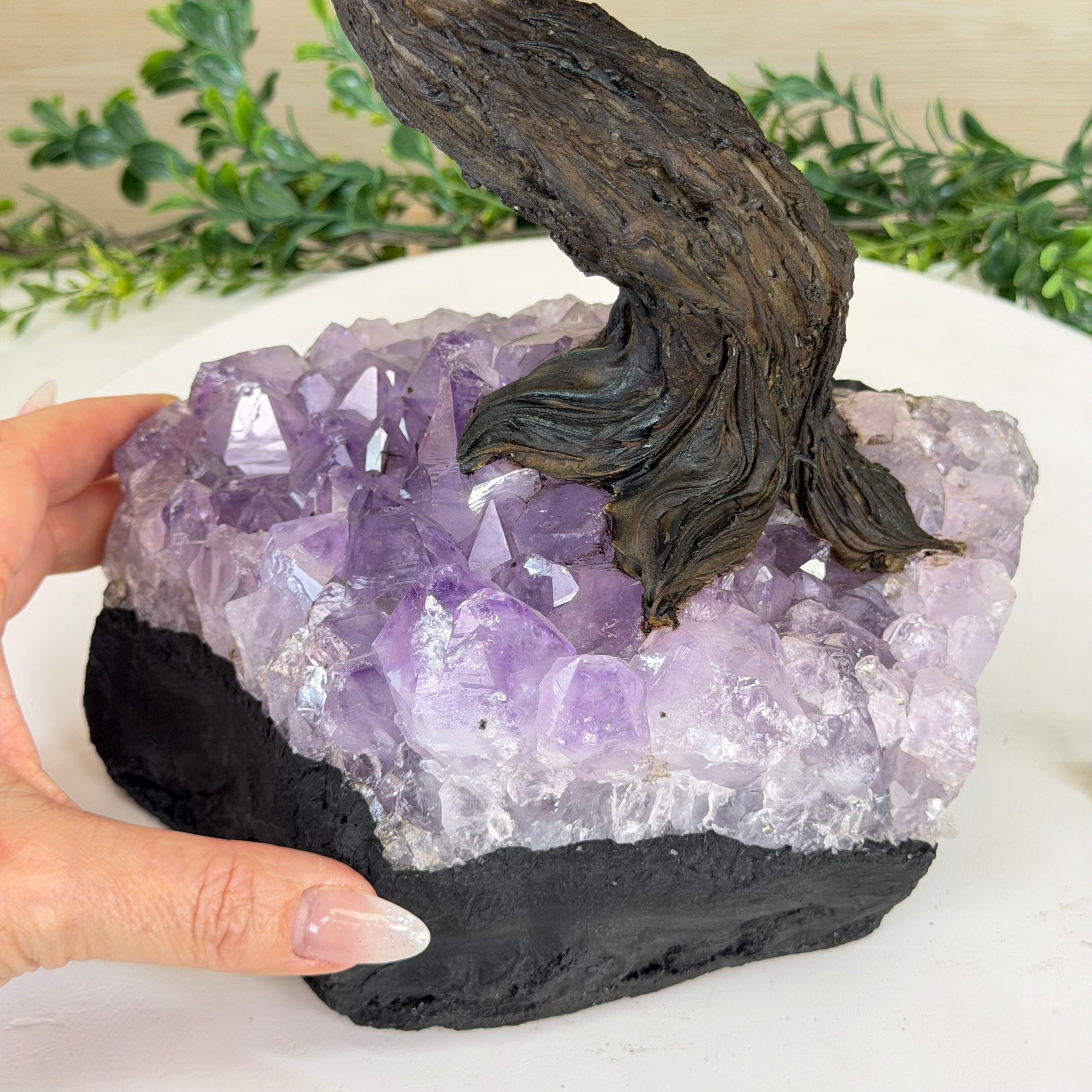 The process to make a gemstone tree like this is very extensive and meticulous. A special amethyst cluster is selected for the base, the resin trunk and branches are crafted by Brazilian artisans and then each gemstone is glued to the tree by hand. MADE IN BRAZIL!