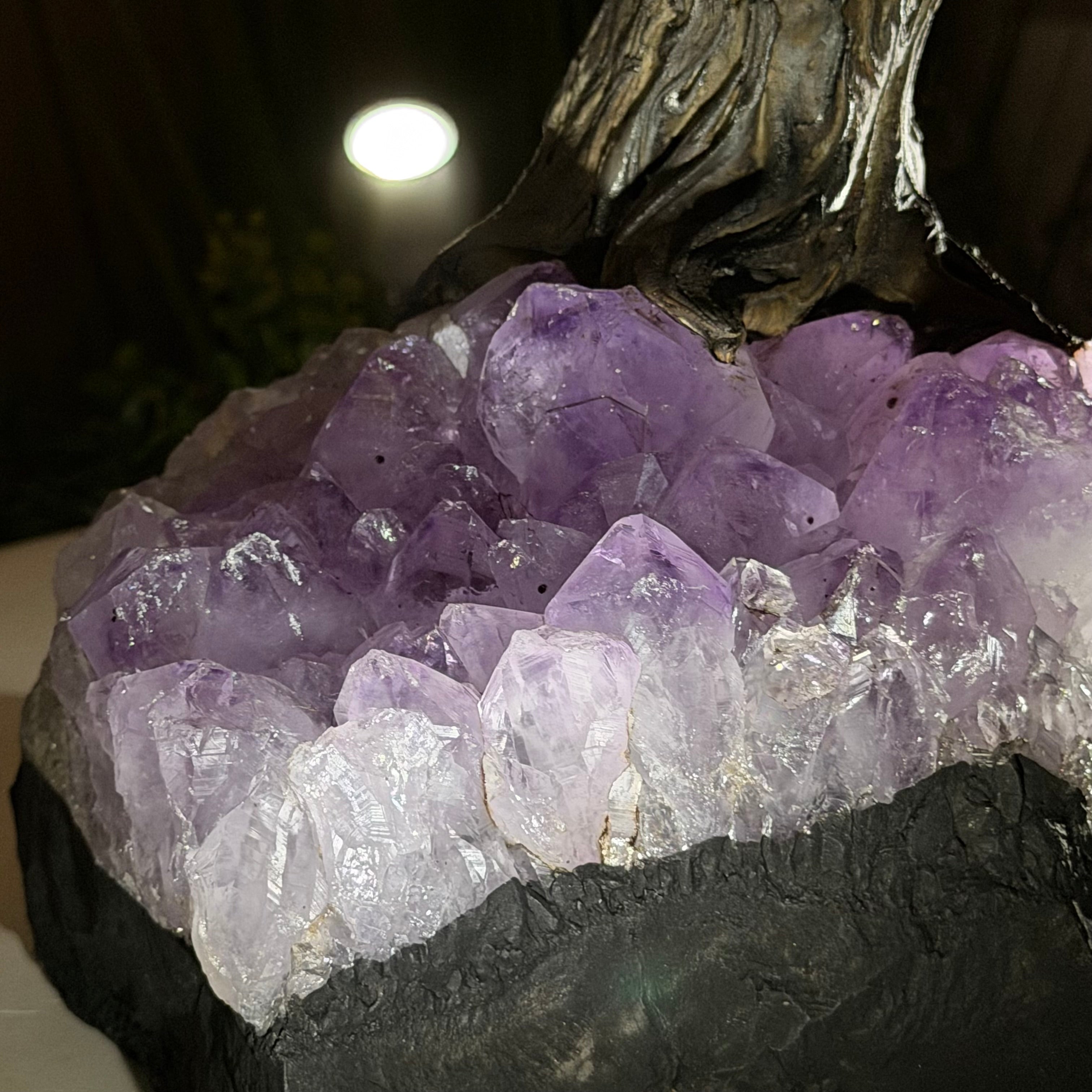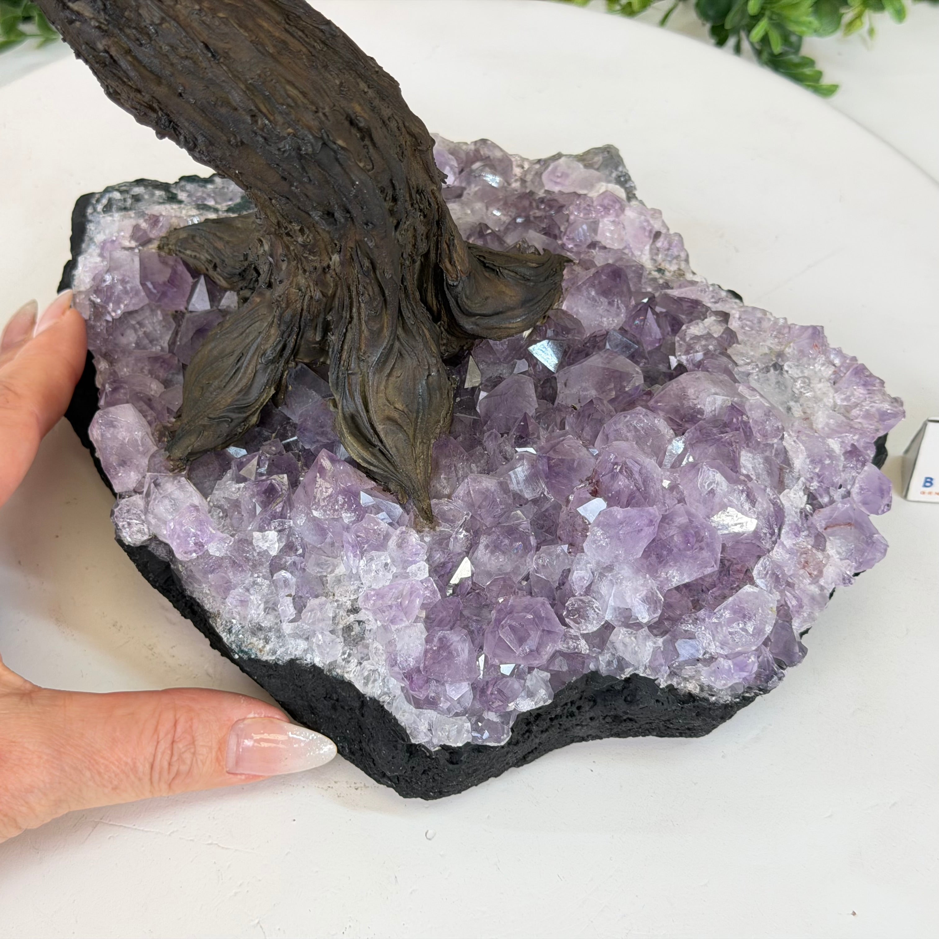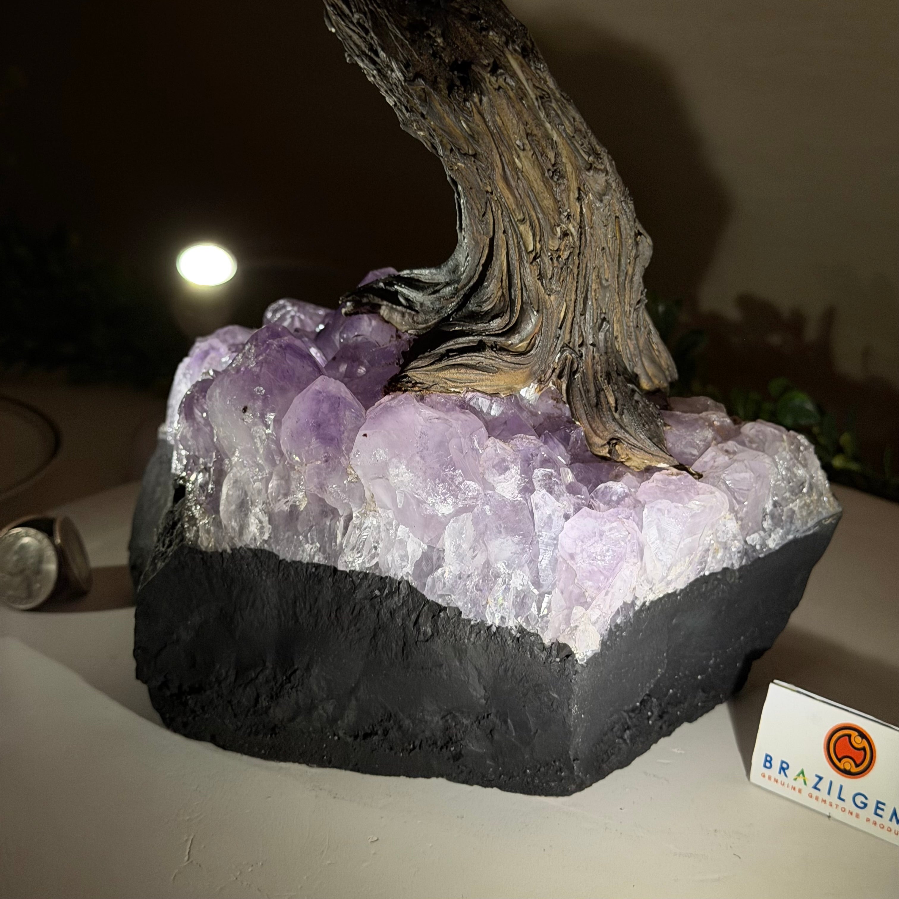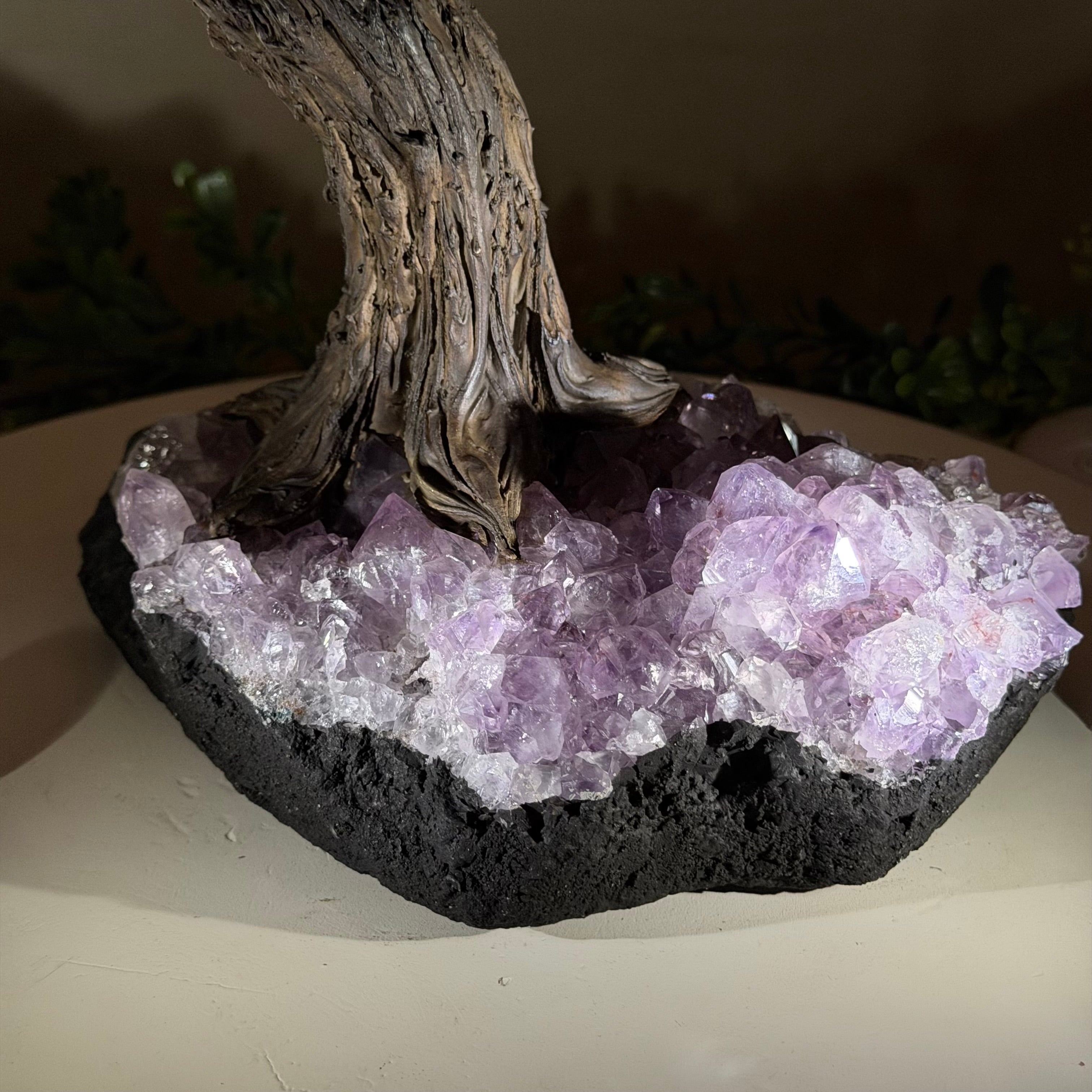 The process to make a gemstone tree like this is very extensive and meticulous. A special amethyst cluster is selected for the base, the resin trunk and branches are crafted by Brazilian artisans and then each gemstone is glued to the tree by hand. MADE IN BRAZIL!