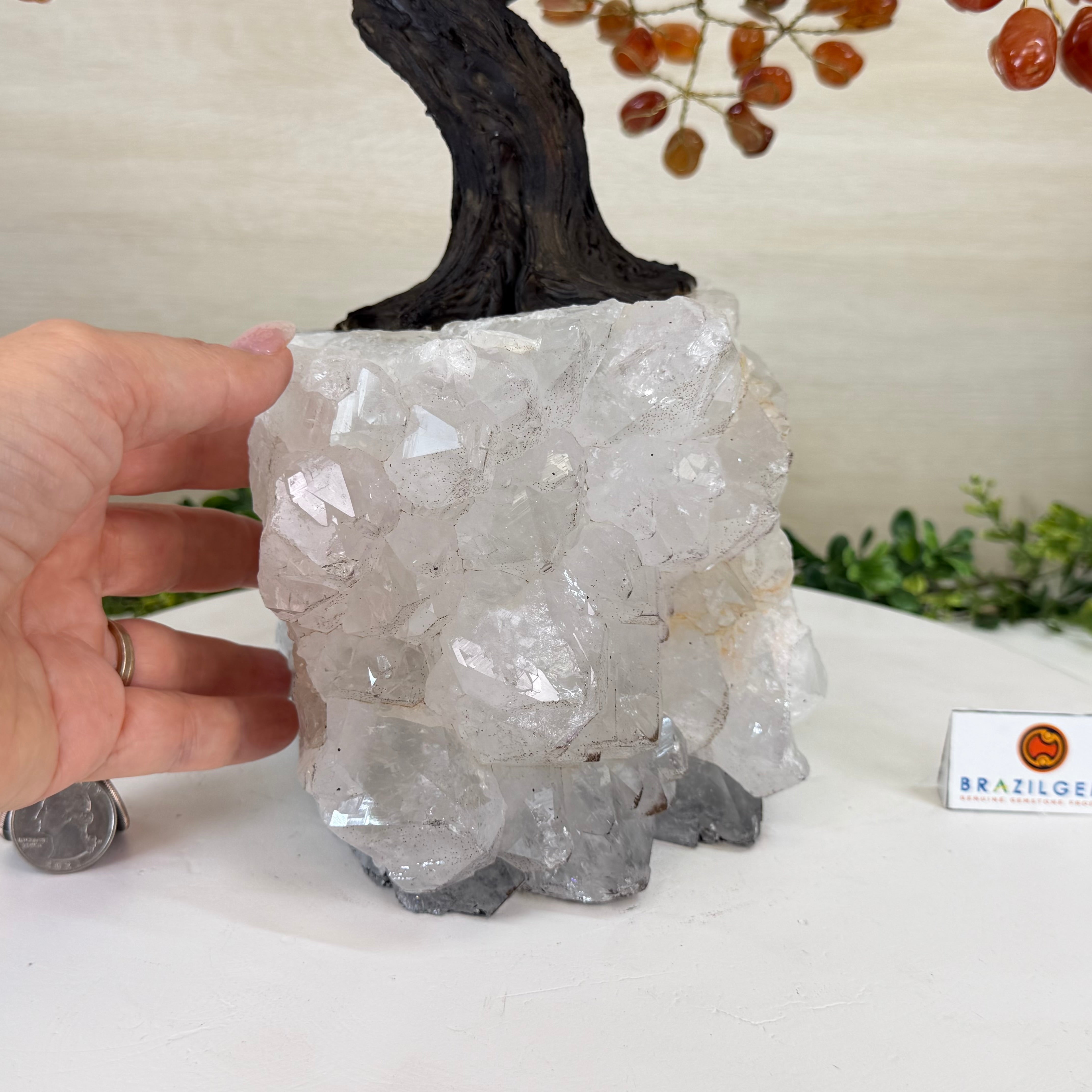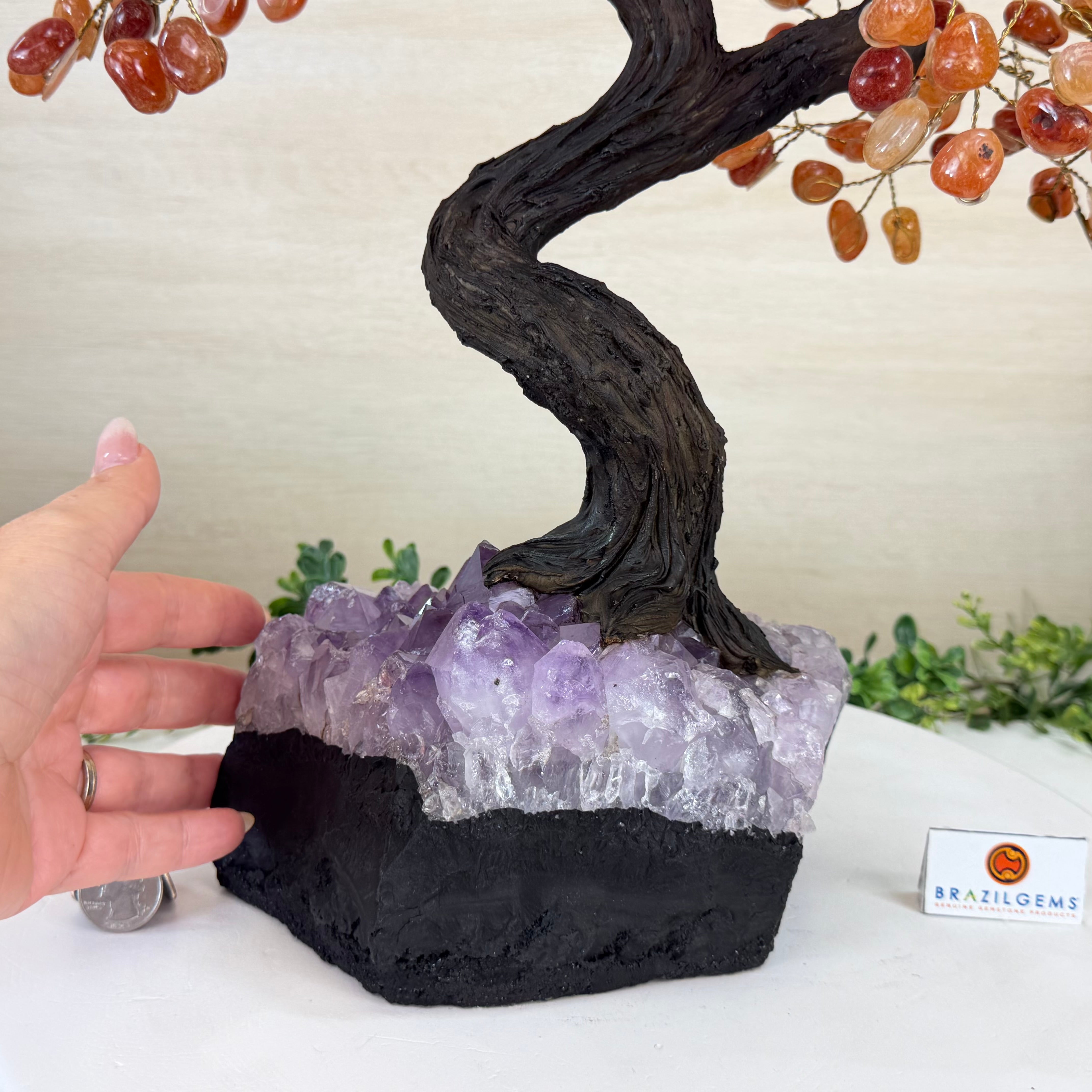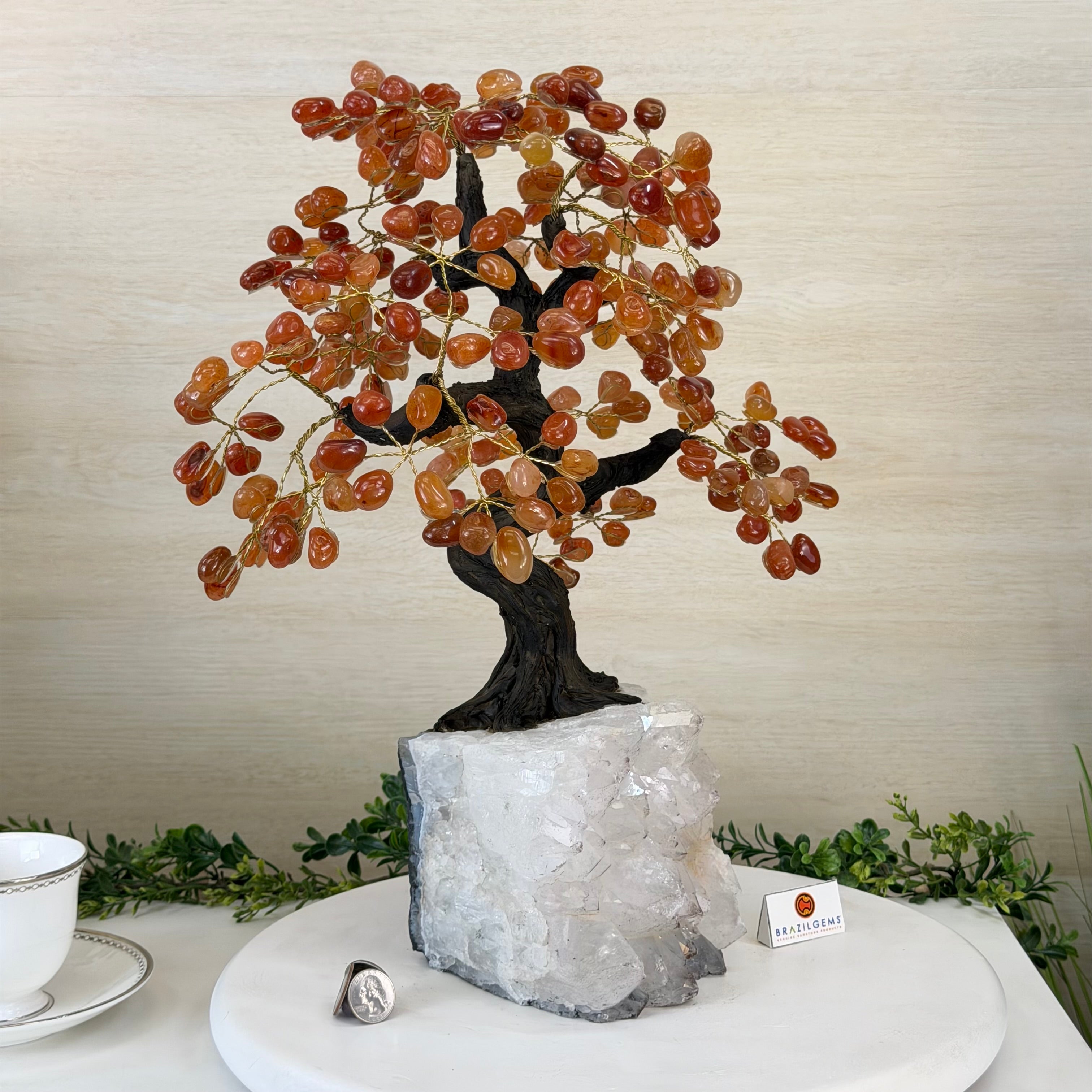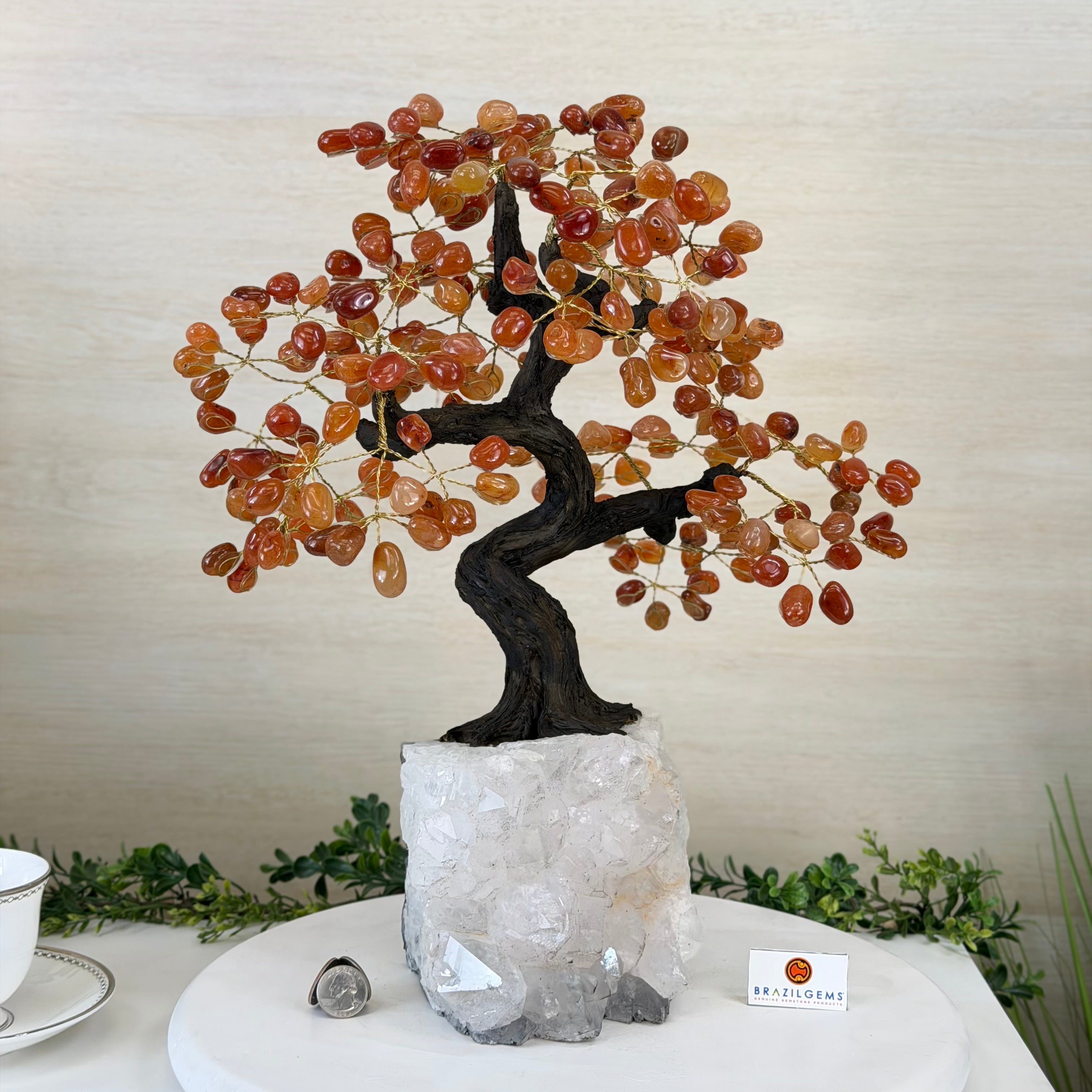 Brazil Gems® brings you Handmade Carnelian Gemstone trees with a crystal cluster base, resin trunk, wired branches and tumbled Carnelian gemstones.