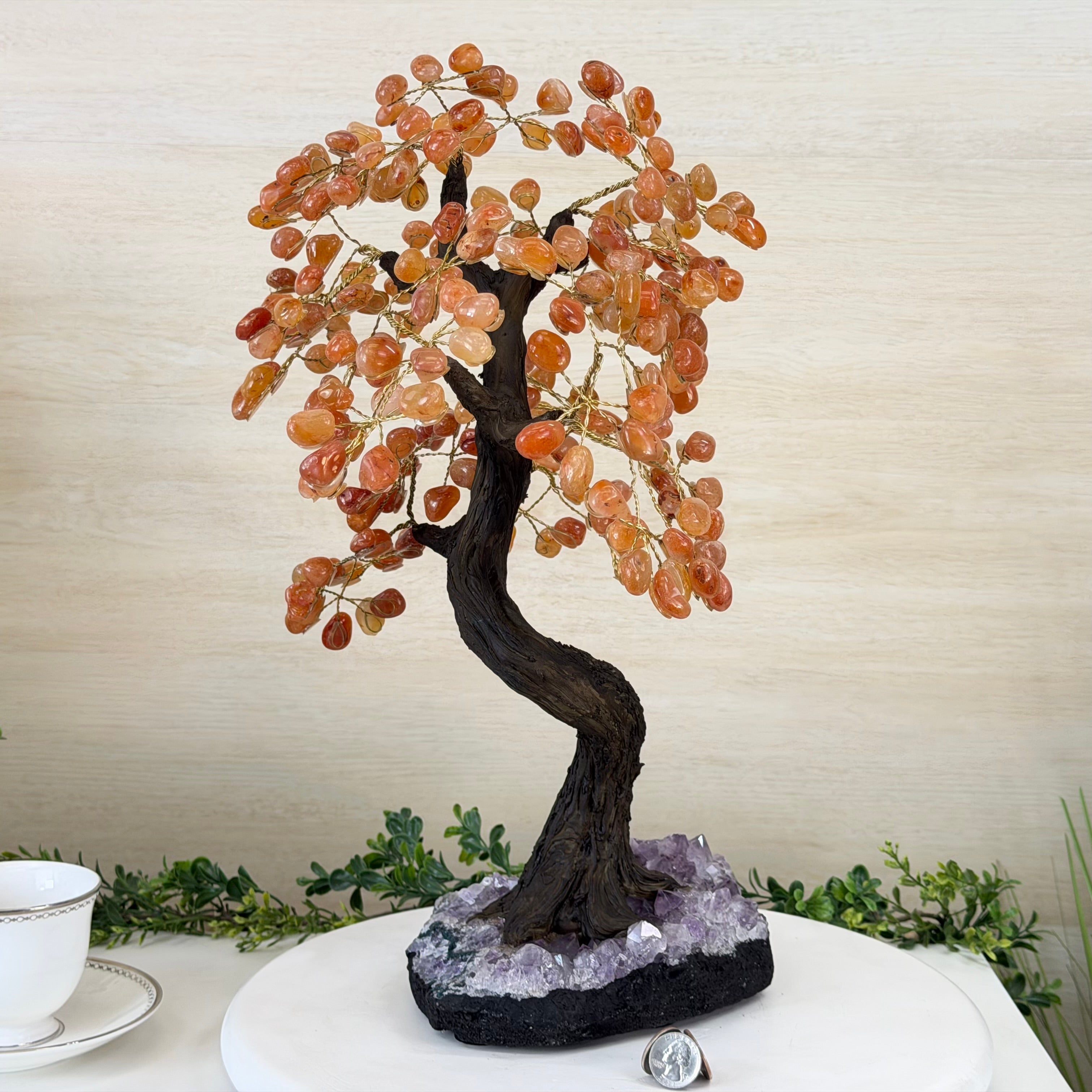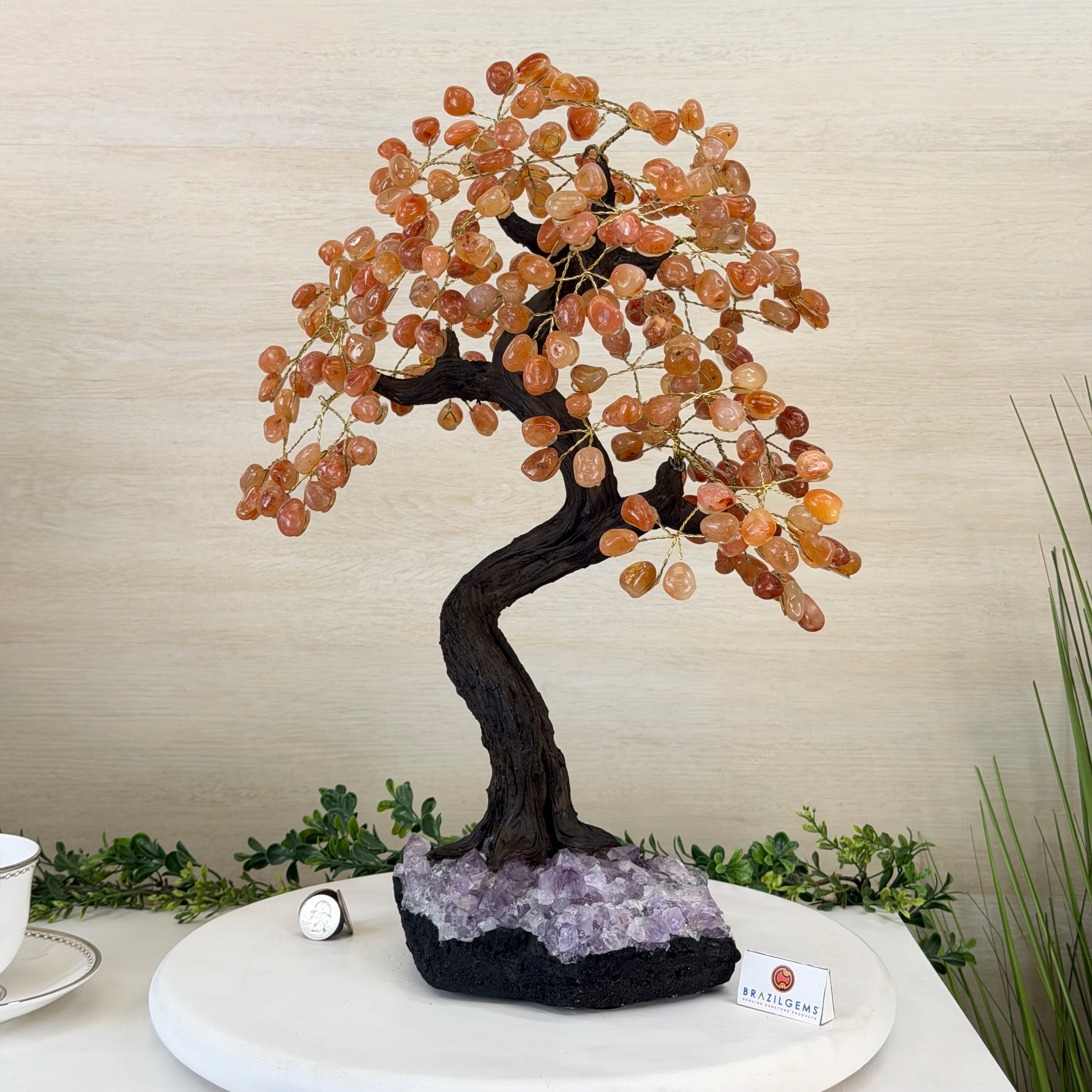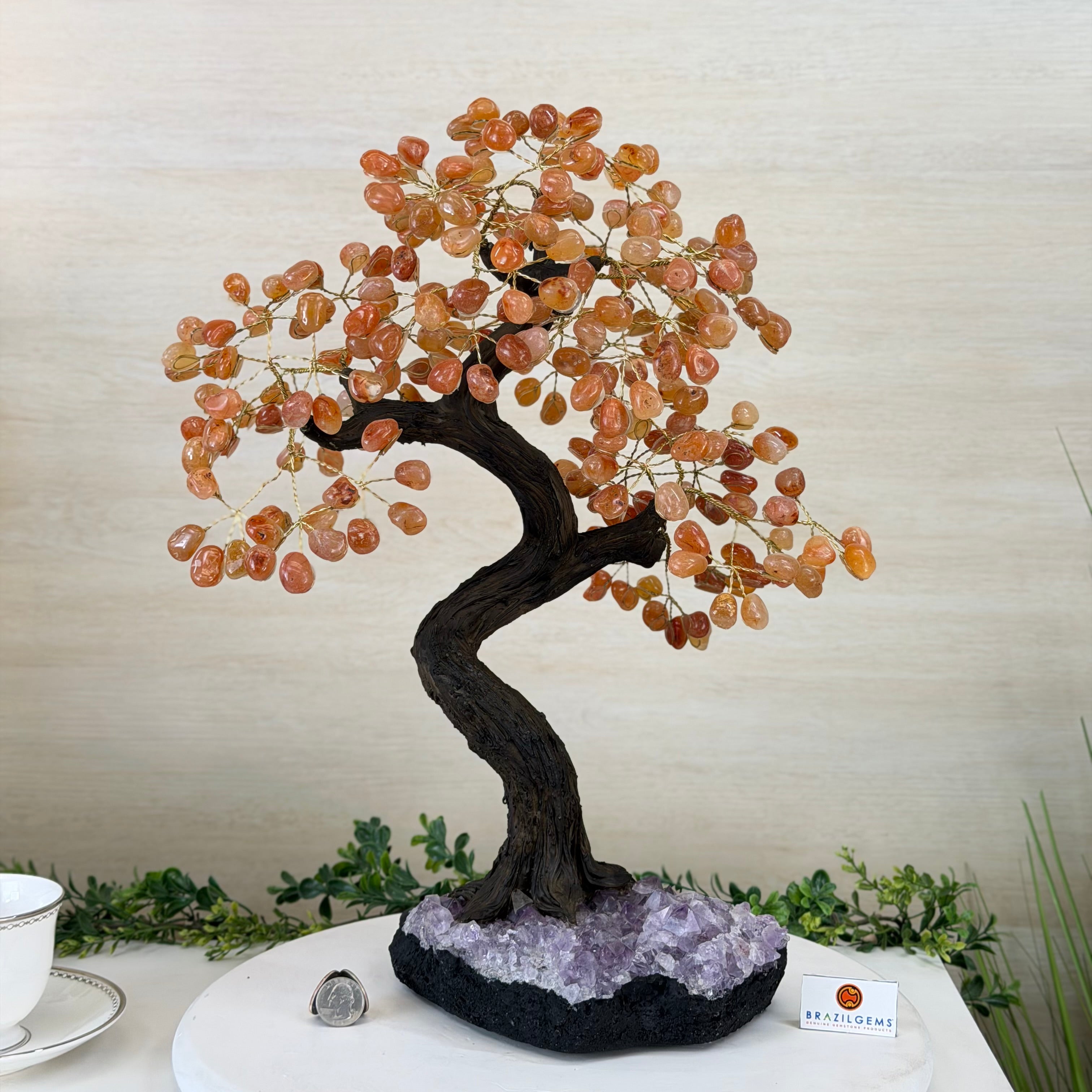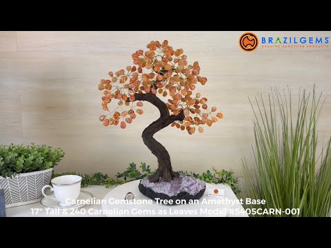 Carnelian Bonsai Gemstone Tree on an Amethyst Cluster Base Handcrafted in Brazil, this striking gemstone tree stands approximately 17" tall and features a sturdy bonsai-style trunk and branches adorned with 240 tumbled Carnelian gemstones as its leaves.