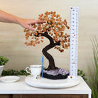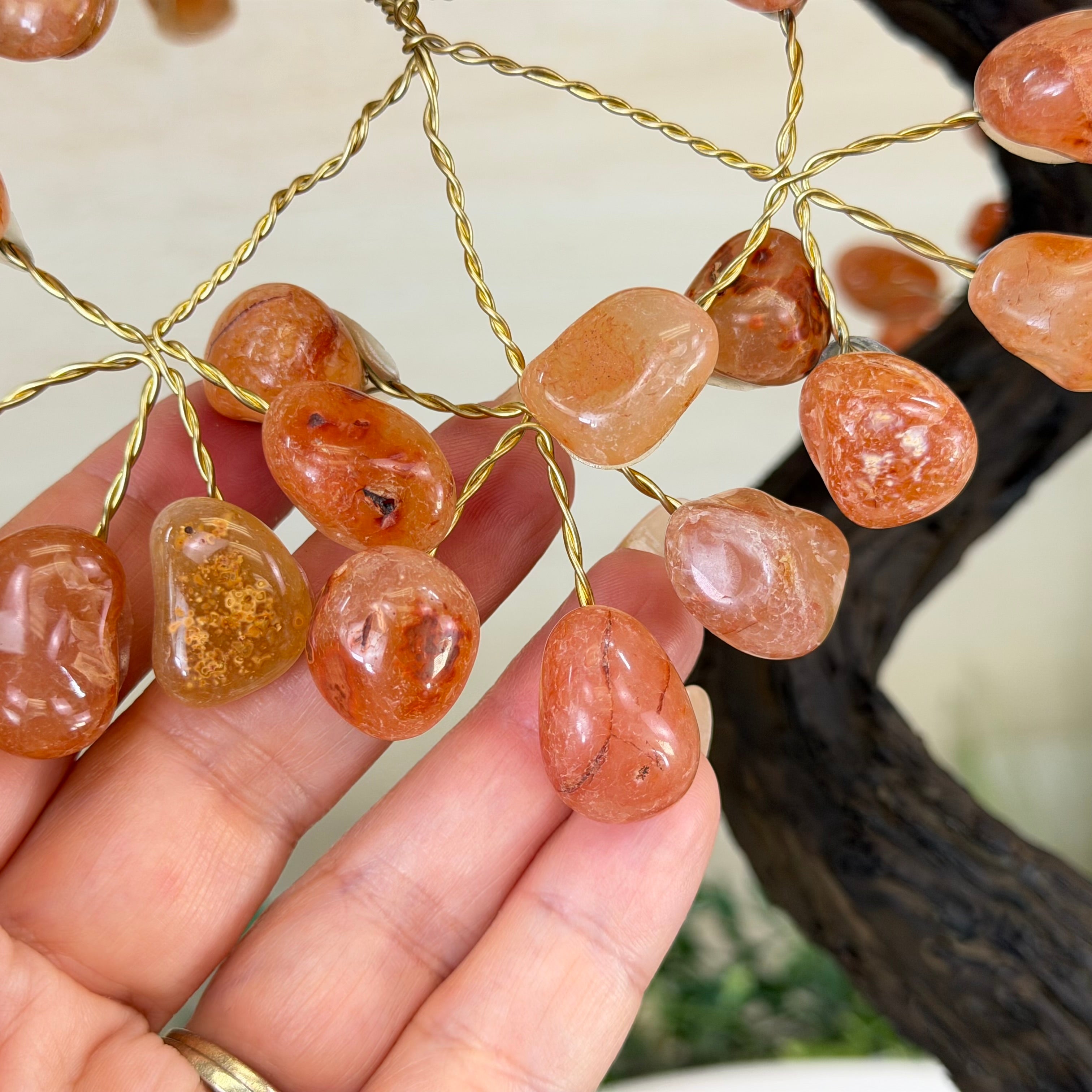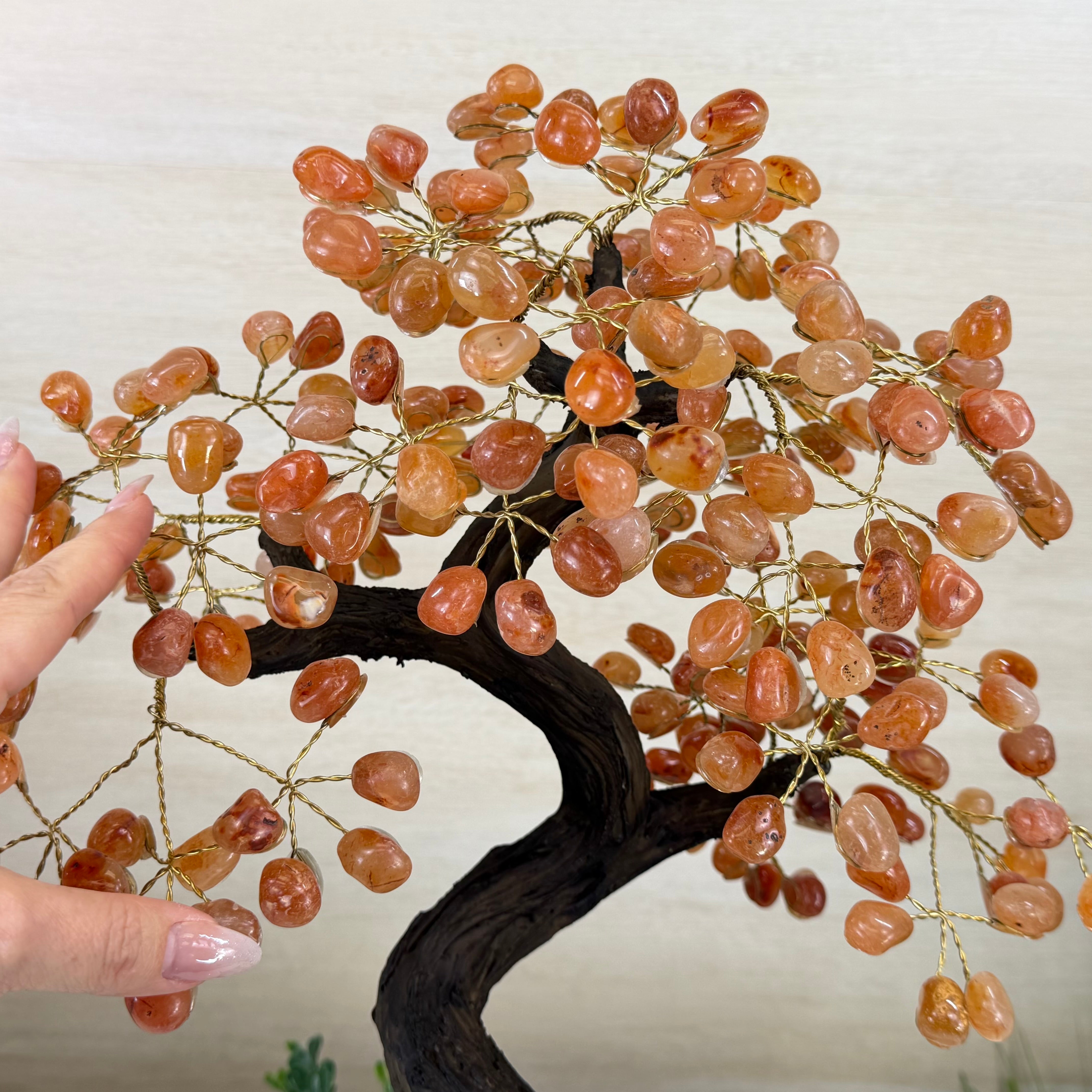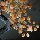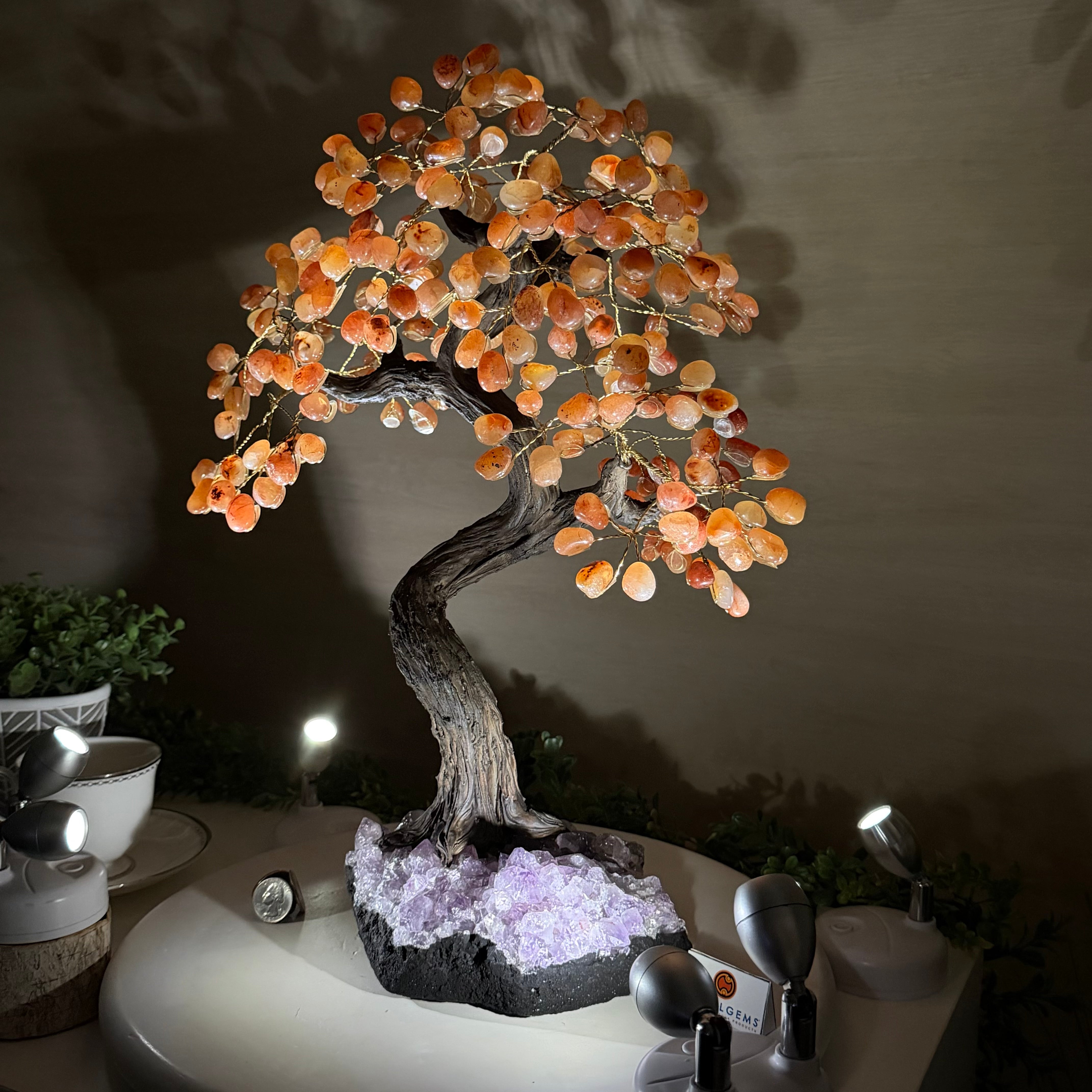 Carnelian Bonsai Gemstone Tree on an Amethyst Cluster Base Handcrafted in Brazil, this striking gemstone tree stands approximately 17" tall and features a sturdy bonsai-style trunk and branches adorned with 240 tumbled Carnelian gemstones as its leaves.