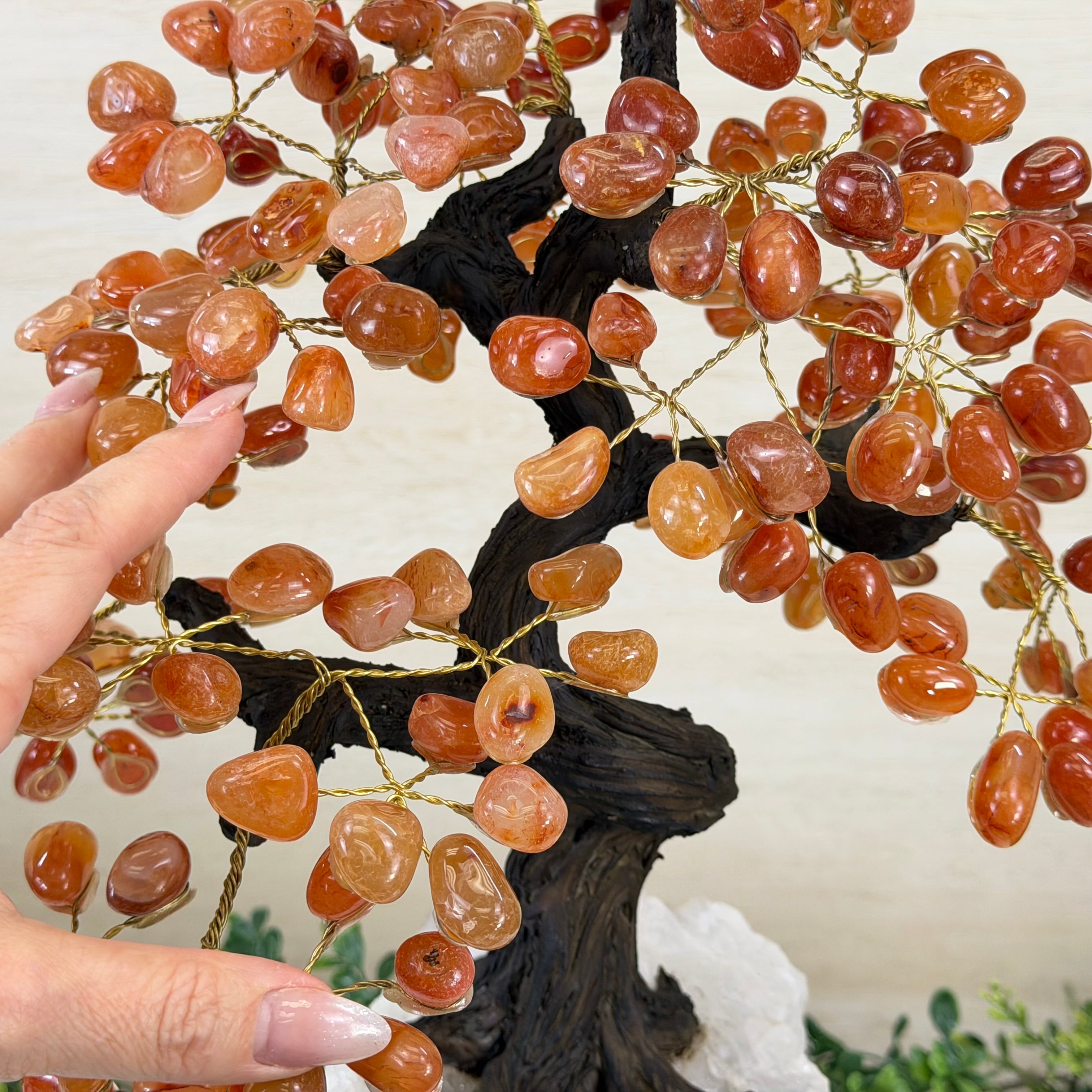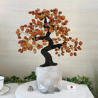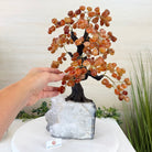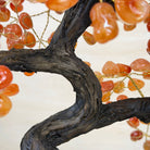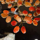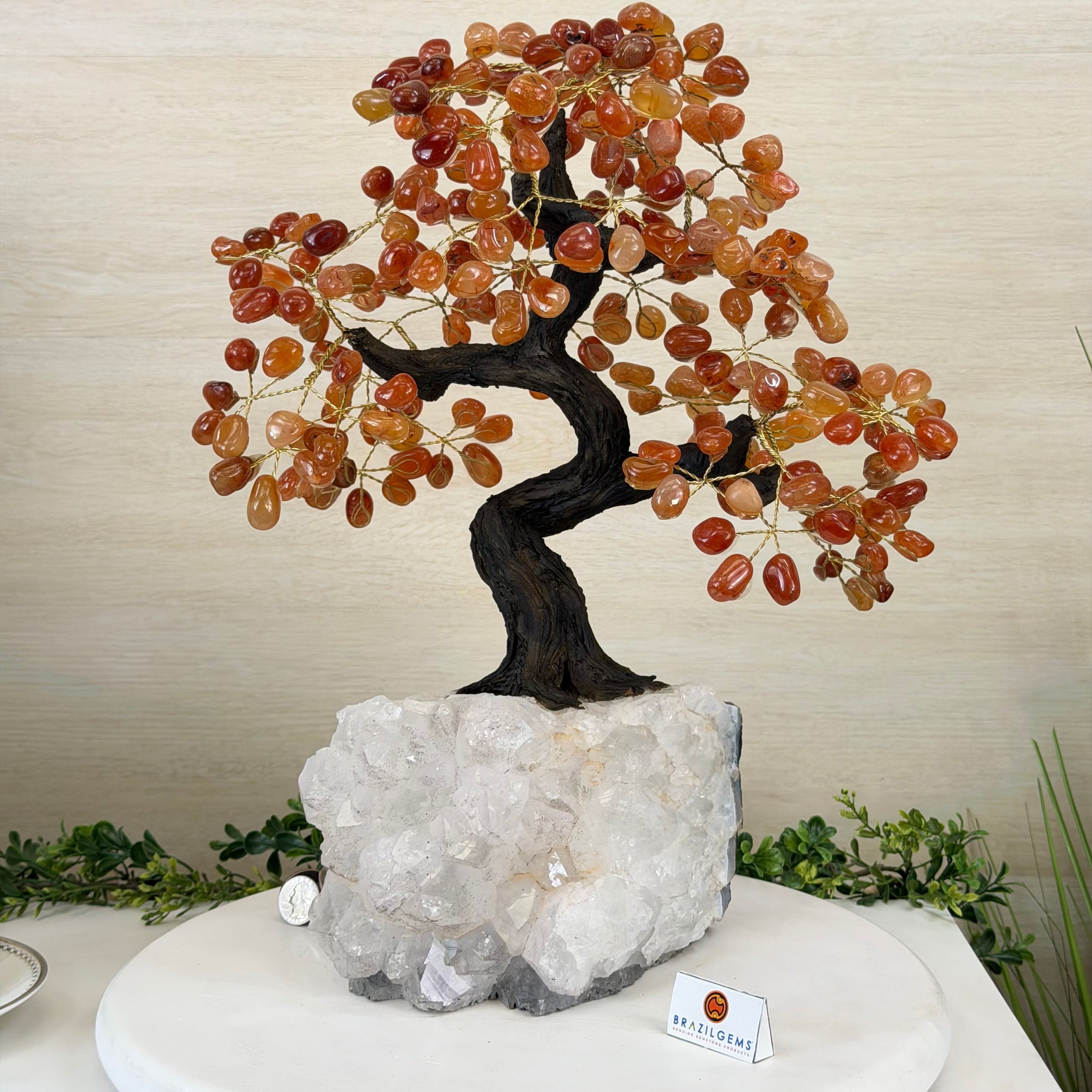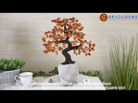 Carnelian Bonsai Gemstone Tree on an Amethyst Cluster Base Handcrafted in Brazil, this striking gemstone tree stands approximately 17" tall and features a sturdy bonsai-style trunk and branches adorned with 240 tumbled Carnelian gemstones as its leaves.