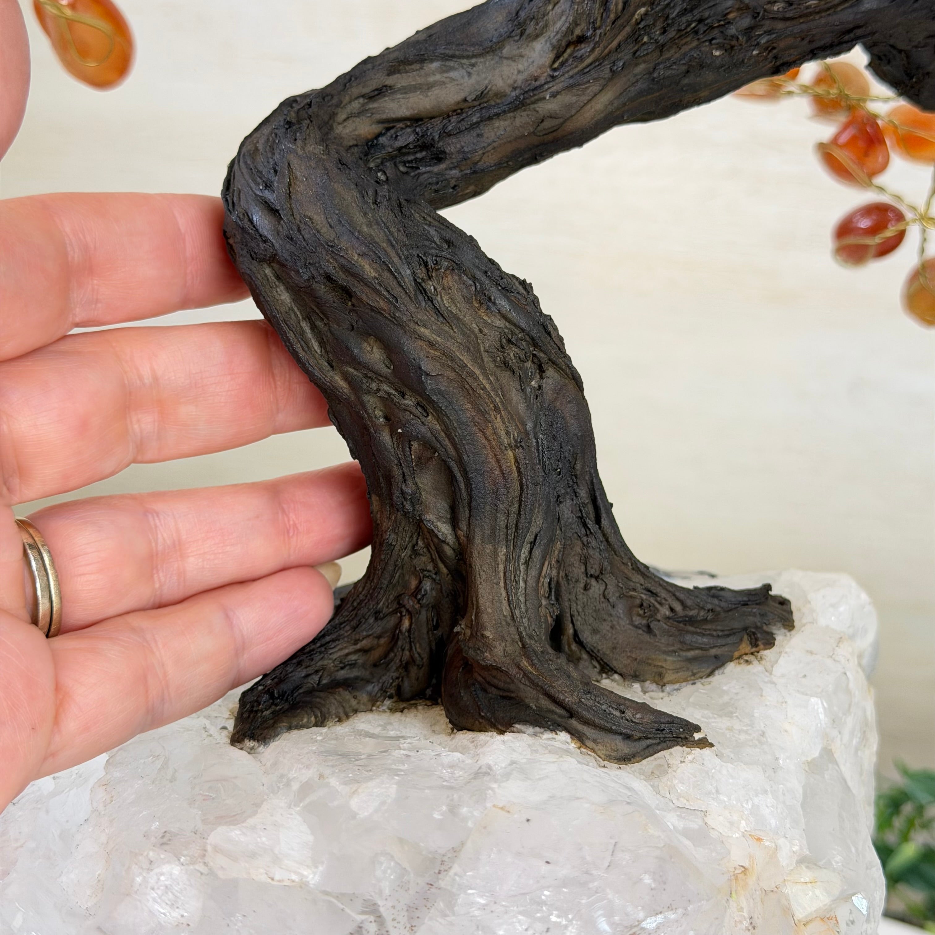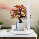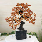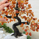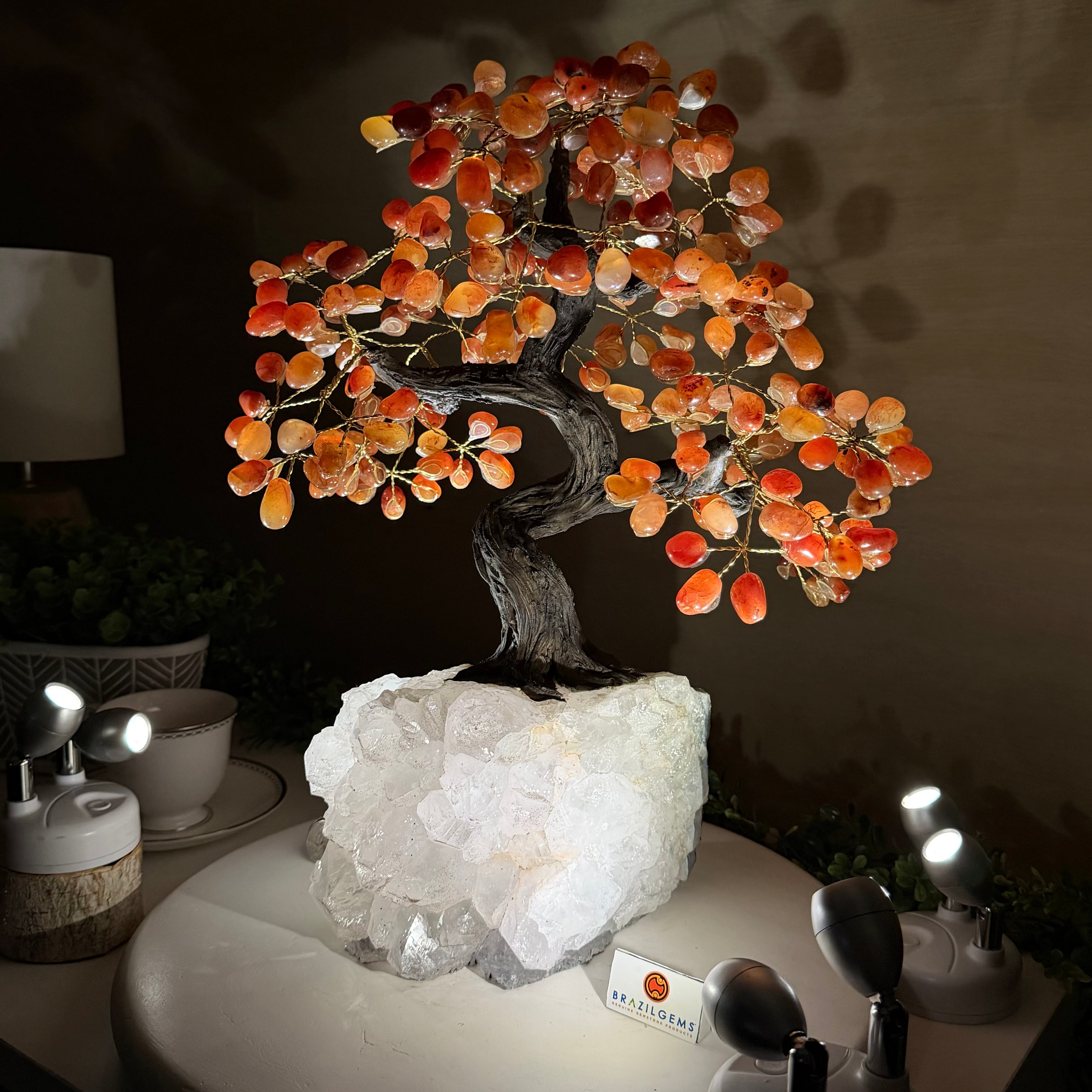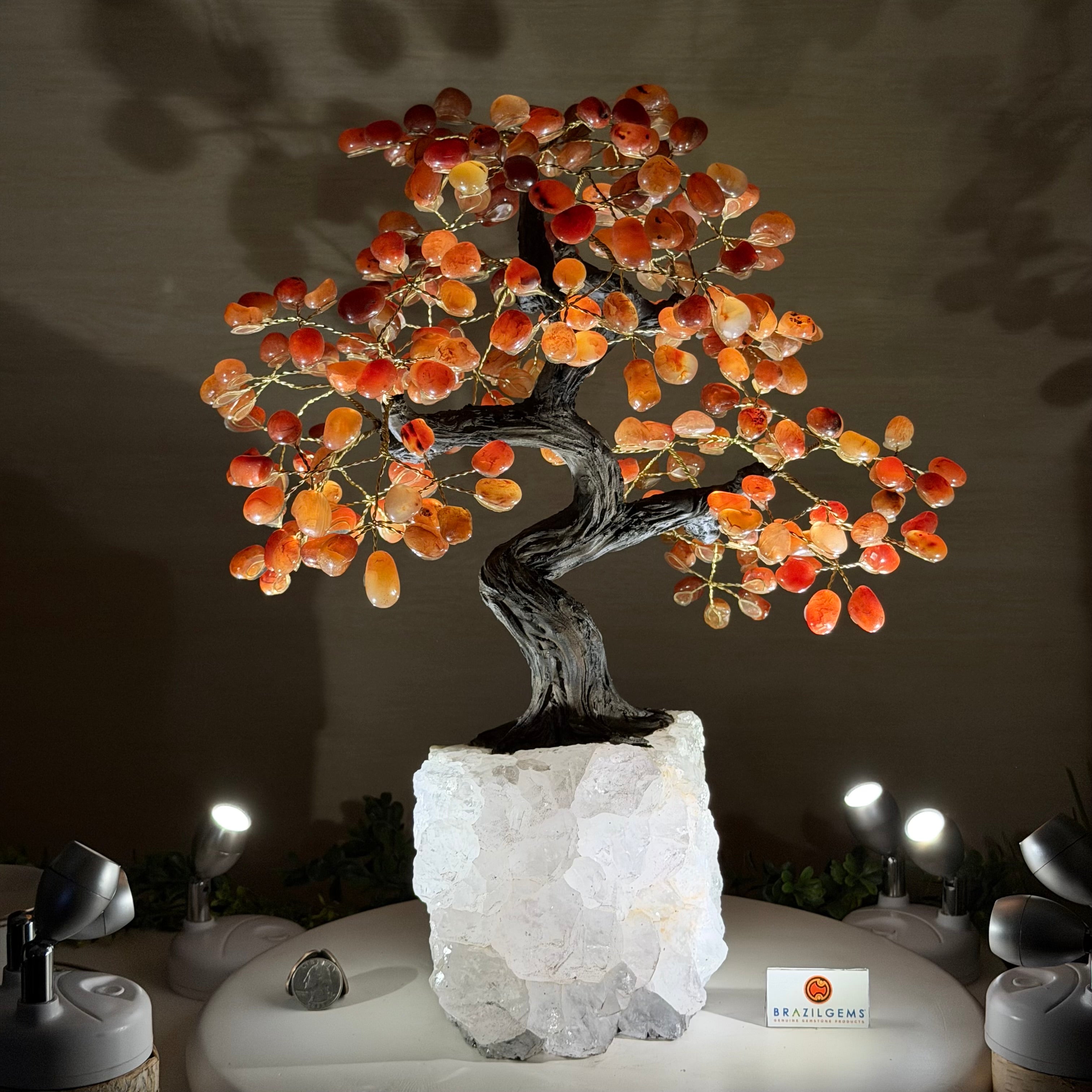 Carnelian Bonsai Gemstone Tree on an Amethyst Cluster Base Handcrafted in Brazil, this striking gemstone tree stands approximately 17" tall and features a sturdy bonsai-style trunk and branches adorned with 240 tumbled Carnelian gemstones as its leaves.