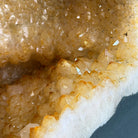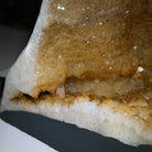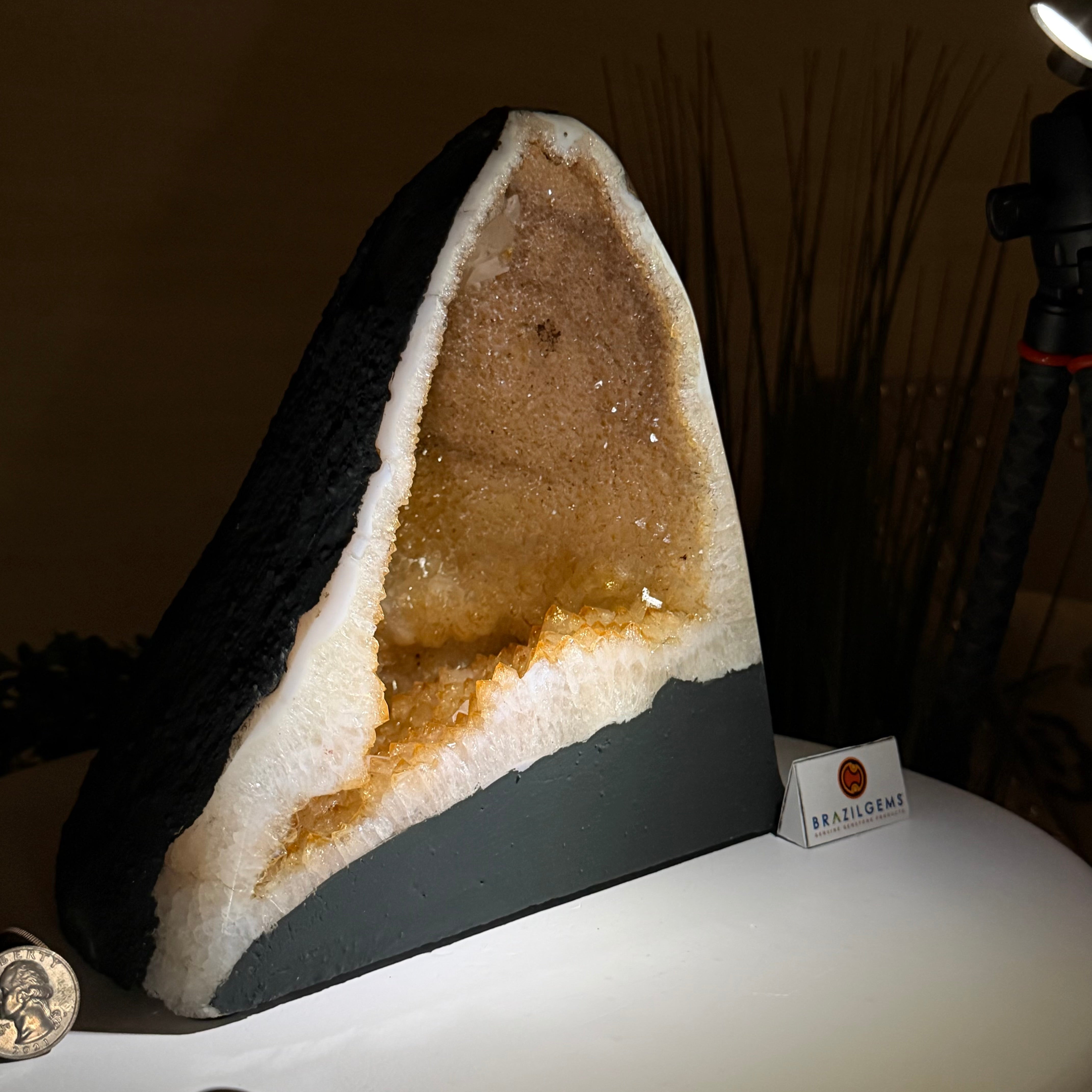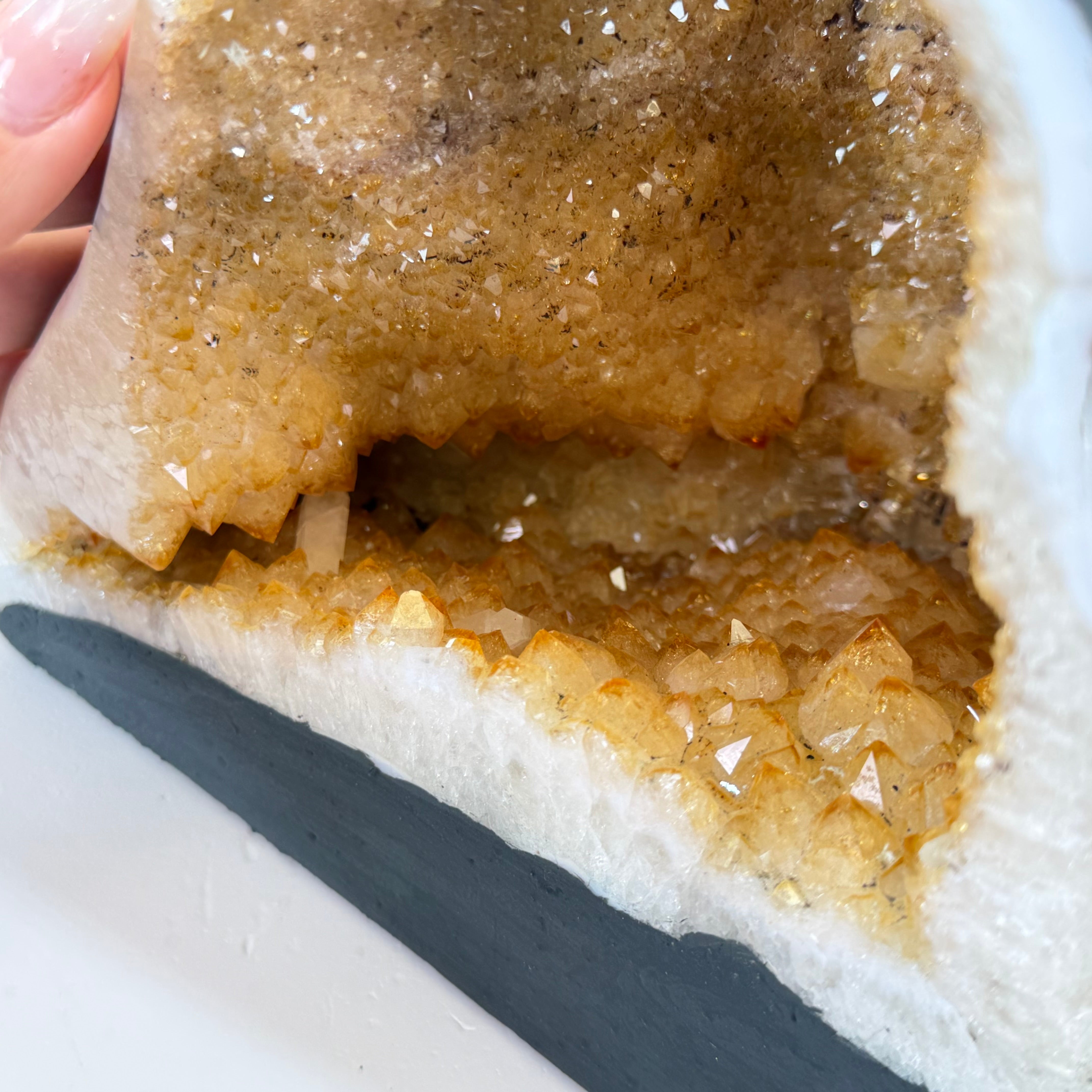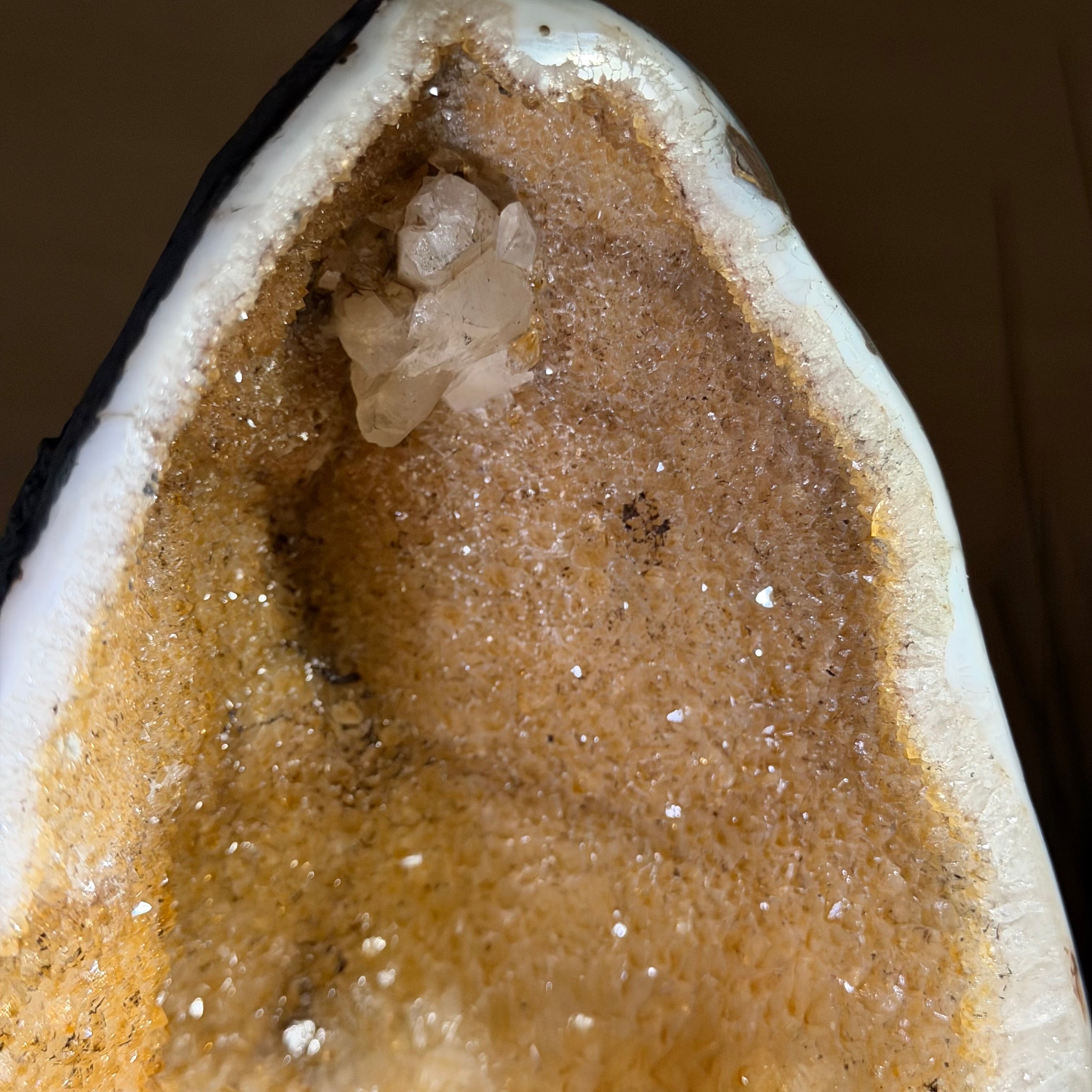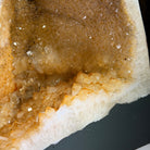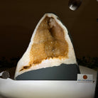 This impressive Extra Quality Brazilian Citrine Cathedral Geode, features radiant golden-amber crystals will enhance your favorite space. This geode displays sparkling citrine points and distinctive white crystal bands along the outer edges, creating a dramatic natural contrast.