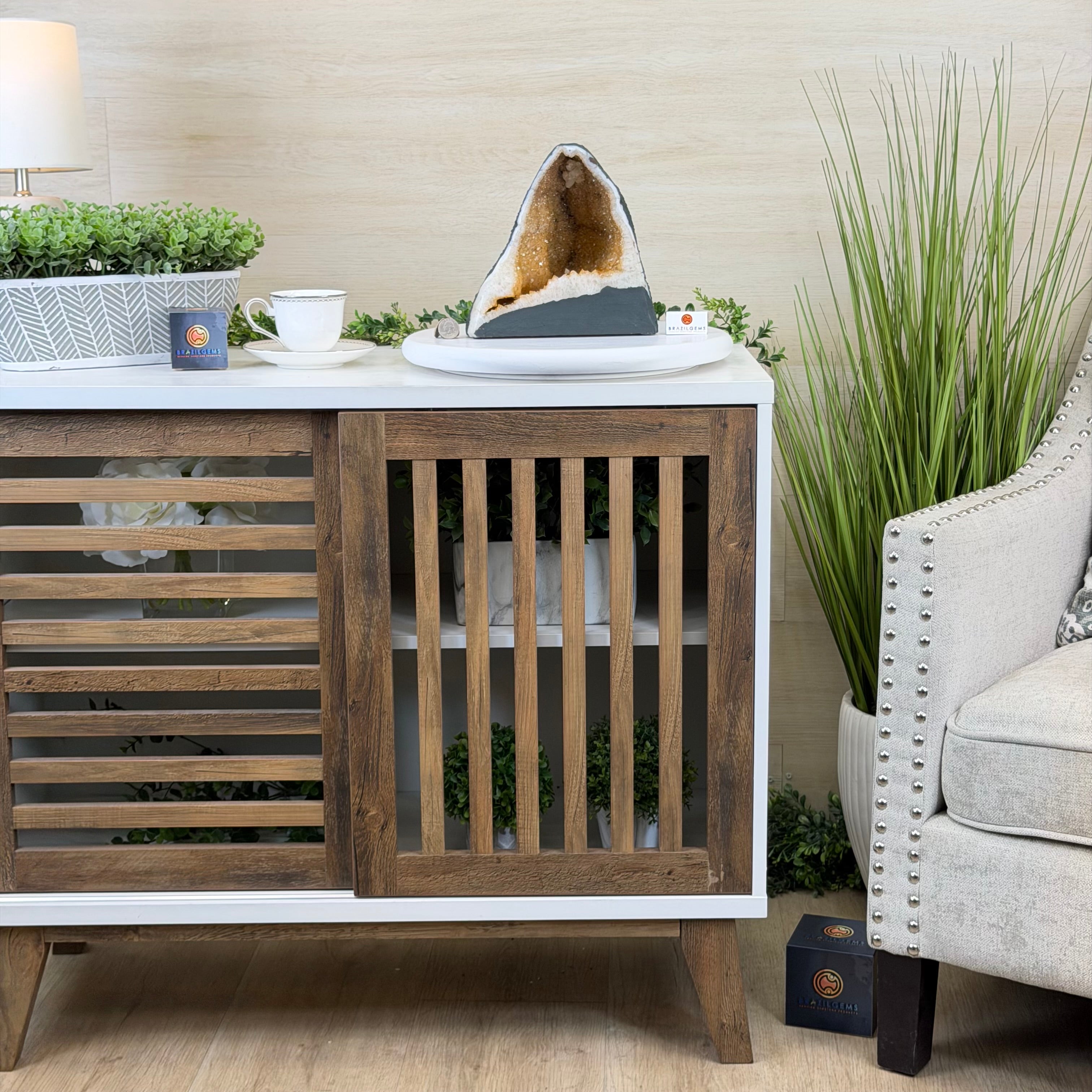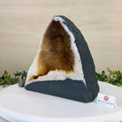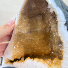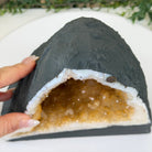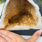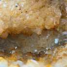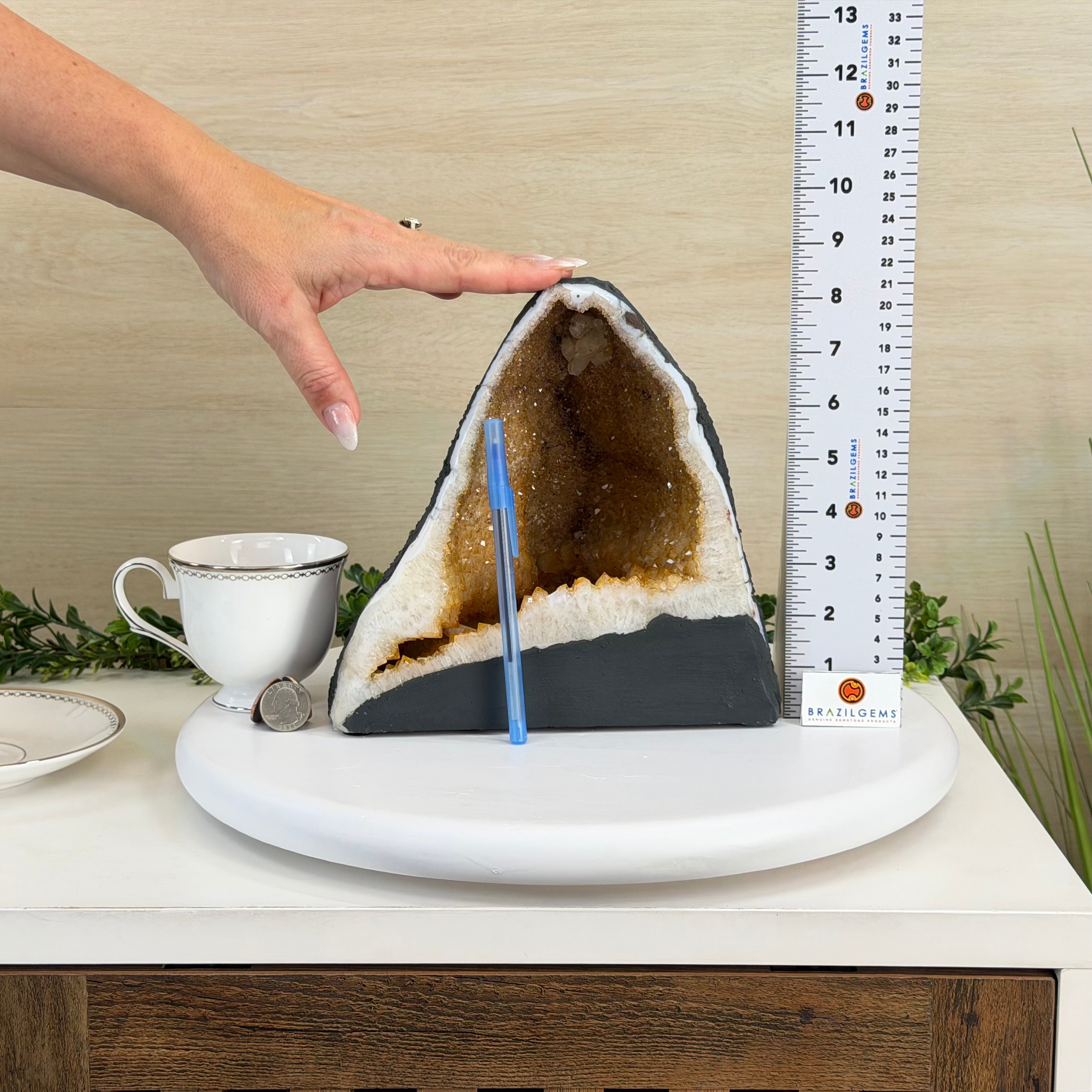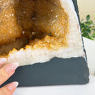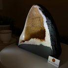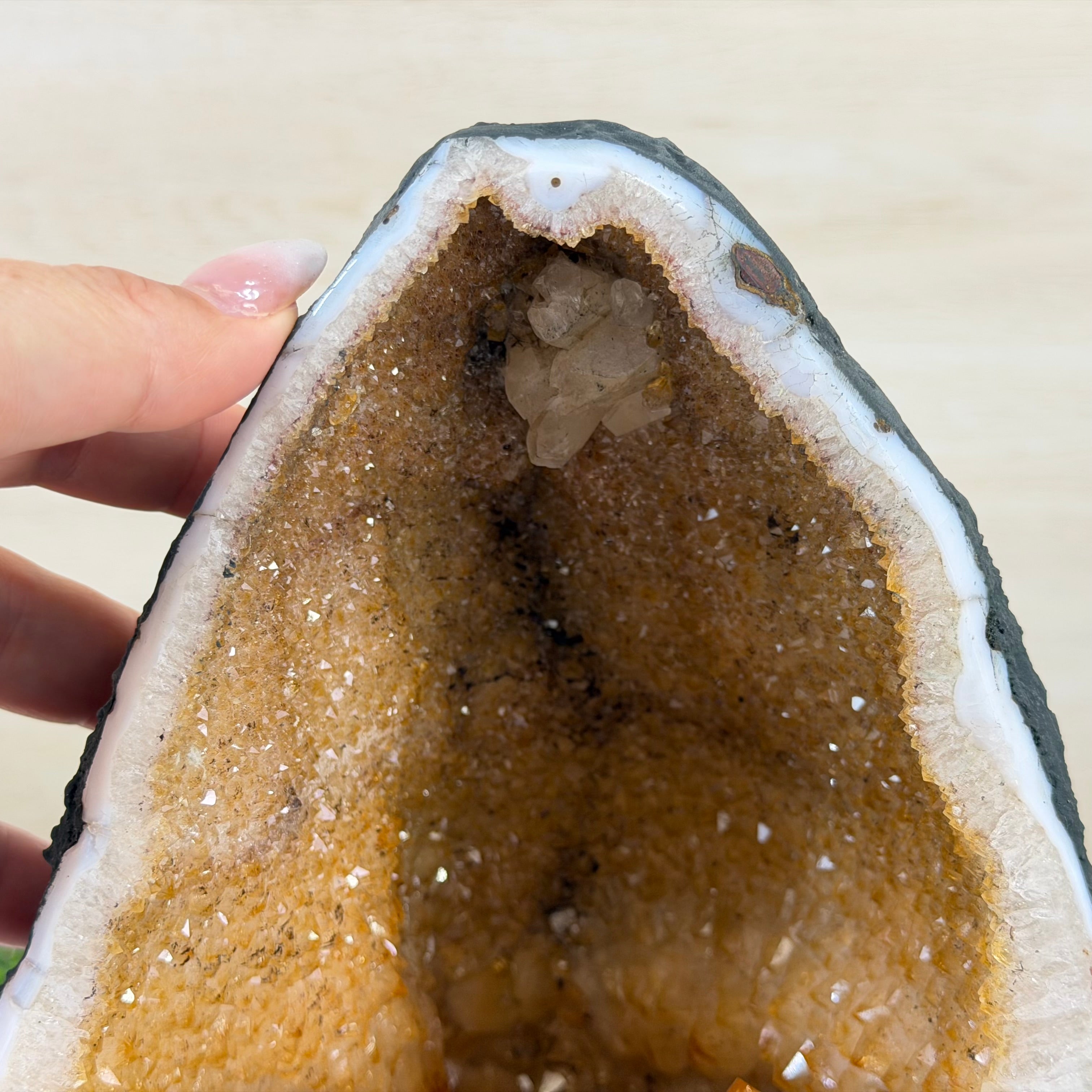 This impressive Extra Quality Brazilian Citrine Cathedral Geode, features radiant golden-amber crystals will enhance your favorite space. This geode displays sparkling citrine points and distinctive white crystal bands along the outer edges, creating a dramatic natural contrast.