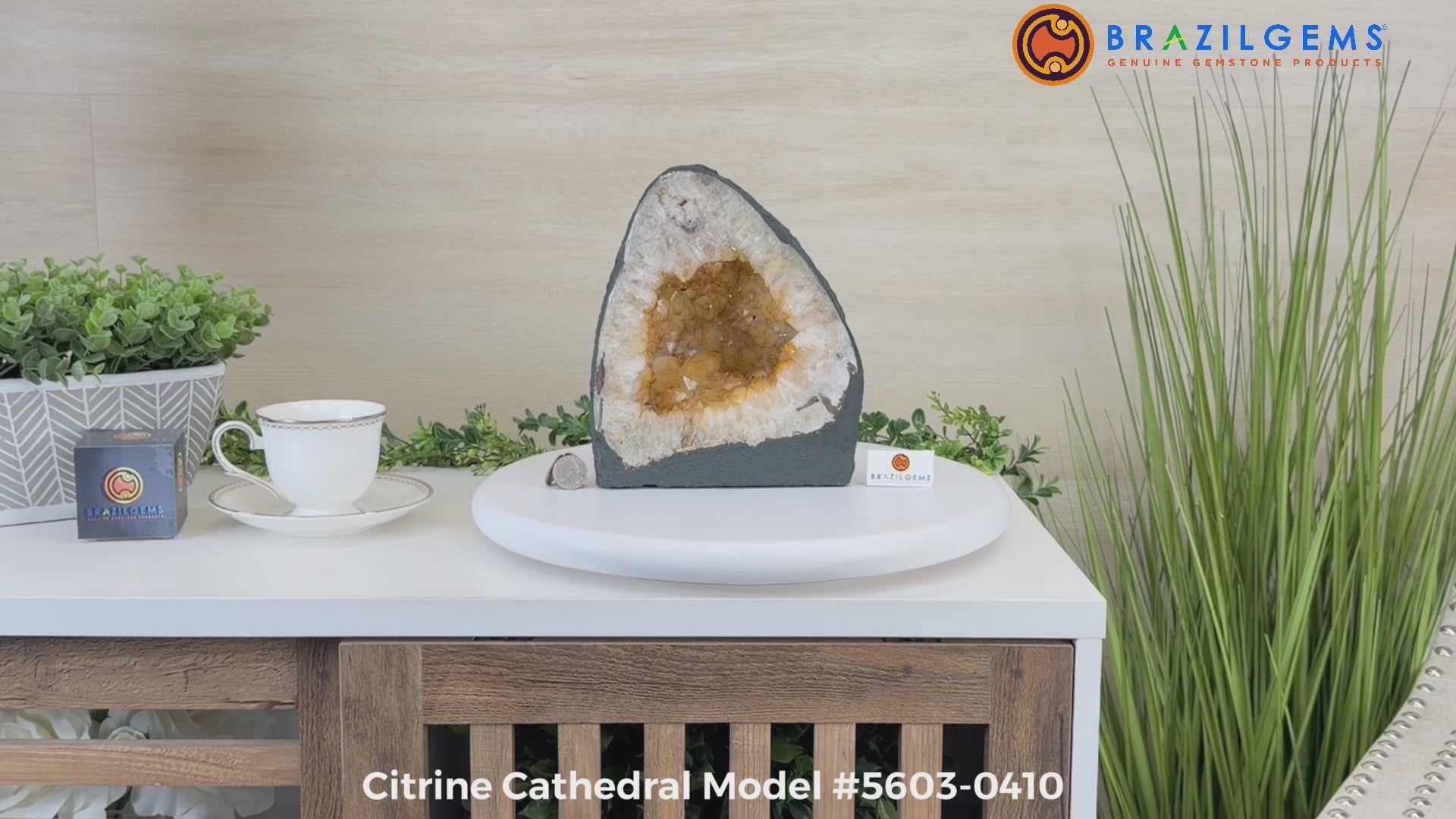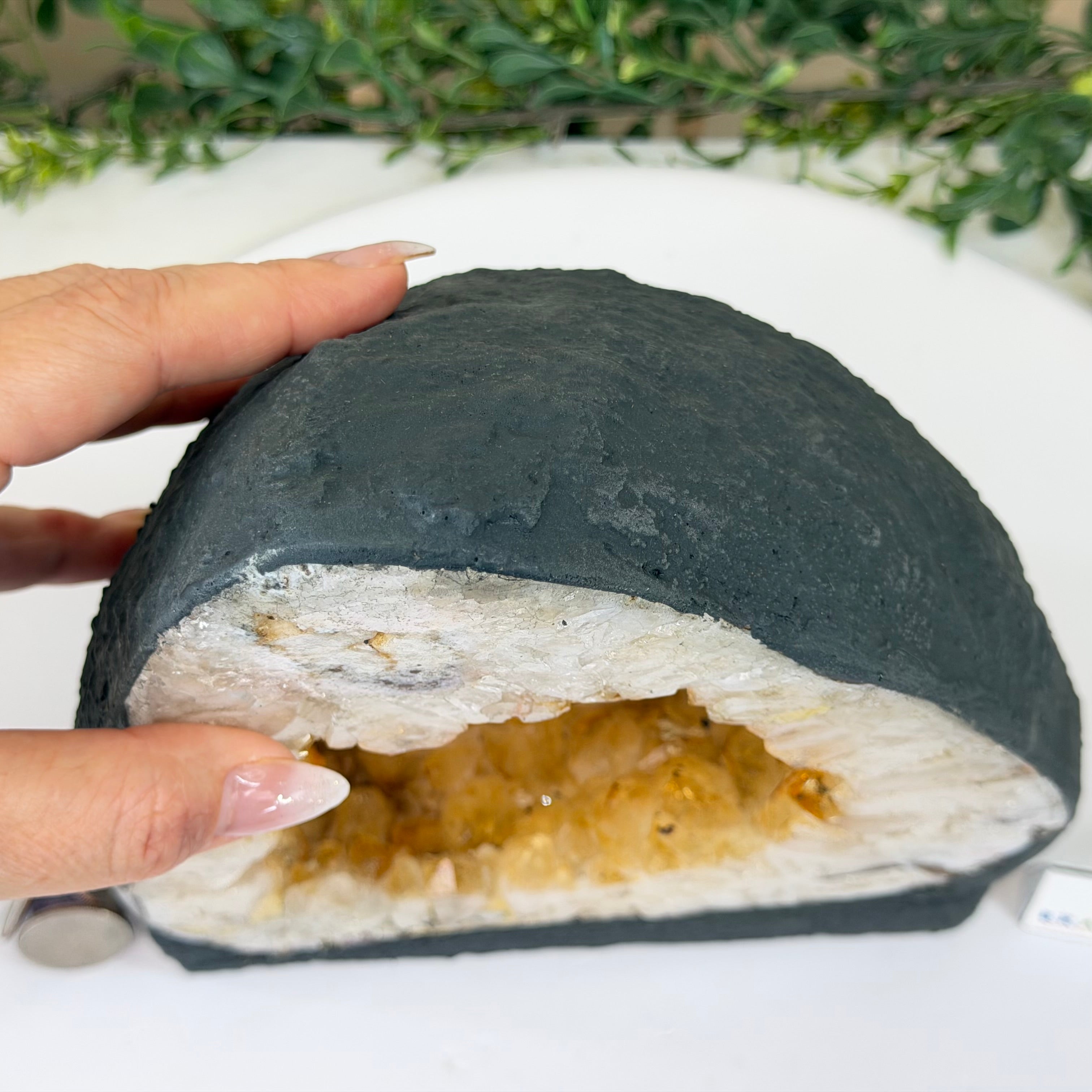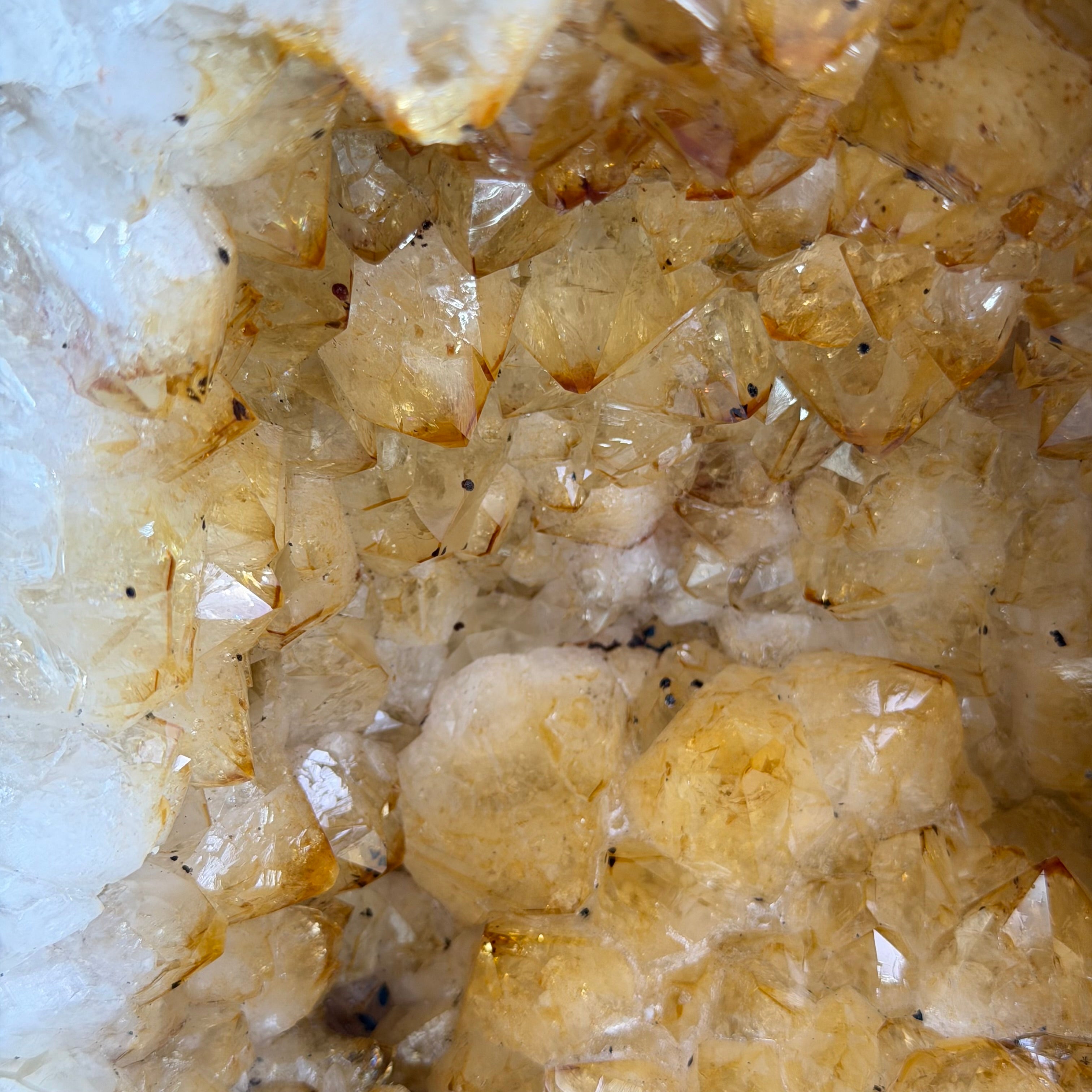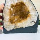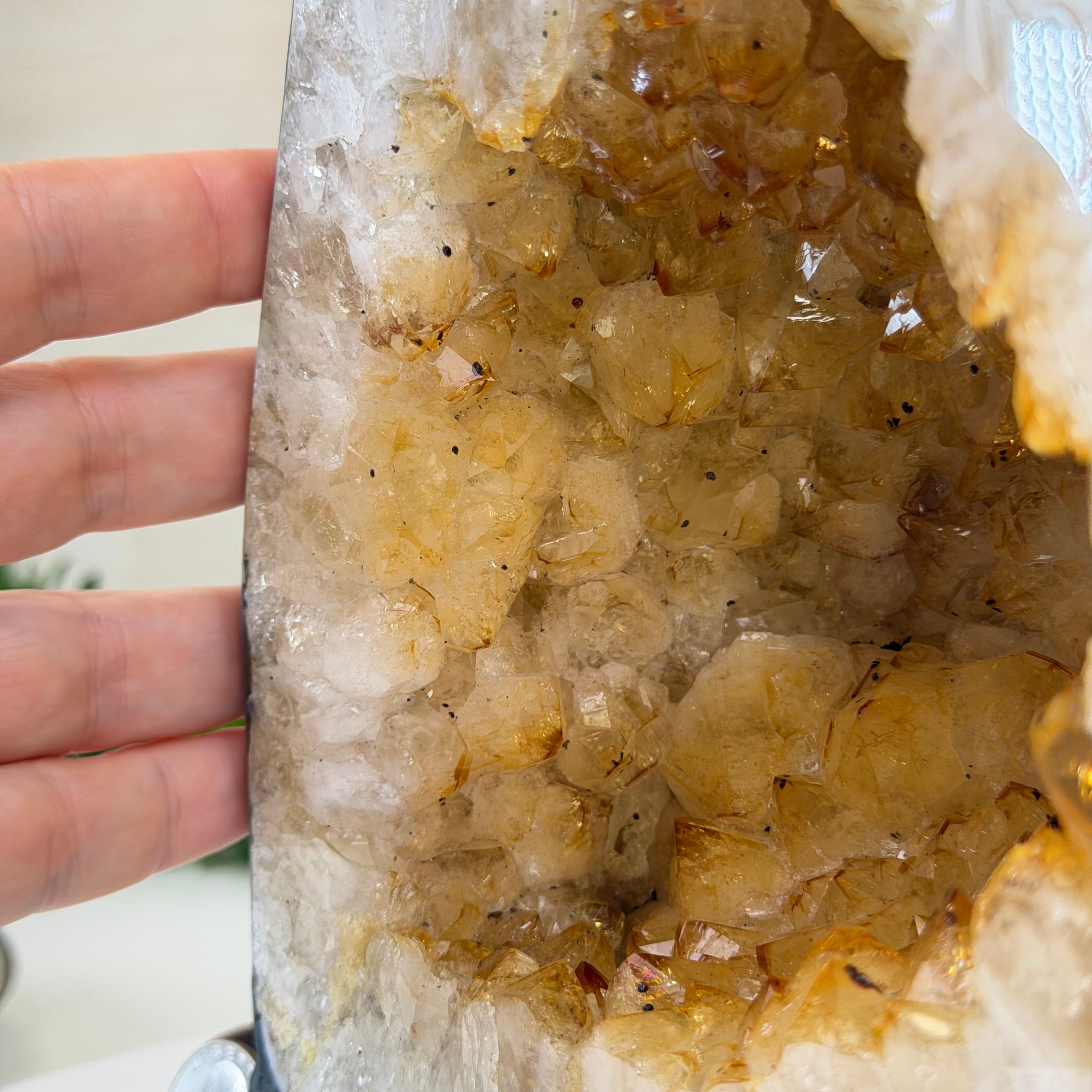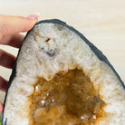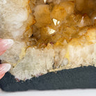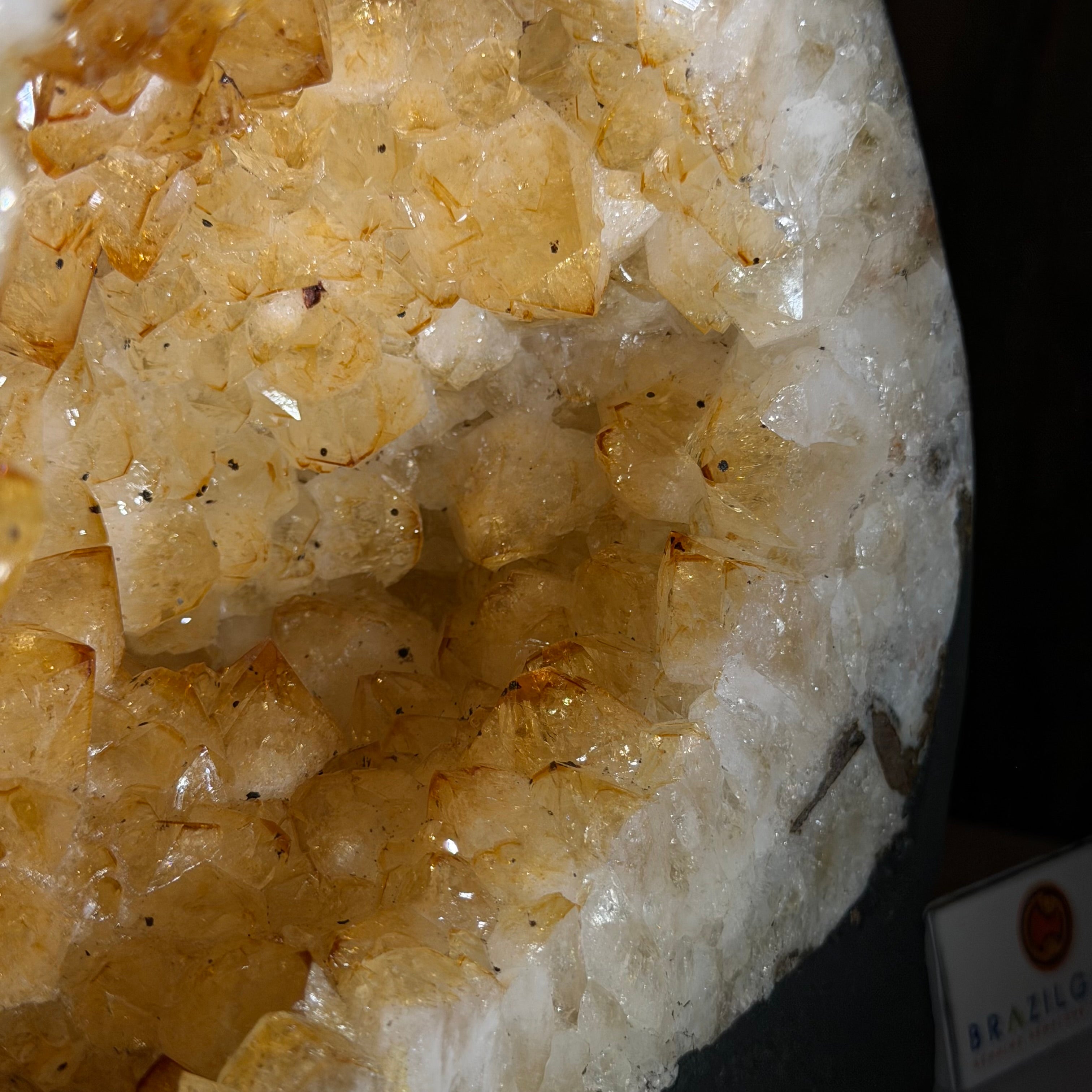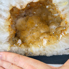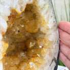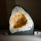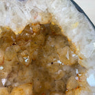 This impressive Extra Quality Brazilian Citrine Cathedral Geode, features radiant golden-amber crystals will enhance your favorite space. This geode displays sparkling citrine points and distinctive white crystal bands along the outer edges, creating a dramatic natural contrast.