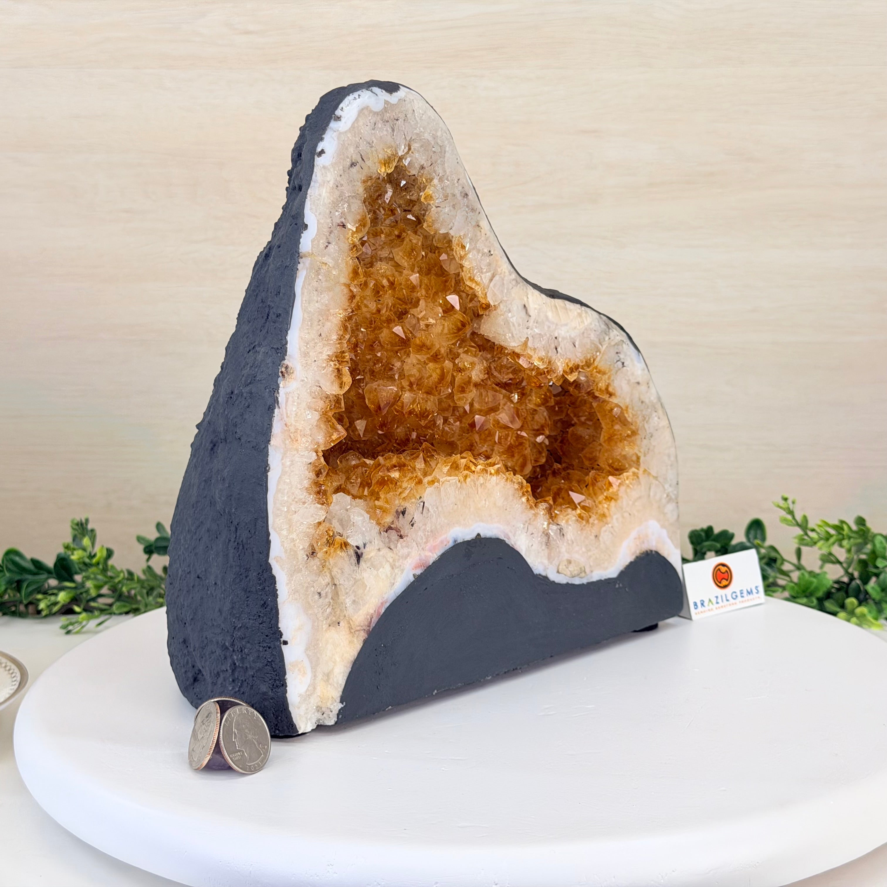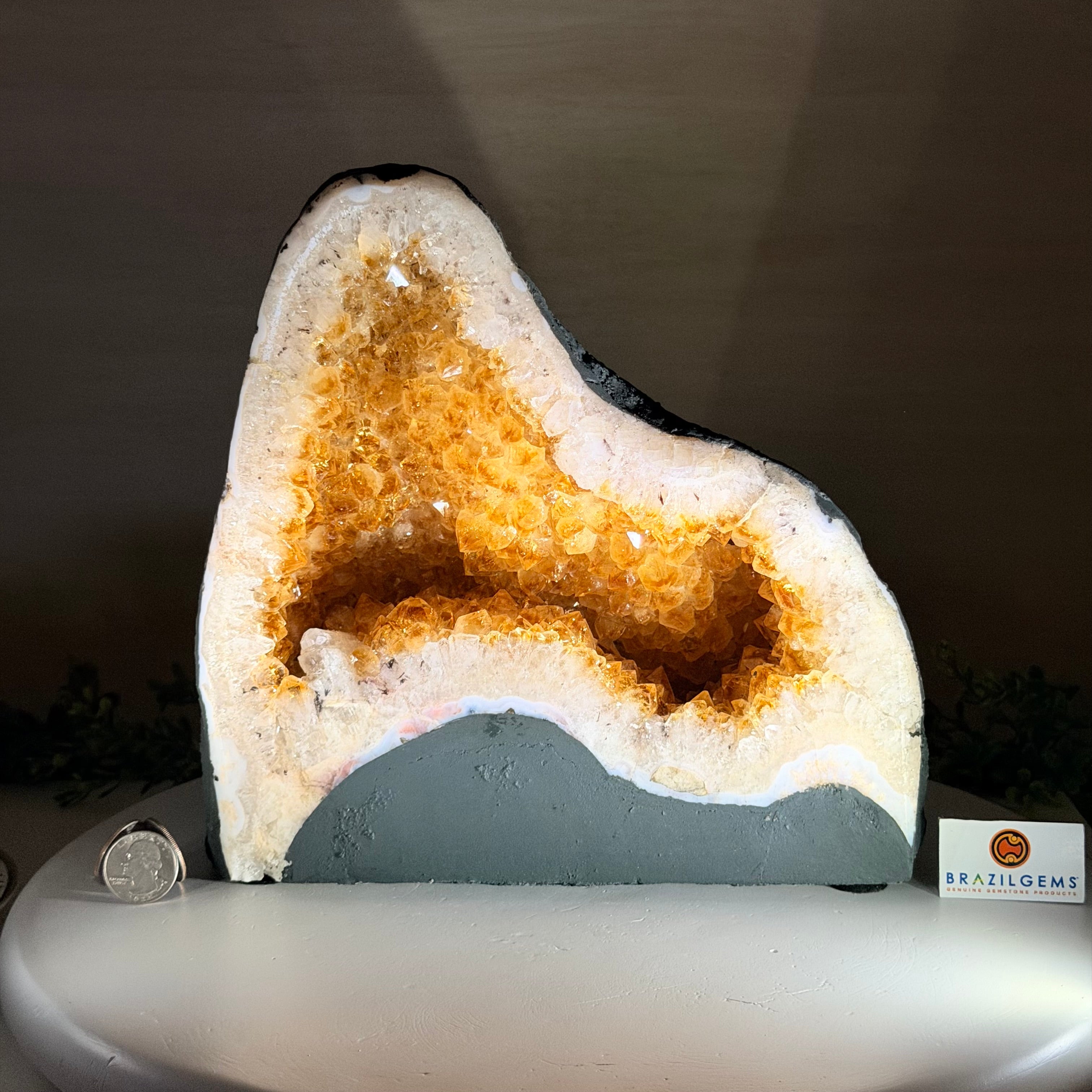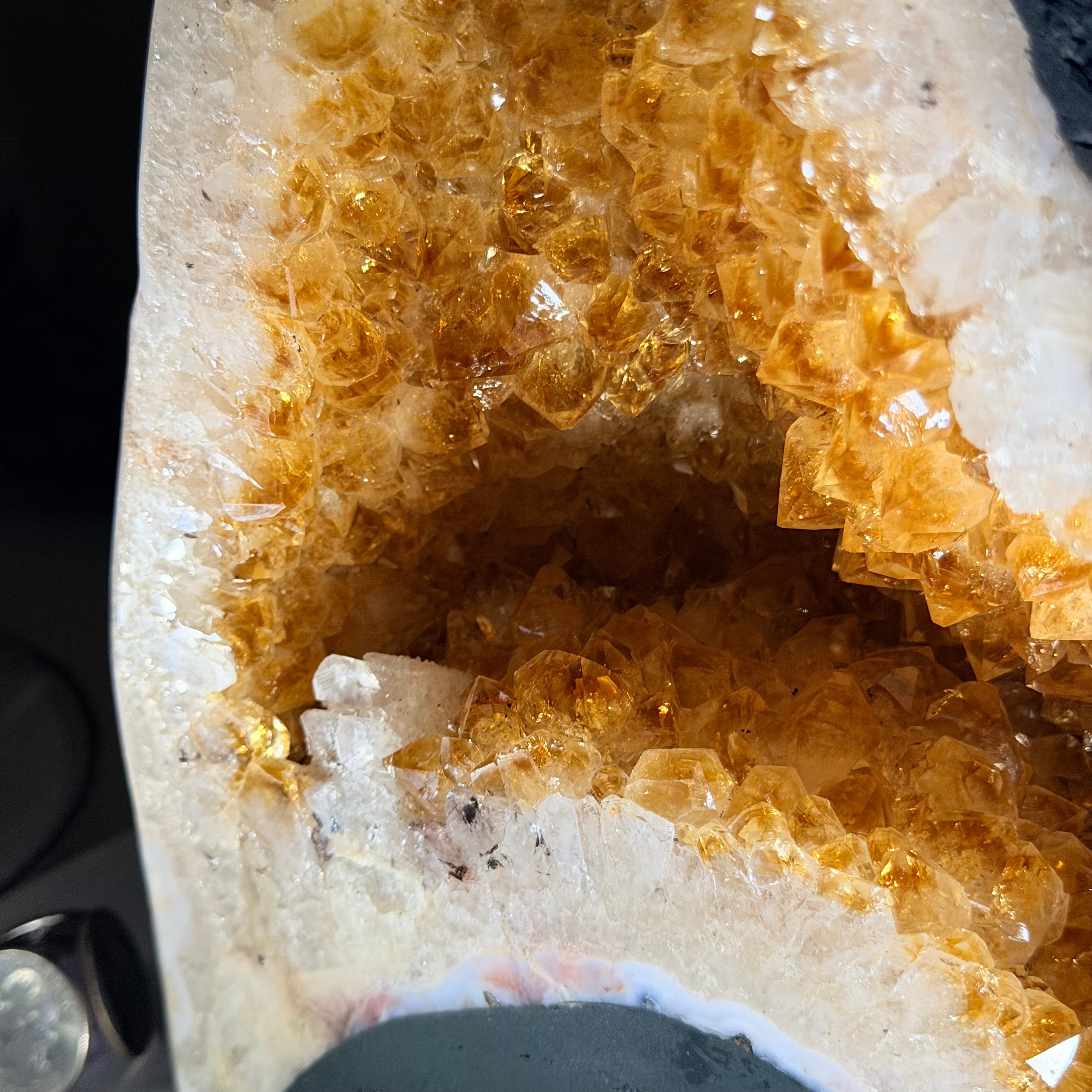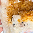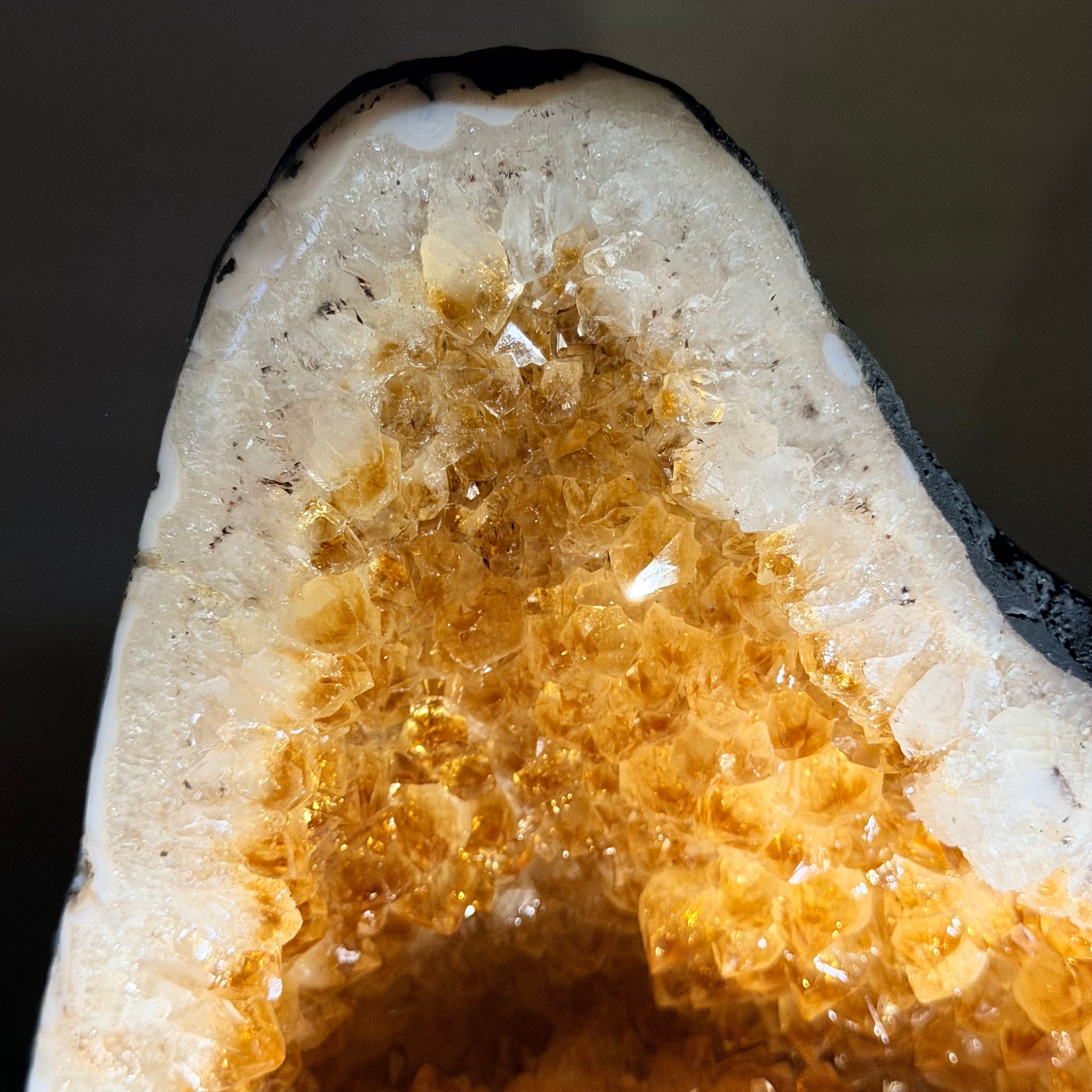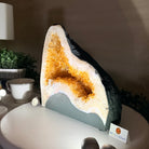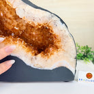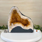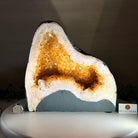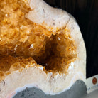 This impressive Extra Quality Brazilian Citrine Cathedral Geode, features radiant golden-amber crystals will enhance your favorite space. This geode displays sparkling citrine points and distinctive white crystal bands along the outer edges, creating a dramatic natural contrast.
