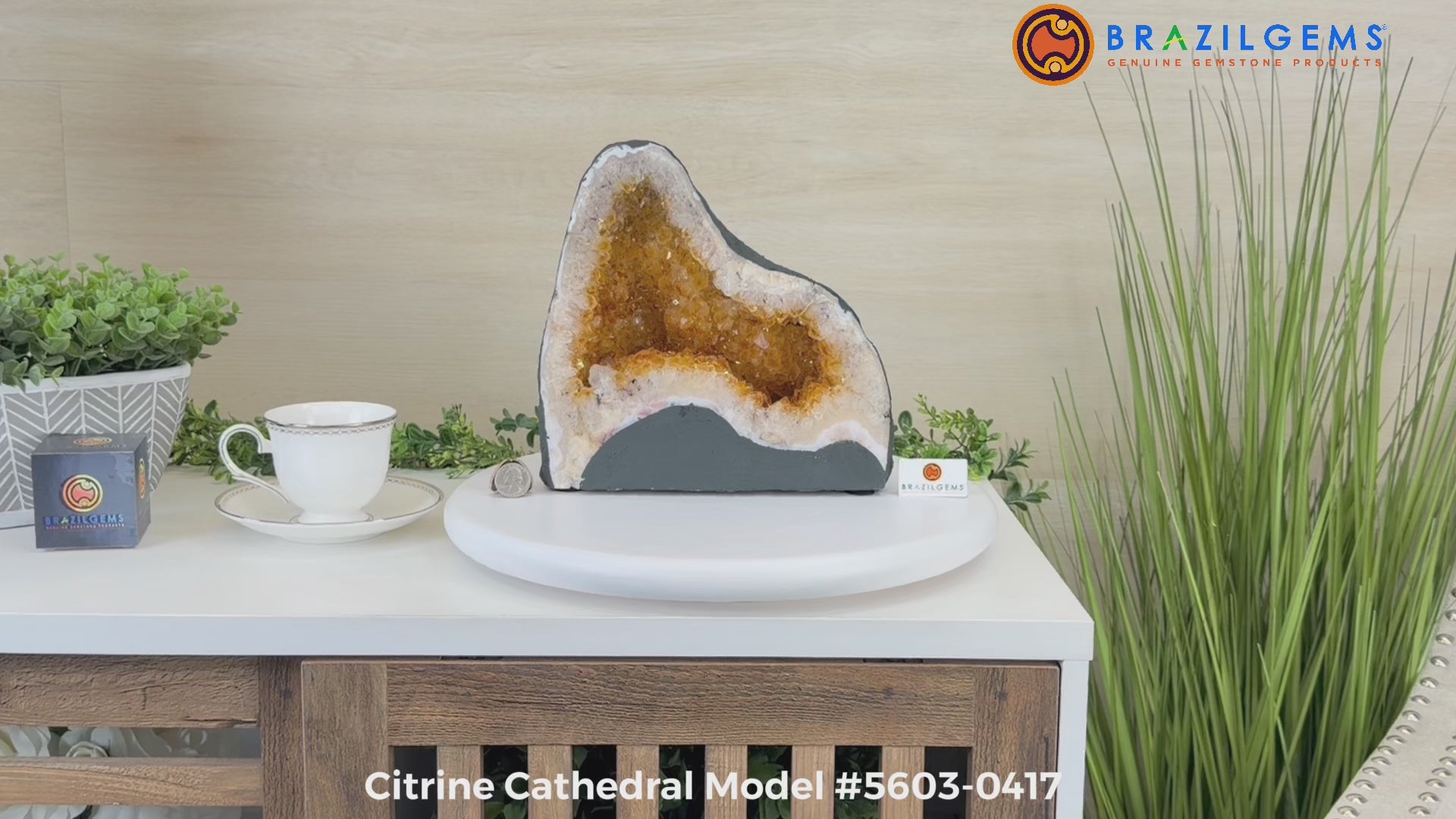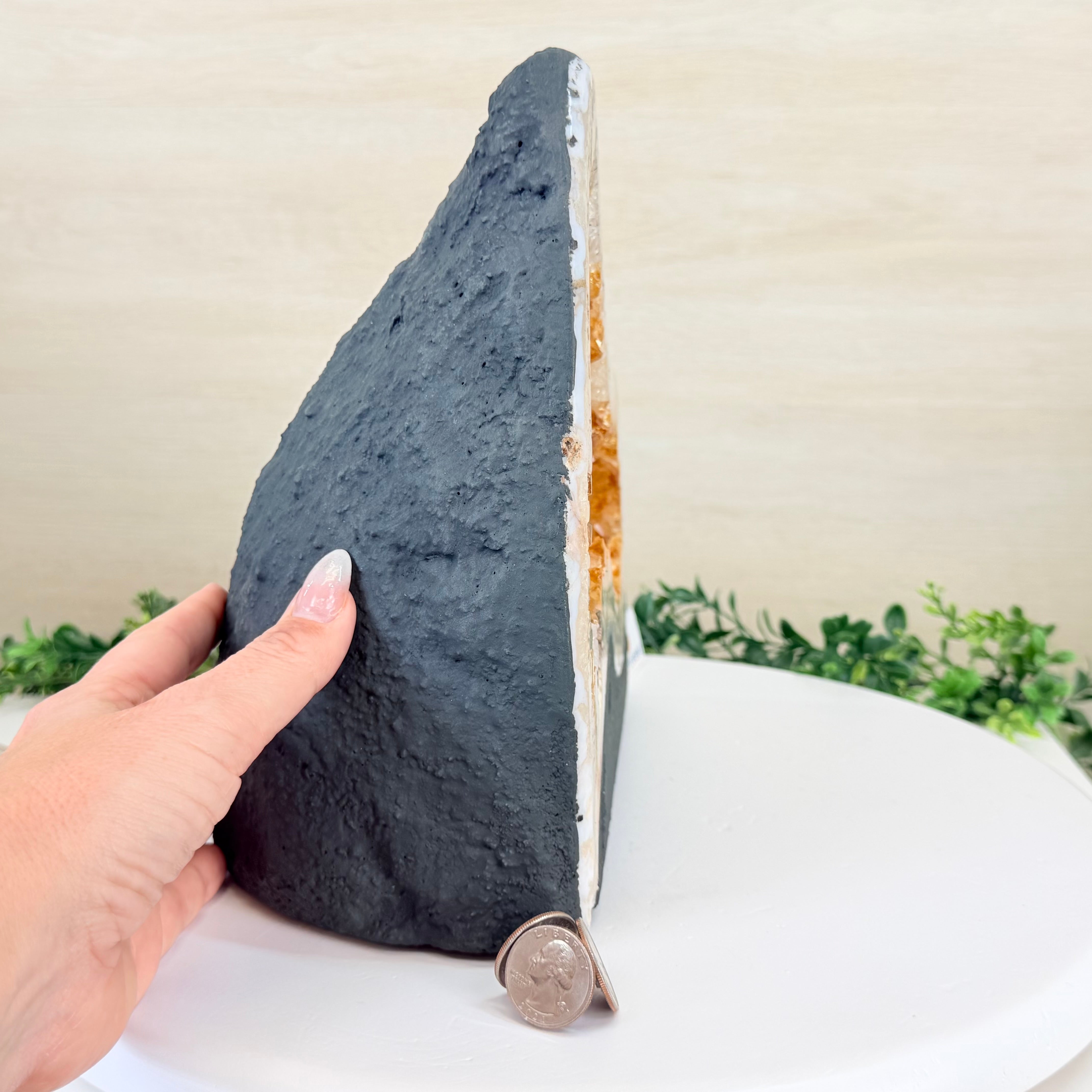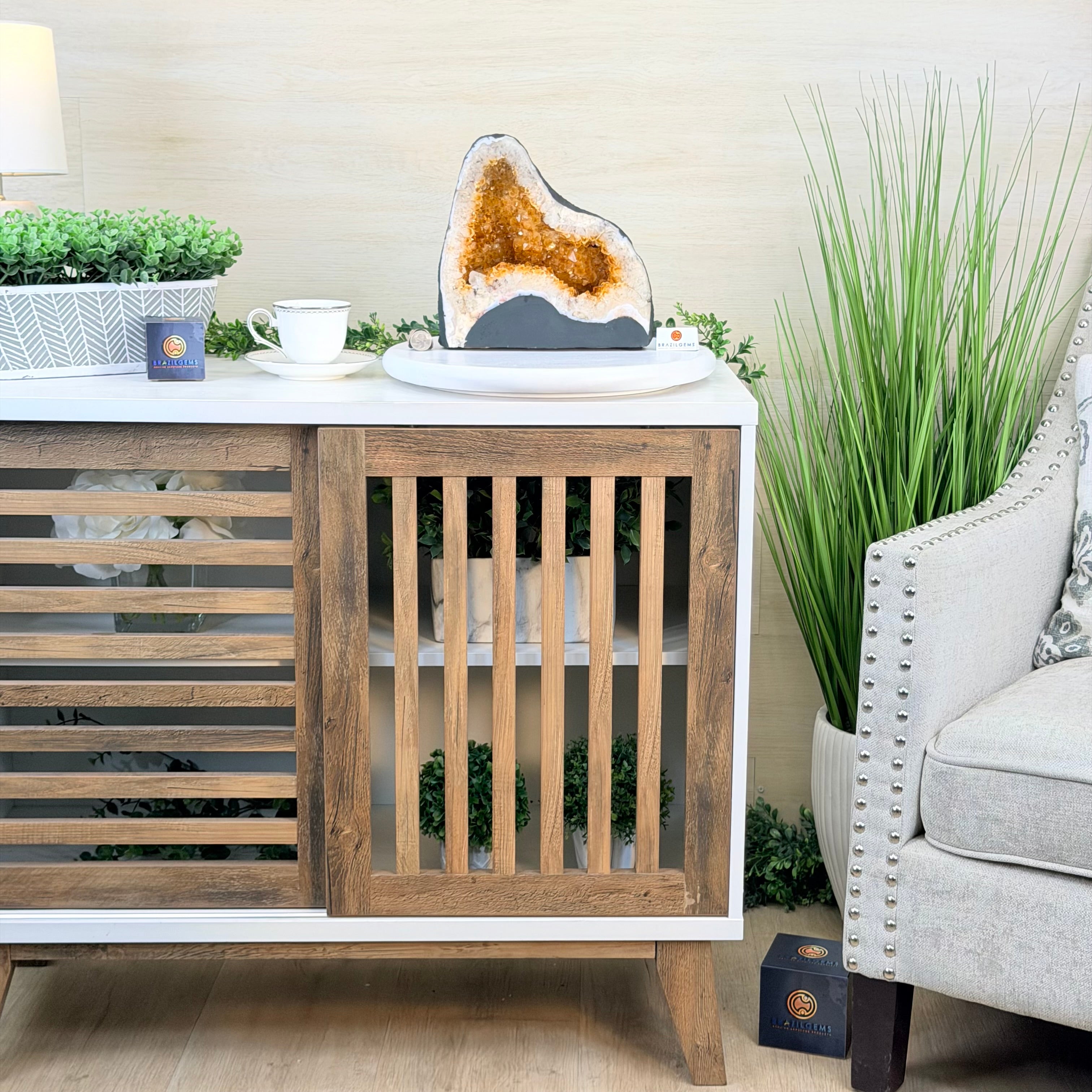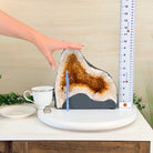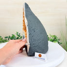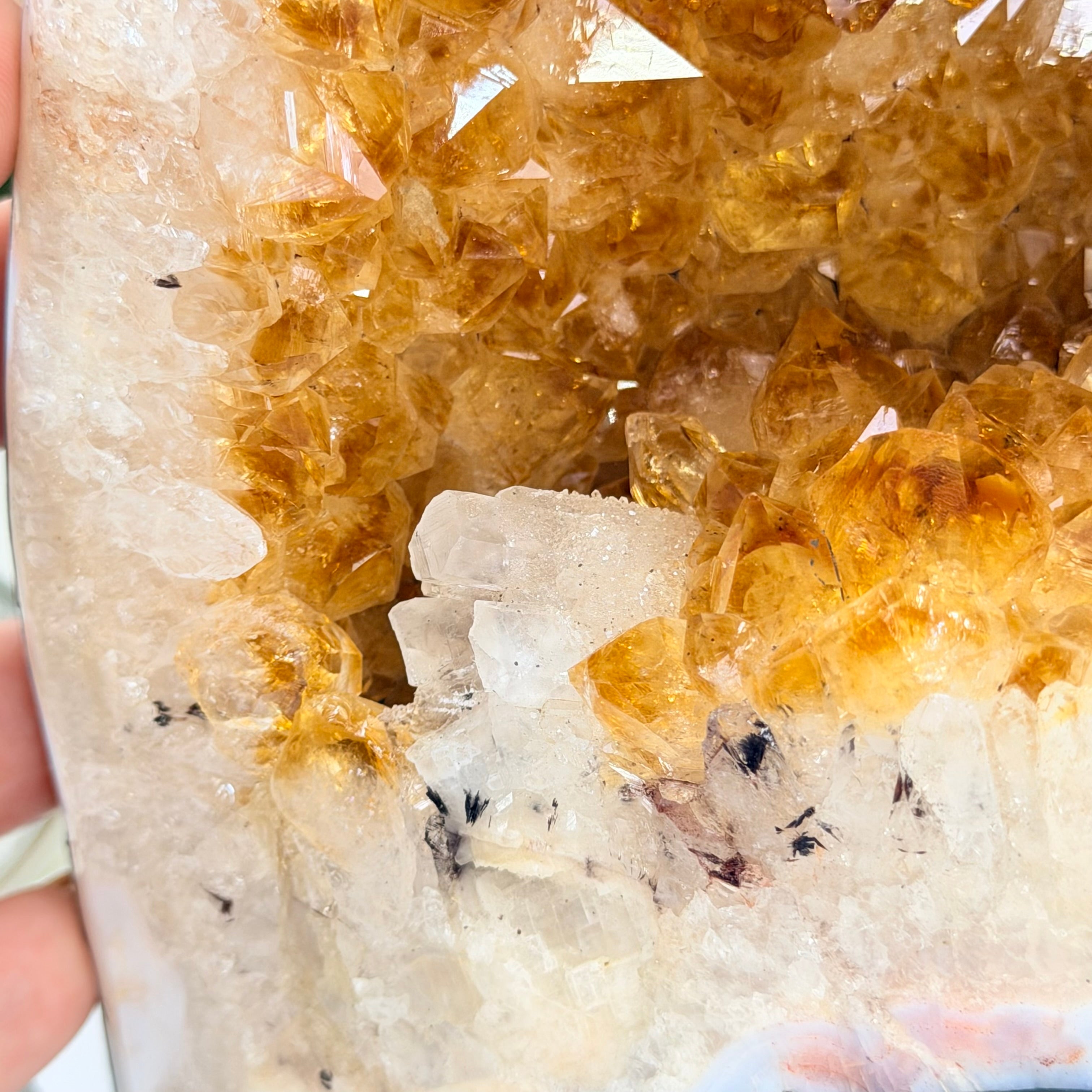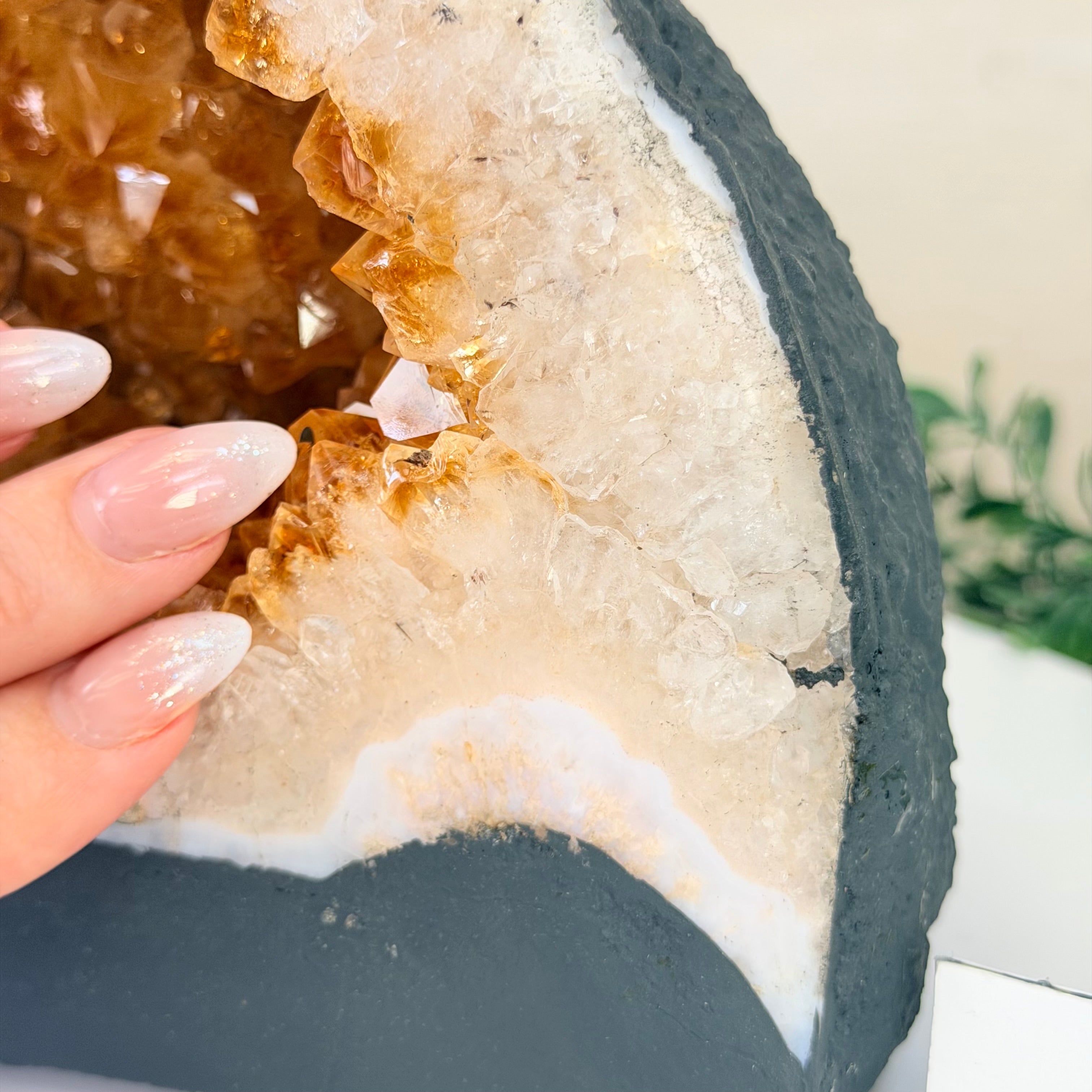 This impressive Extra Quality Brazilian Citrine Cathedral Geode, features radiant golden-amber crystals will enhance your favorite space. This geode displays sparkling citrine points and distinctive white crystal bands along the outer edges, creating a dramatic natural contrast.