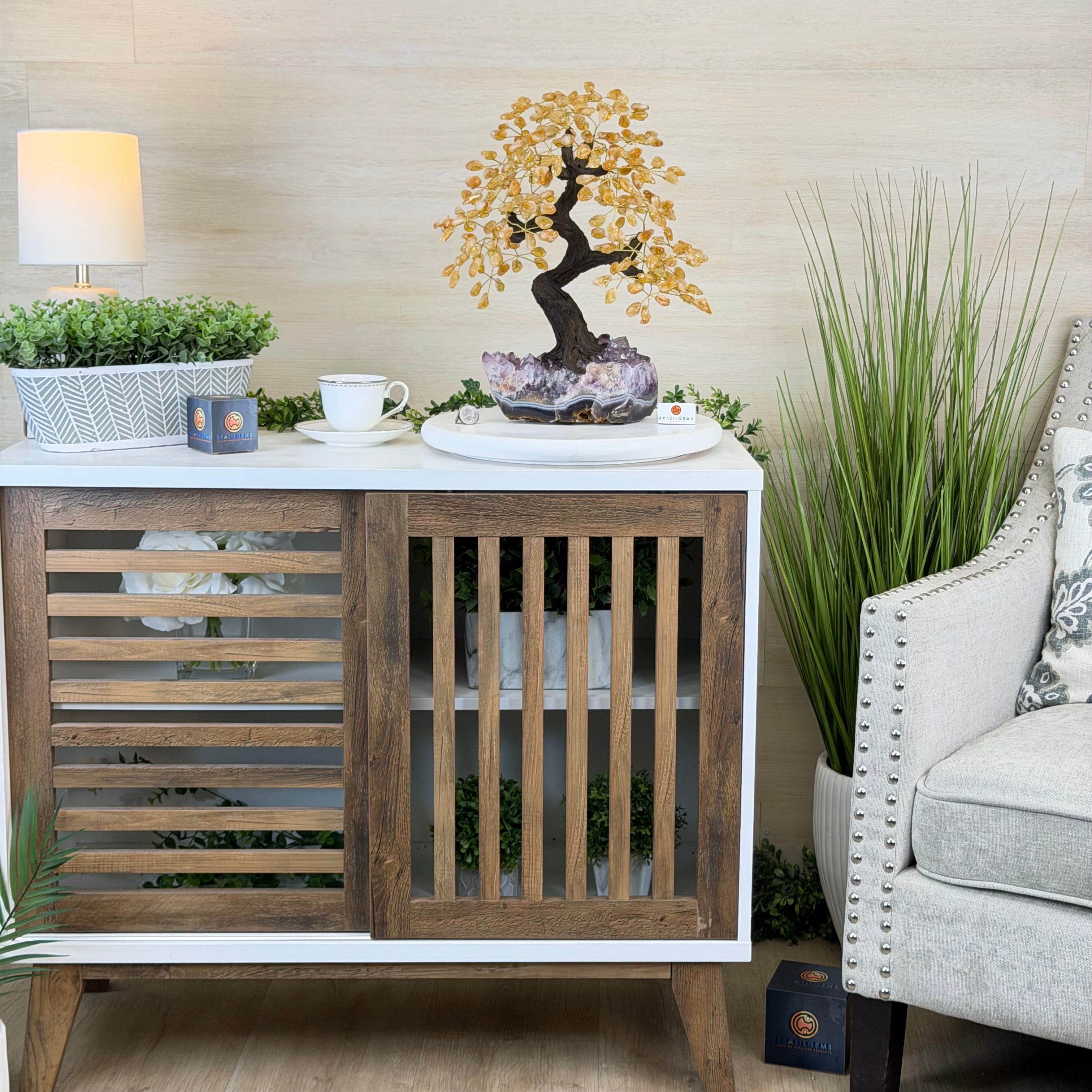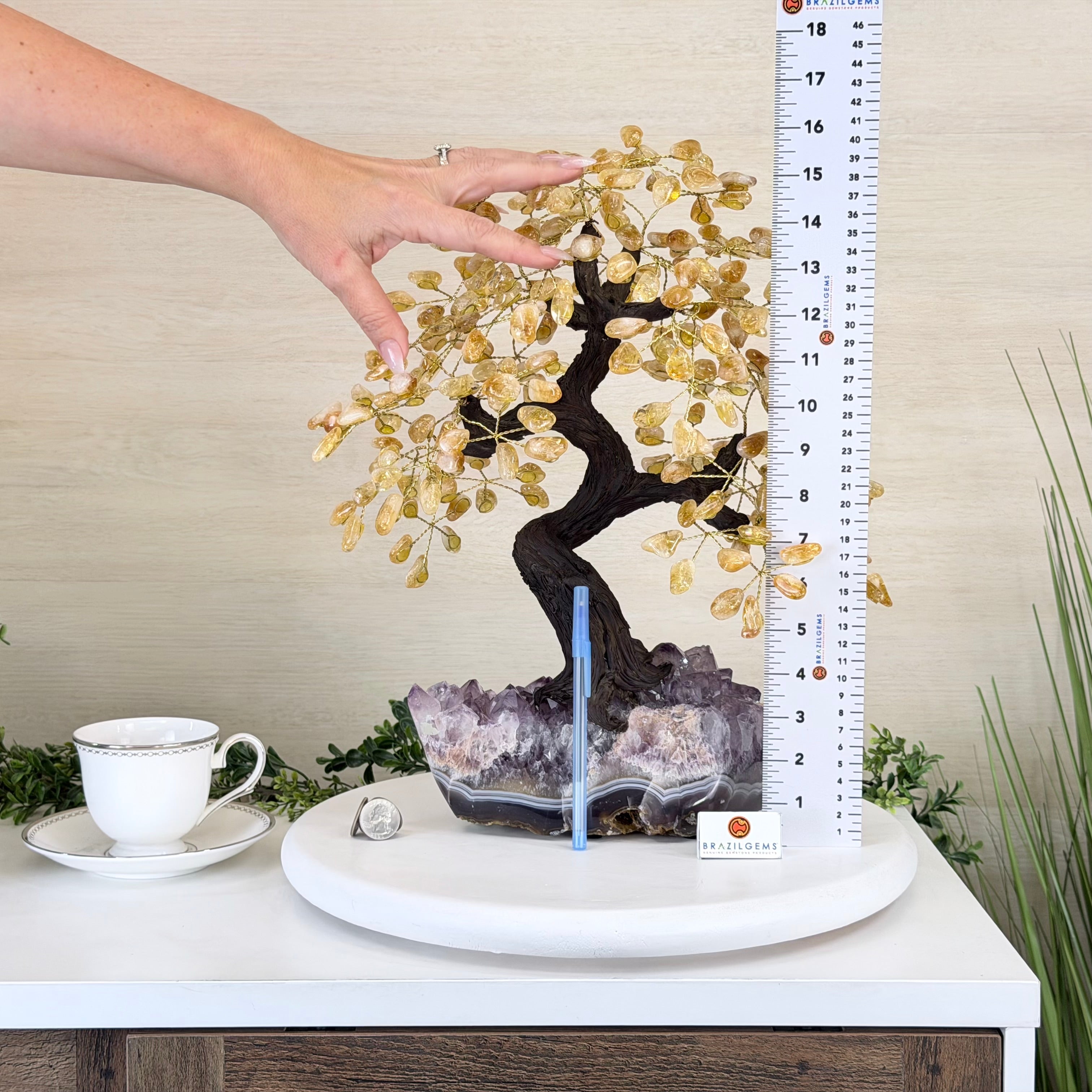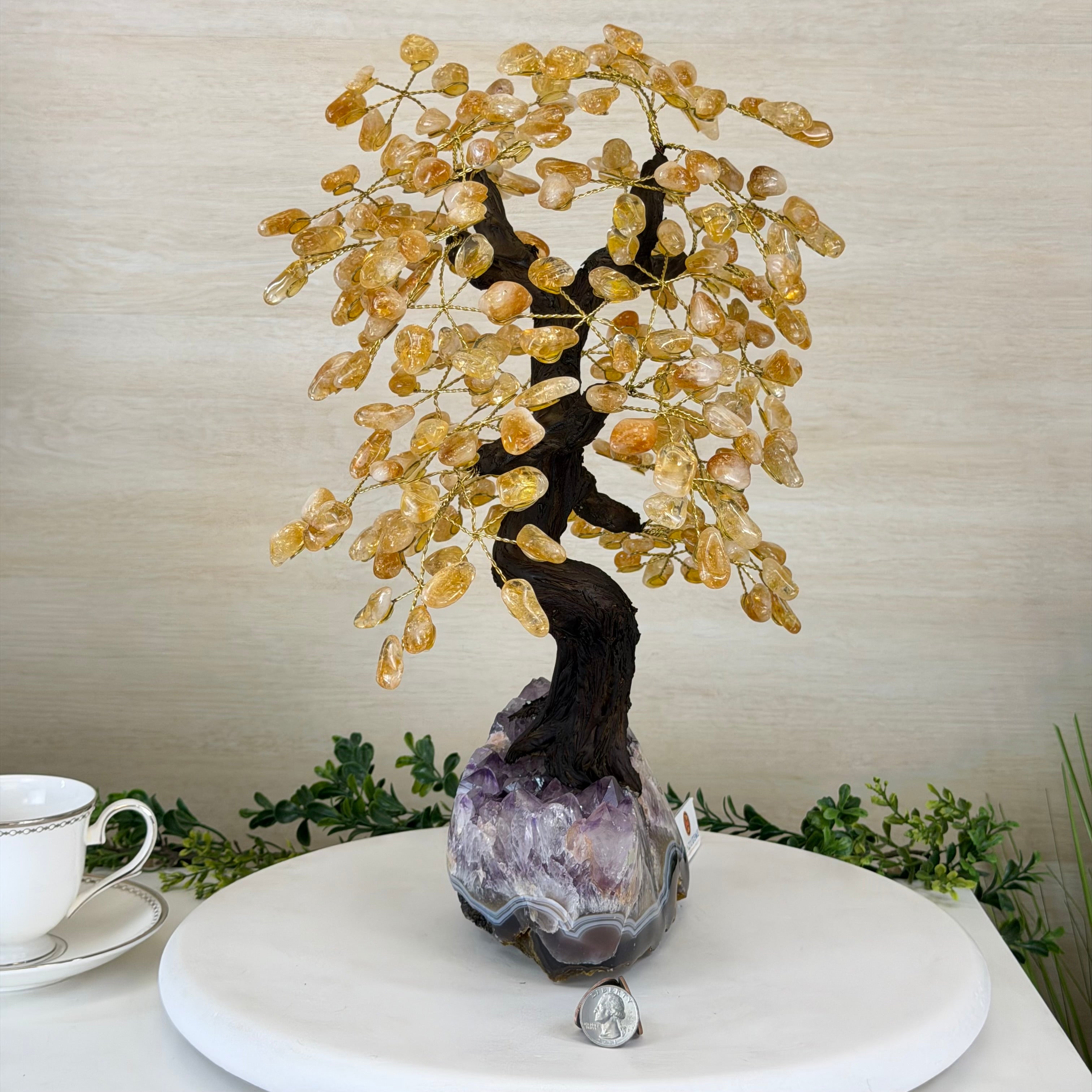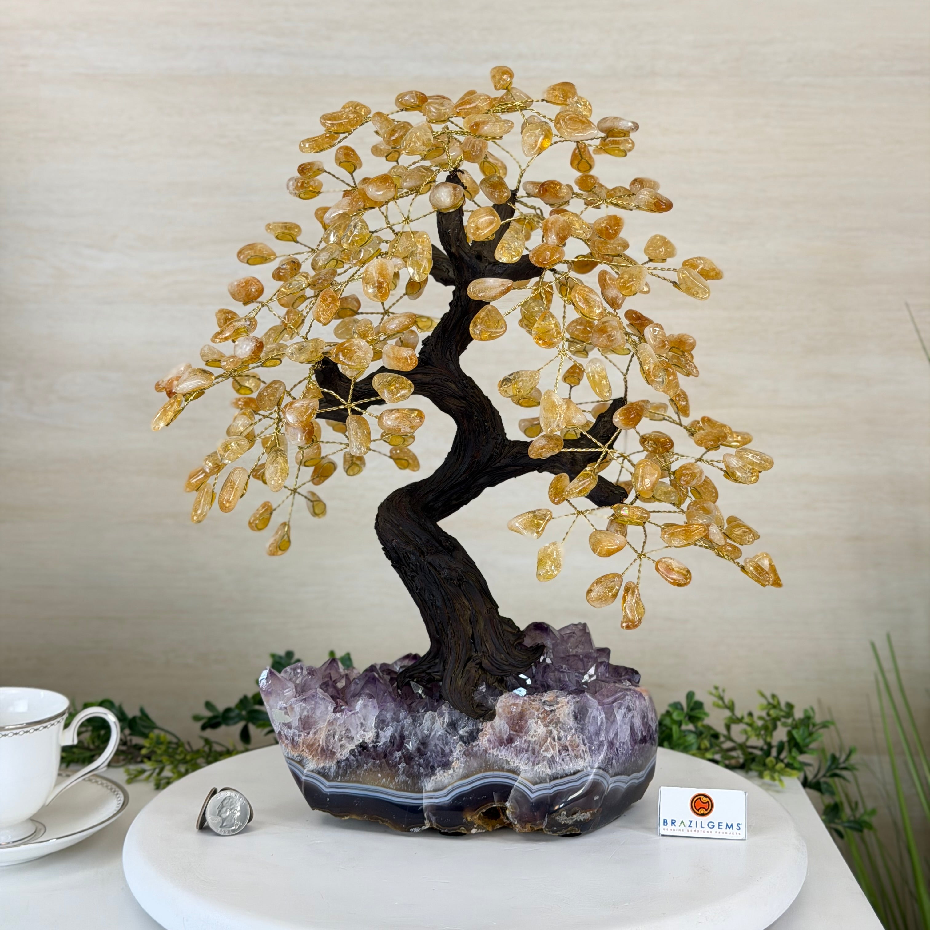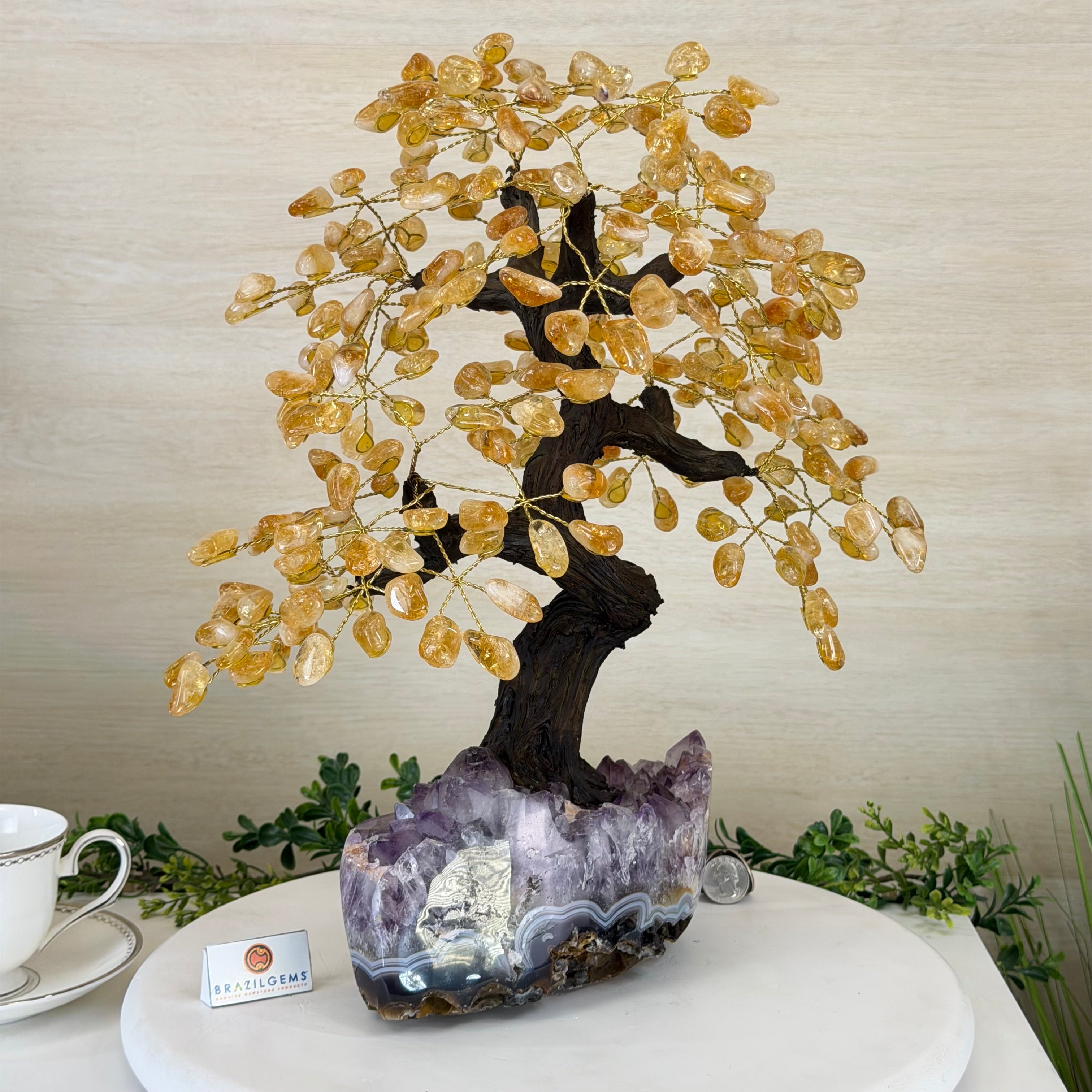 Brazil Gems® brings you Handmade Citrine Gemstone trees with a crystal cluster base, resin trunk, wired branches and tumbled Citrine gemstones.