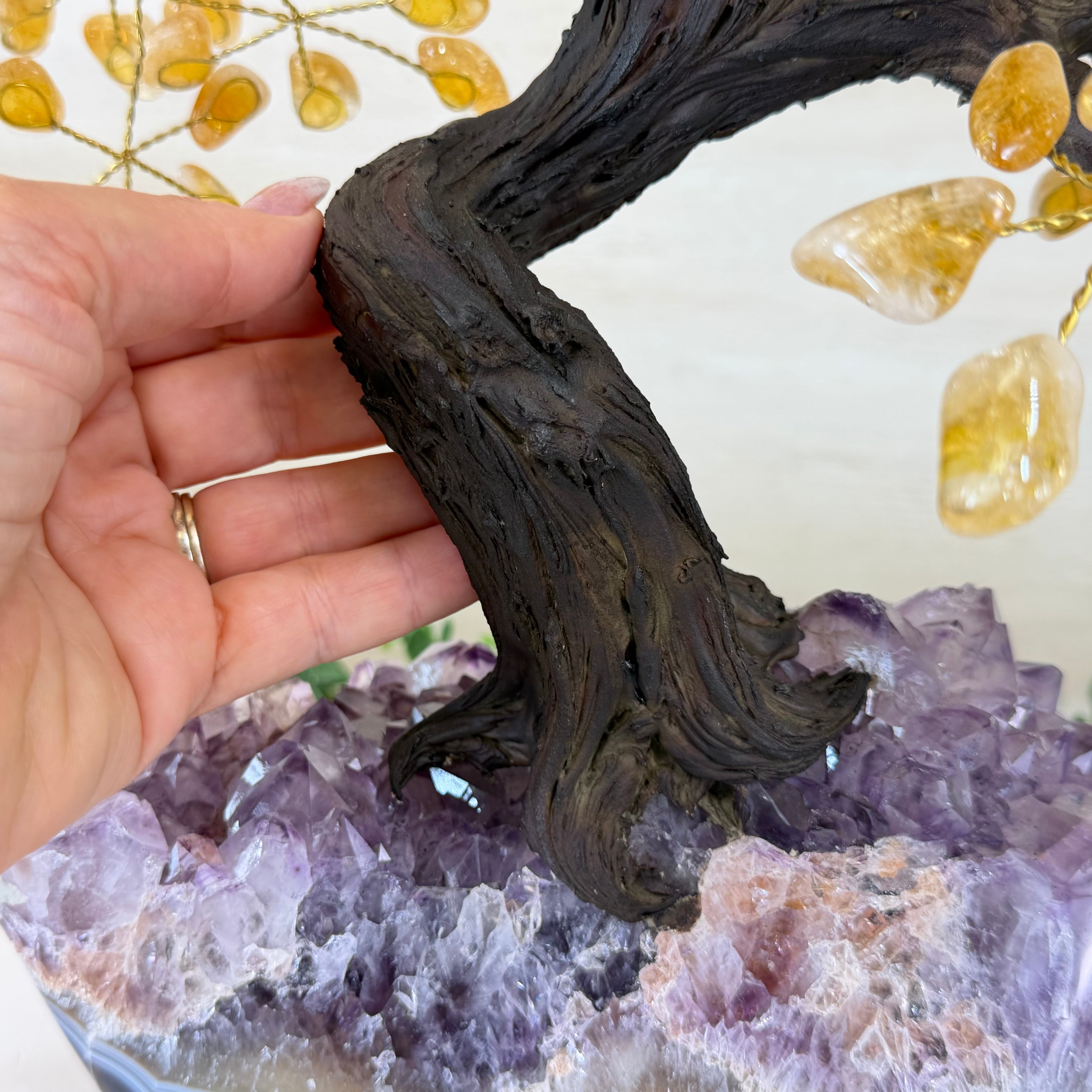 The process to make a gemstone tree like this is very extensive and meticulous. A special amethyst cluster is selected for the base, the resin trunk and branches are crafted by Brazilian artisans and then each gemstone is glued to the tree by hand. MADE IN BRAZIL!