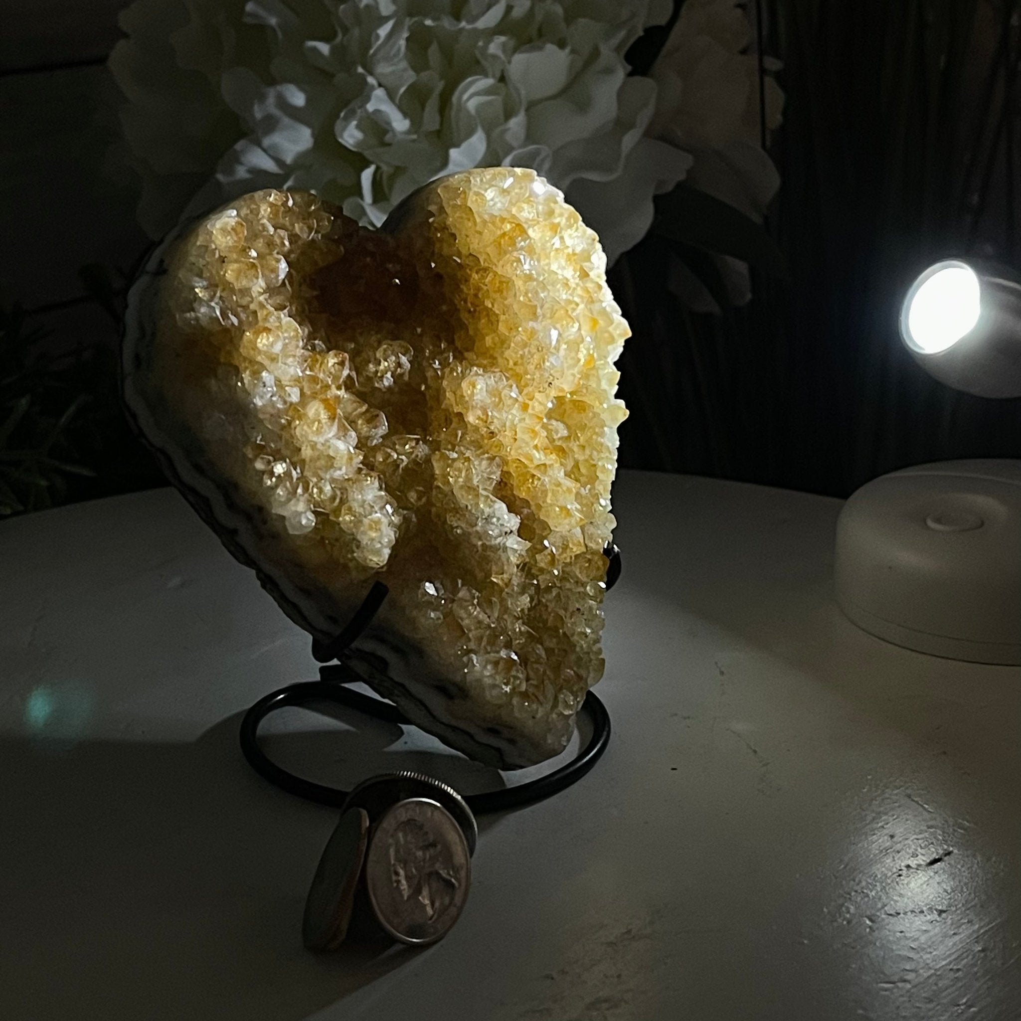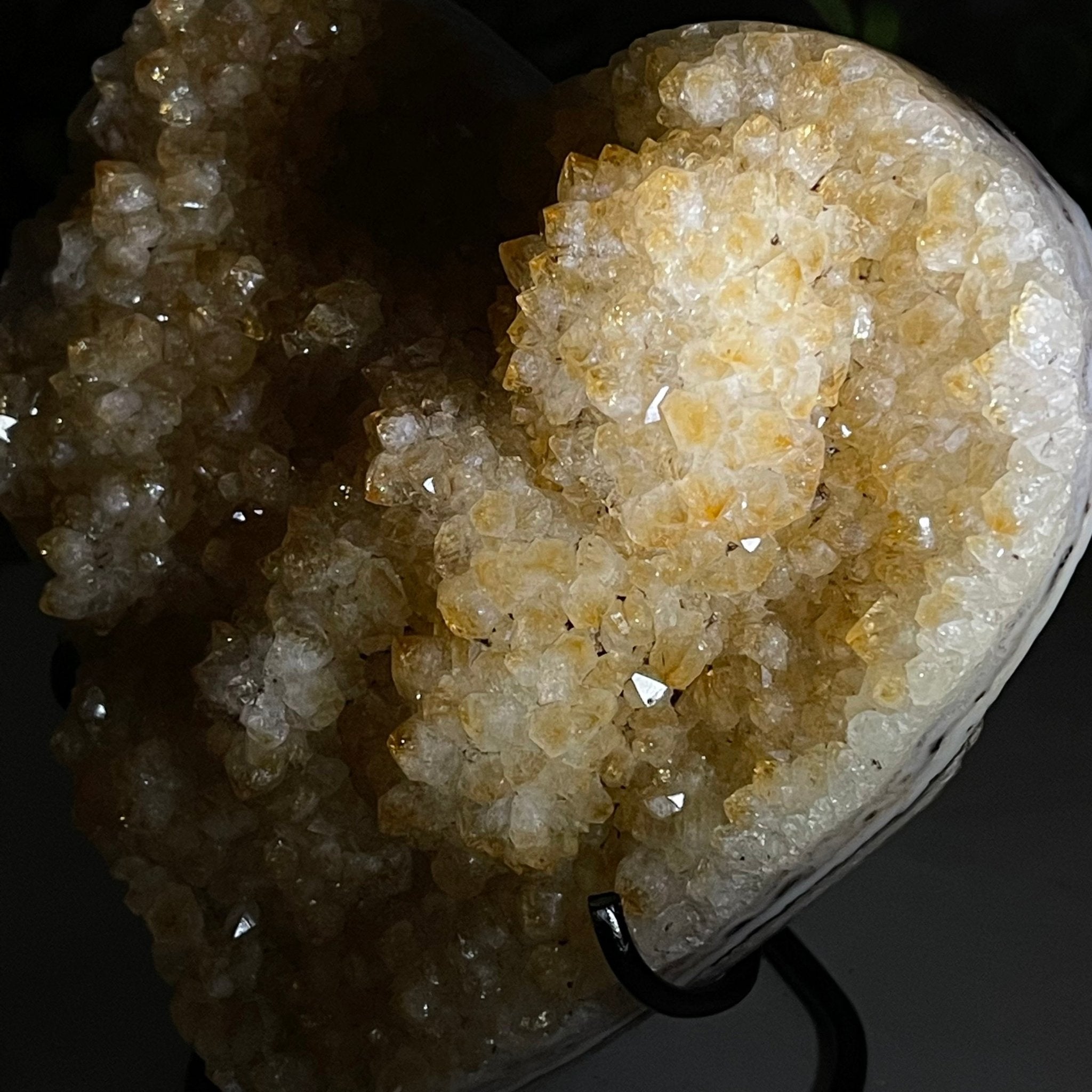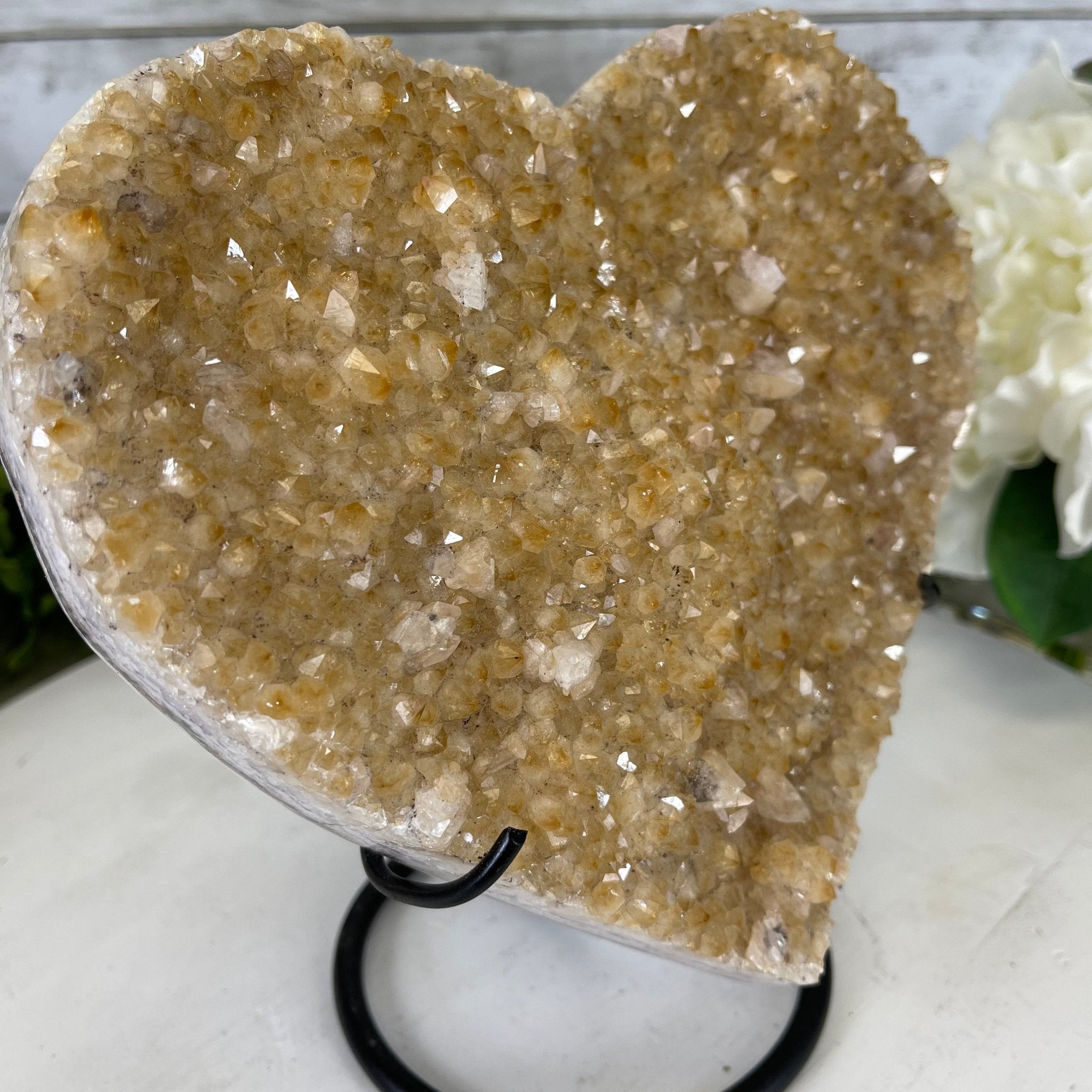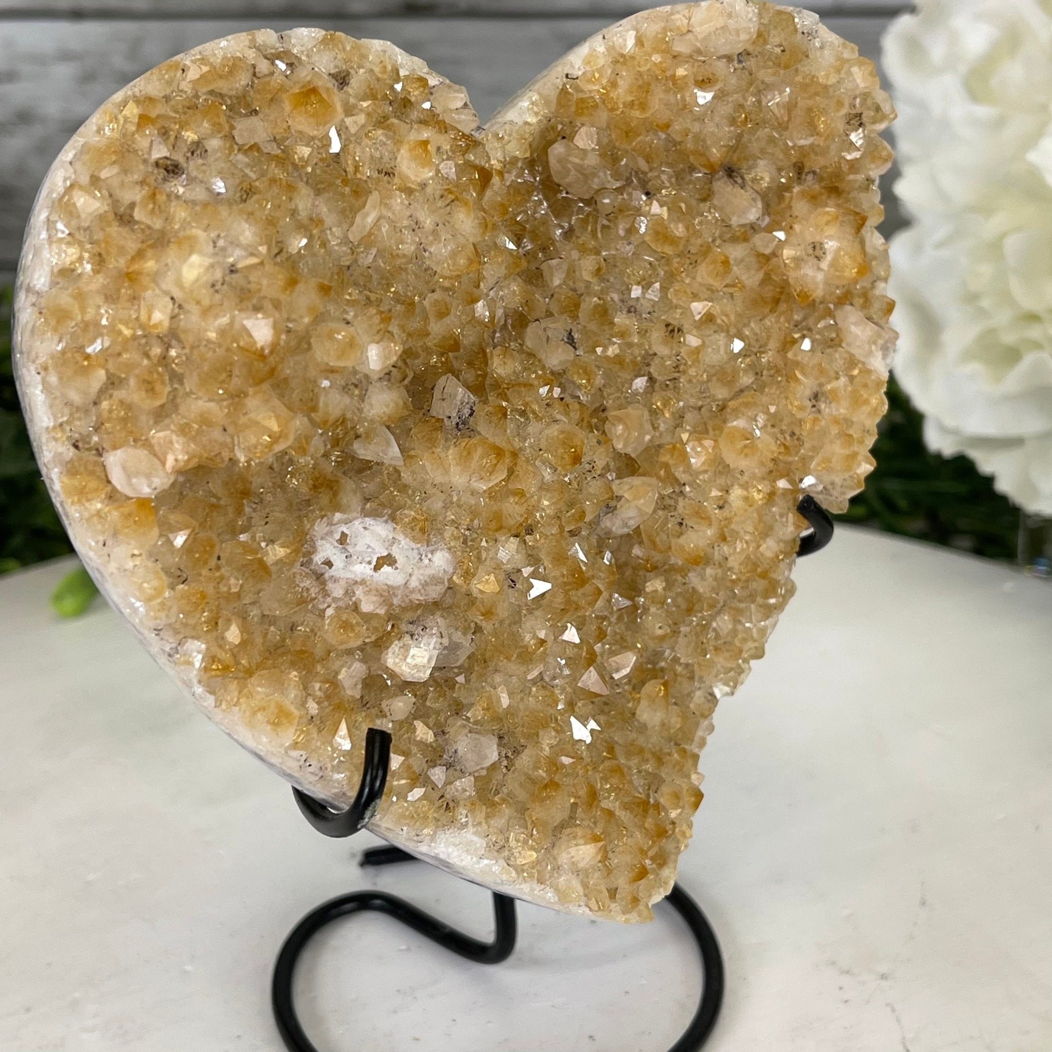 Quality Heart-Shaped Citrine Geodes on a metal or acrylic stand. Beautiful gemstones with polished edges and natural rough stone on its backside.